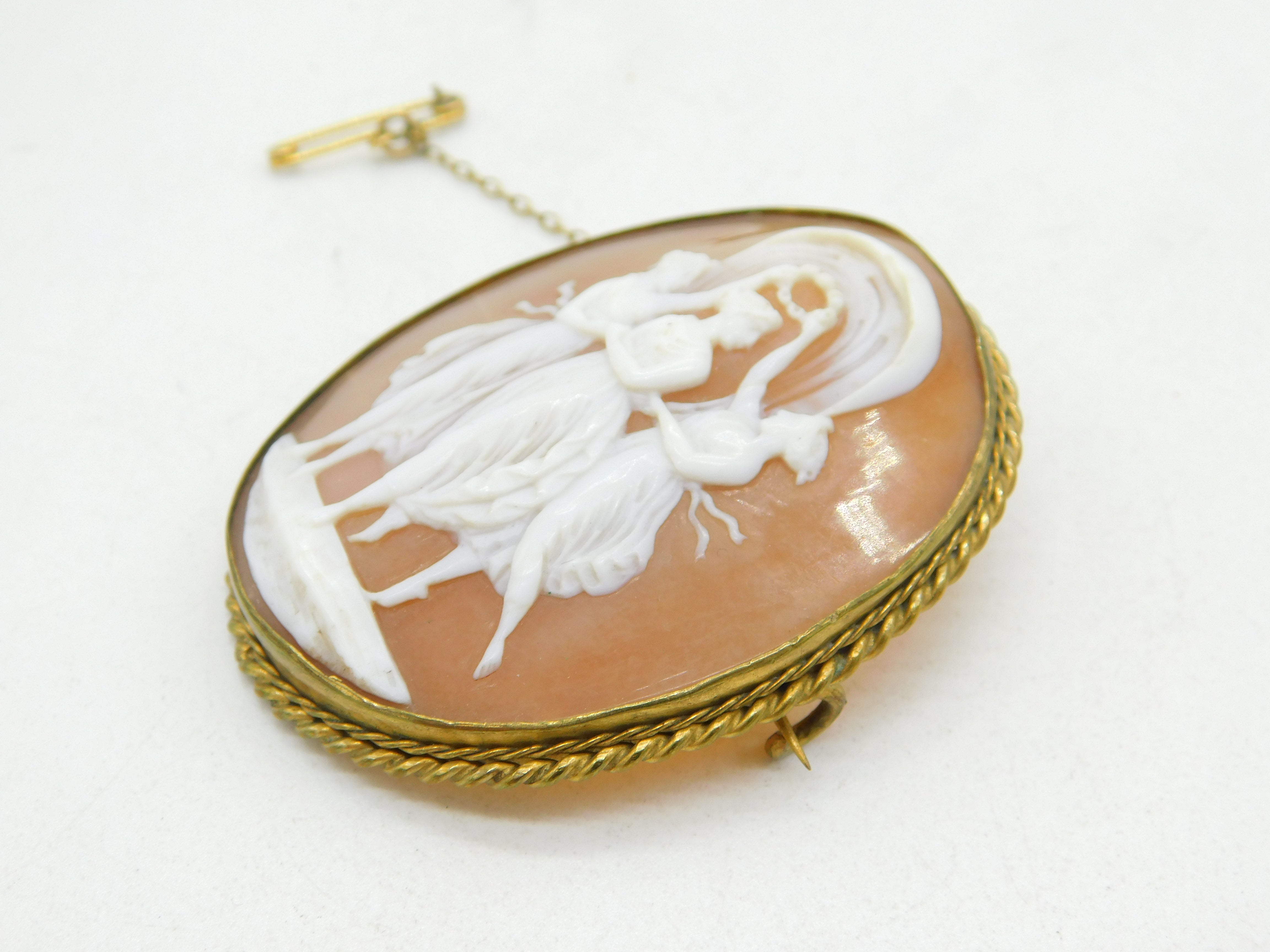 Details: A fantastic and wonderfully designed antique Victorian rolled gold mounted large carved shell cameo brooch depicting the Three Graces c1890. This is a wonderful item that would make a perfect gift or addition to any collection. We are more than happy to provide XRF reports for items upon request.