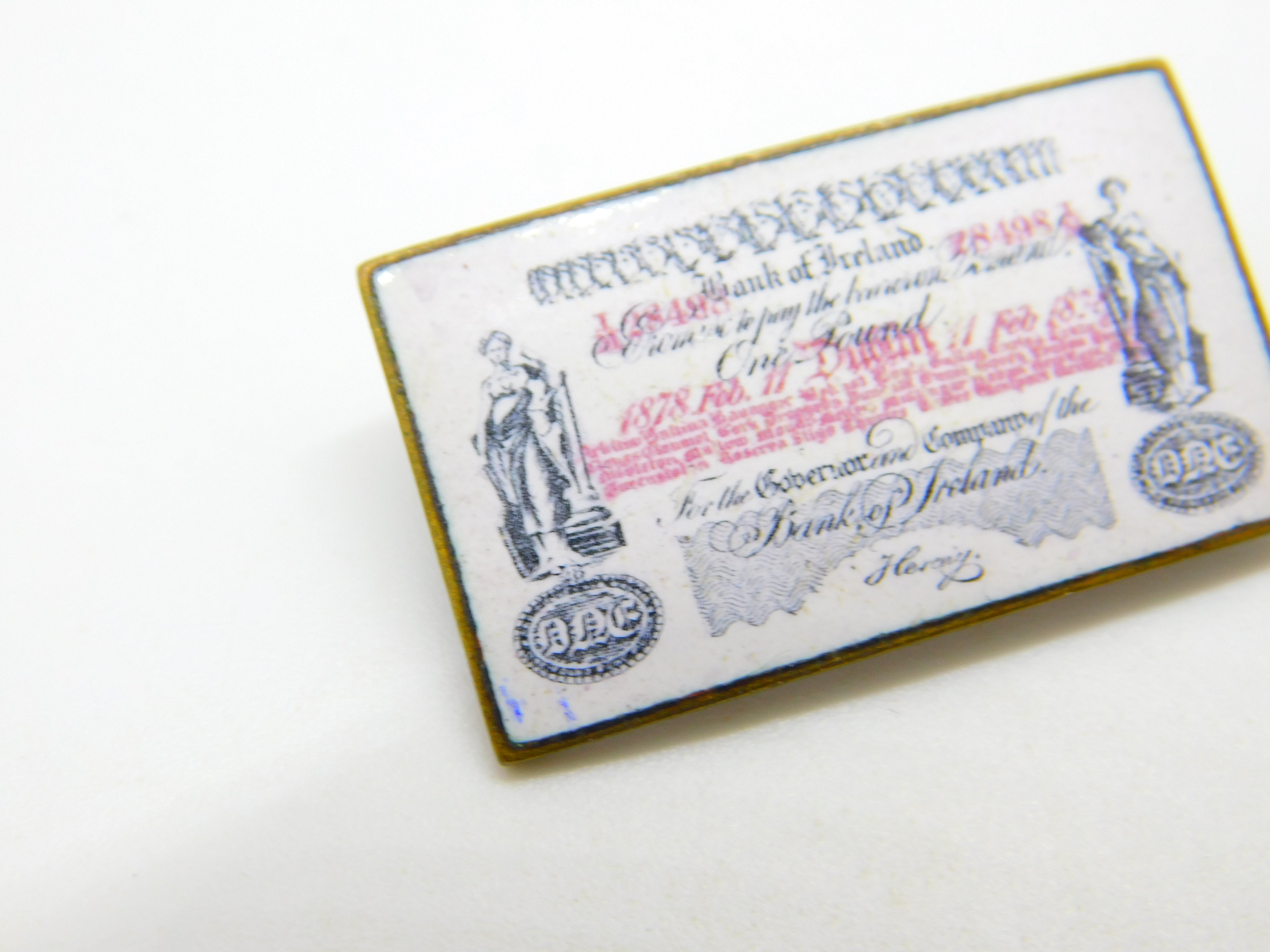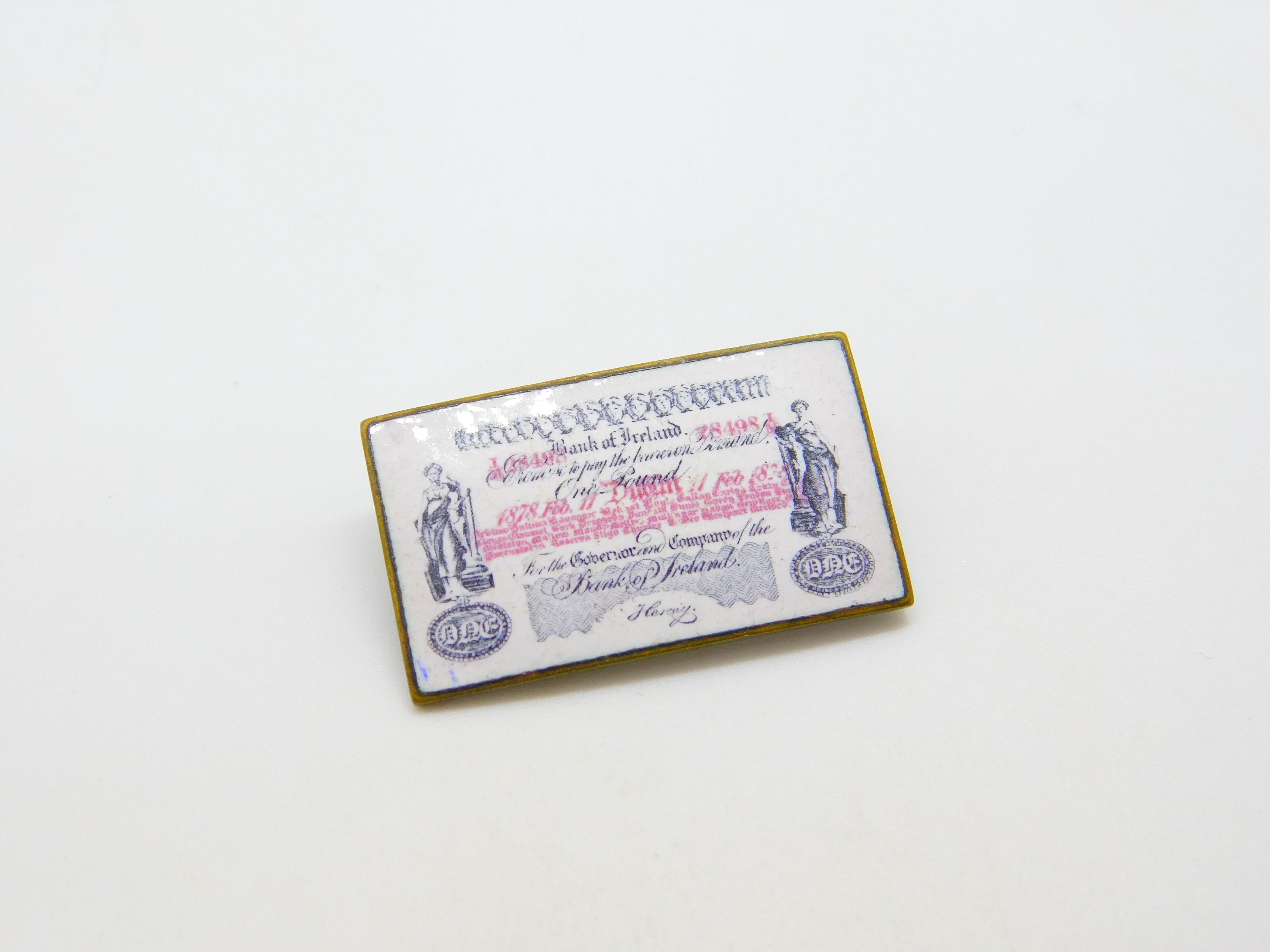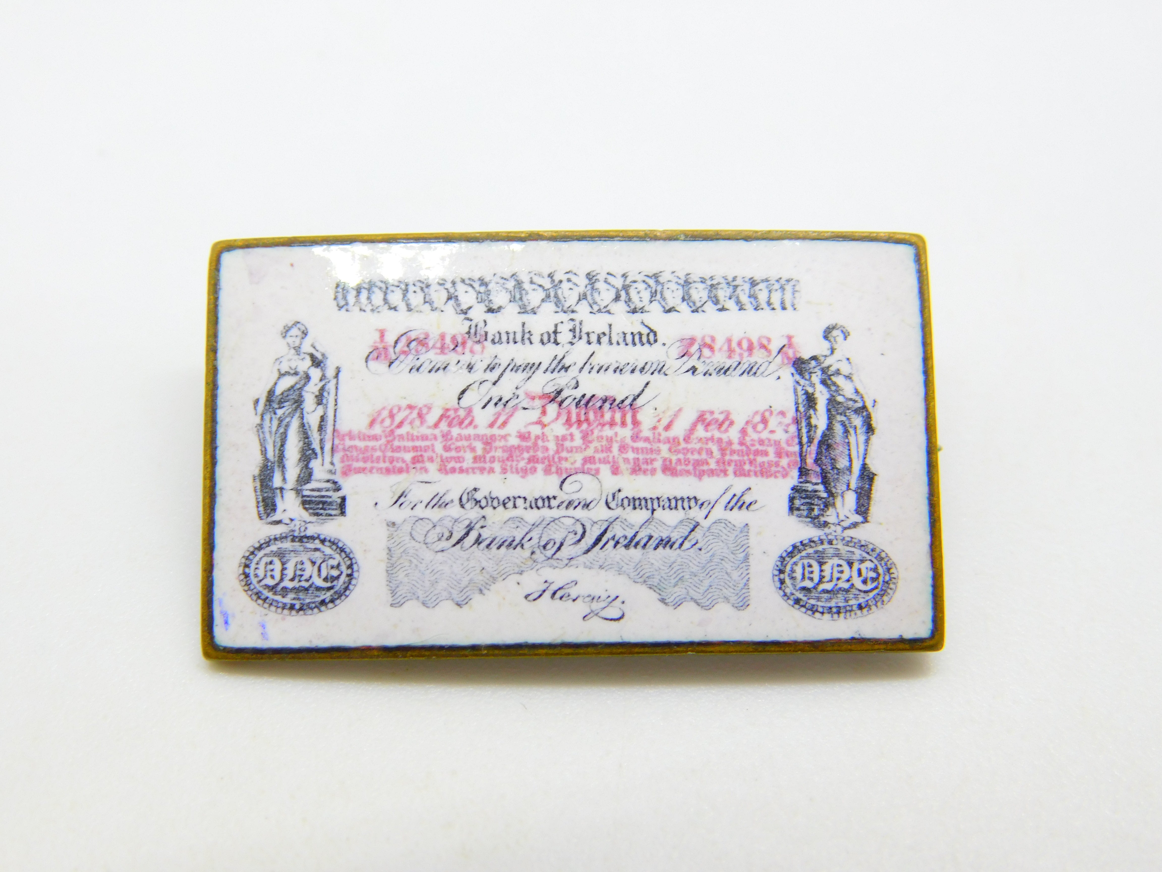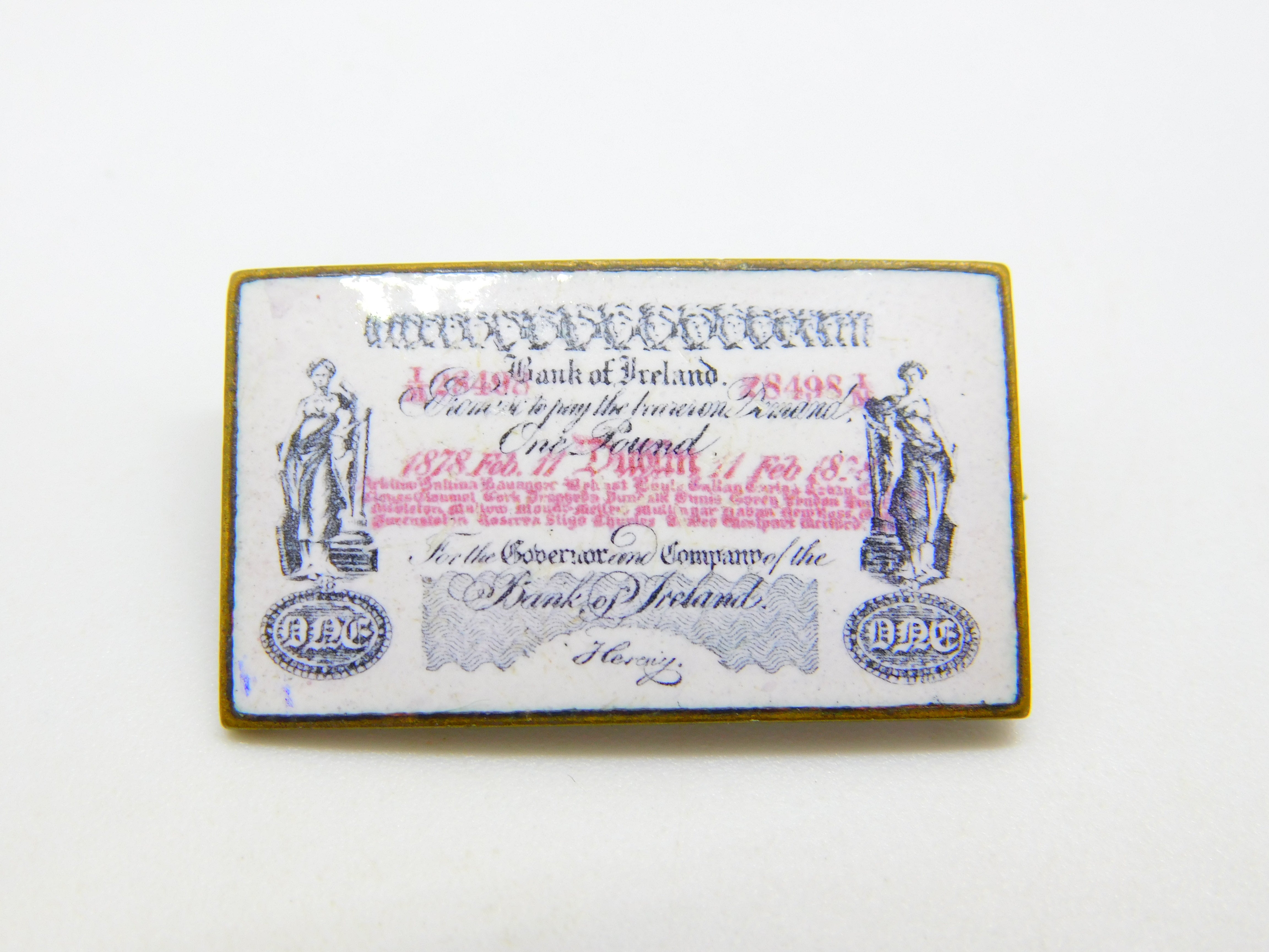 Details: A fantastic and wonderfully designed antique Victorian base metal brooch adorned with superbly detailing enamel depicting a Bank of Ireland One Pound Note dated 1878 with lovely detailing marked with 'Depose' French Trademark to the reverse. The enamel is in good order the white areas are simply light reflection. This is a wonderful item that would make a perfect gift or addition to any collection.
