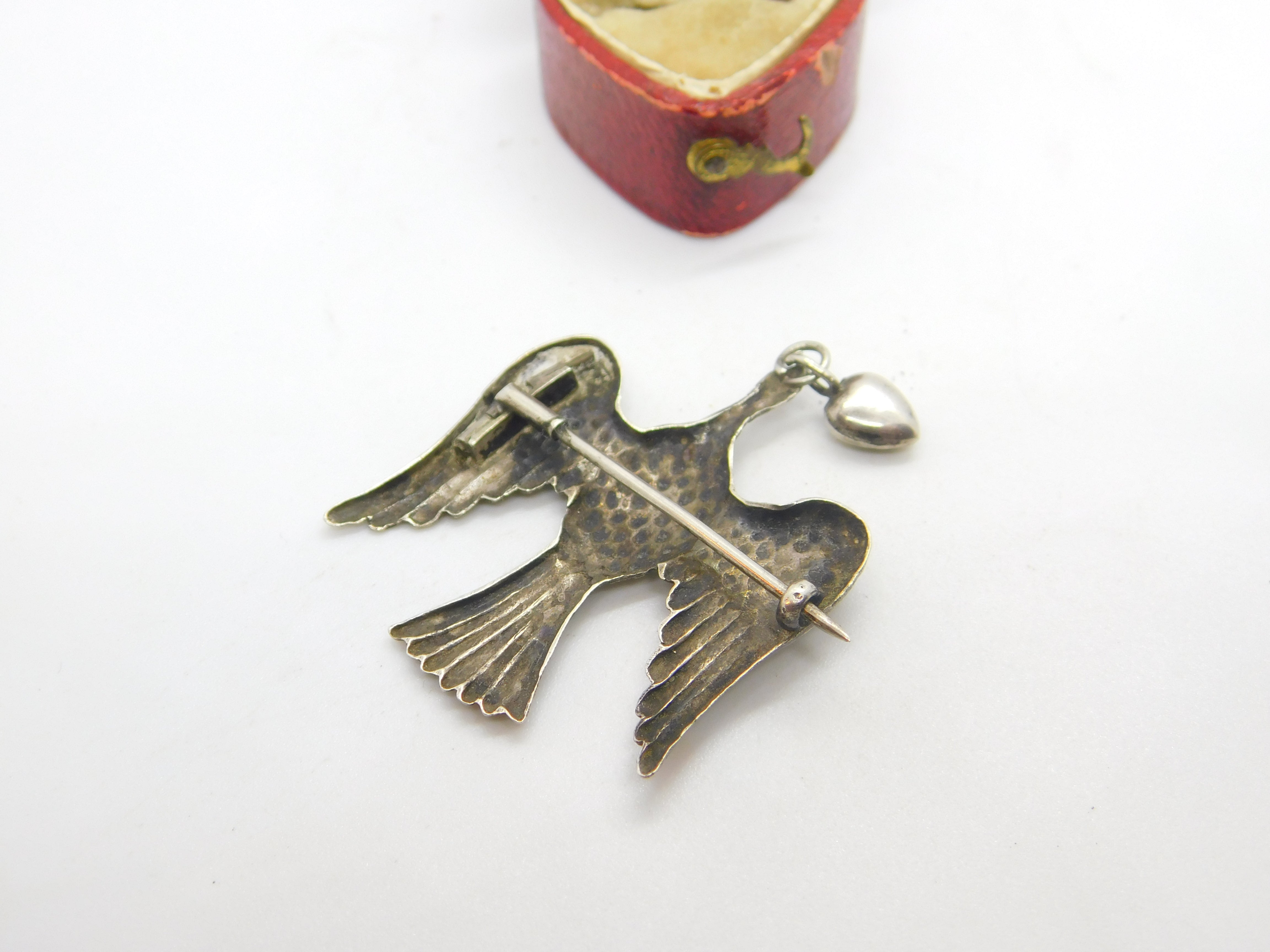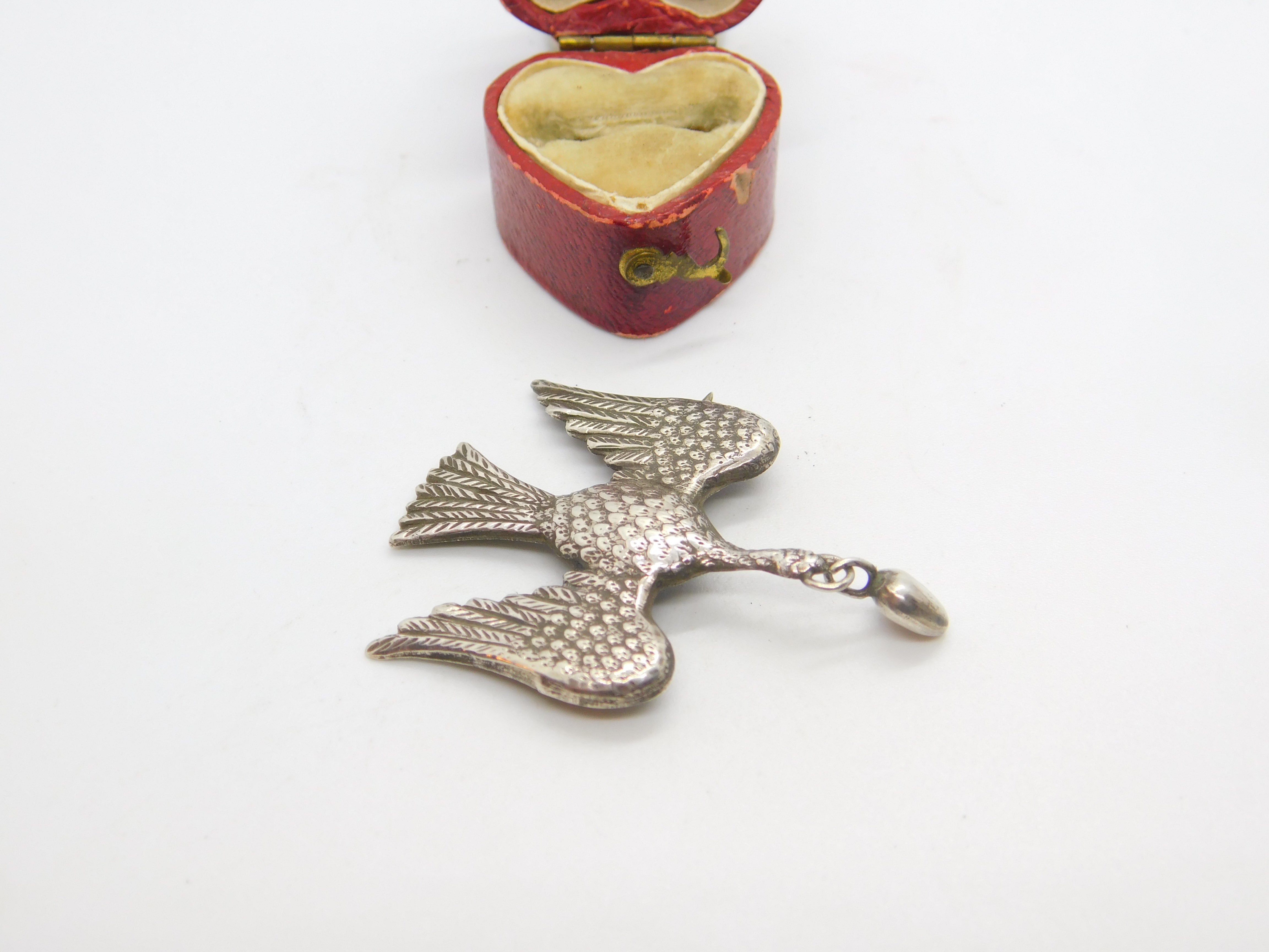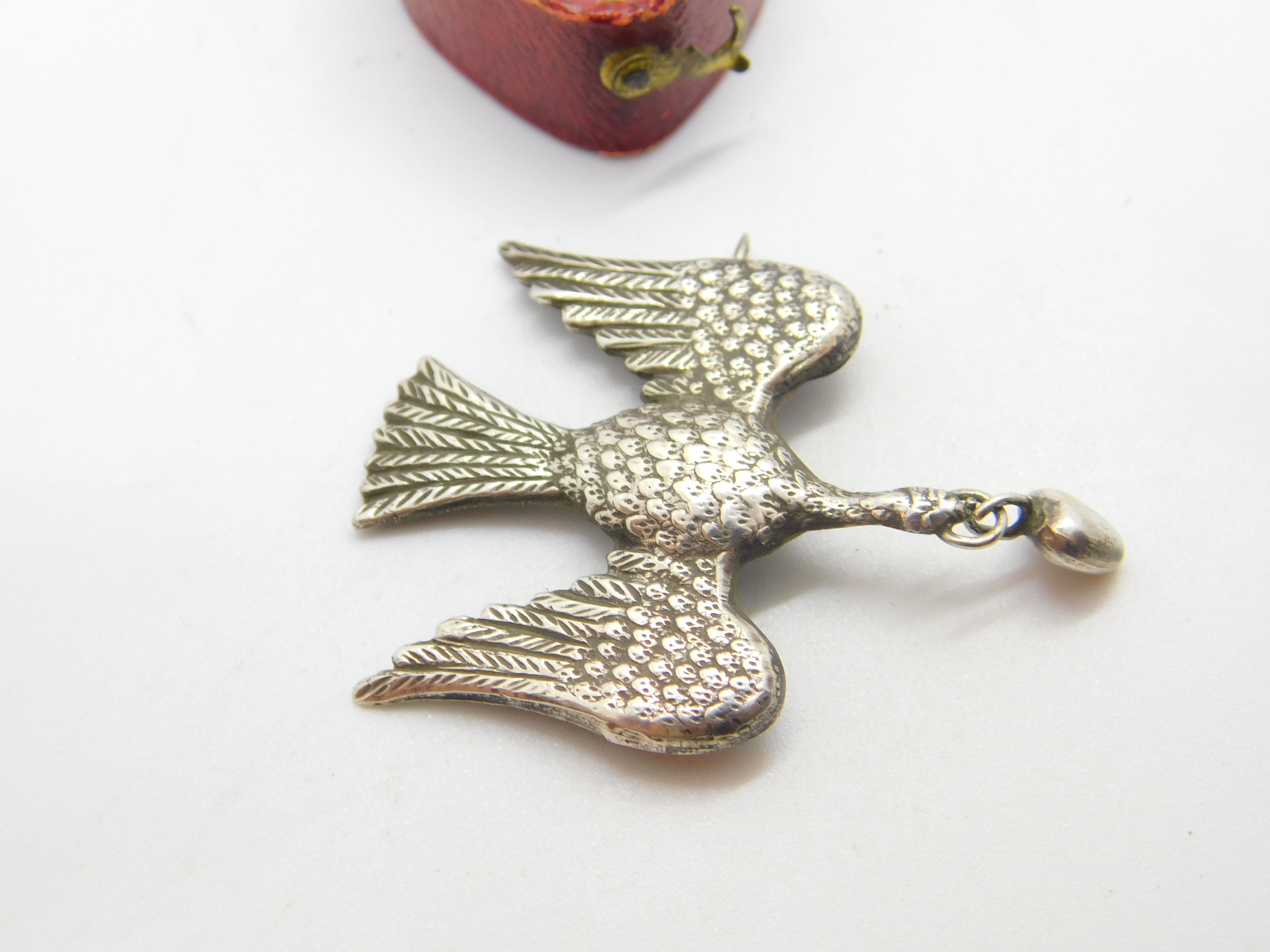 Details: A fantastic and wonderfully designed antique Victorian sterling silver dove of peace carrying a heart with great detailing c1860. The silver has been XRF tested. This is a wonderful item that would make a perfect gift or addition to any collection. The BOX pictured is for PRESENTATION ONLY and is NOT included in the listings but used to frame the pictures unless specifically stated otherwise.