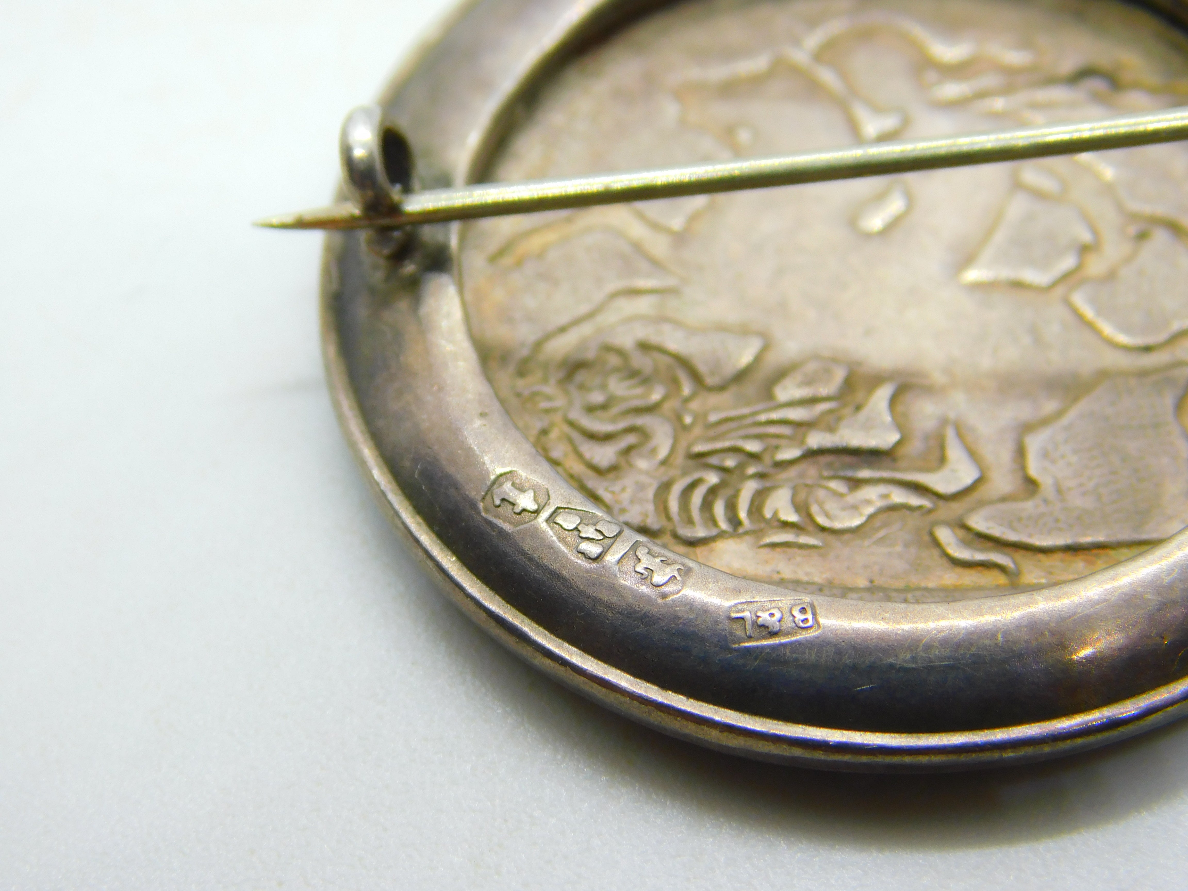 Victorian Sterling Silver Enamel Crown Coin Brooch Antique 1882 Chester