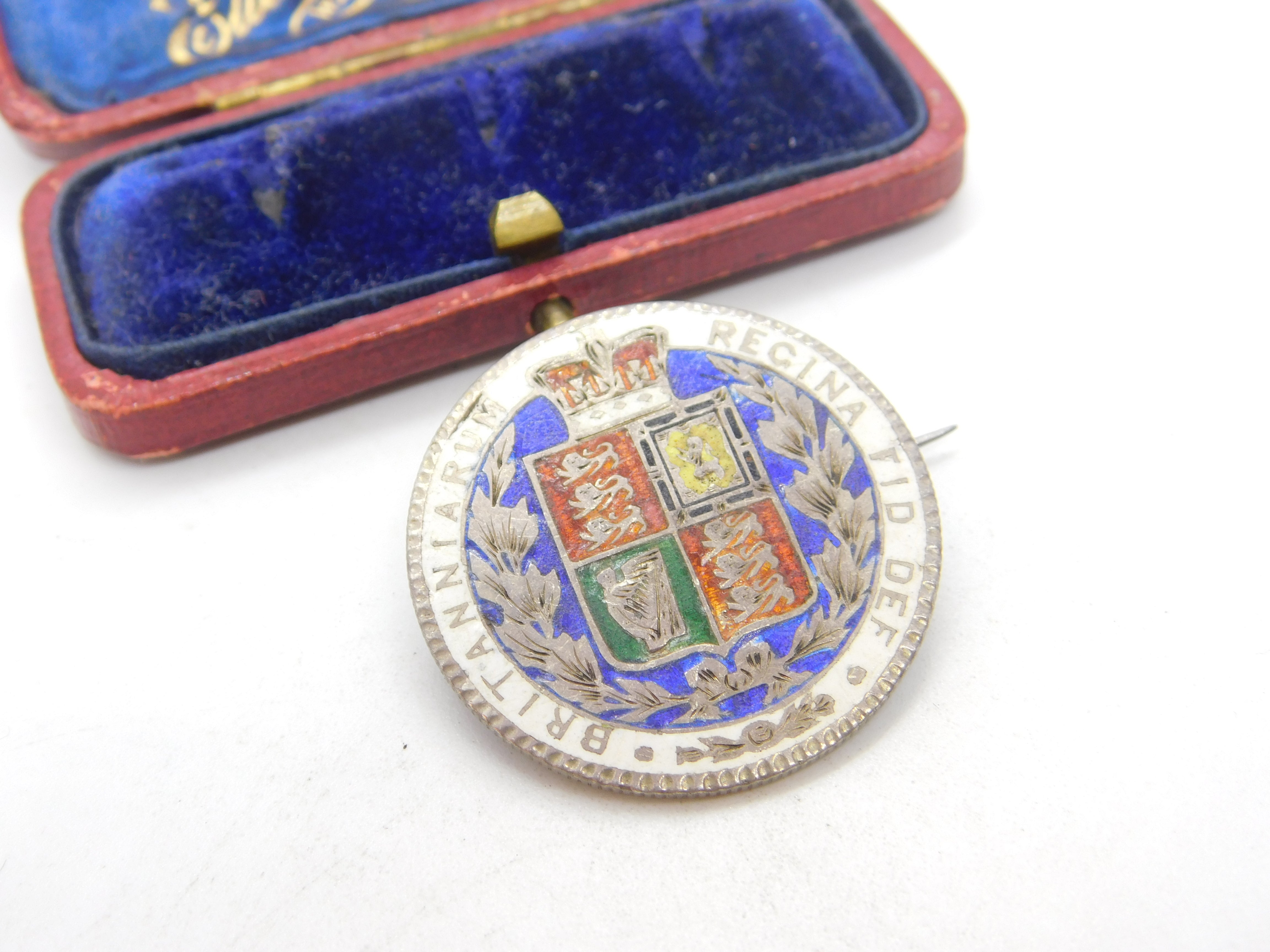 Details: A fantastic and wonderfully designed antique Victorian sterling silver colourful enamel half crown coin brooch dated c1860 with lovely design. This is a wonderful item that would make a perfect gift or addition to any collection. The BOX pictured is for PRESENTATION ONLY and is NOT included in the listings but used to frame the pictures unless specifically stated otherwise.