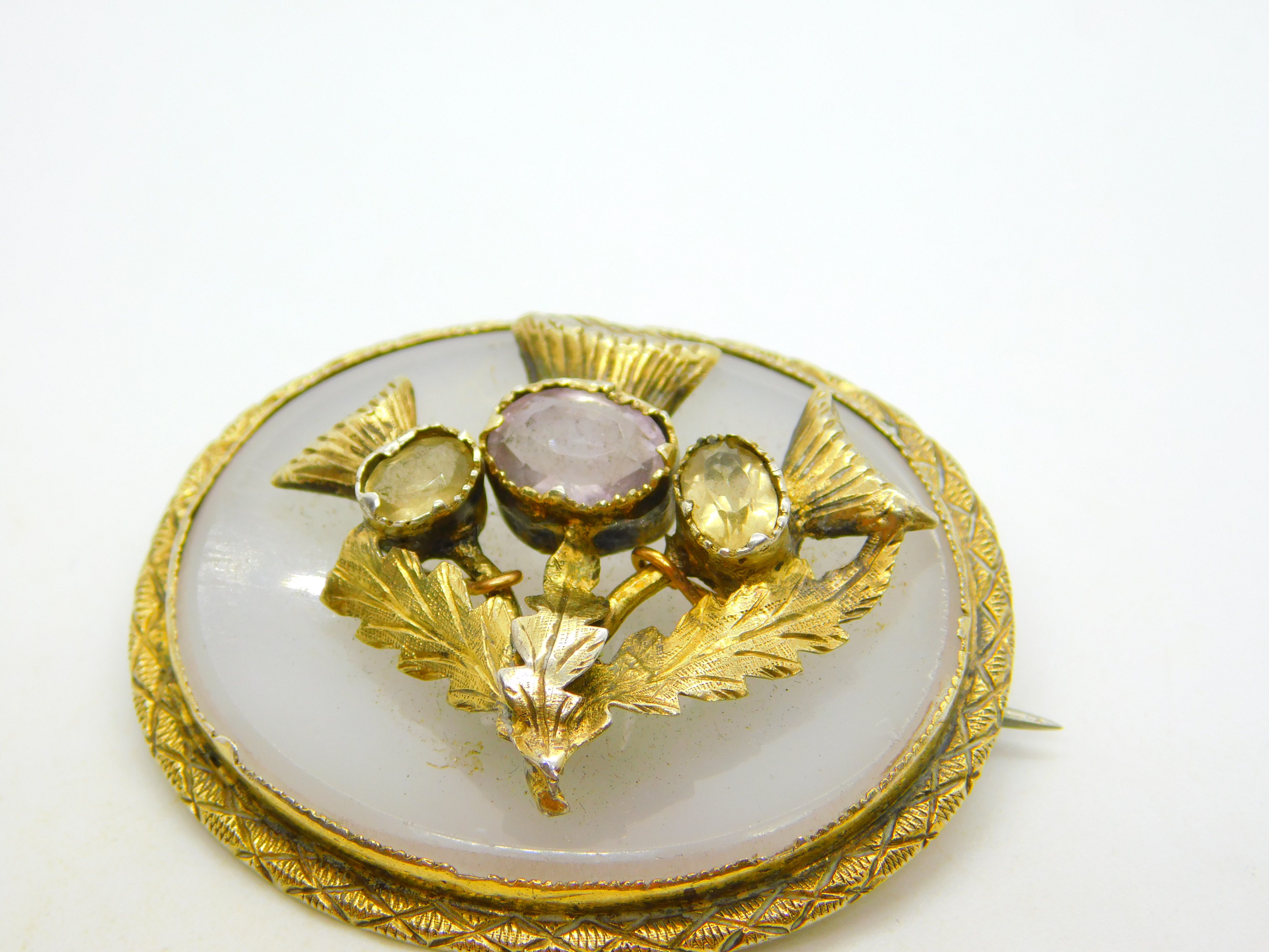 Details: A fantastic and wonderfully designed antique Victorian sterling silver gilt Scottish sweetheart thistle brooch set with citrines and a central amethyst in chalcedony agate panel c1880, the silver has been XRF tested as it is unmarked. This is a wonderful item that would make a perfect gift or addition to any collection. The BOX pictured is for PRESENTATION ONLY and is NOT included in the listings but used to frame the pictures unless specifically stated otherwise.