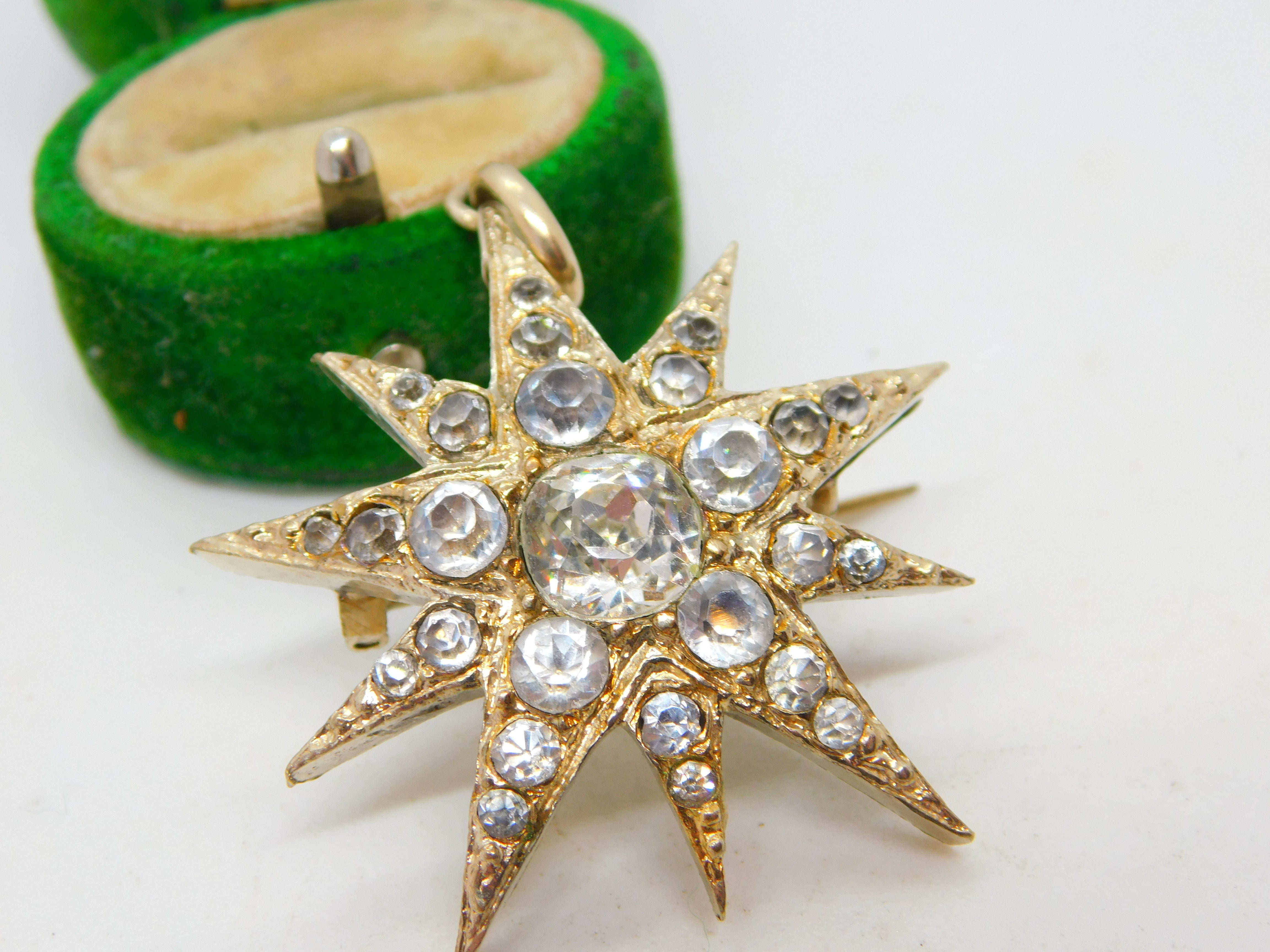Details: A fantastic and wonderfully designed antique Victorian sterling silver gilt & paste set starburst drop pendant or brooch c1880, the gold has been XRF tested as it is unmarked. This is a wonderful item that would make a perfect gift or addition to any collection. The BOX pictured is for PRESENTATION ONLY and is NOT included in the listings but used to frame the pictures unless specifically stated otherwise.