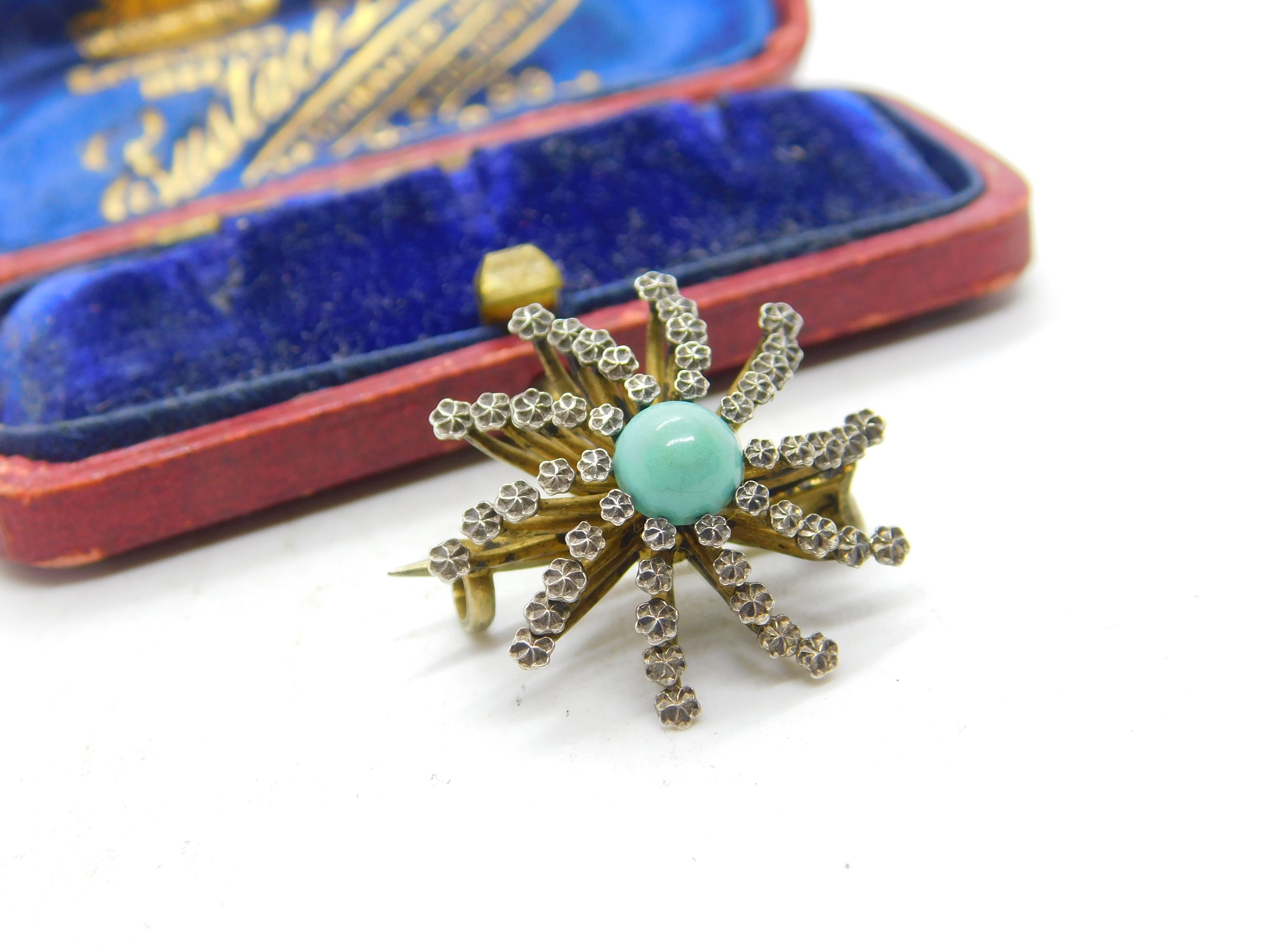 Details: A fantastic and wonderfully designed antique Victorian sterling silver gilt spray form brooch with pyrite and turquoise set detail c1880. This is a wonderful item that would make a perfect gift or addition to any collection. The BOX pictured is for PRESENTATION ONLY and is NOT included in the listings but used to frame the pictures unless specifically stated otherwise.