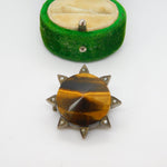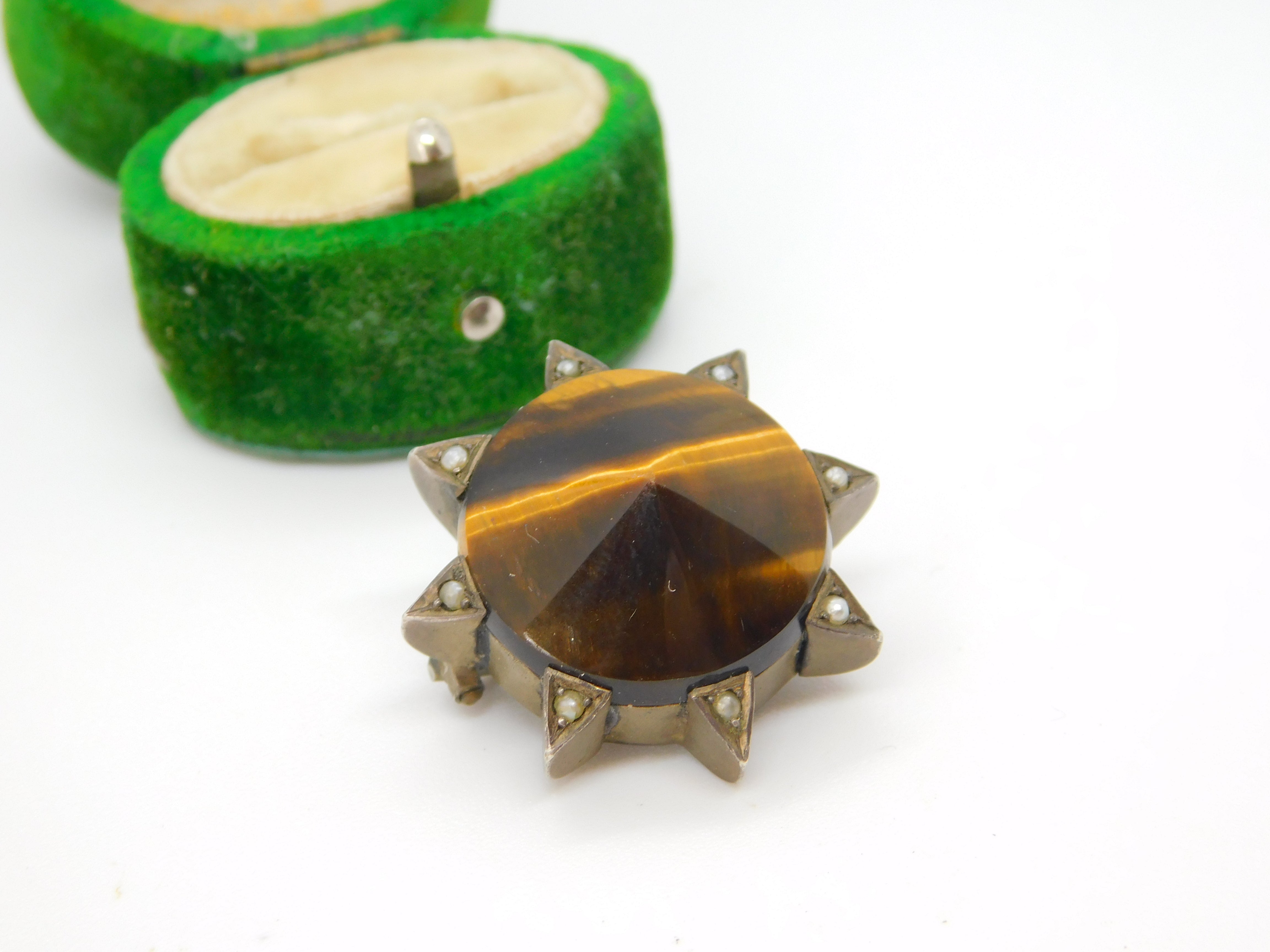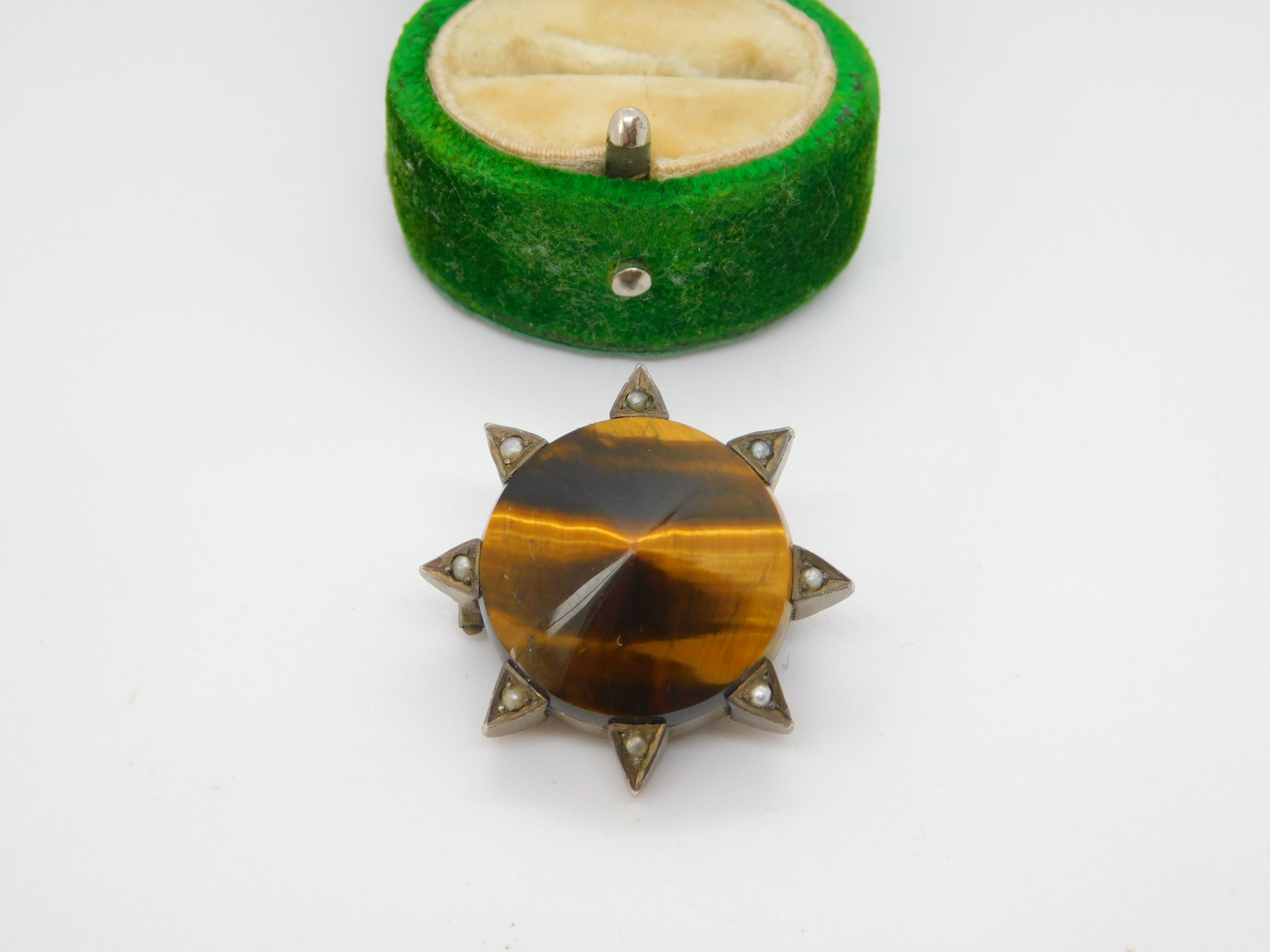 Details: A fantastic and wonderfully designed antique Victorian sterling silver gilt sun or star brooch set with central tiger's eye flanked by seed pearls c1880, the silver has been XRF tested. This is a wonderful item that would make a perfect gift or addition to any collection. The BOX pictured is for PRESENTATION ONLY and is NOT included in the listings but used to frame the pictures unless specifically stated otherwise.