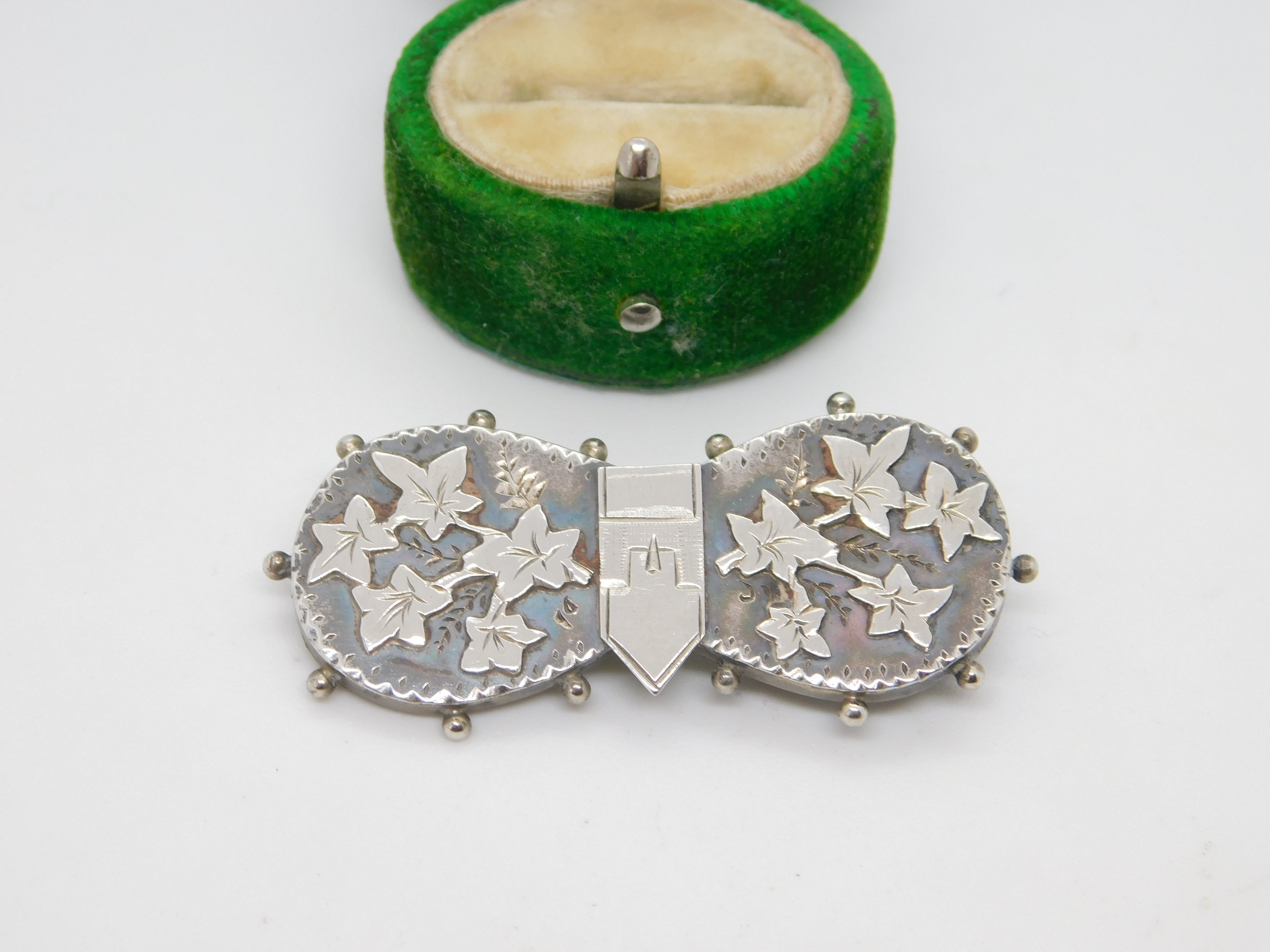 Victorian Sterling Silver Ivy Leaf & Buckle Sweetheart Brooch Antique 1884