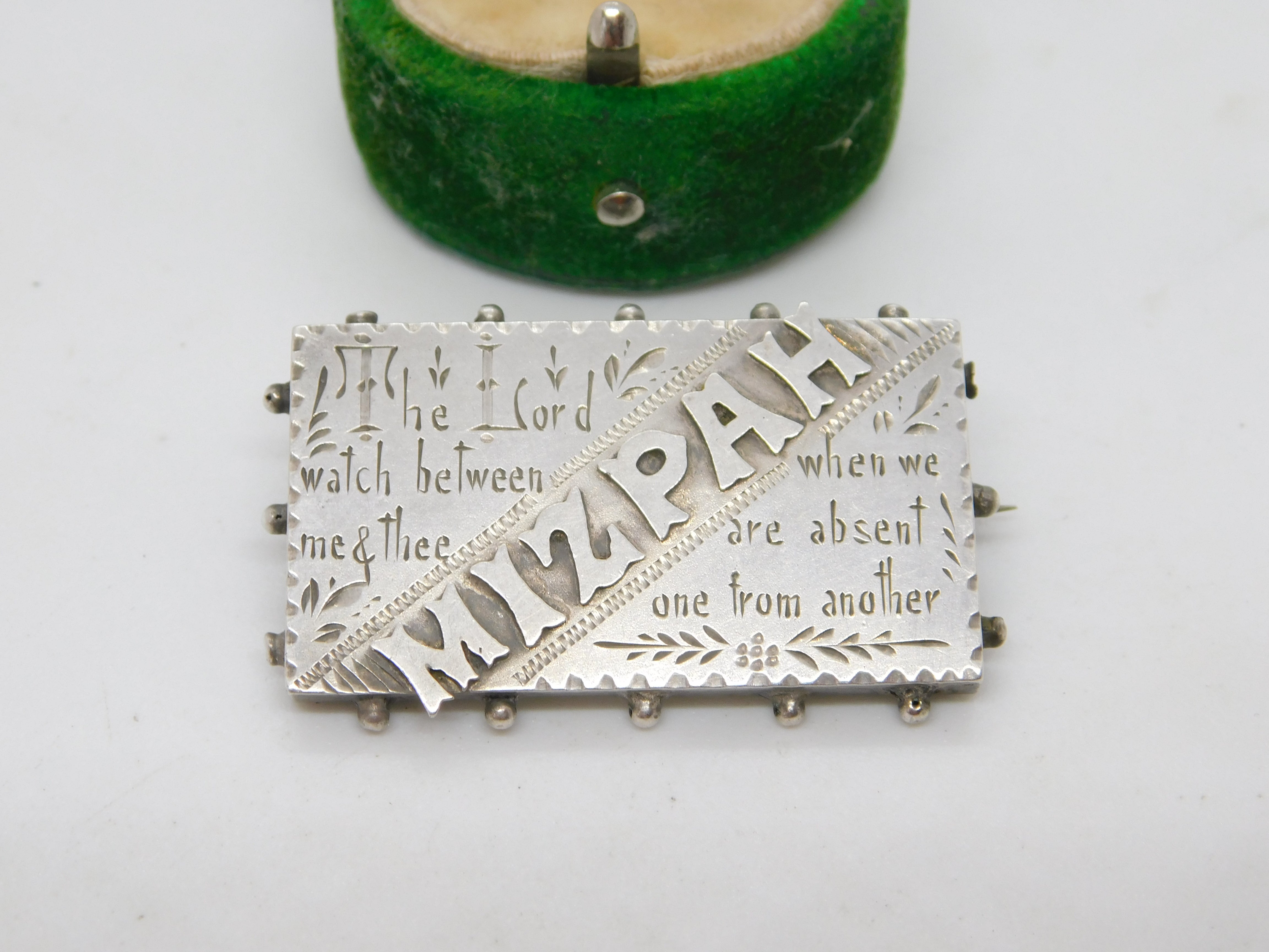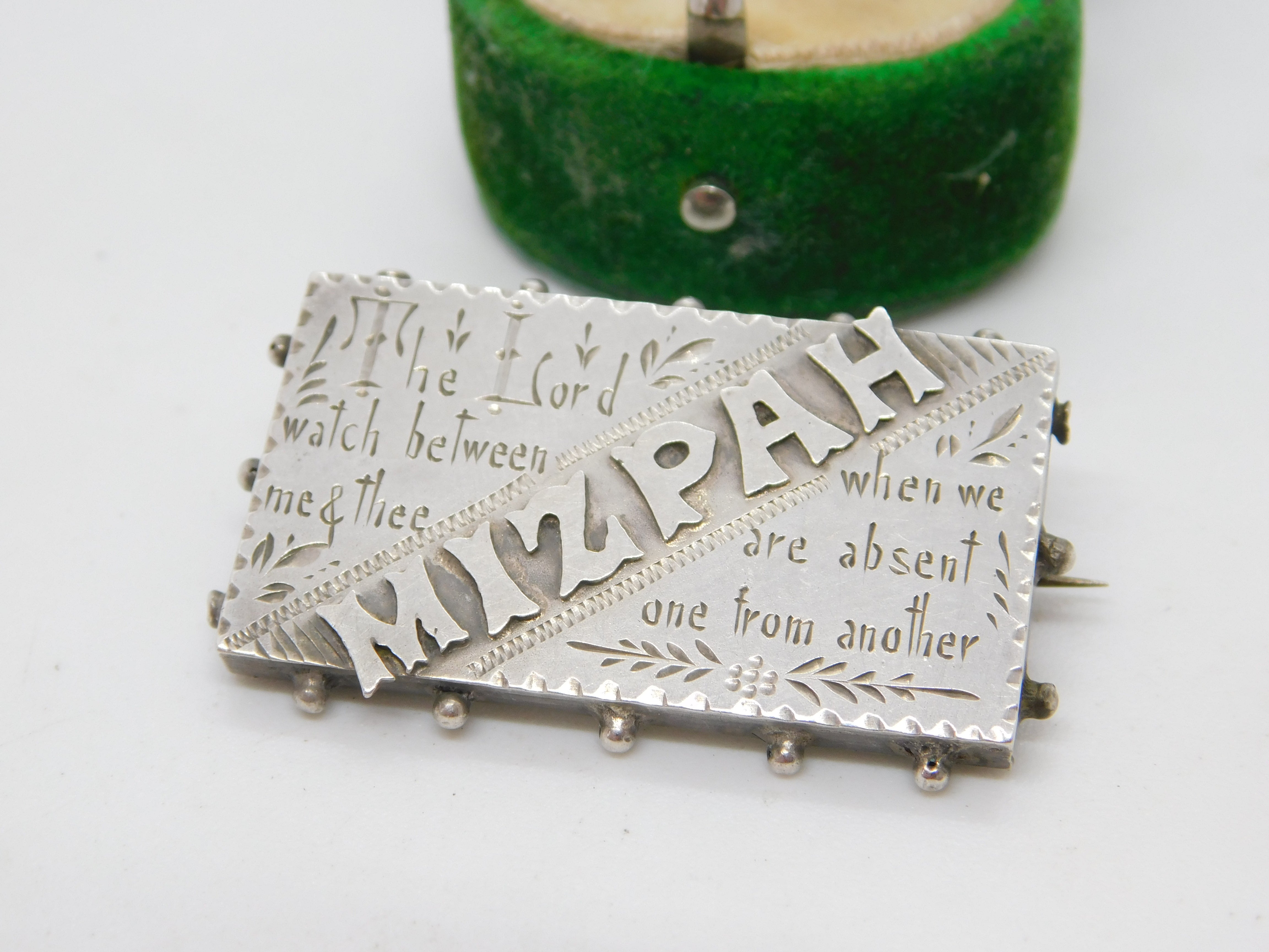 Details: A fantastic and wonderfully designed antique Victorian sterling silver Mizpah sweetheart brooch with charming textual detailing to the front hallmarked Birmingham 1893. This is a wonderful item that would make a perfect gift or addition to any collection. The BOX pictured is for PRESENTATION ONLY and is NOT included in the listings but used to frame the pictures unless specifically stated otherwise.