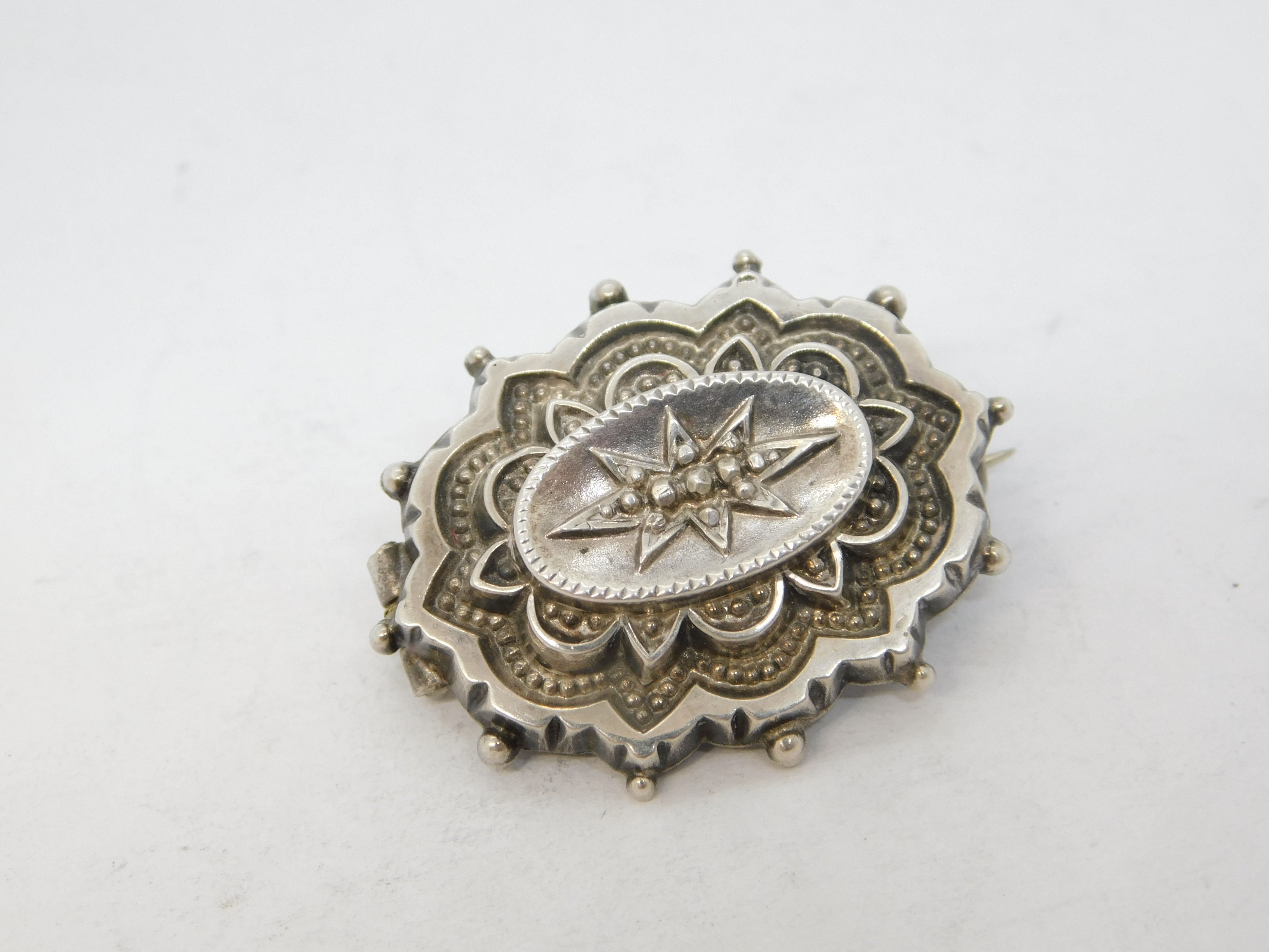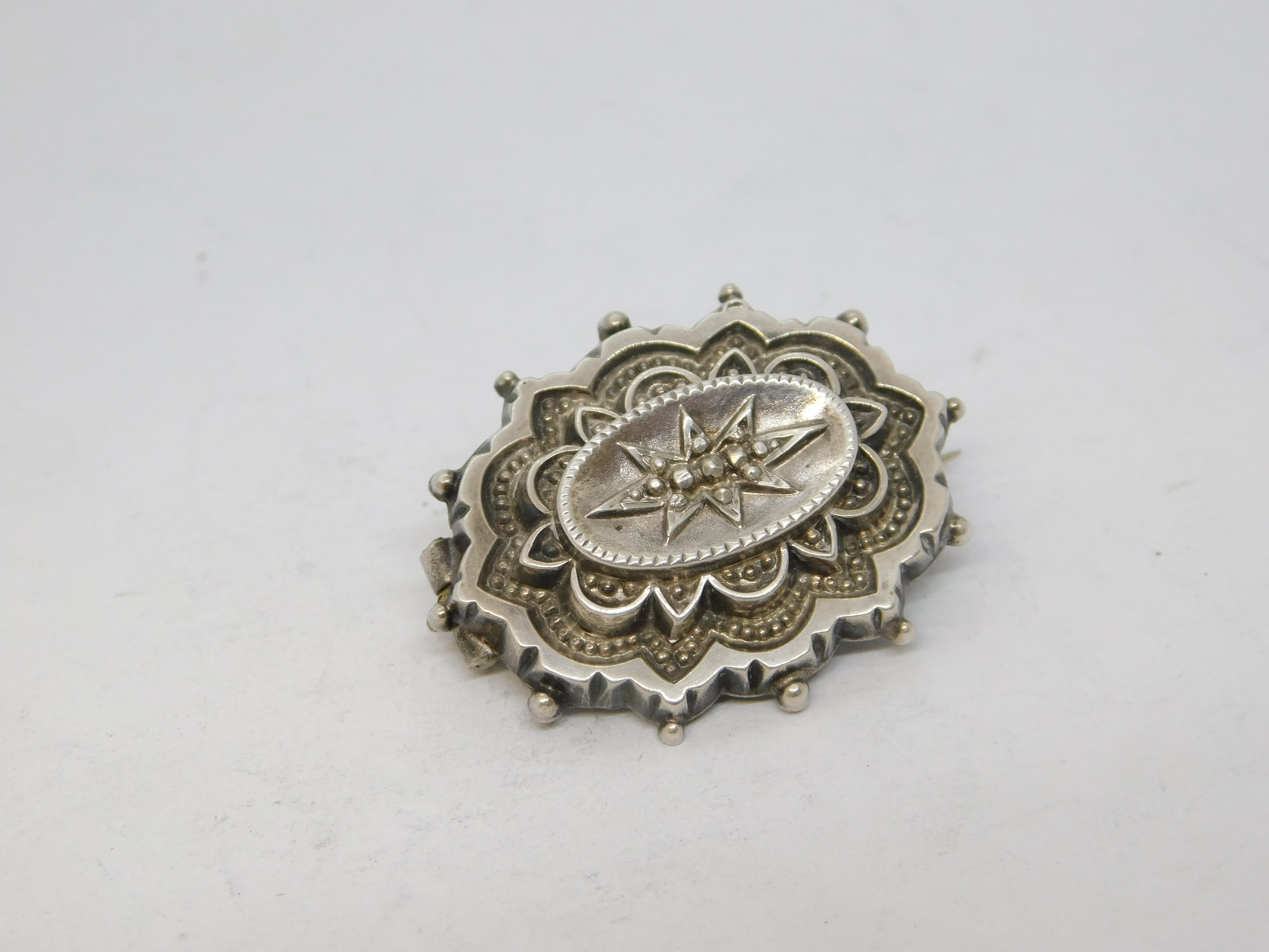 Details: A fantastic and wonderfully designed antique Victorian sterling silver star form locket set mourning brooch with lovely detailing c1880. This is a wonderful item that would make a perfect gift or addition to any collection.