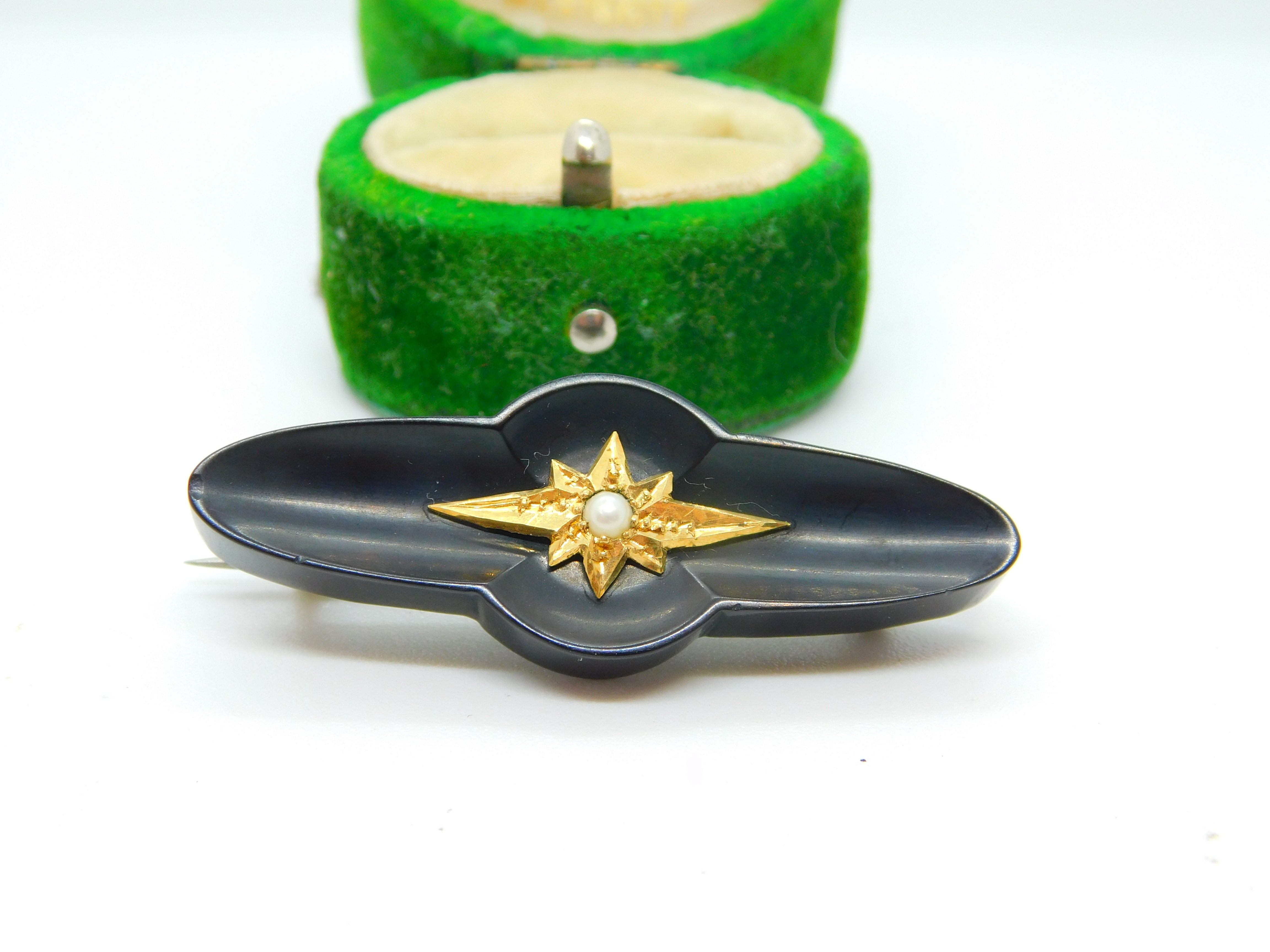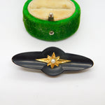 Victorian Whitby Jet, 9ct Gold & Seed Pearl Mourning Brooch Antique c1880
