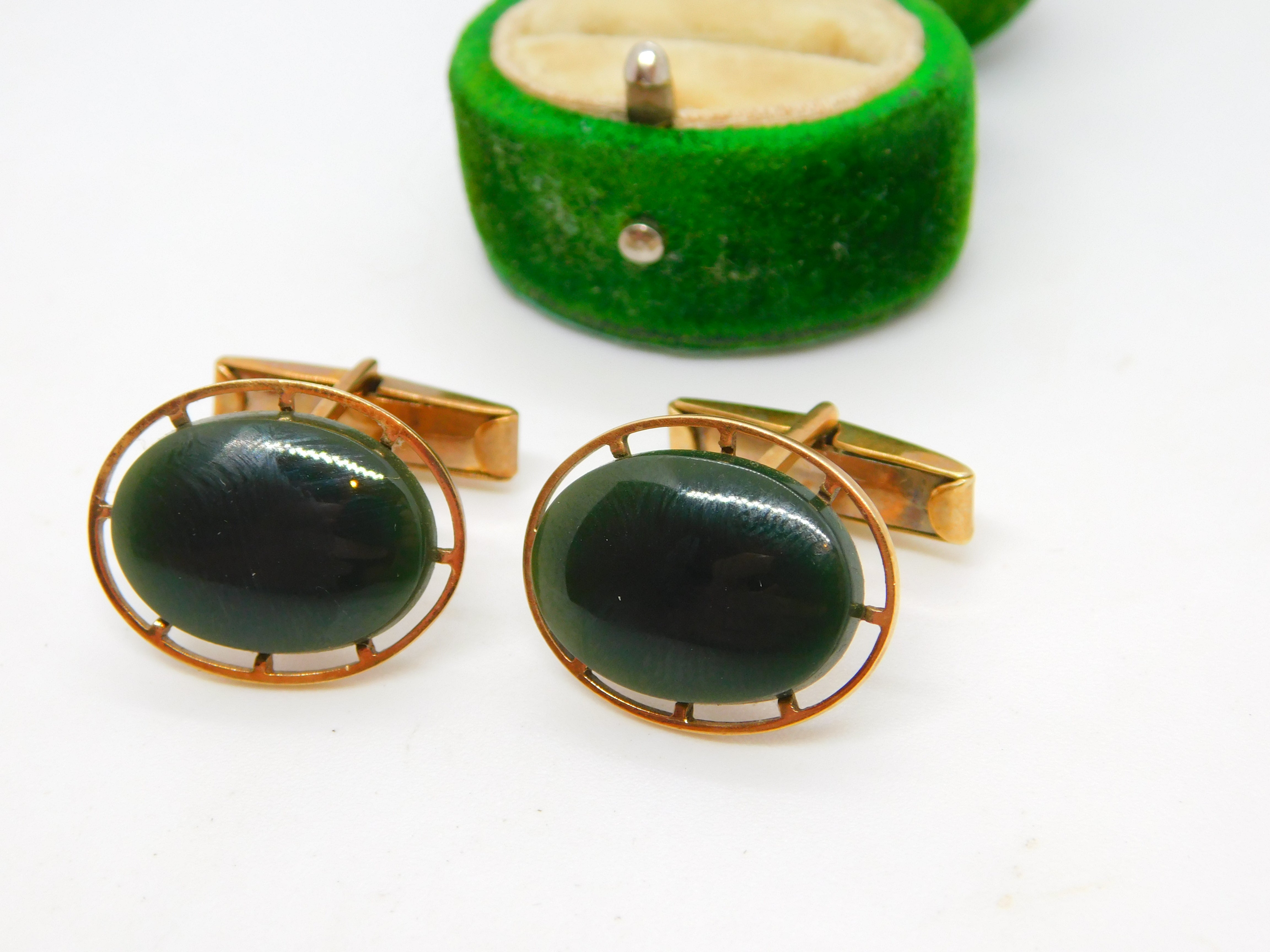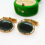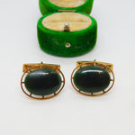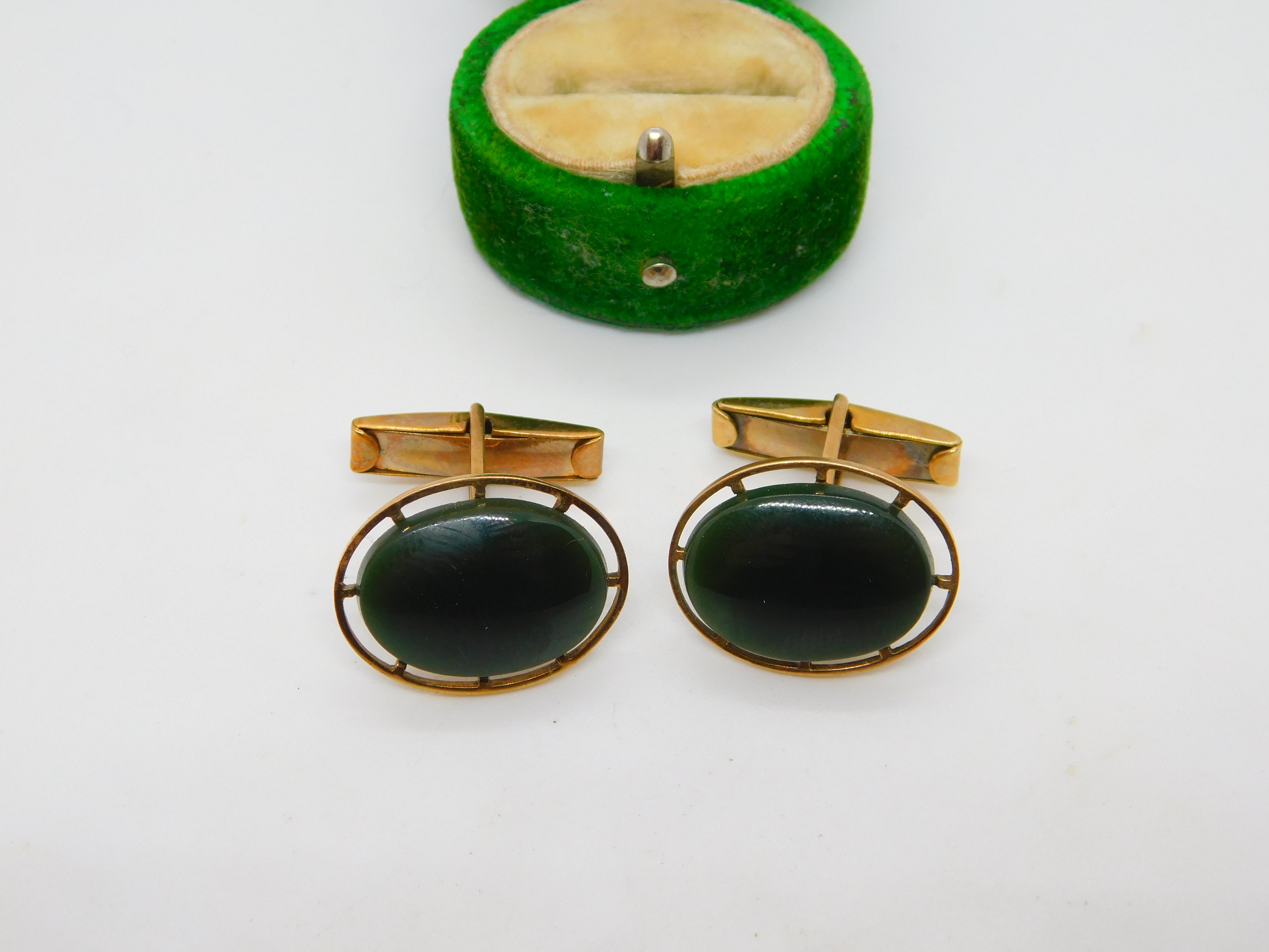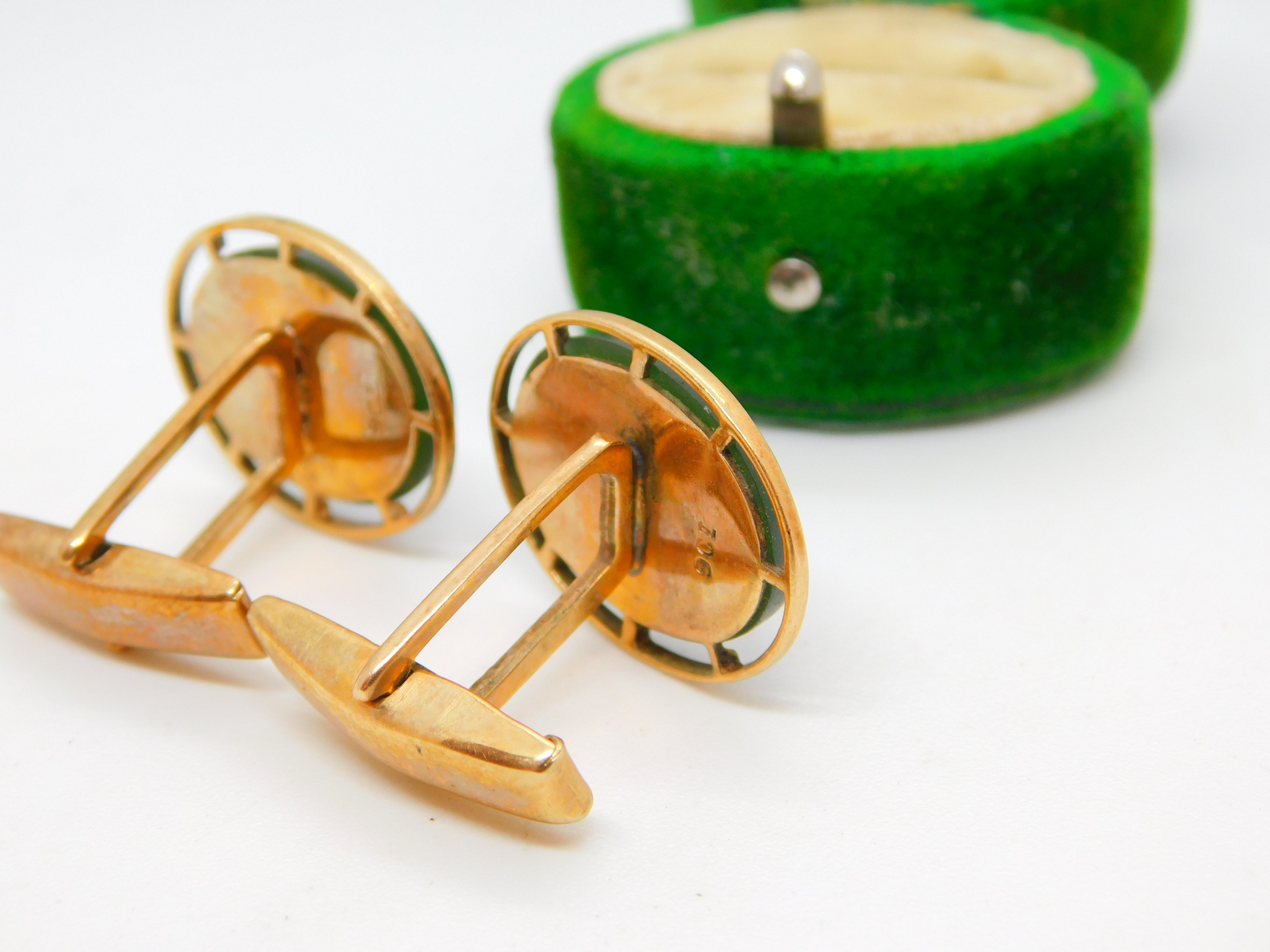 9ct Yellow Gold Nephrite Jade Set Gents Cufflinks Antique c1920 Art Deco