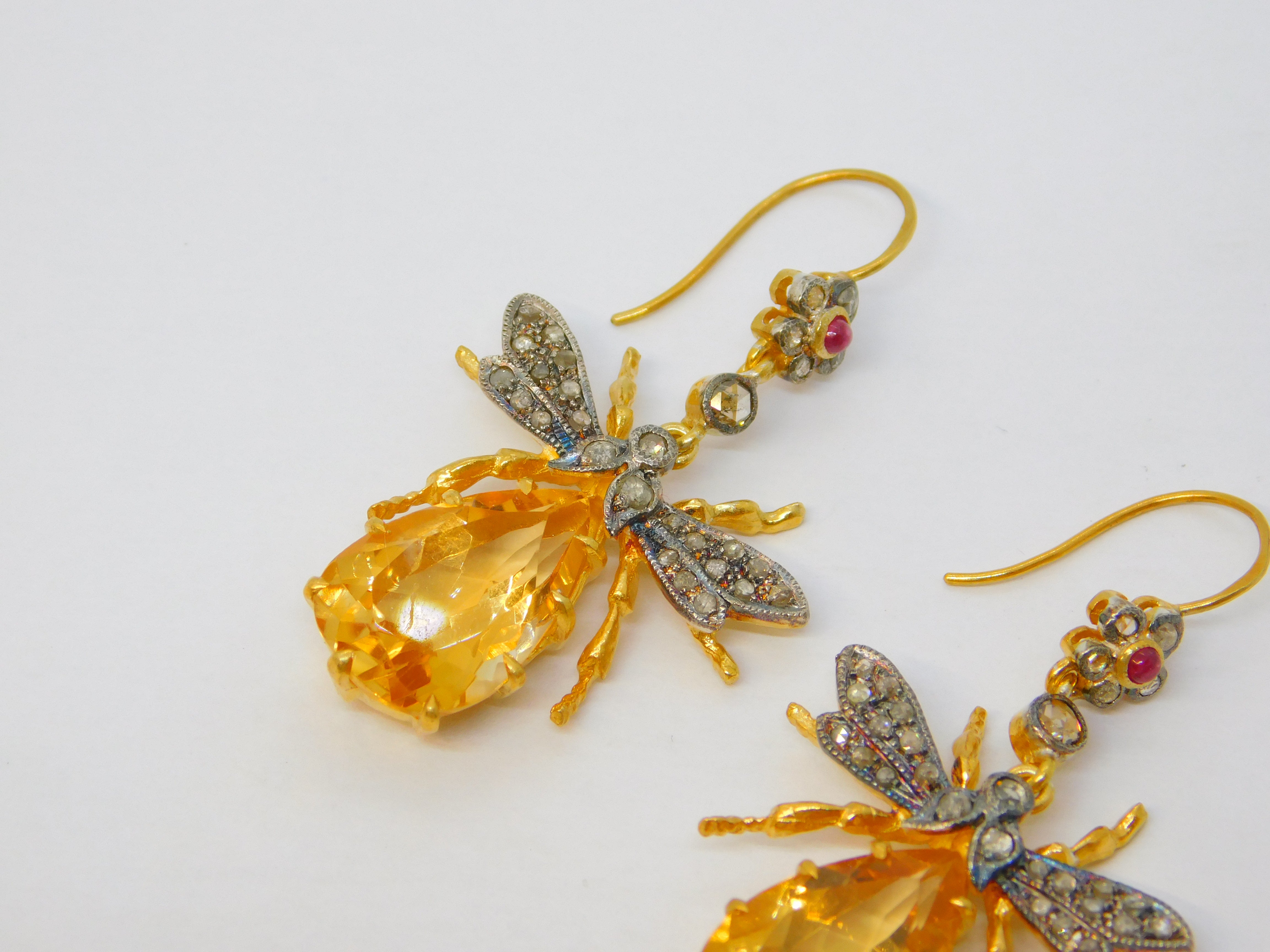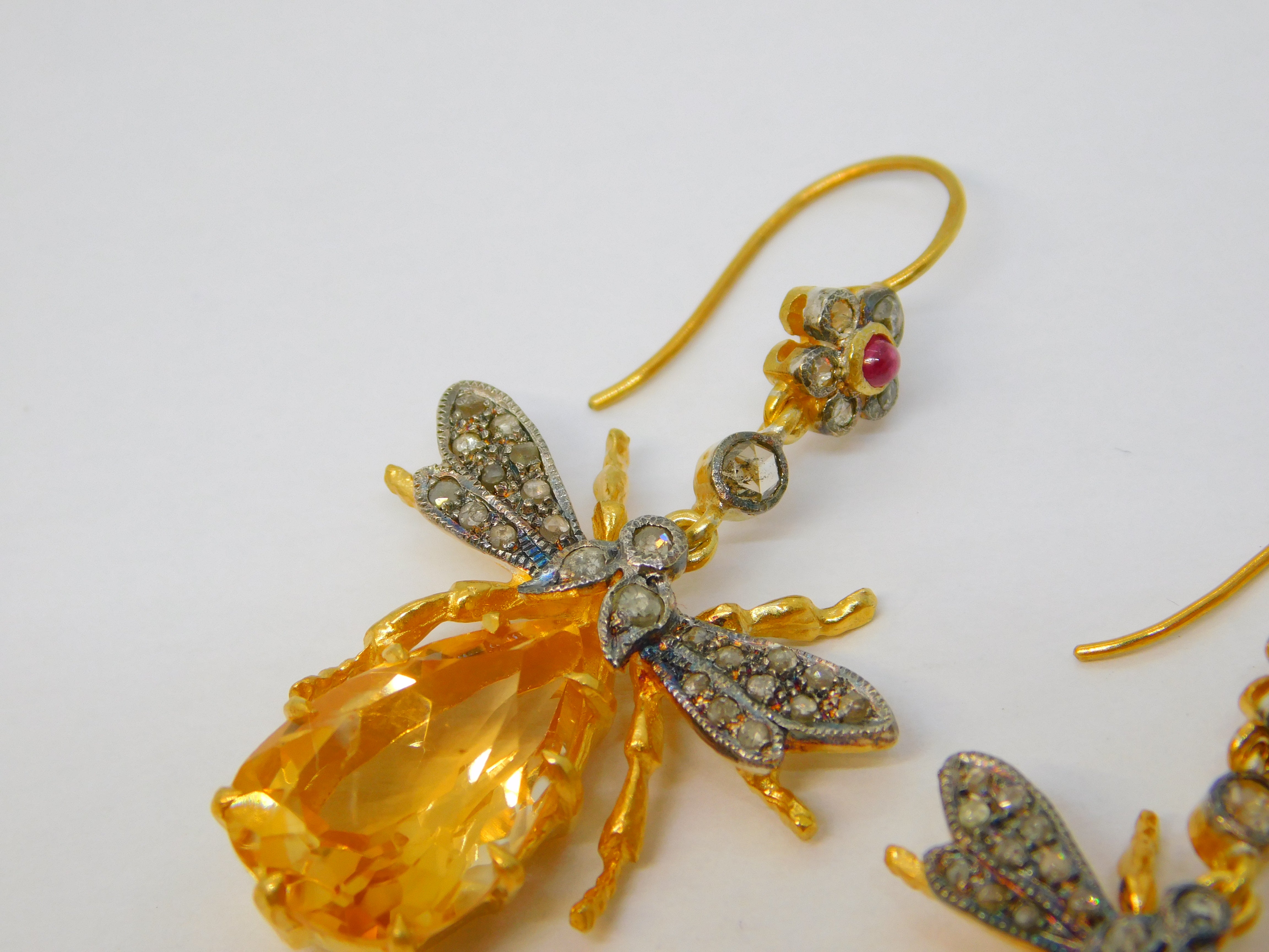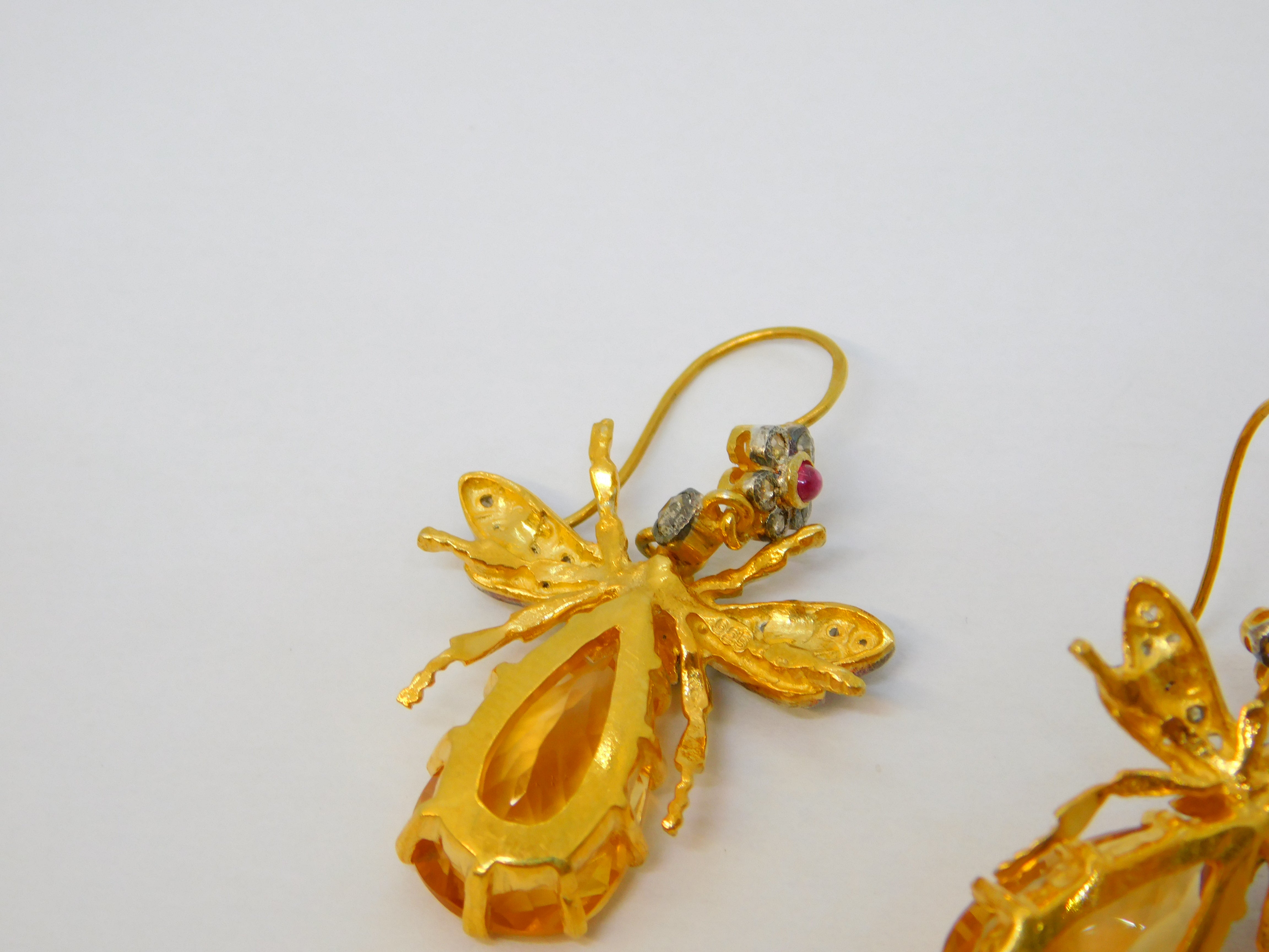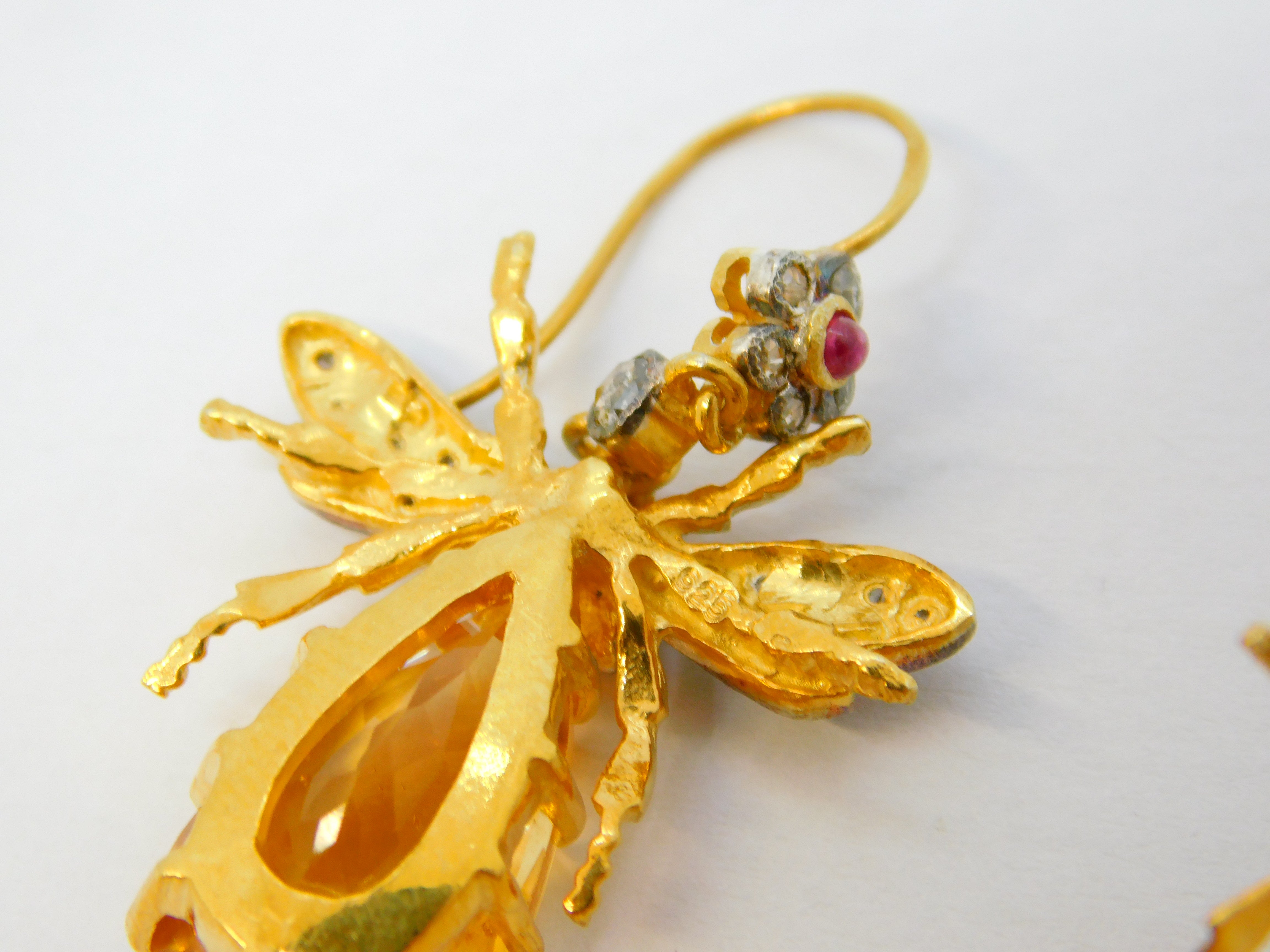 Details: A fantastic and wonderfully designed vintage pair of 9ct yellow gold and sterling silver gilt large insect or bug hook earrings set throughout with rubies & diamonds alongside a large oval cut central citrine set to the body marked 375 to the hooks and 925 to the body, all the stones have been tested. This is a wonderful item that would make a perfect gift or addition to any collection.