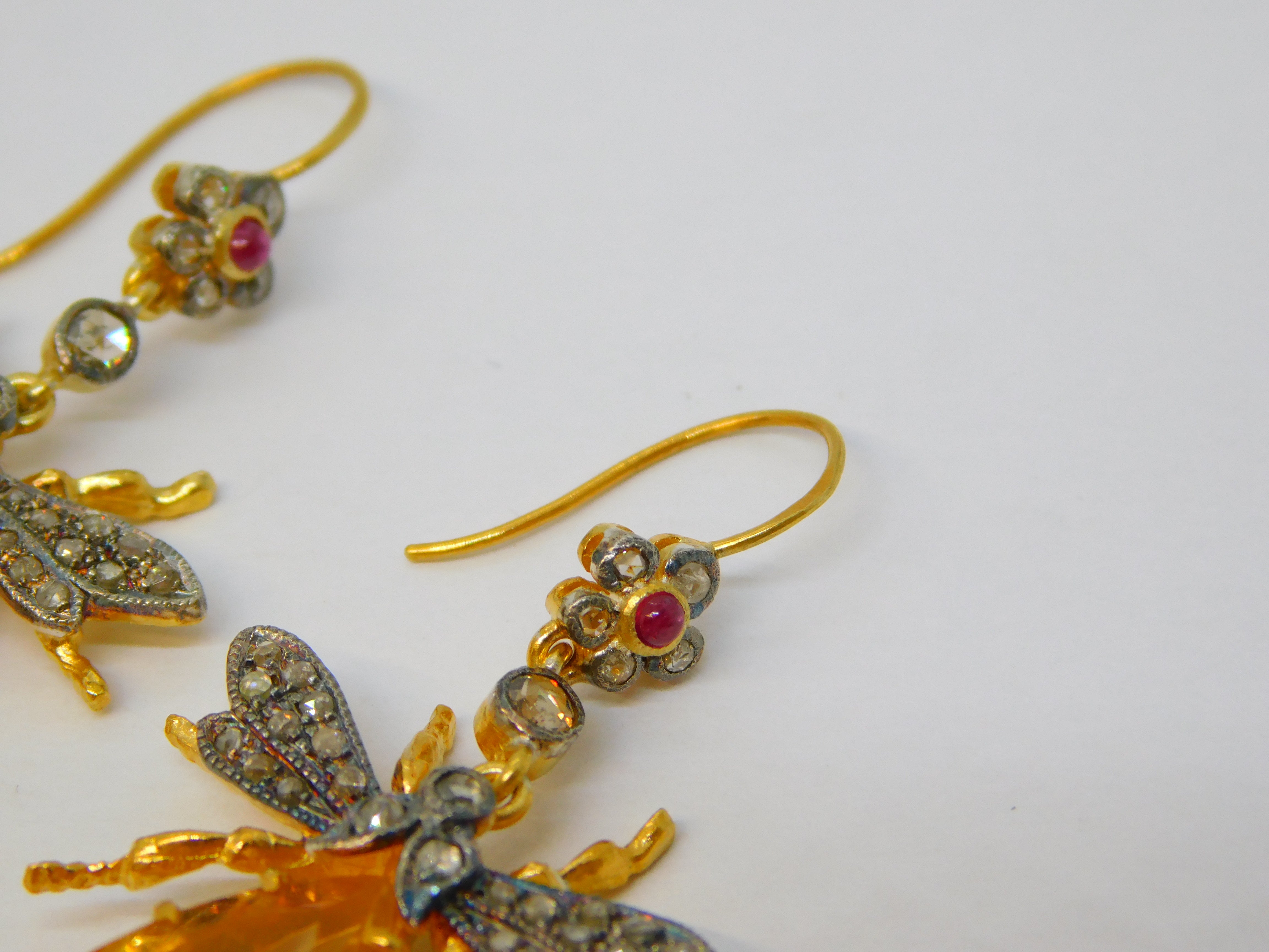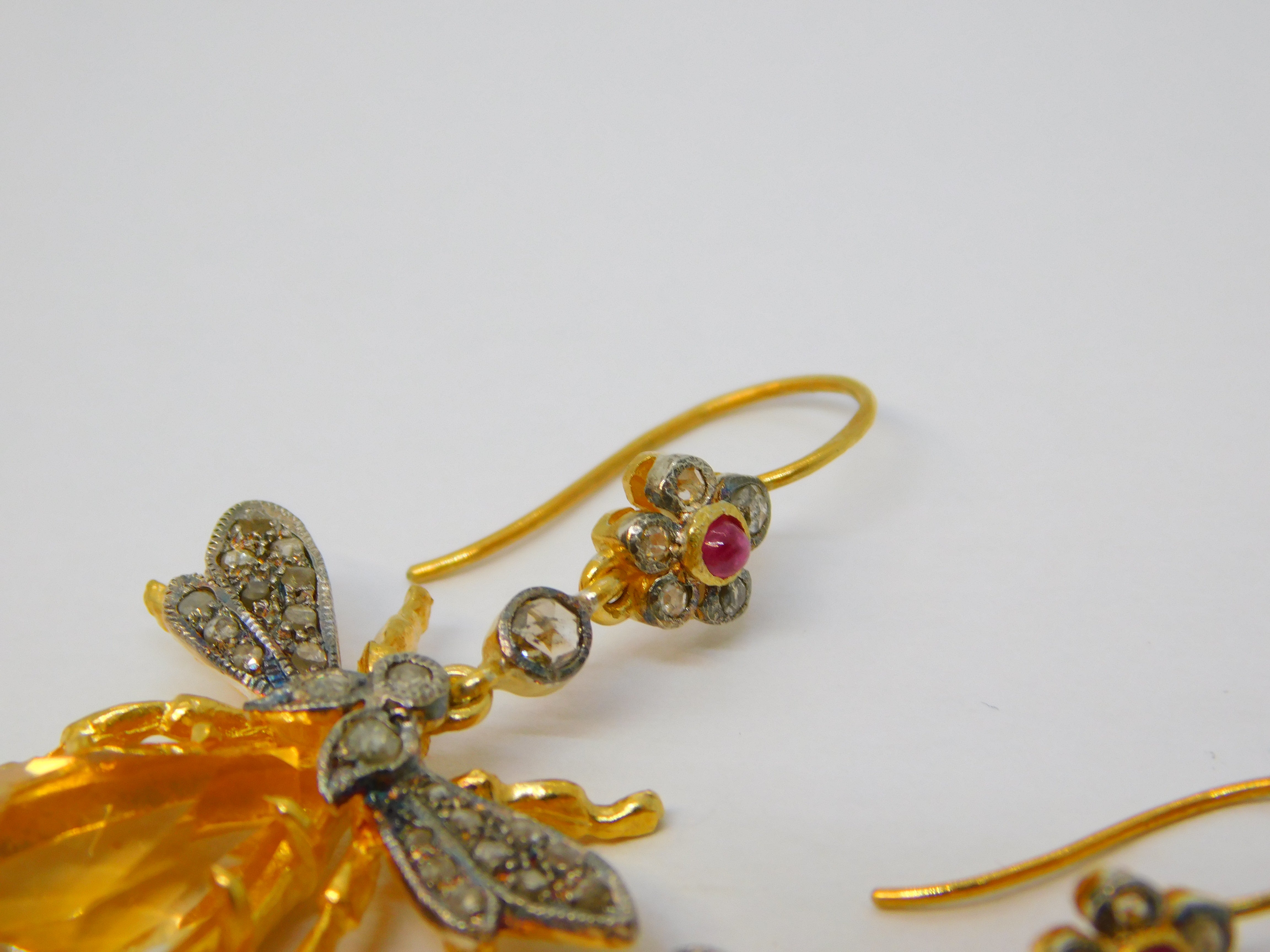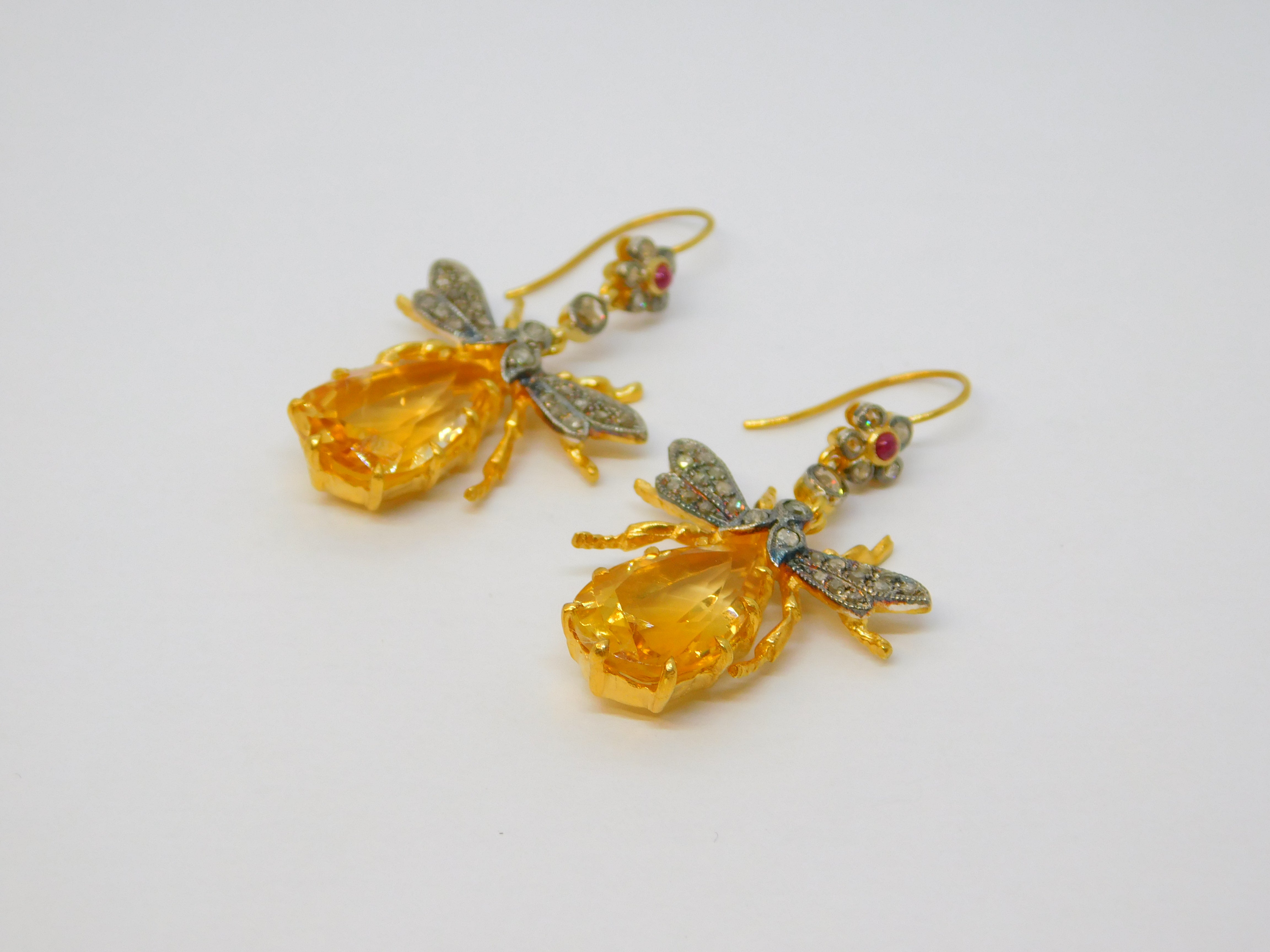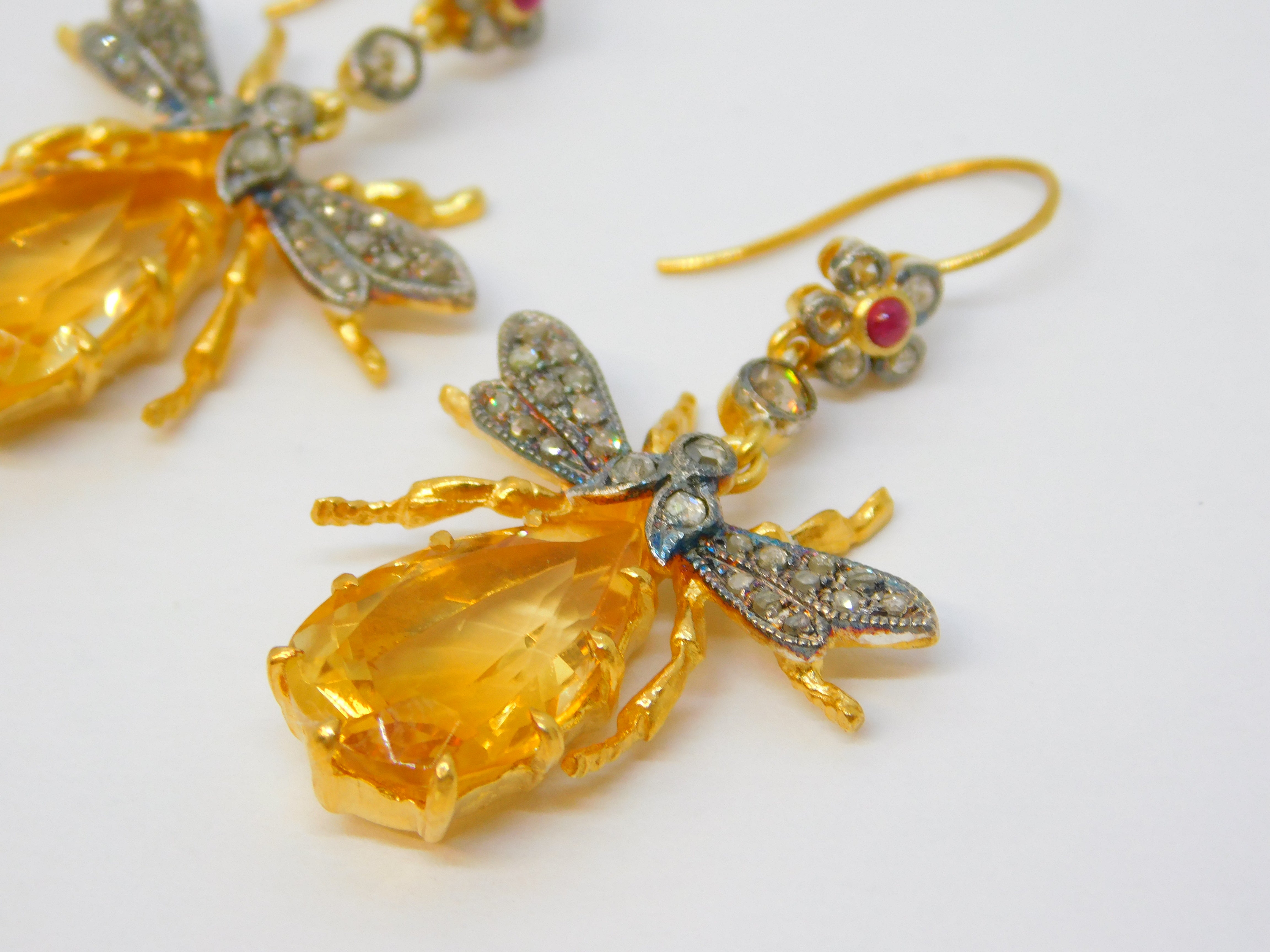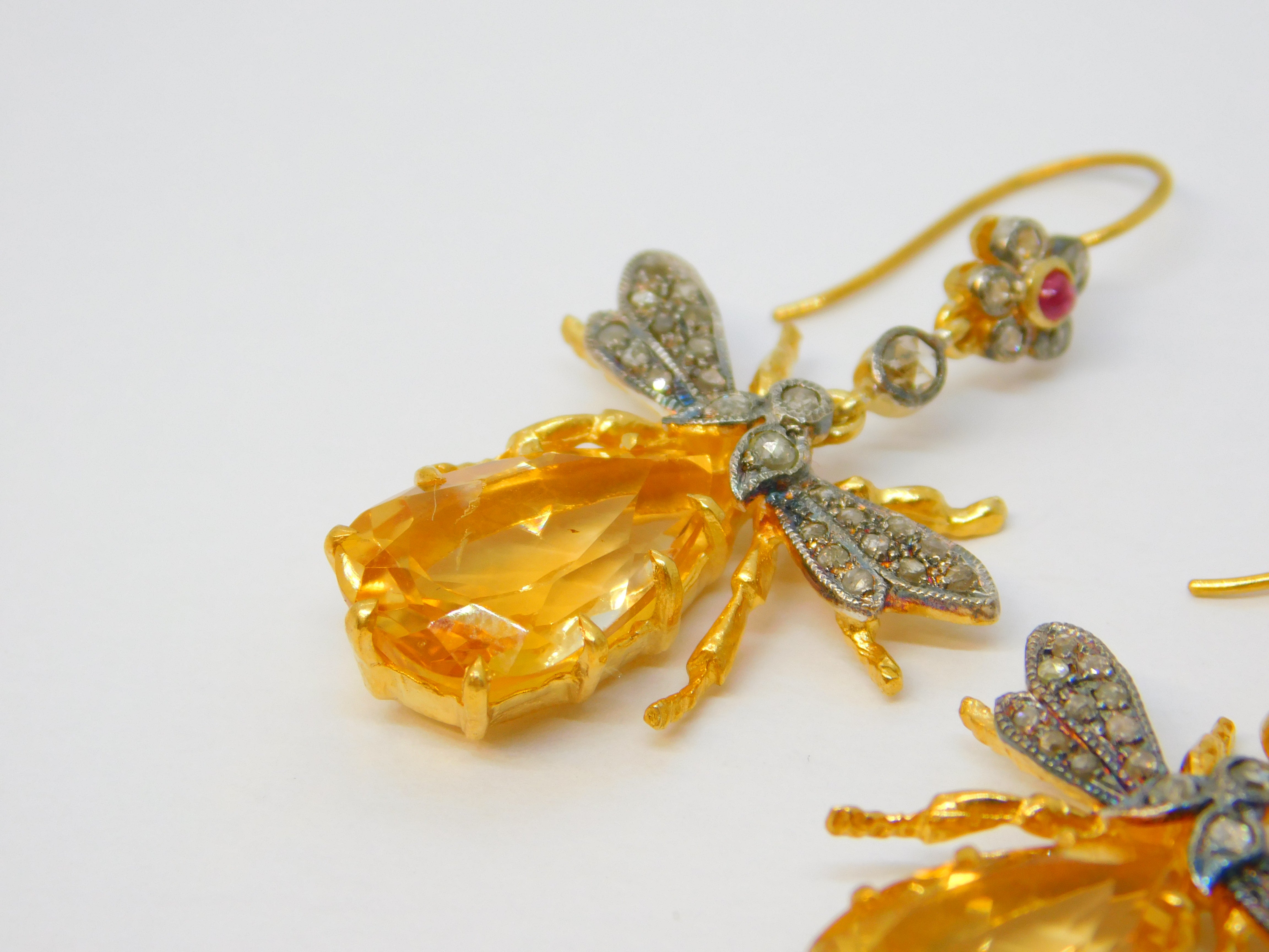 Details: A fantastic and wonderfully designed vintage pair of 9ct yellow gold and sterling silver gilt large insect or bug hook earrings set throughout with rubies & diamonds alongside a large oval cut central citrine set to the body marked 375 to the hooks and 925 to the body, all the stones have been tested. This is a wonderful item that would make a perfect gift or addition to any collection.