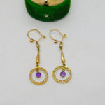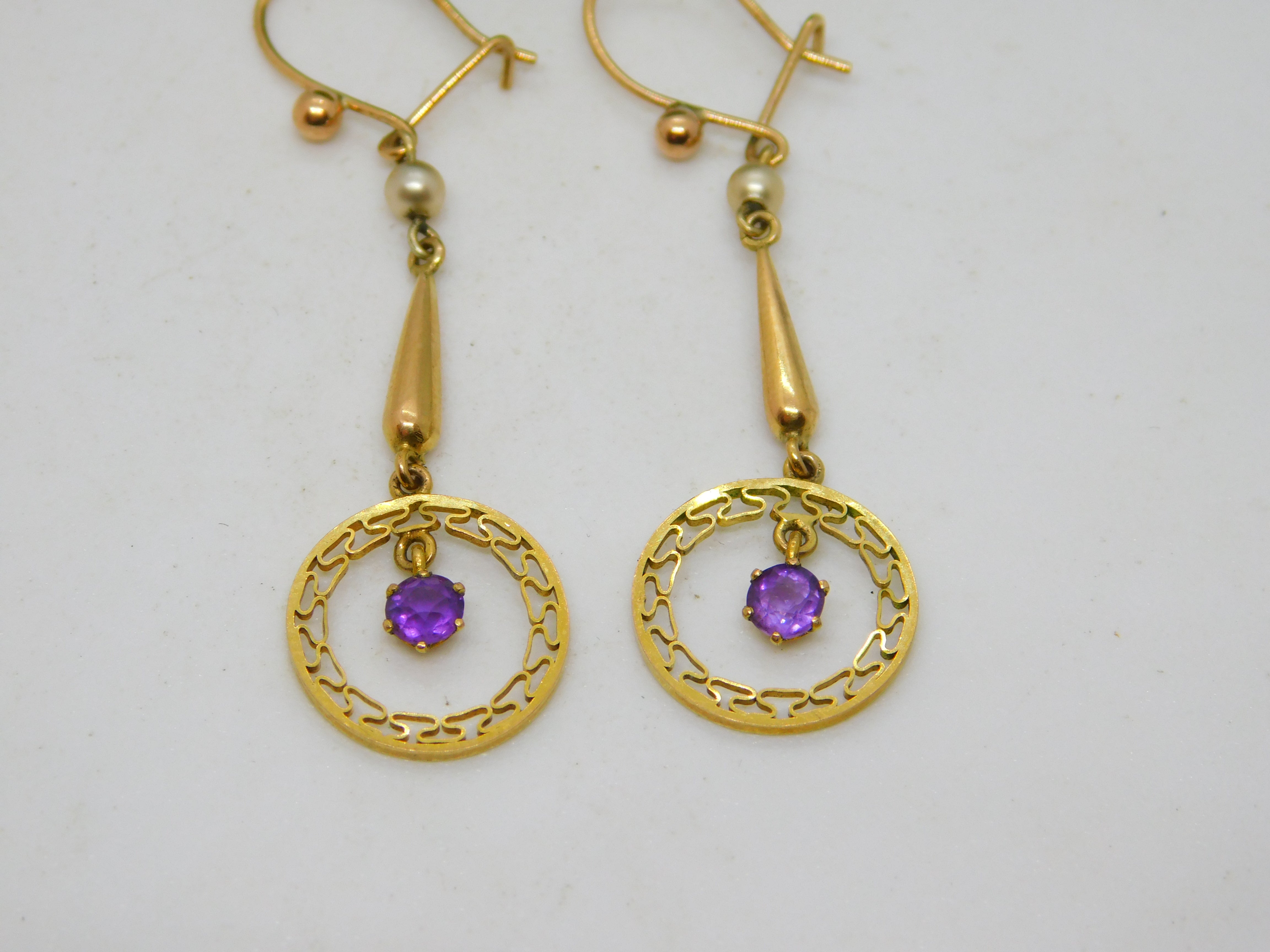 Edwardian 9ct Yellow Gold, Amethyst & Pearl Lavalier Drop Earrings Antique c1910