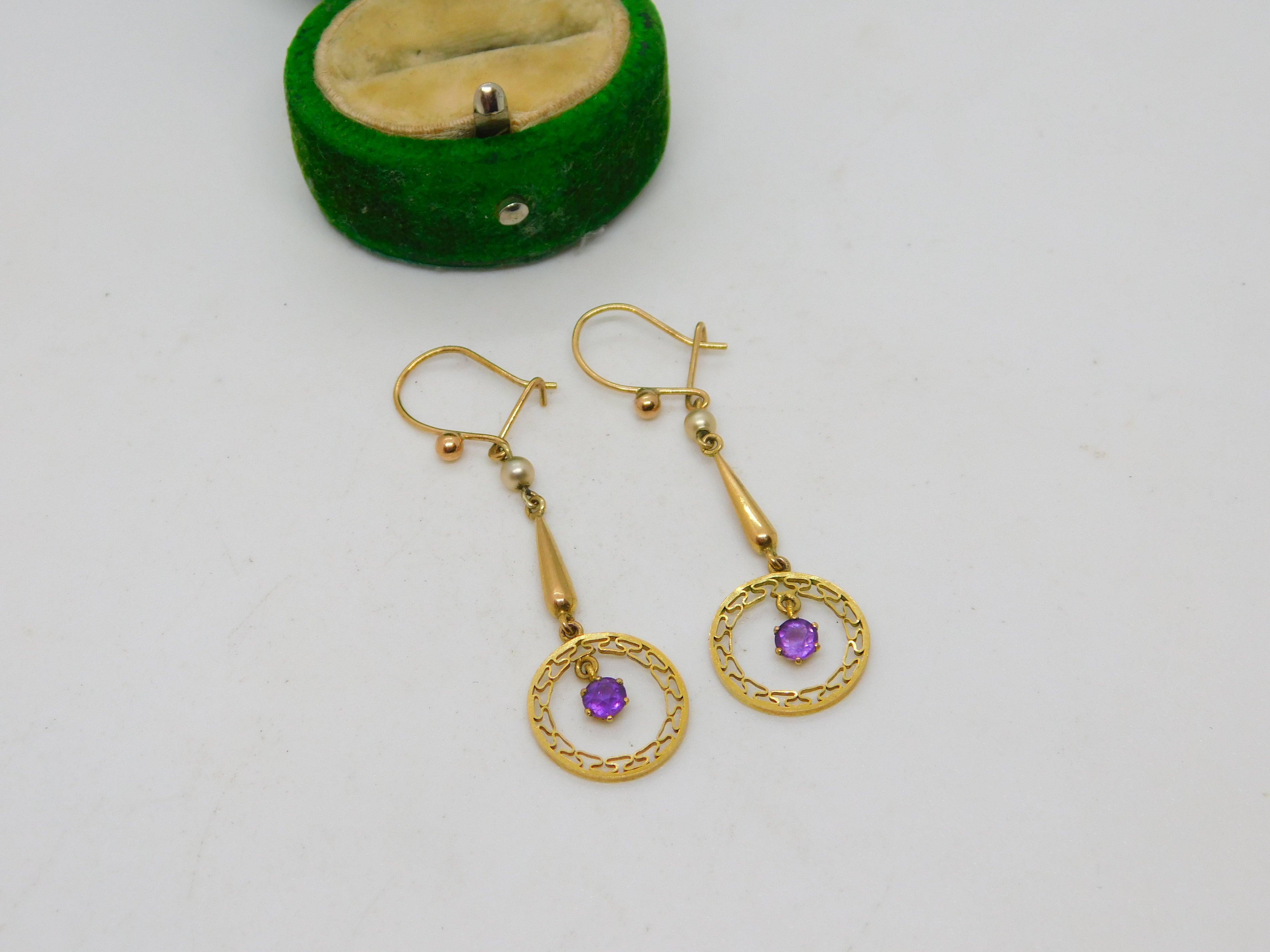 Details: A fantastic and wonderfully designed antique Edwardian pair of 9ct yellow gold lavalier drop earrings set with amethyst and pearls c1910. This is a wonderful item that would make a perfect gift or addition to any collection. The BOX pictured is for PRESENTATION ONLY and is NOT included in the listings but used to frame the pictures unless specifically stated otherwise.