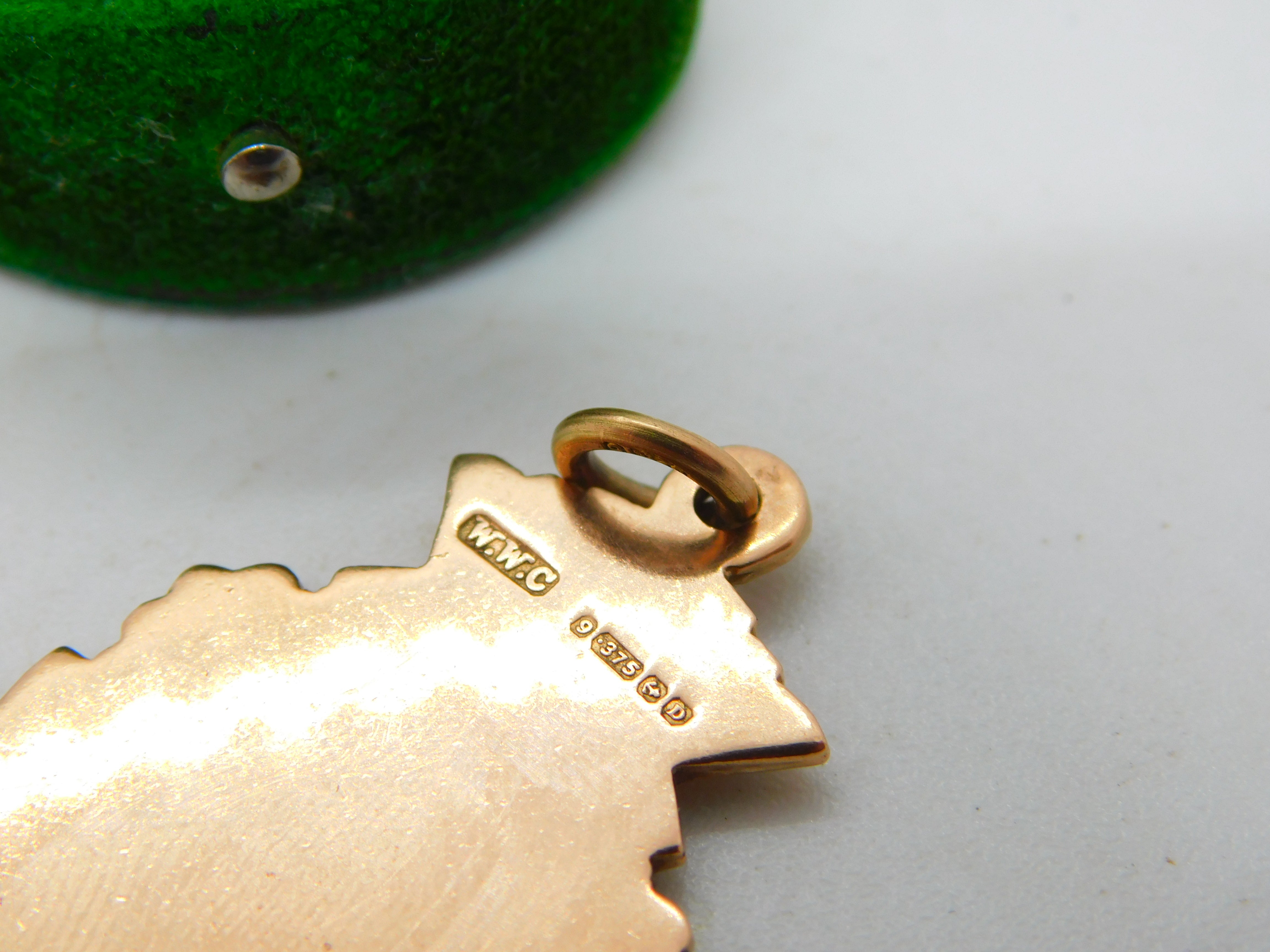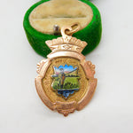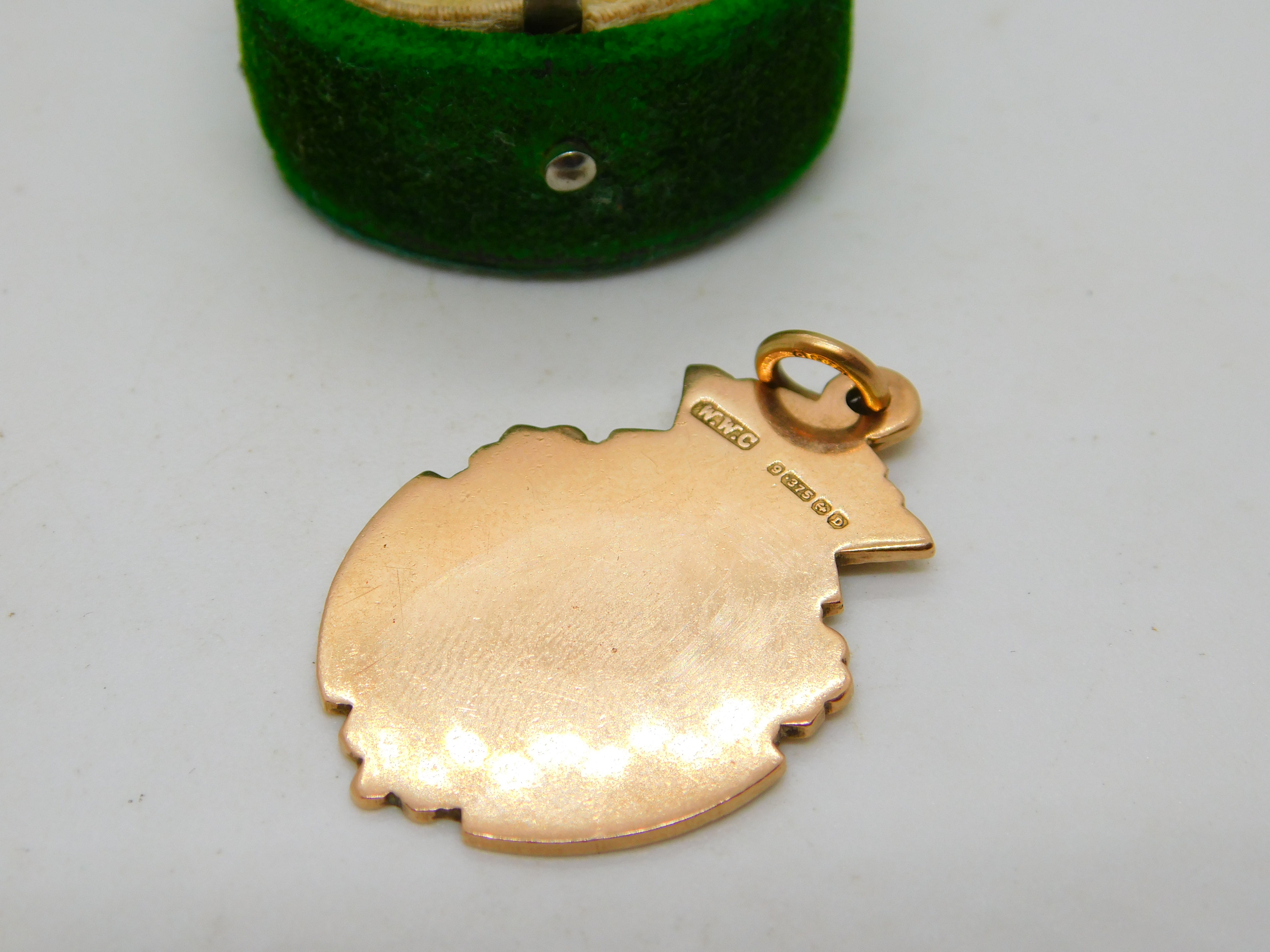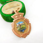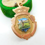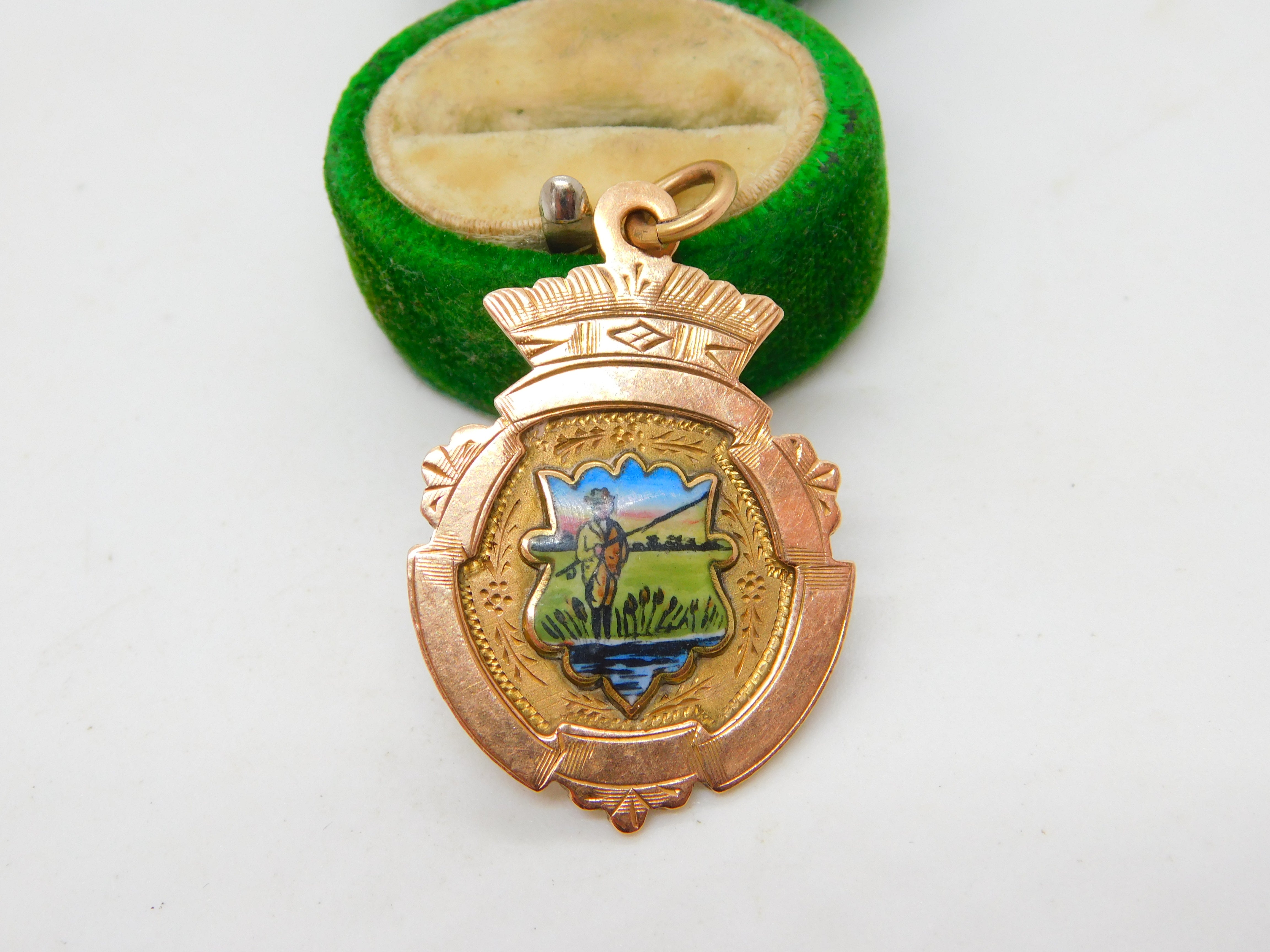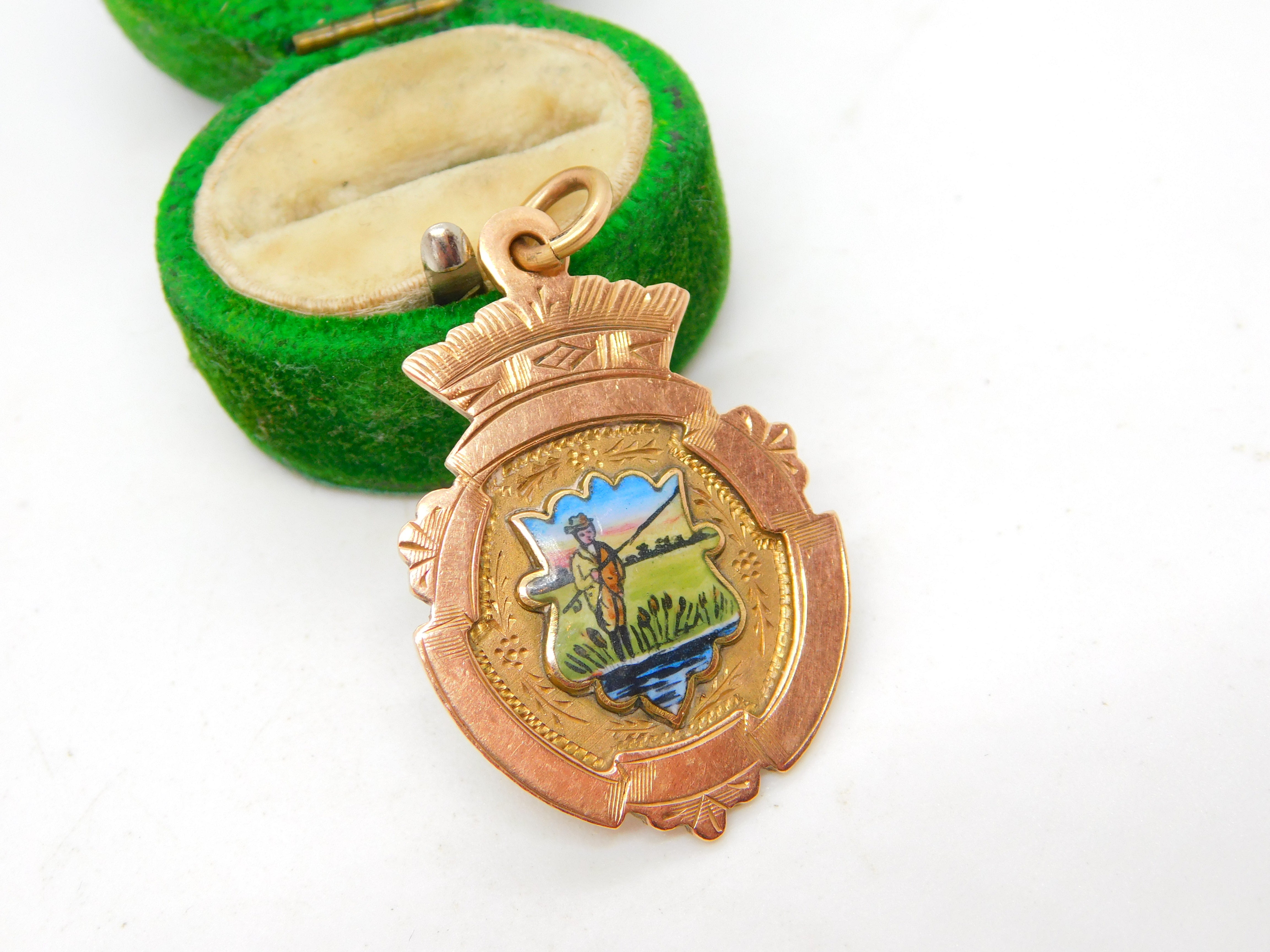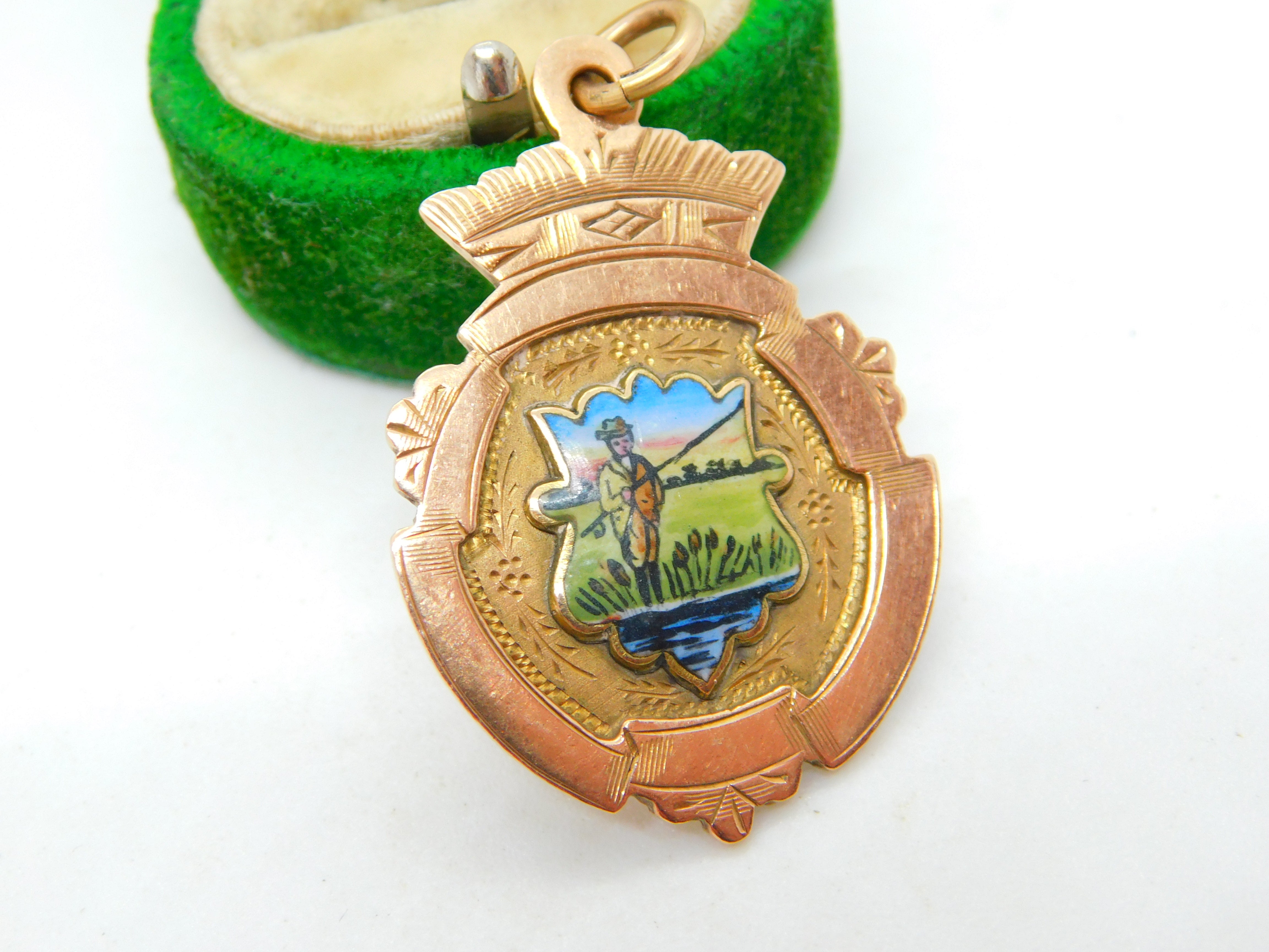 9ct Gold & Enamel Angling or Fishing Fob Medal Antique 1928 Birmingham Deco