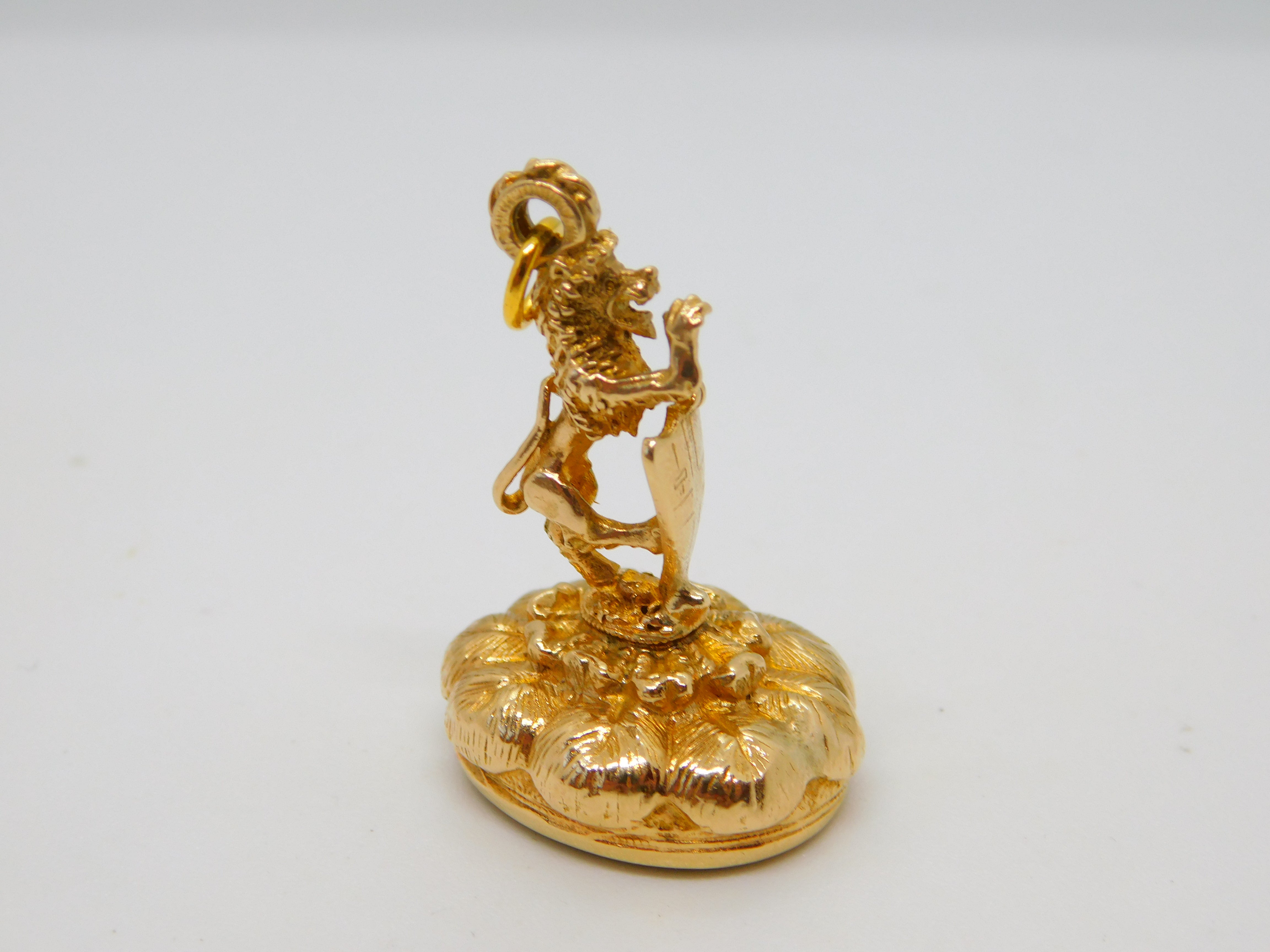 Details: A fantastic and wonderfully designed vintage large 9ct yellow gold regal lion with shield fob seal pendant set with carnelian to the base hallmarked London 1966 to the edge in Georgian style. This is a wonderful item that would make a perfect gift or addition to any collection. The BOX pictured is for PRESENTATION ONLY and is NOT included in the listings but used to frame the pictures unless specifically stated otherwise.