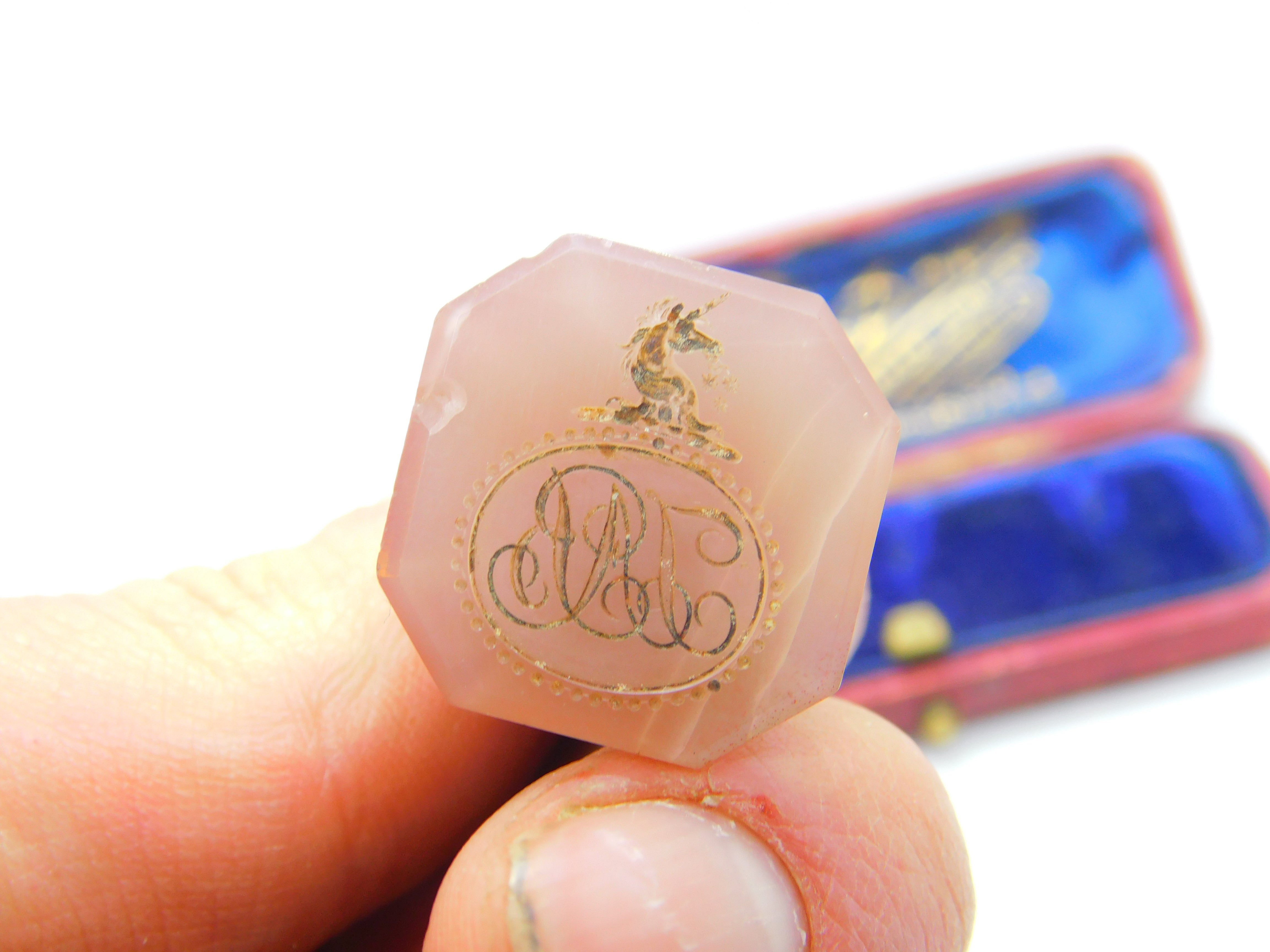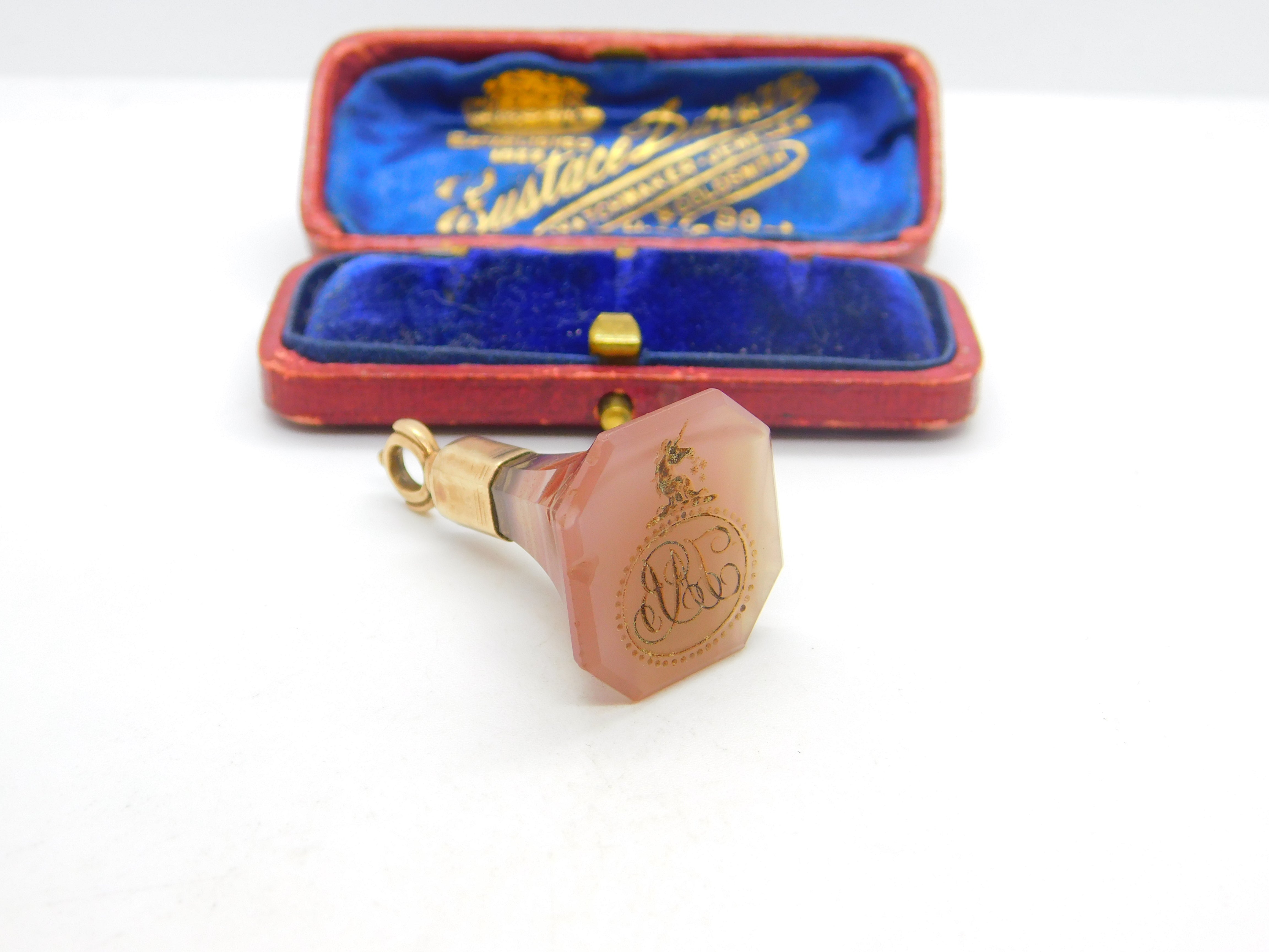 Details: A fantastic and wonderfully designed antique Georgian 9ct rose gold and carved trumpet carnelian fob seal with charming intaglio crest to the base in the form of a monogram initial and a unicorn c1820. The gold has been XRF tested - minor chip to the base but very much usable. This is a wonderful item that would make a perfect gift or addition to any collection. The BOX pictured is for PRESENTATION ONLY and is NOT included in the listings but used to frame the pictures unless specifically stated otherwise.