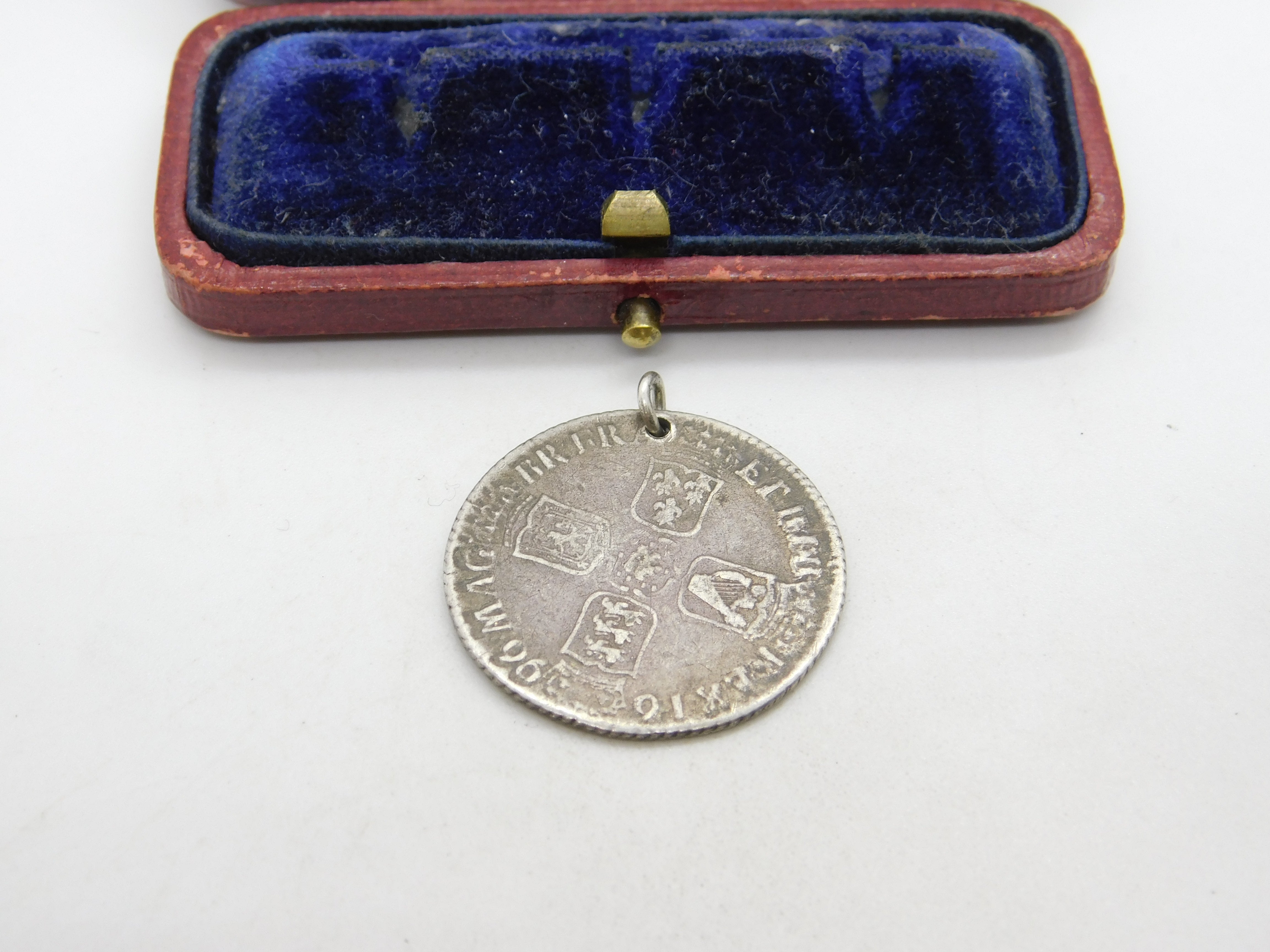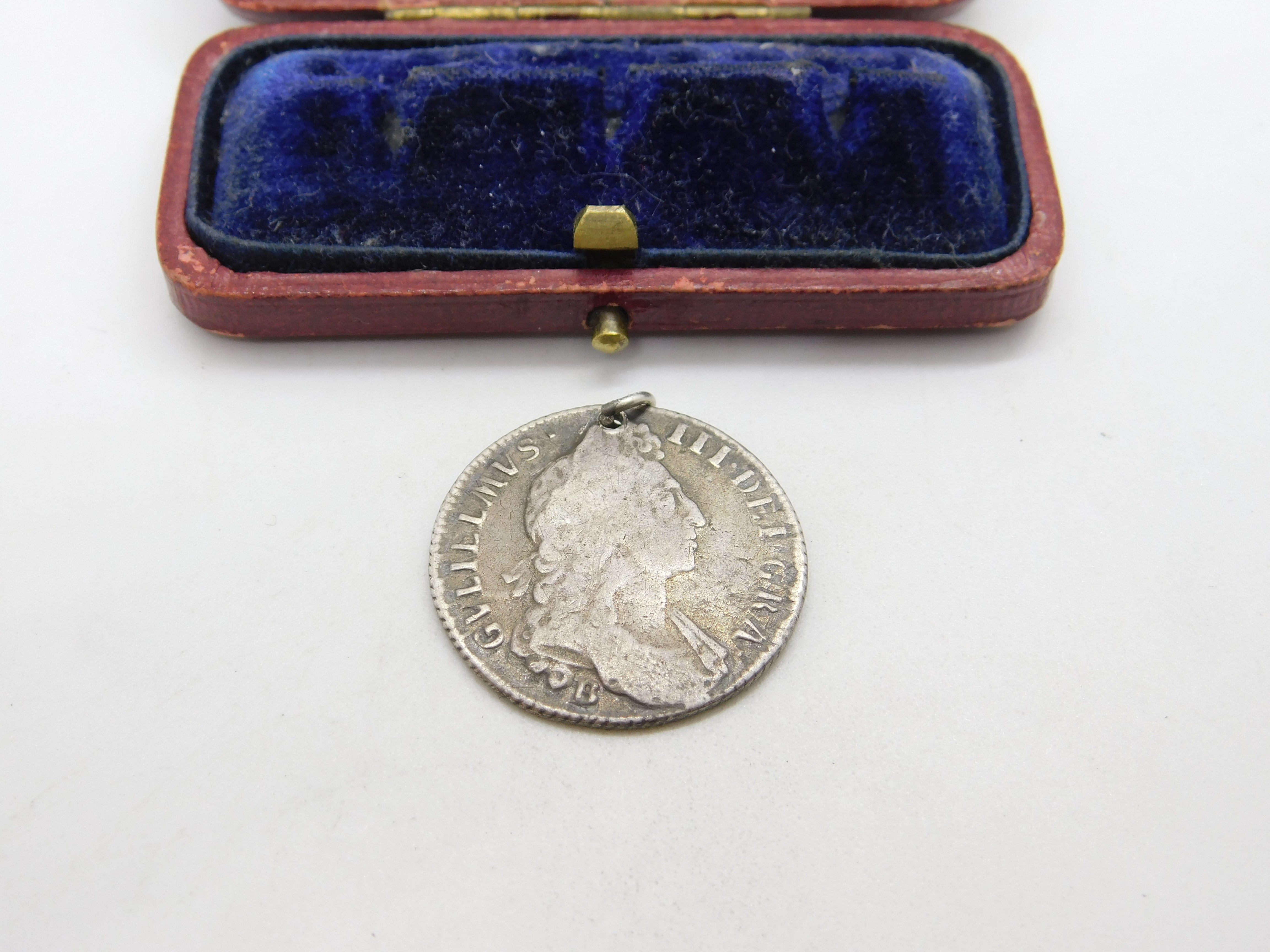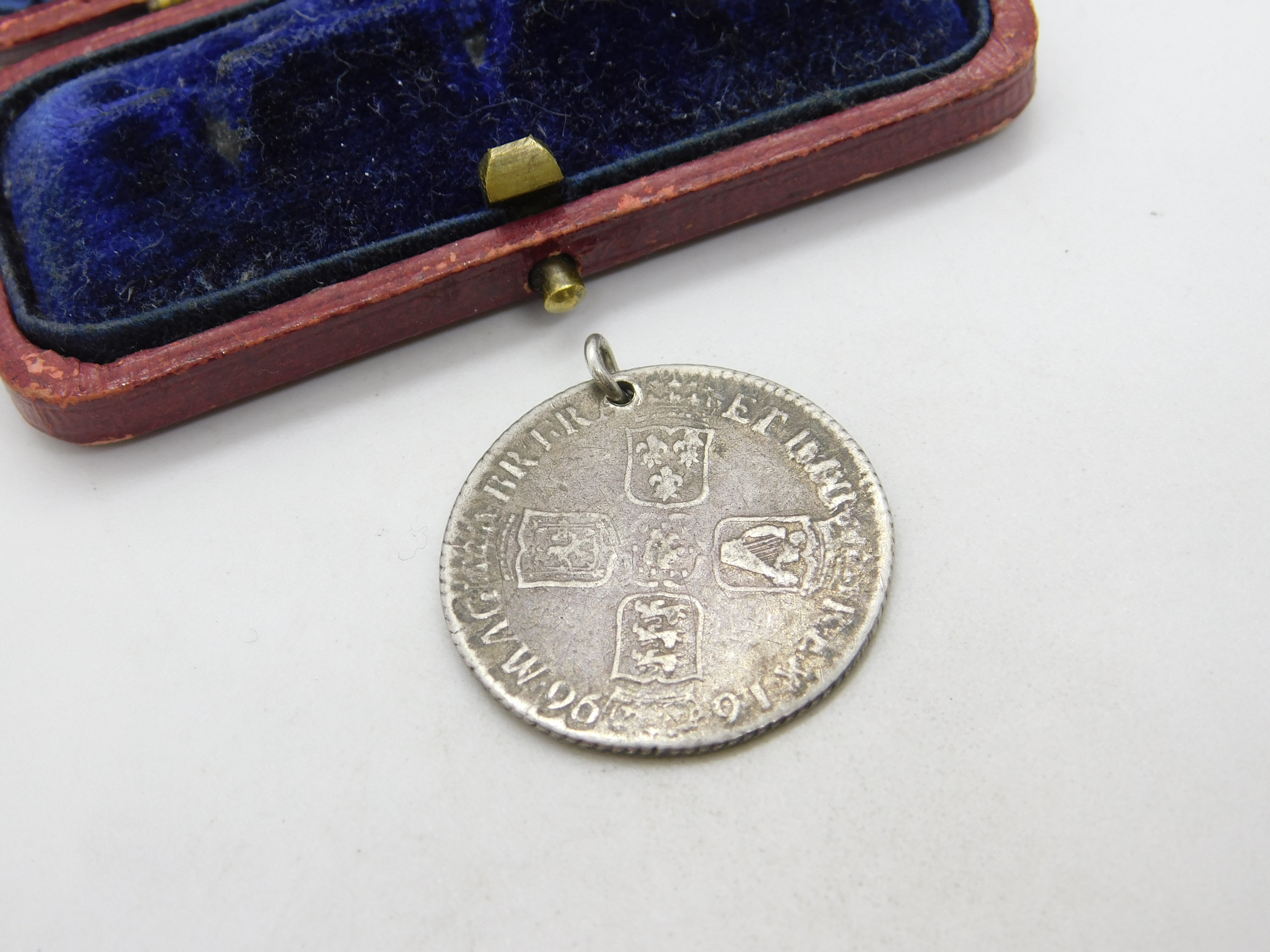 King William III Bristol Mint Silver Shilling Coin Fob Pendant Antique 1696