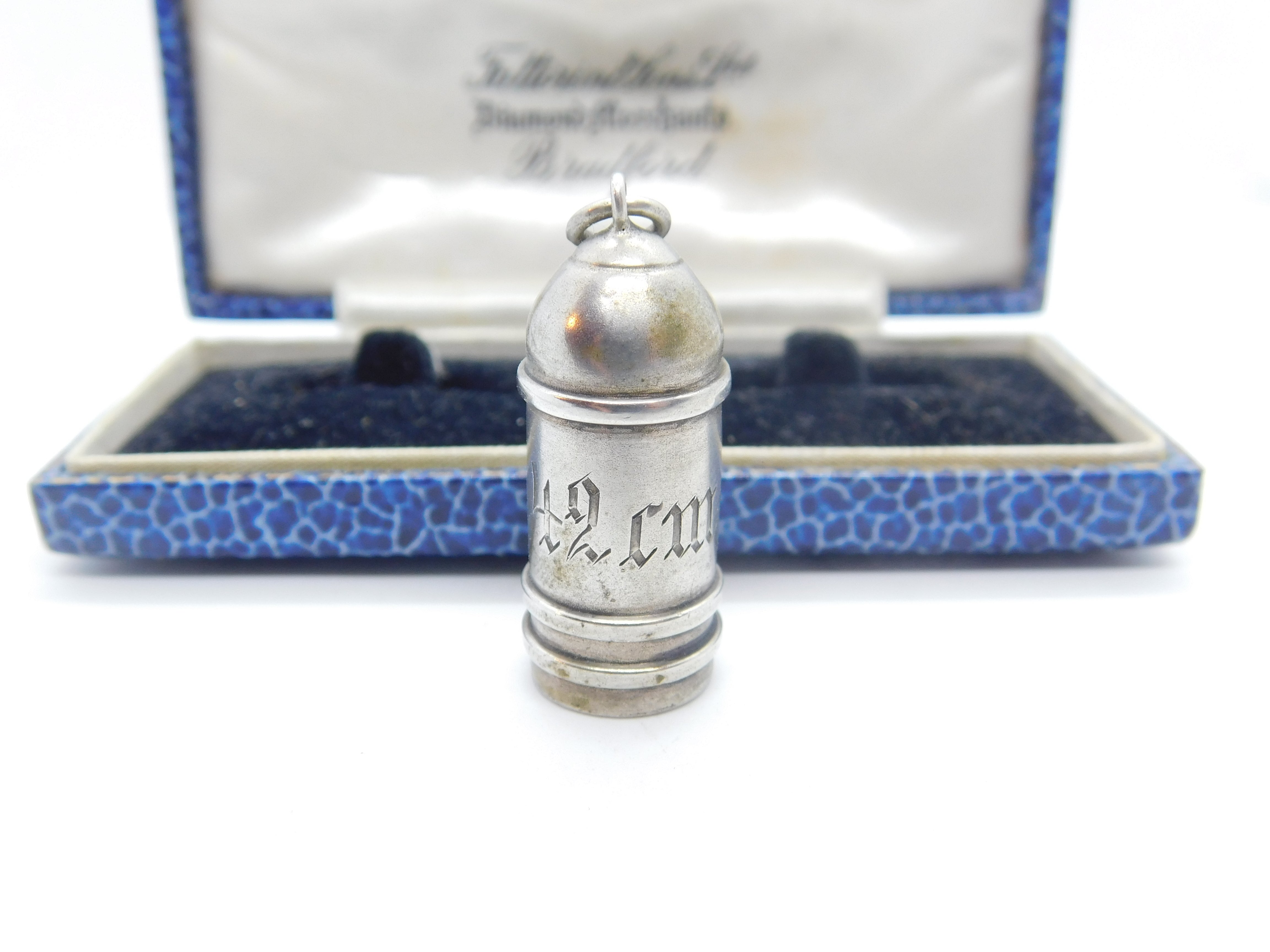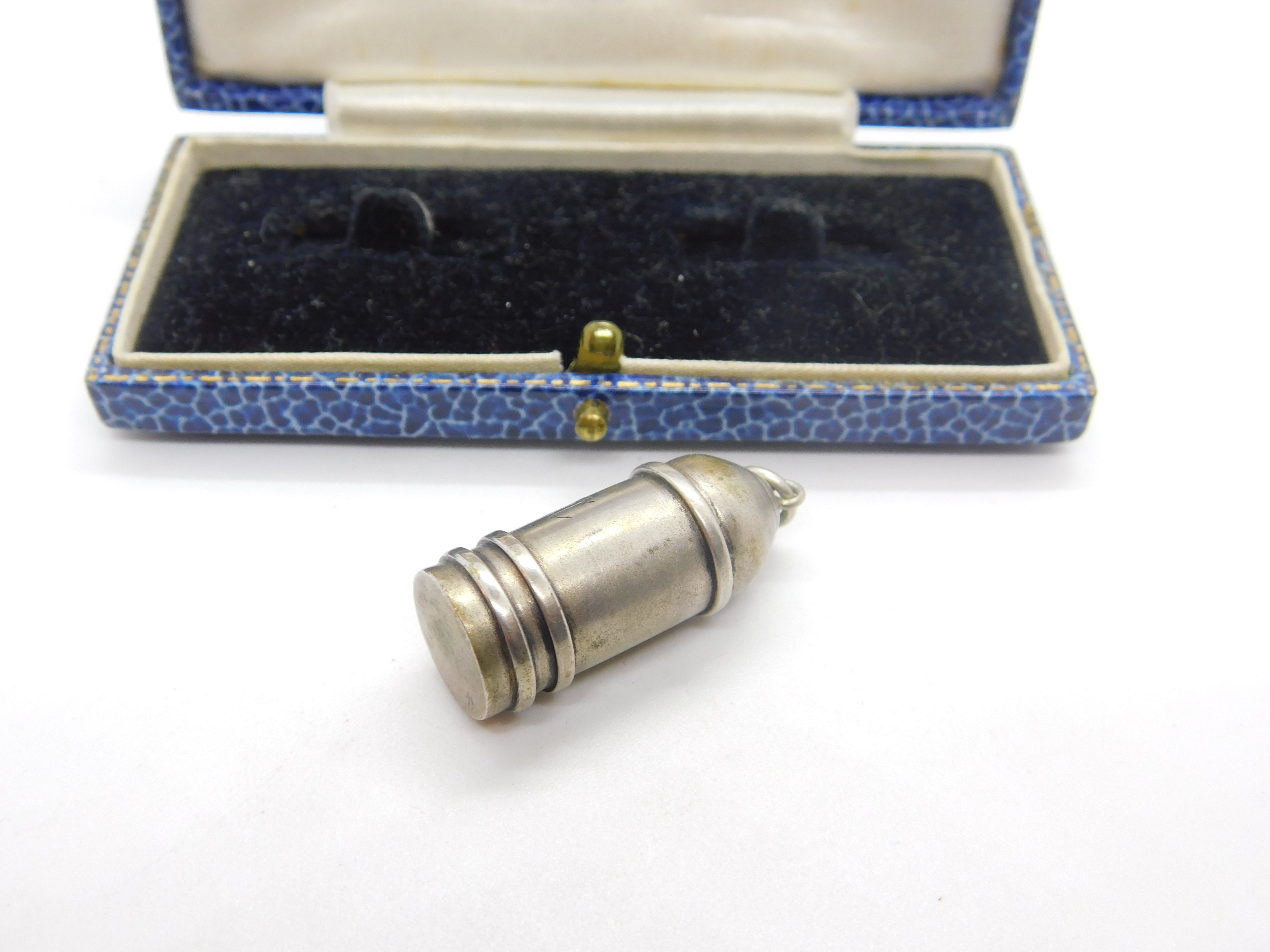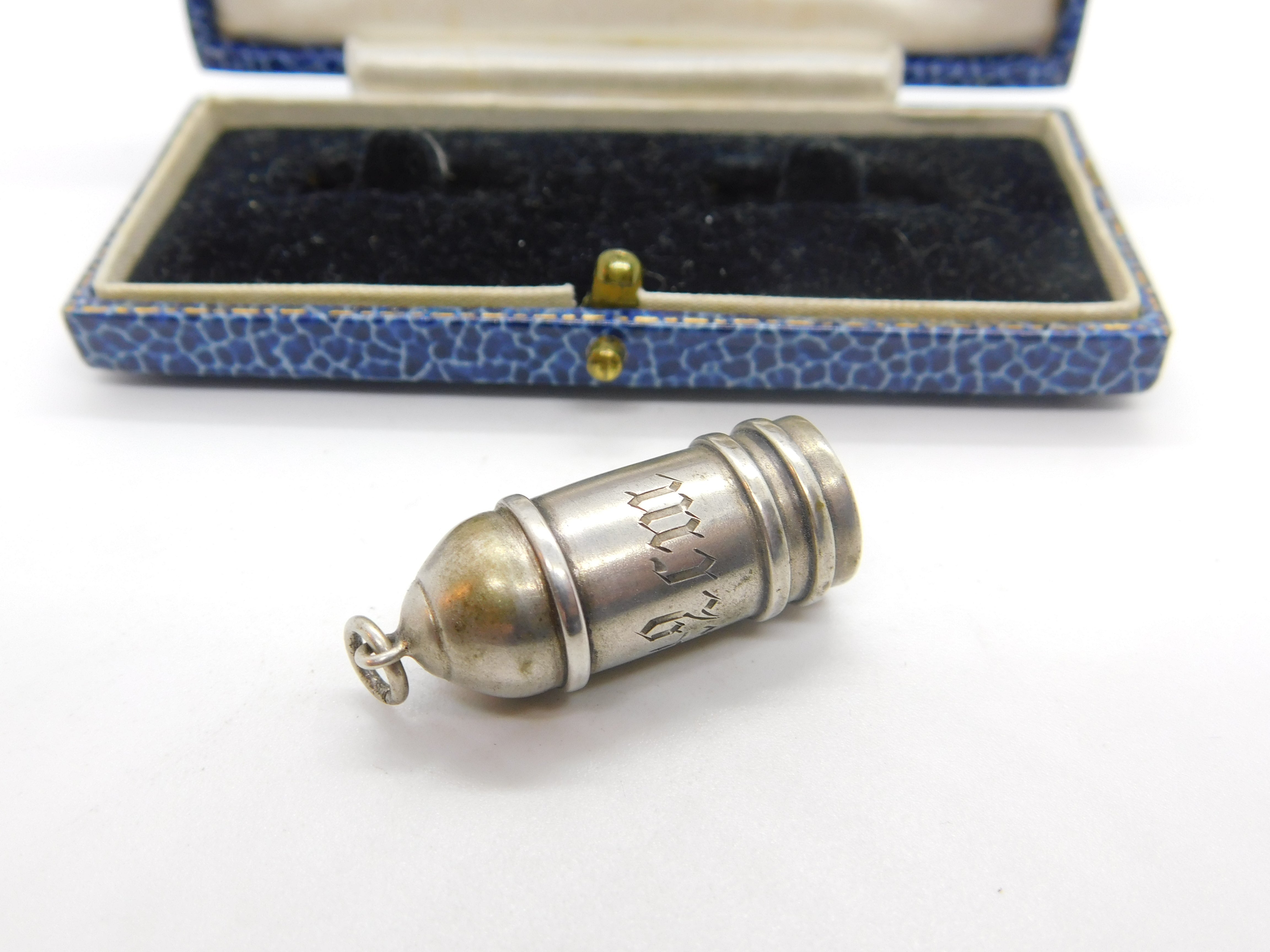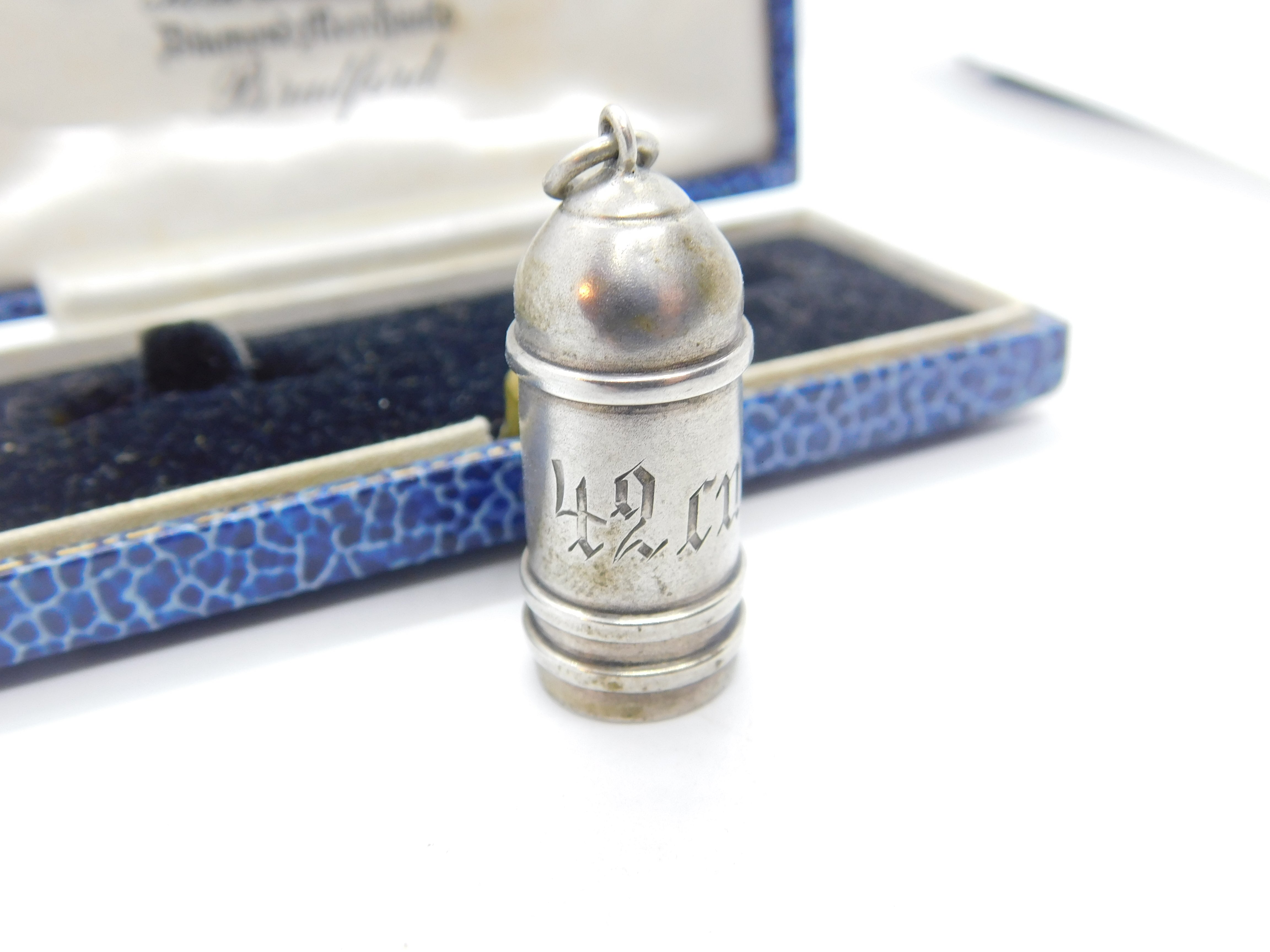Details: A fantastic and wonderfully designed antique WW1-era sterling silver imperial German pendant crafted in the shape of a 42cm Gamma Howitzer shell with 42cm to the front possibly a pendant worn by those who operated these batteries c1915. Very unusual example! This is a wonderful item that would make a perfect gift or addition to any collection. The BOX pictured is for PRESENTATION ONLY and is NOT included in the listings but used to frame the pictures unless specifically stated otherwise.