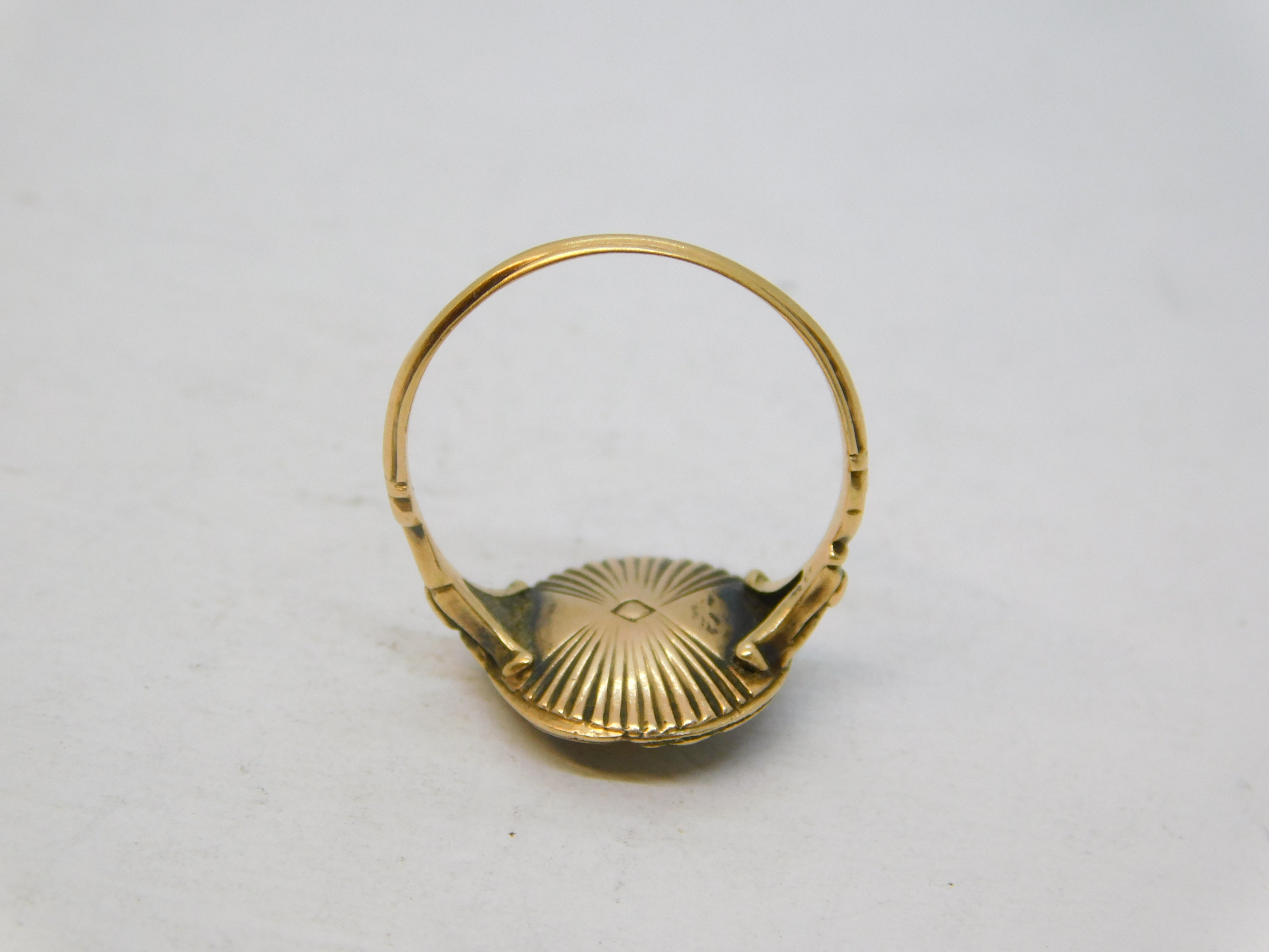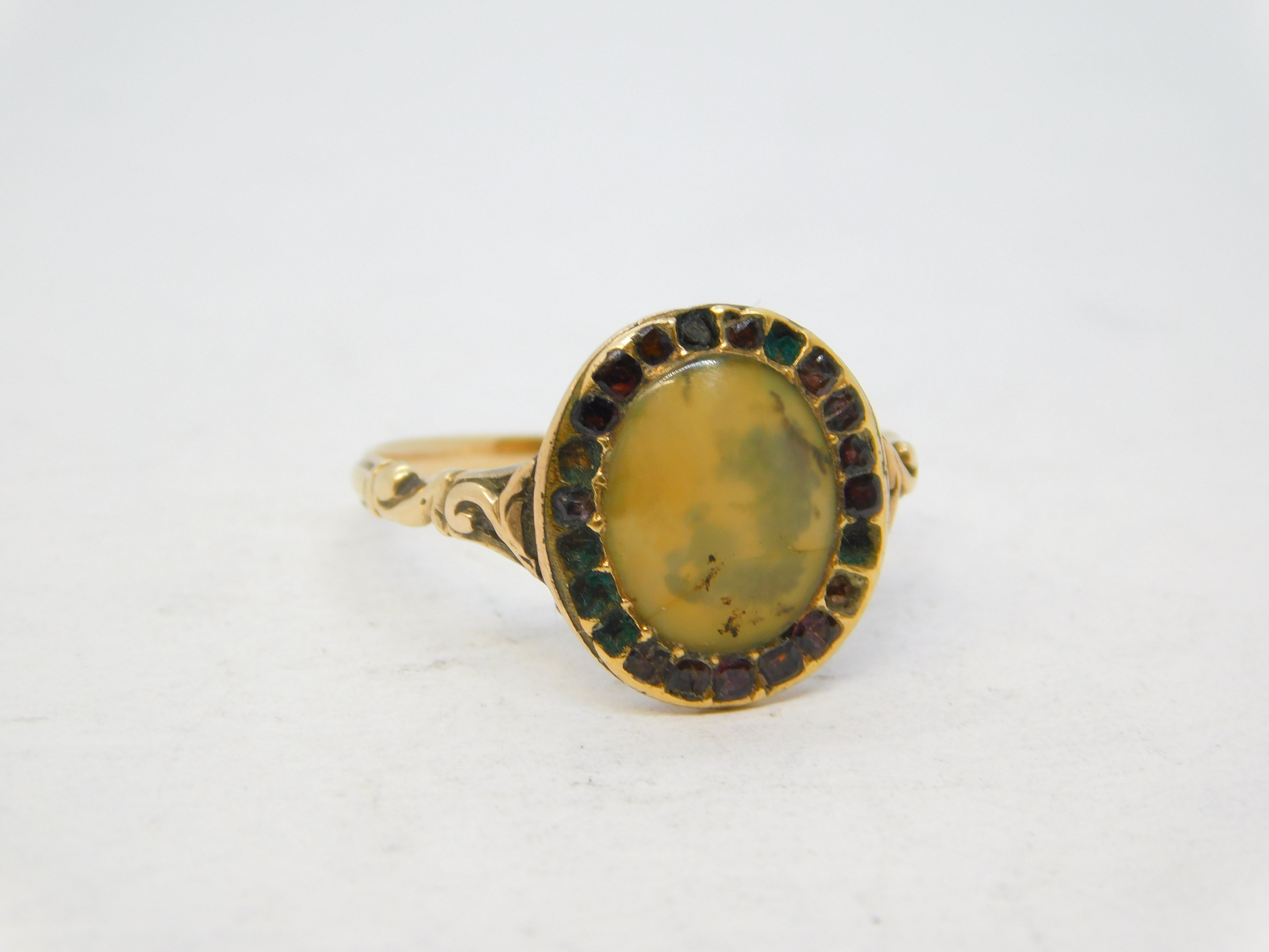 George III 15ct Yellow Gold, Moss Agate, Garnet Dress Ring Antique c1780