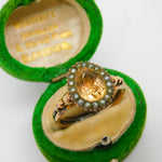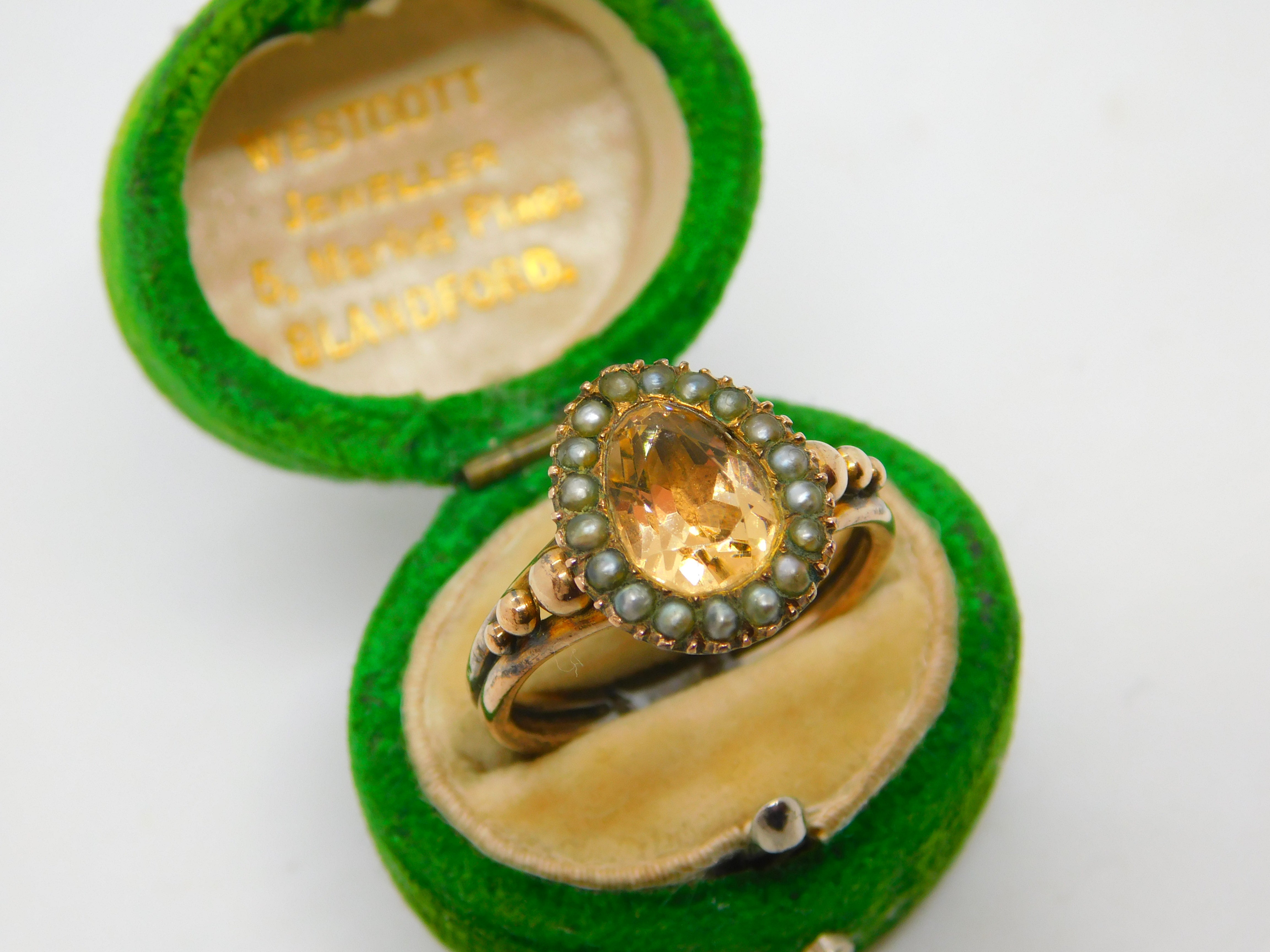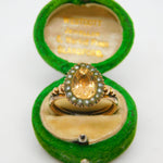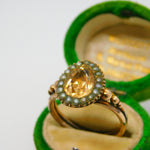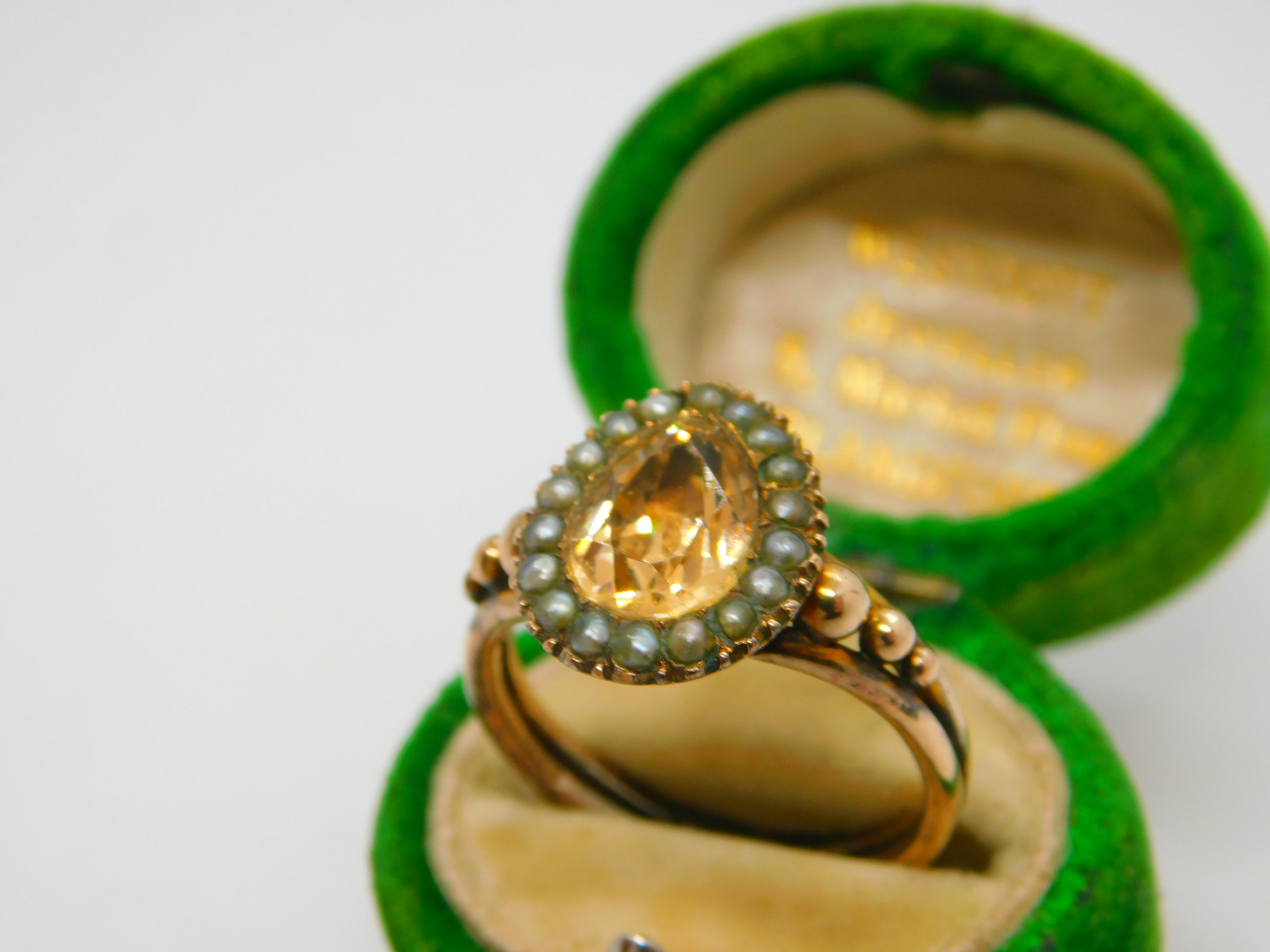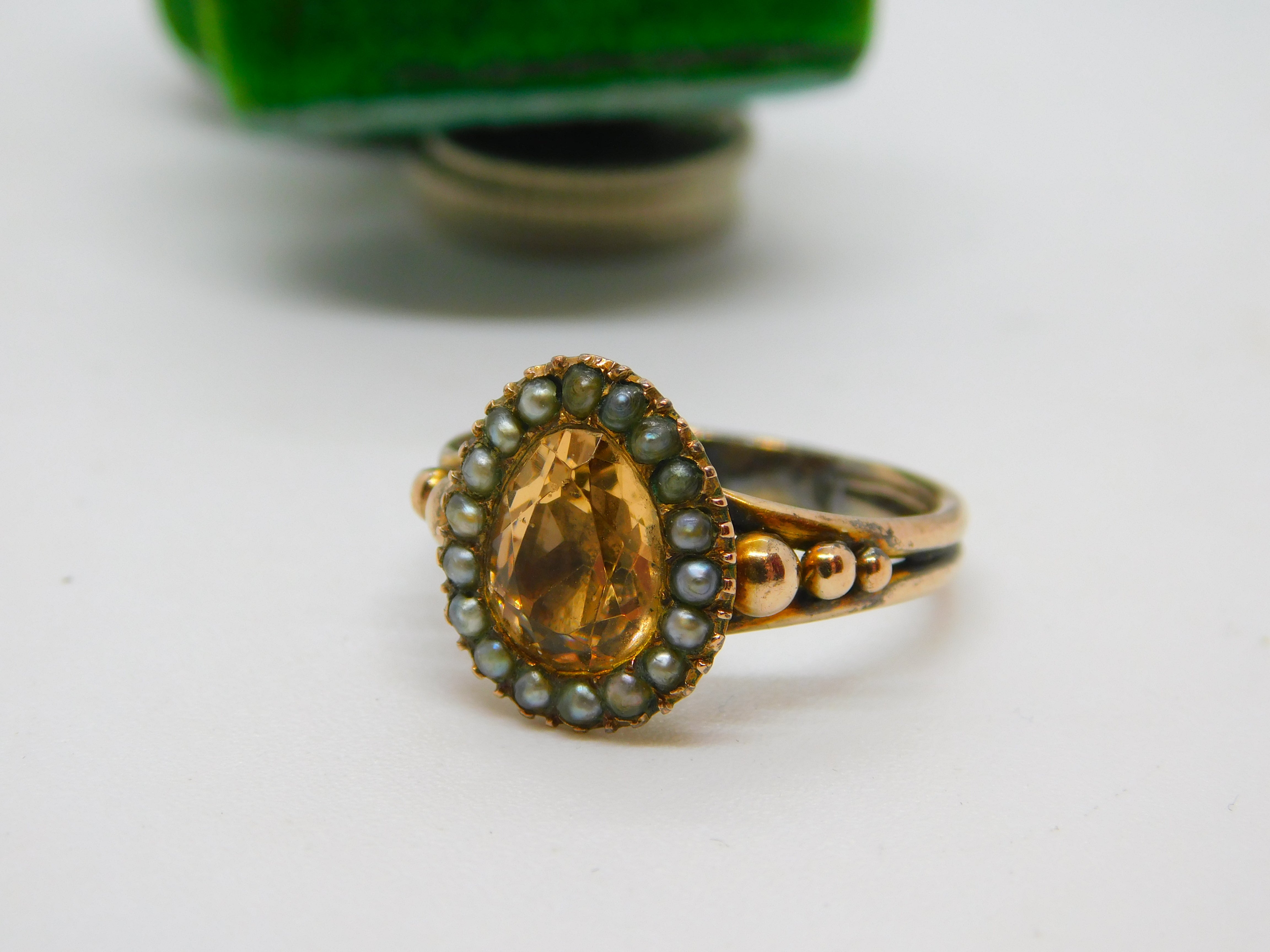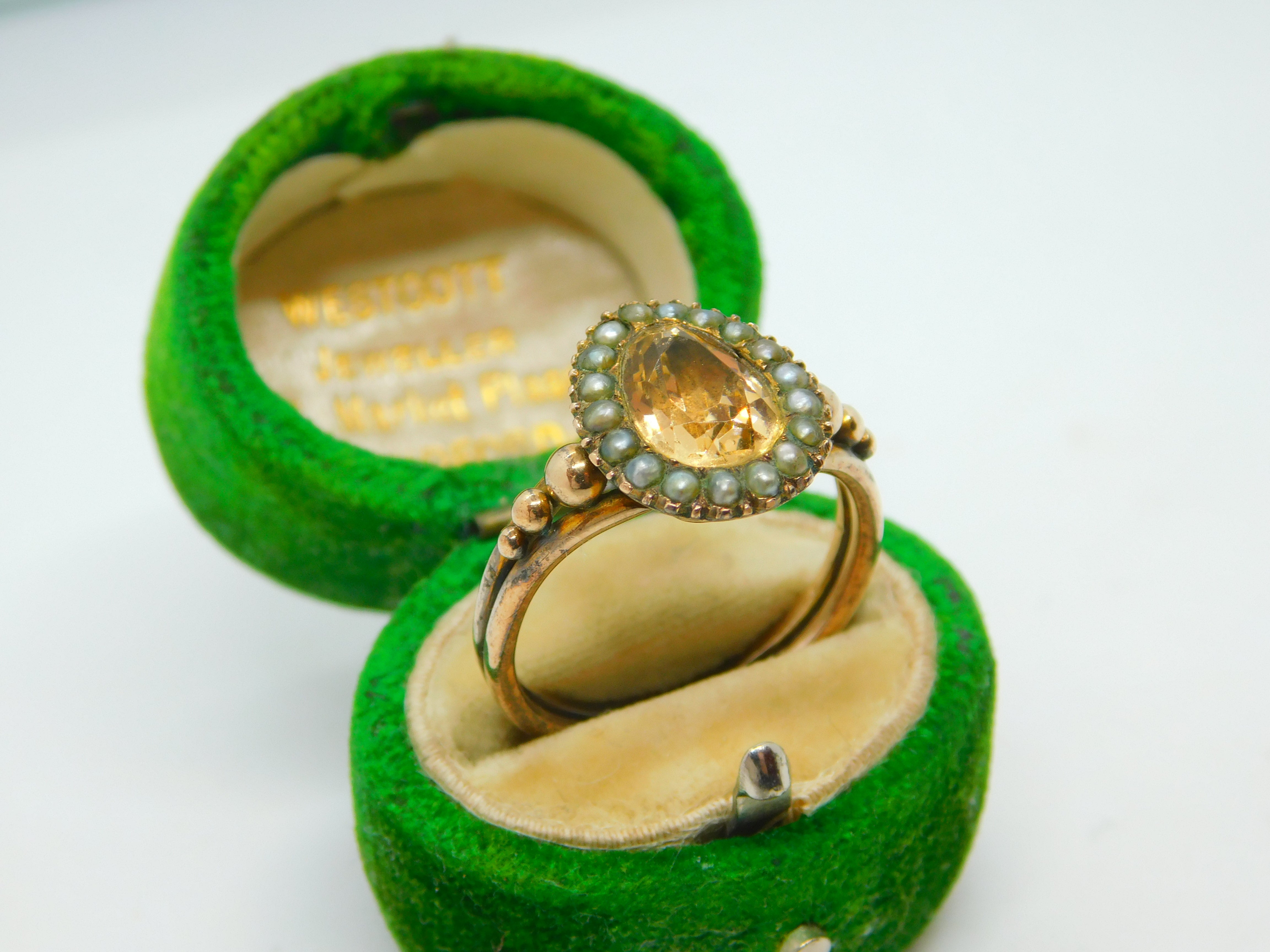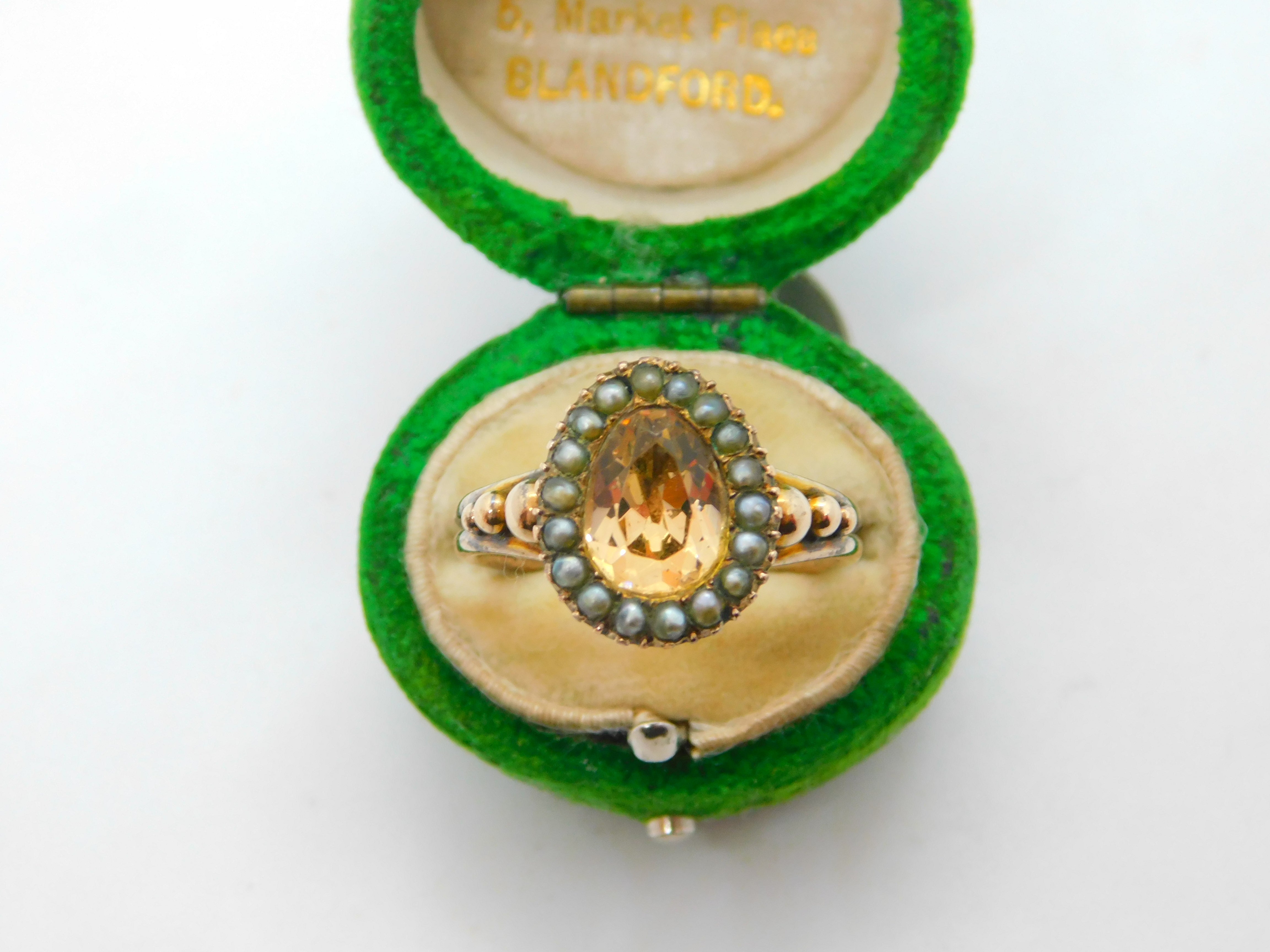 Details: A fantastic and wonderfully designed antique Georgian 9ct gold pear shaped dress ring with charming ball & scroll pattern shoulders set with central yellow foil back paste flanked by seed pearls c1790. The gold has been XRF tested as it is unmarked. A charming ring with lovely age. This is a wonderful item that would make a perfect gift or addition to any collection. The BOX pictured is for PRESENTATION ONLY and is NOT included in the listings but used to frame the pictures unless specifically stated otherwise.