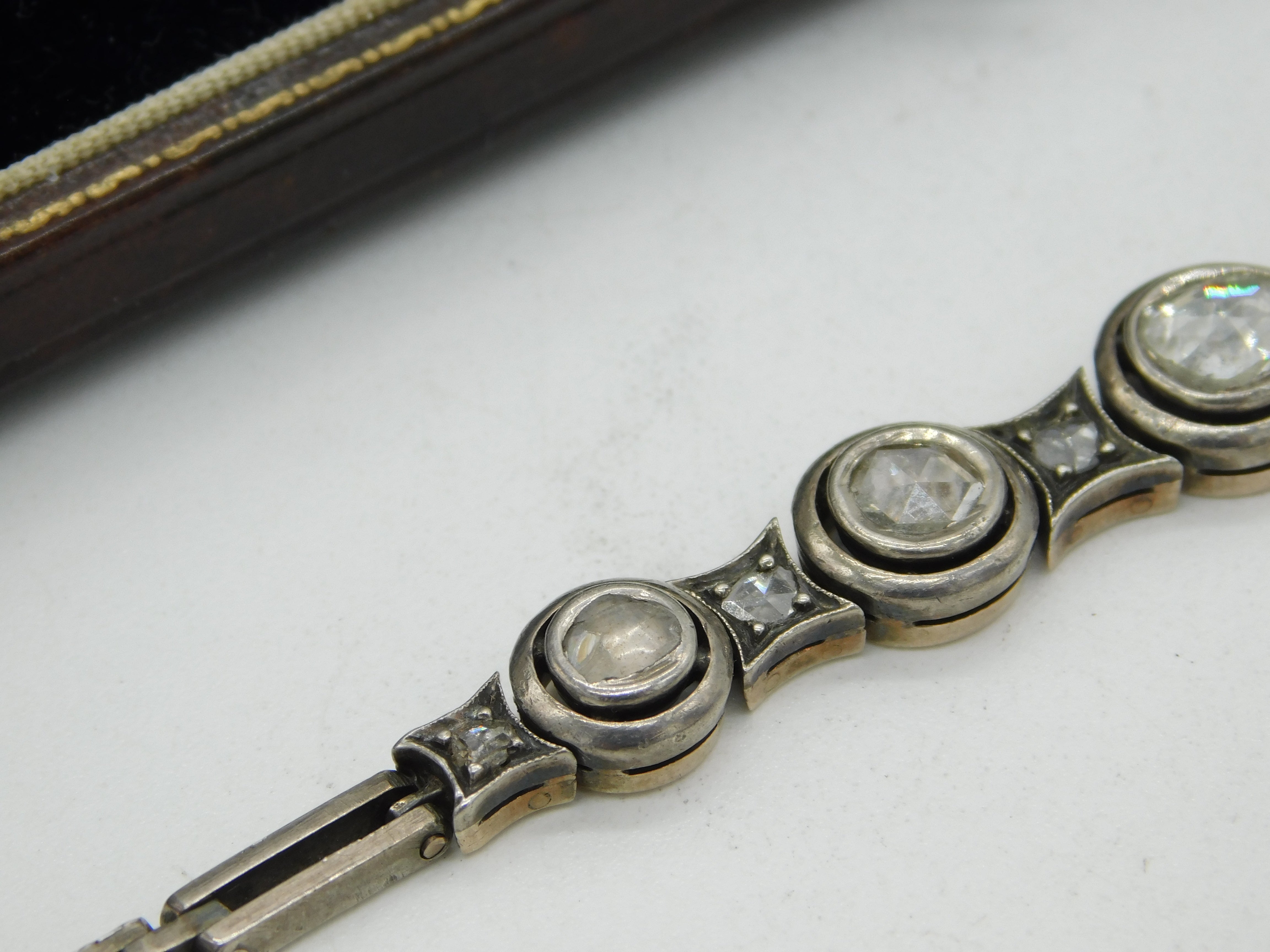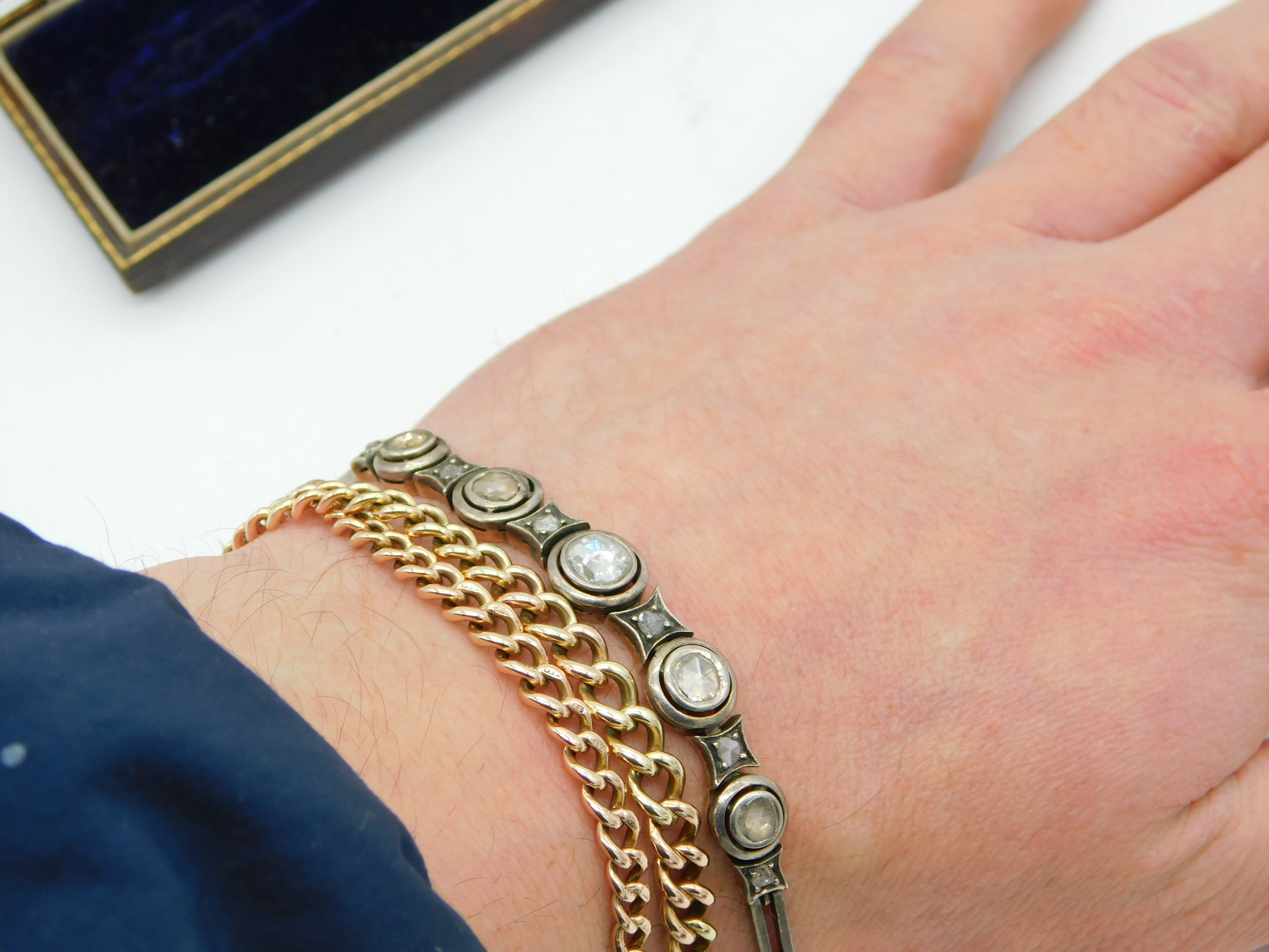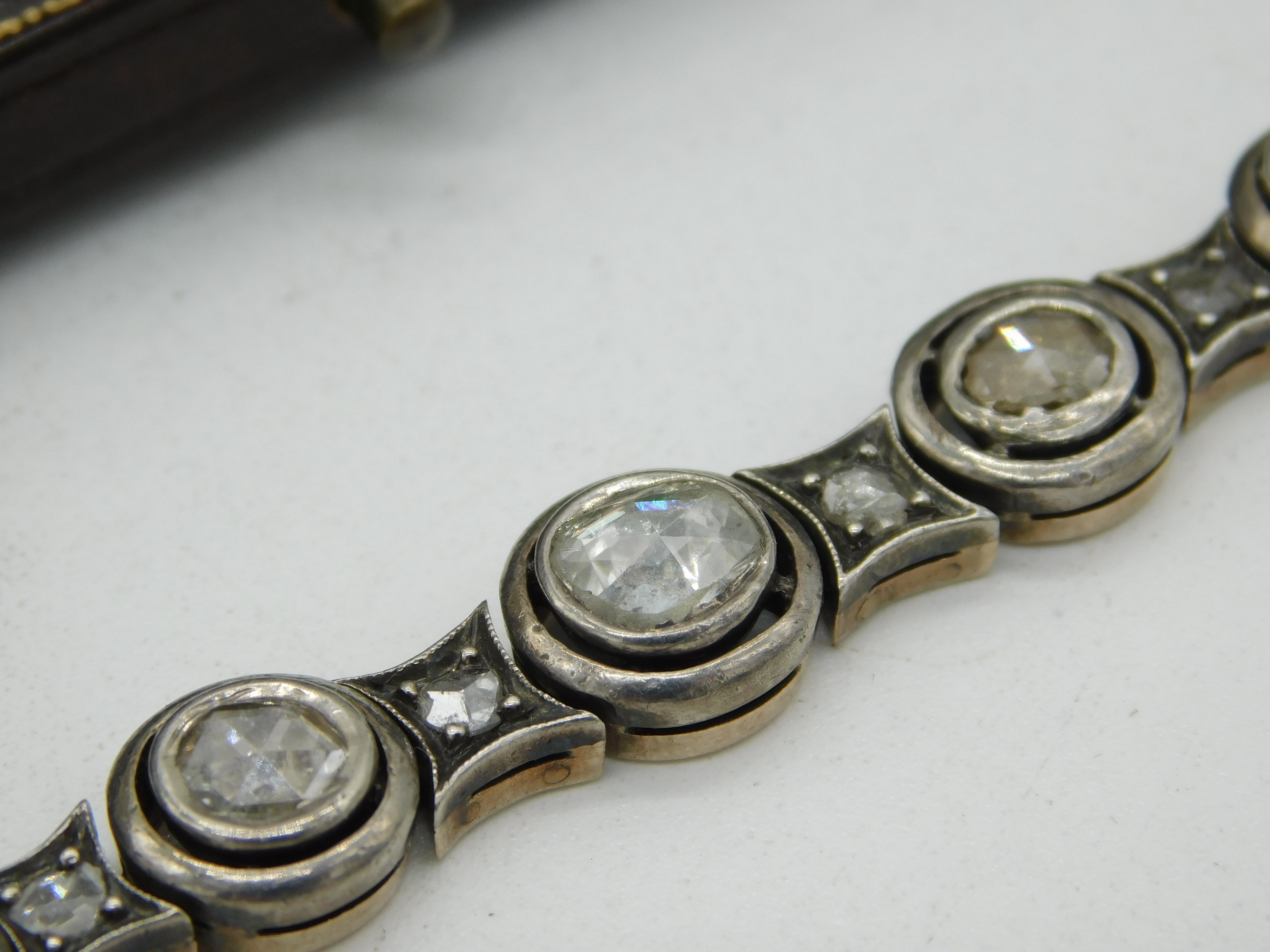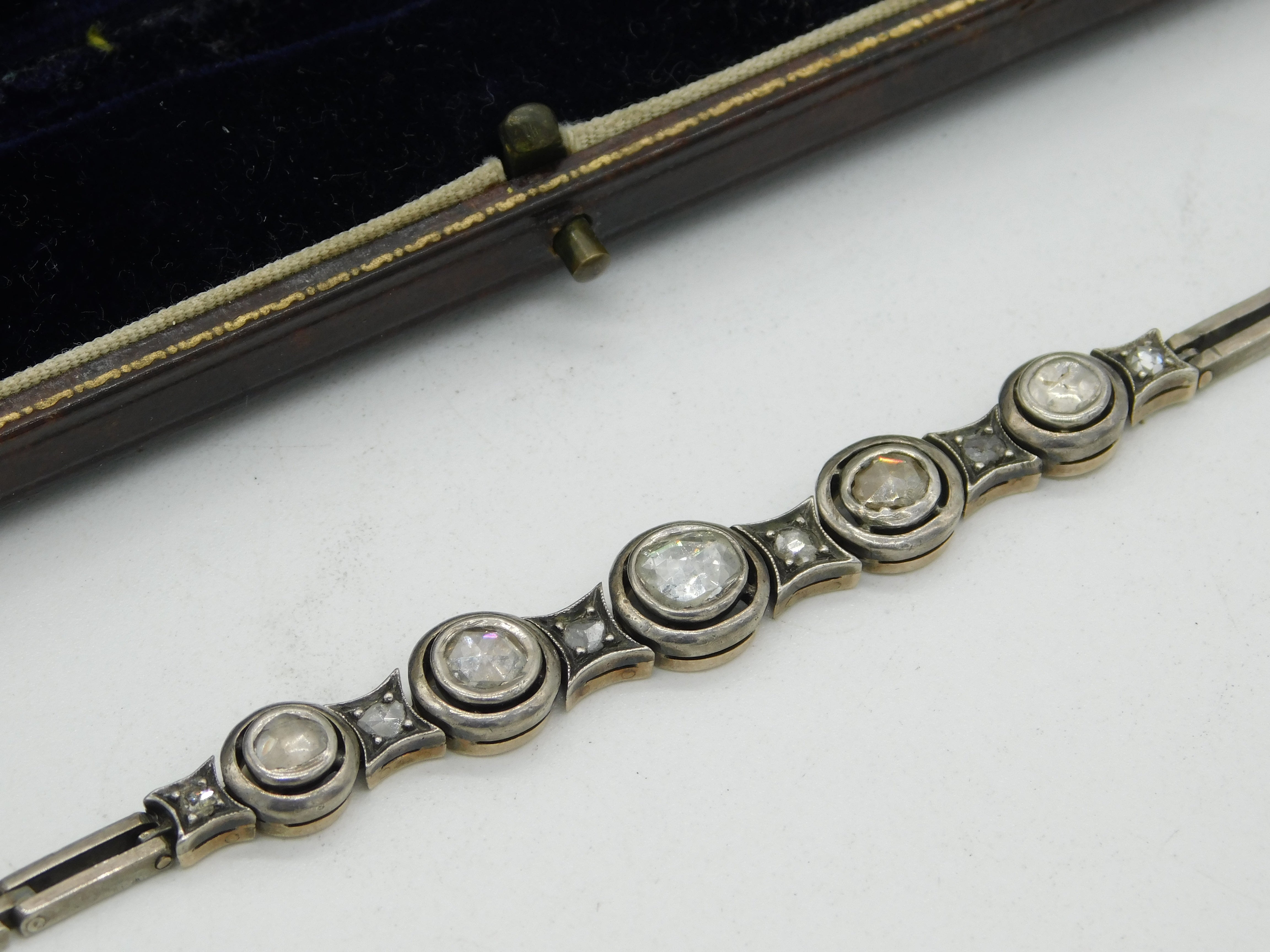 Details: A fantastic and wonderfully designed antique georgian boxed 9ct yellow gold & sterling silver graduating old-cut diamond bracelet with stunning detail c1790. The bracelet features five large diamonds set with six further diamonds in star style settings, the diamonds are mounted in the gold and the panels to the sides are silver. The central diamond is approximately 1ct in weight flanked by old-cut diamonds approximately 0.5ct. The total diamond weight of the bracelet is approximately 3ct, the gold has been XRF tested and the diamonds have all been tested. This is a wonderful item that would make a perfect gift or addition to any collection.