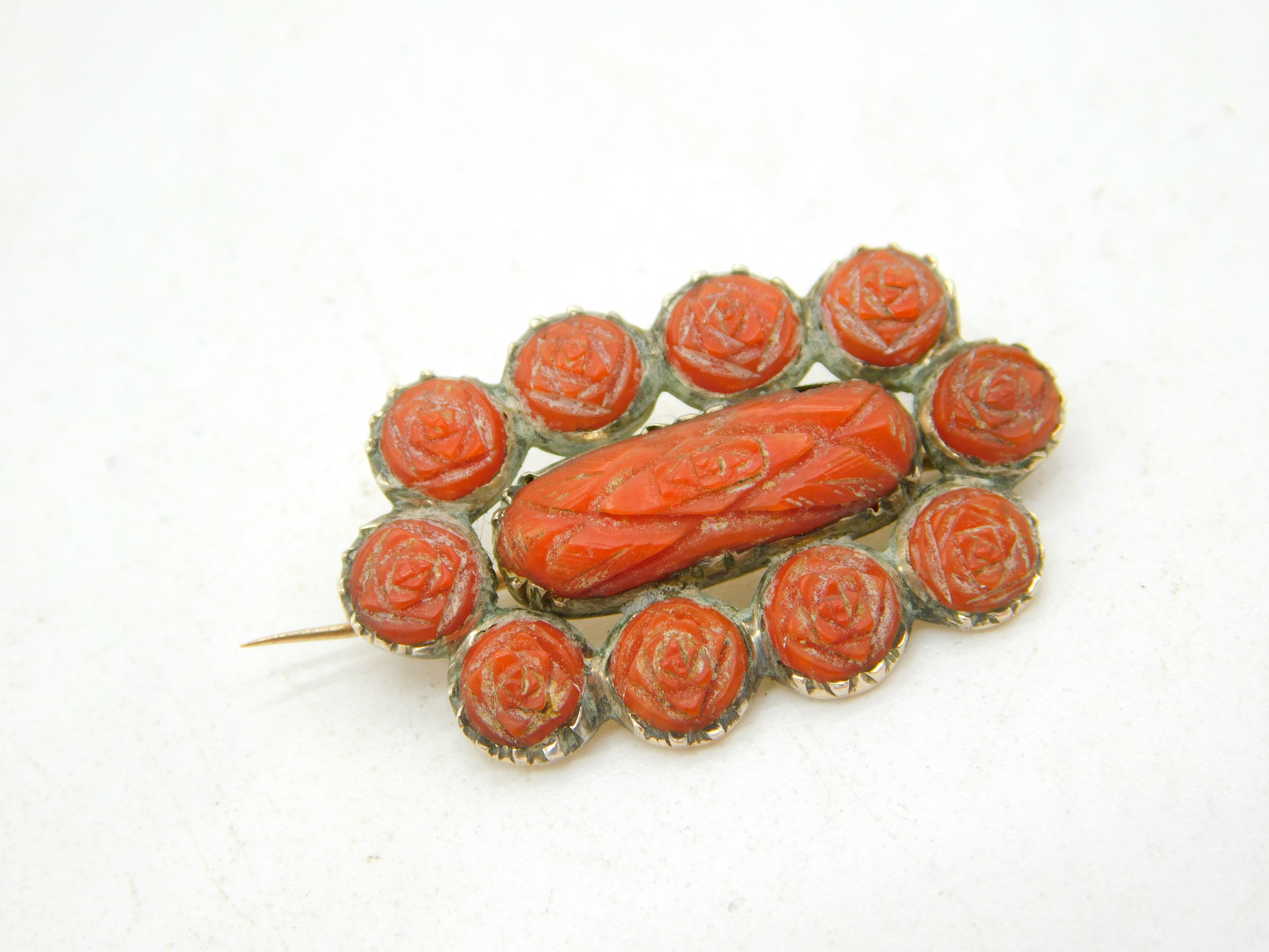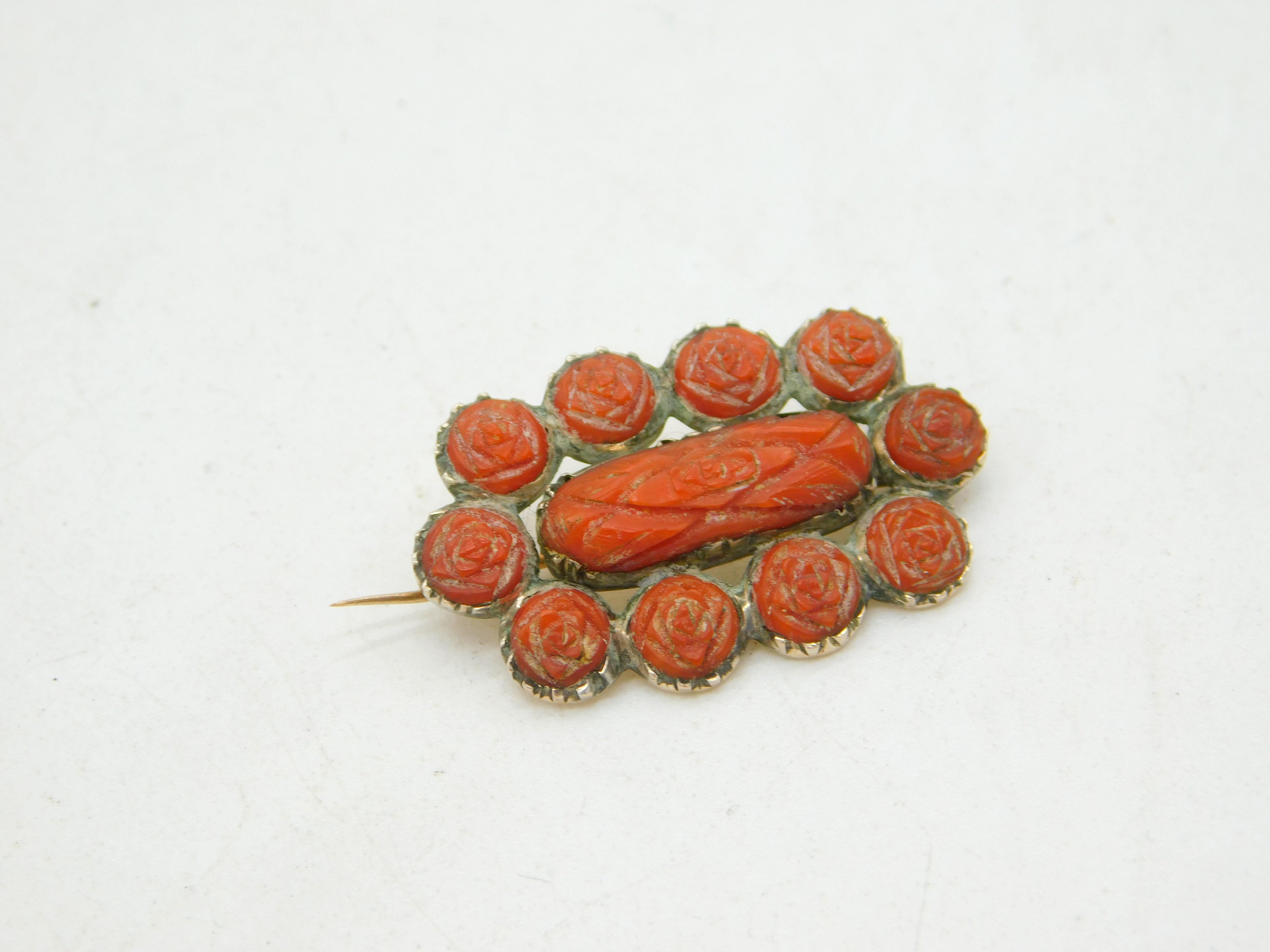 George III 9ct Rose Gold Carved Red Coral Floral Mourning Brooch Antique c1790
