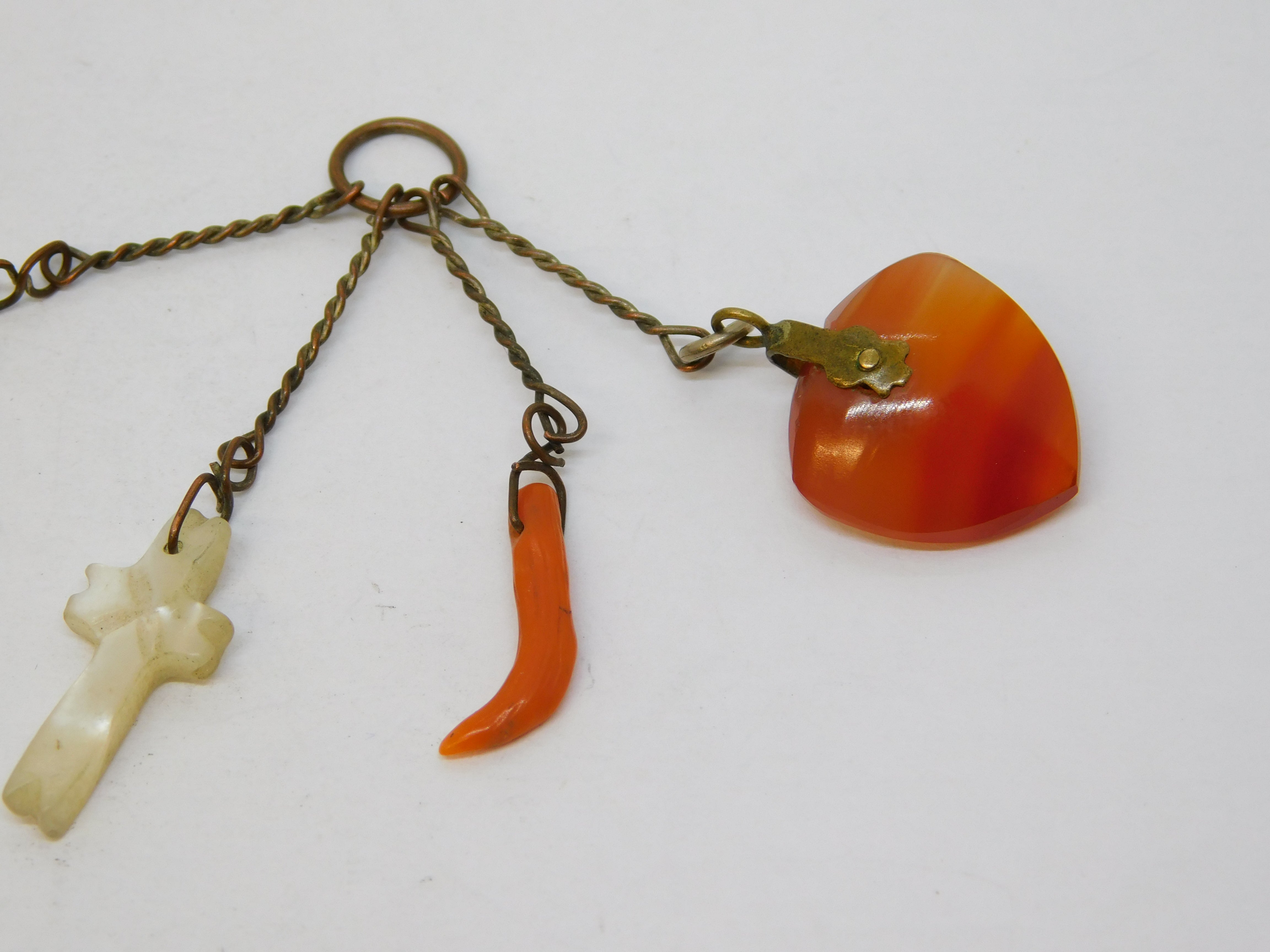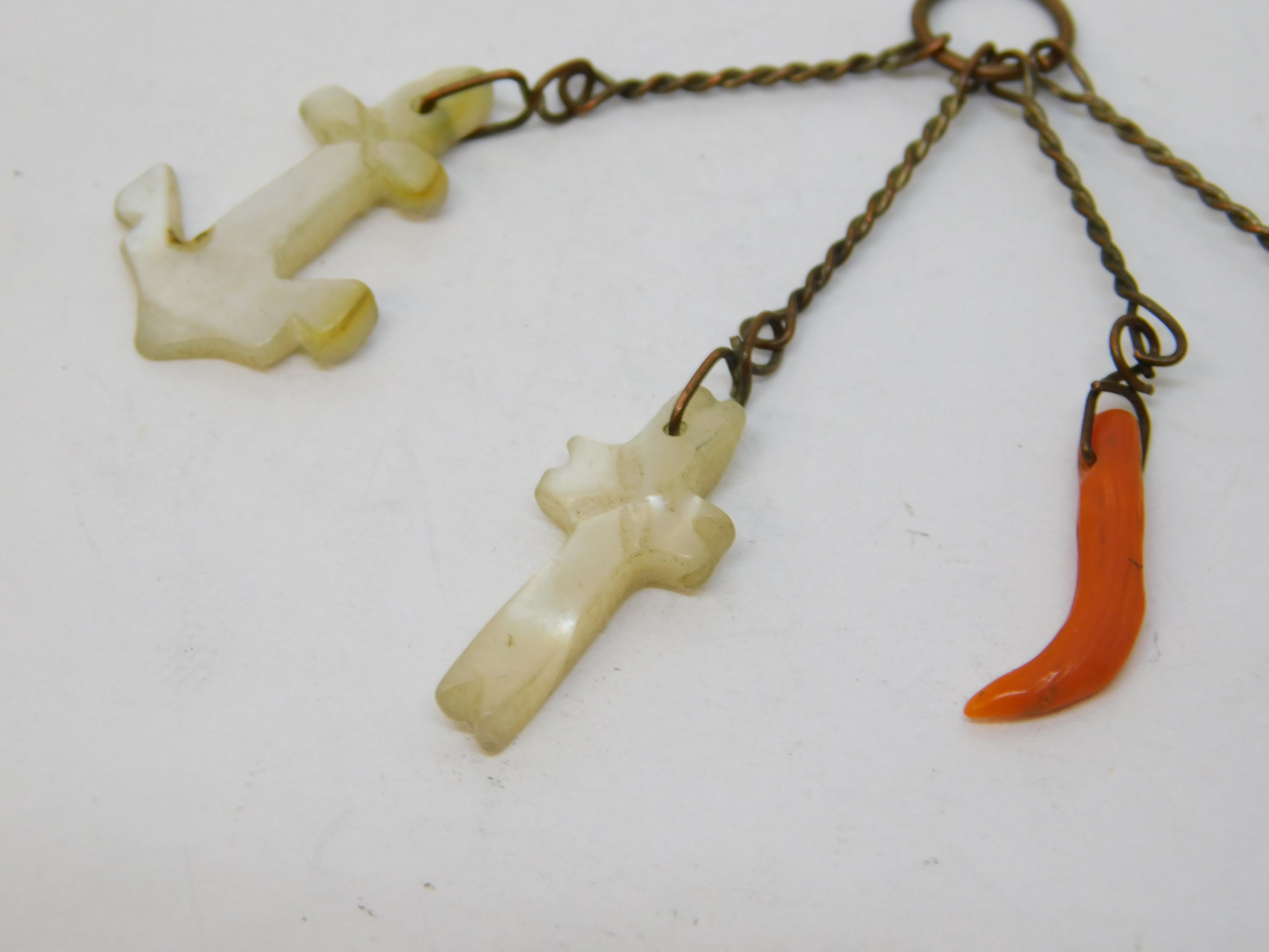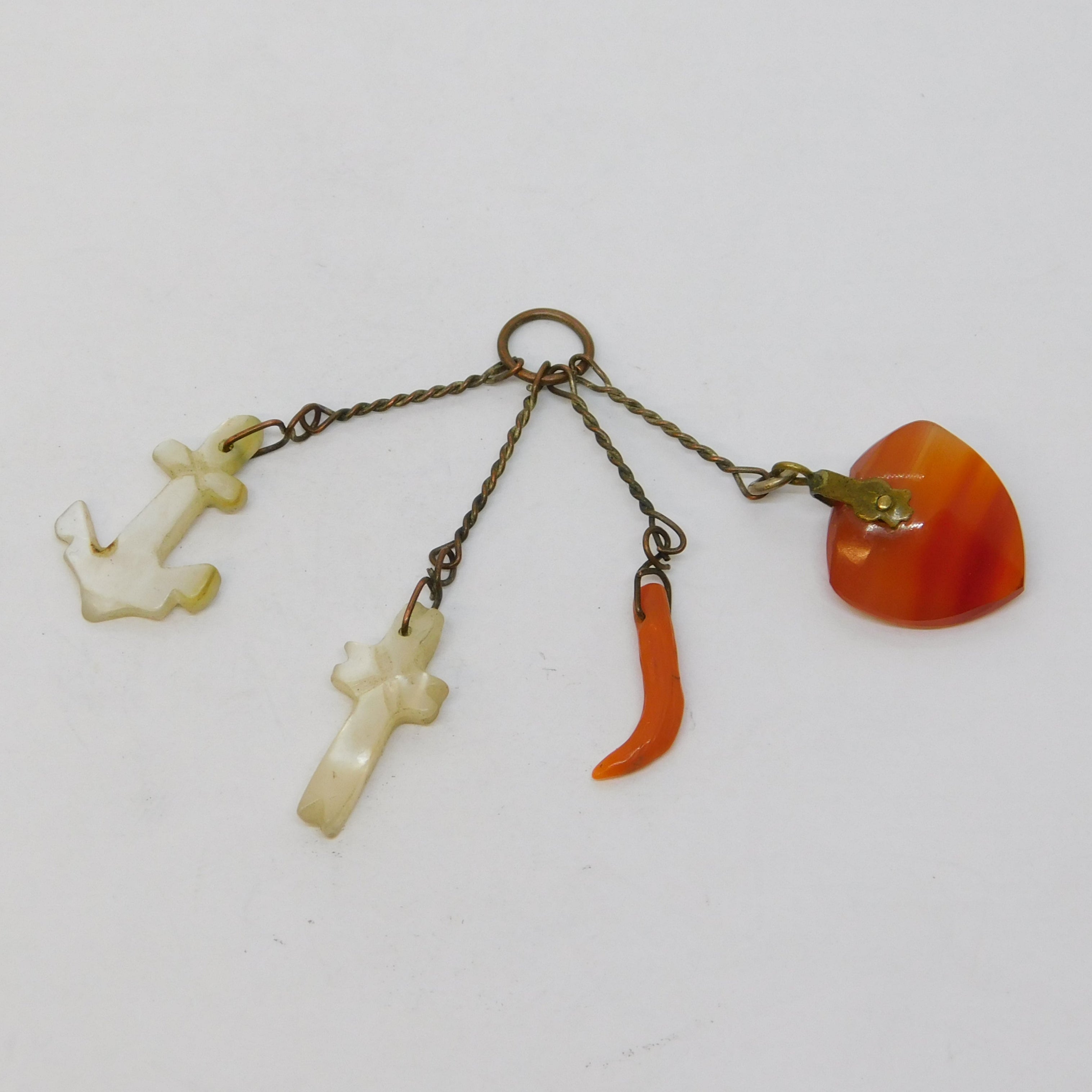 Details: A fantastic and wonderfully designed antique georgian base metal charm fob depicting the anchor of hope, cross of faith and heart of charity alongside a cornicello, formed of pearl, coral and carnelian agate c1800. This is a wonderful item that would make a perfect gift or addition to any collection.