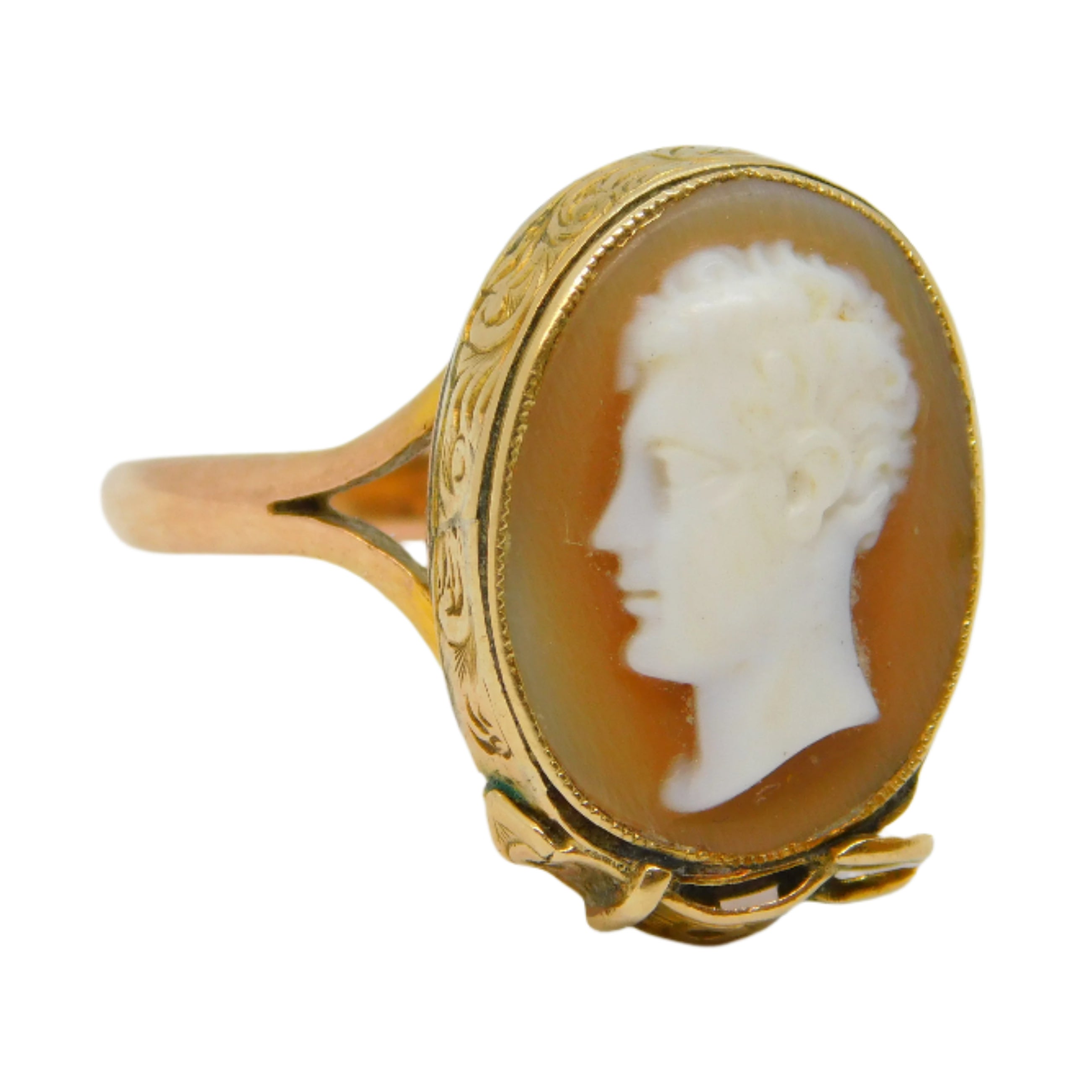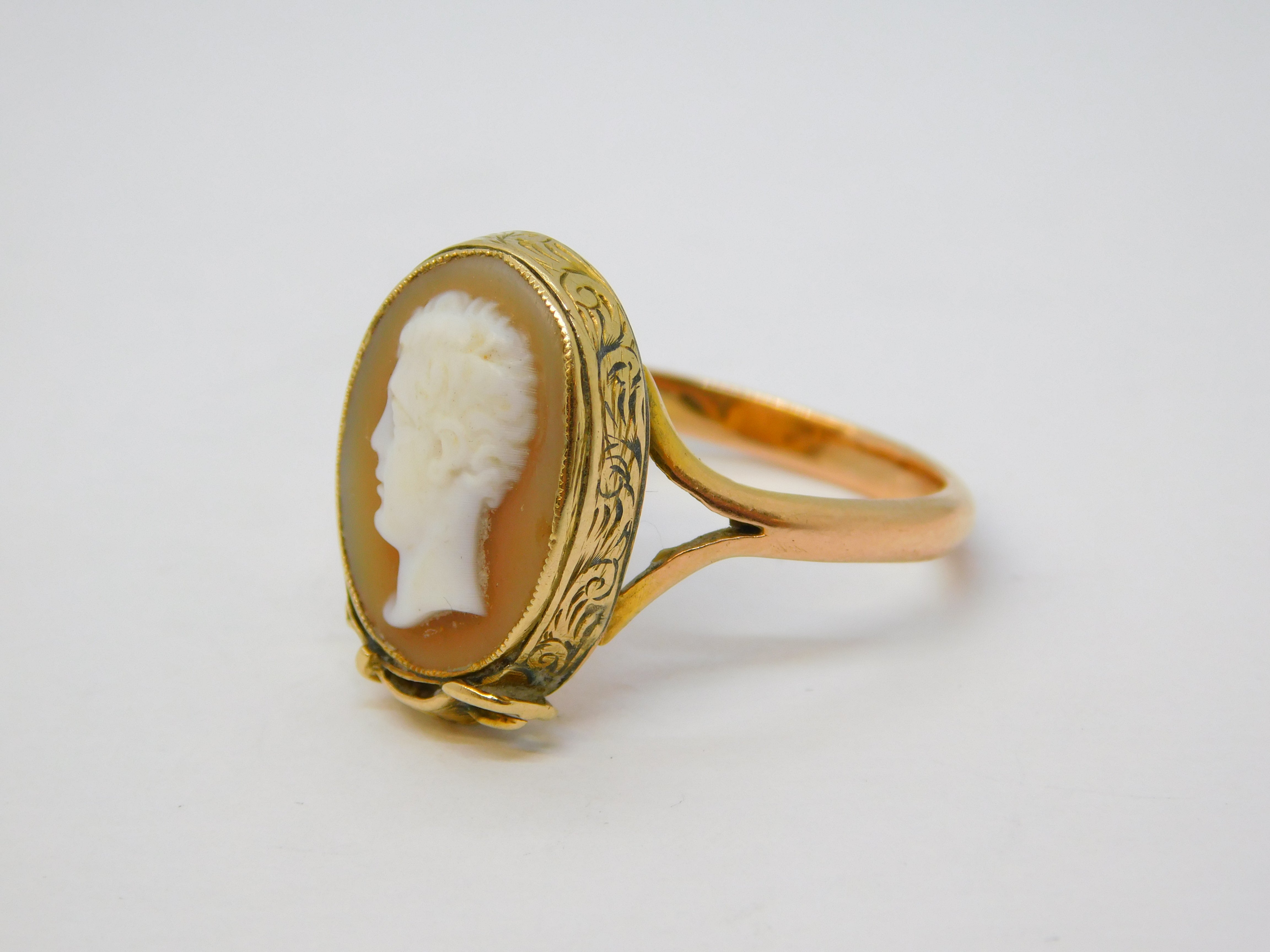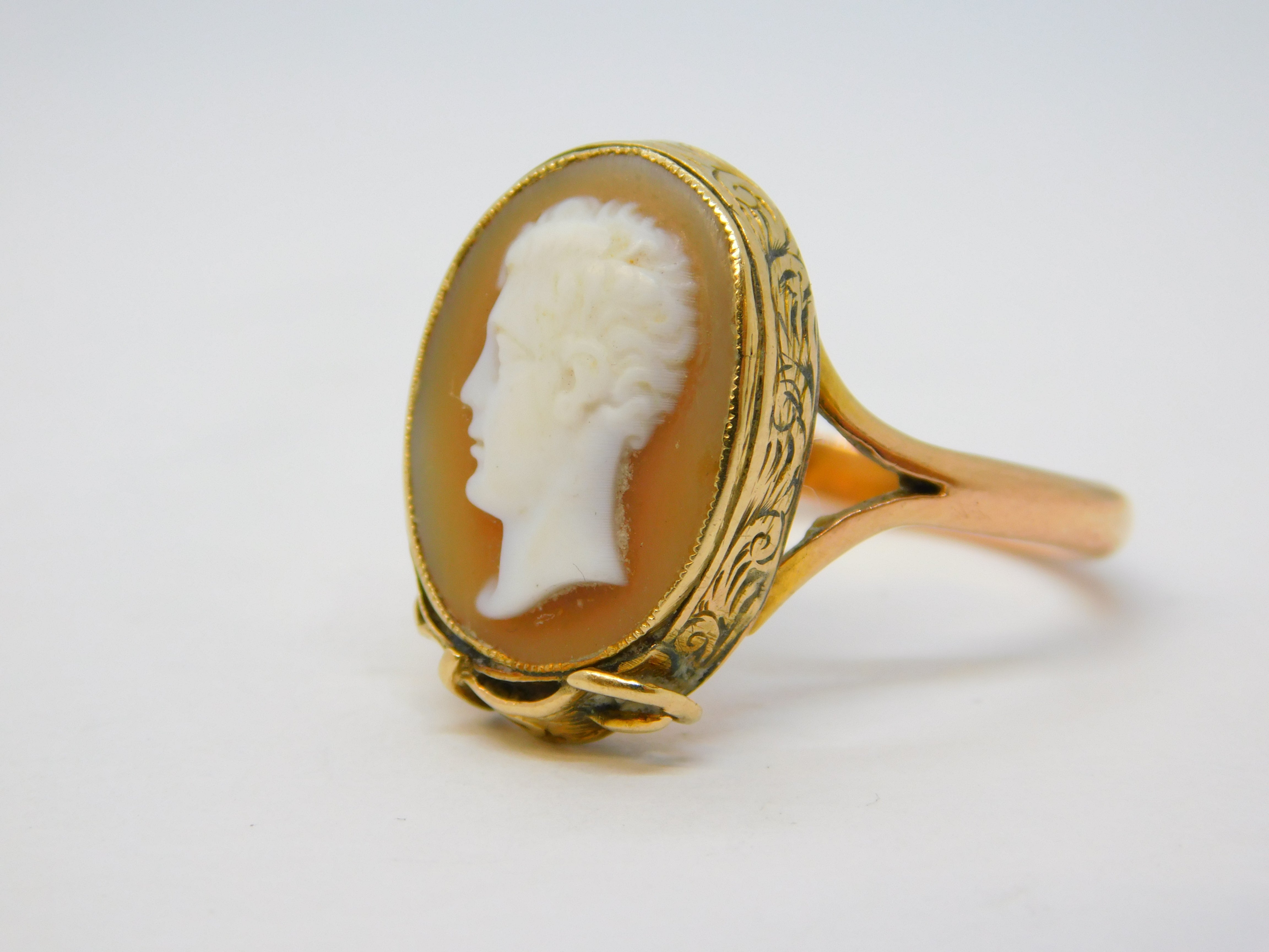 Details: A fantastic and wonderfully designed antique georgian regency period 15ct yellow gold mounted carved cameo depicting a gentleman in profile, possibly Lord Byron, later 9ct rose gold ring shank applied please note hallmarked '9ct', the top has been XRF tested as it is unmarked. Lovely buckle decoration to the base of the front cameo. This is a wonderful item that would make a perfect gift or addition to any collection.
