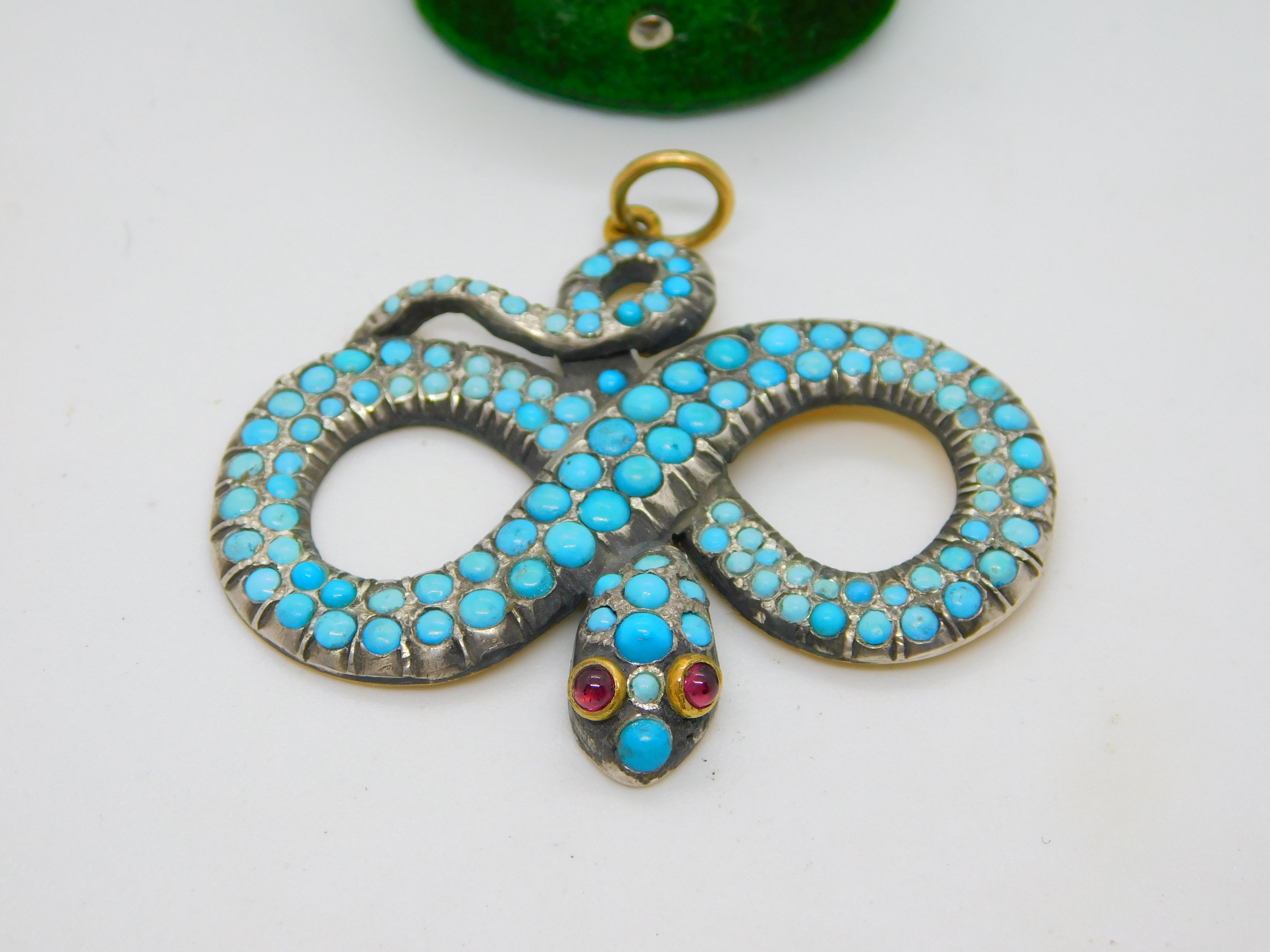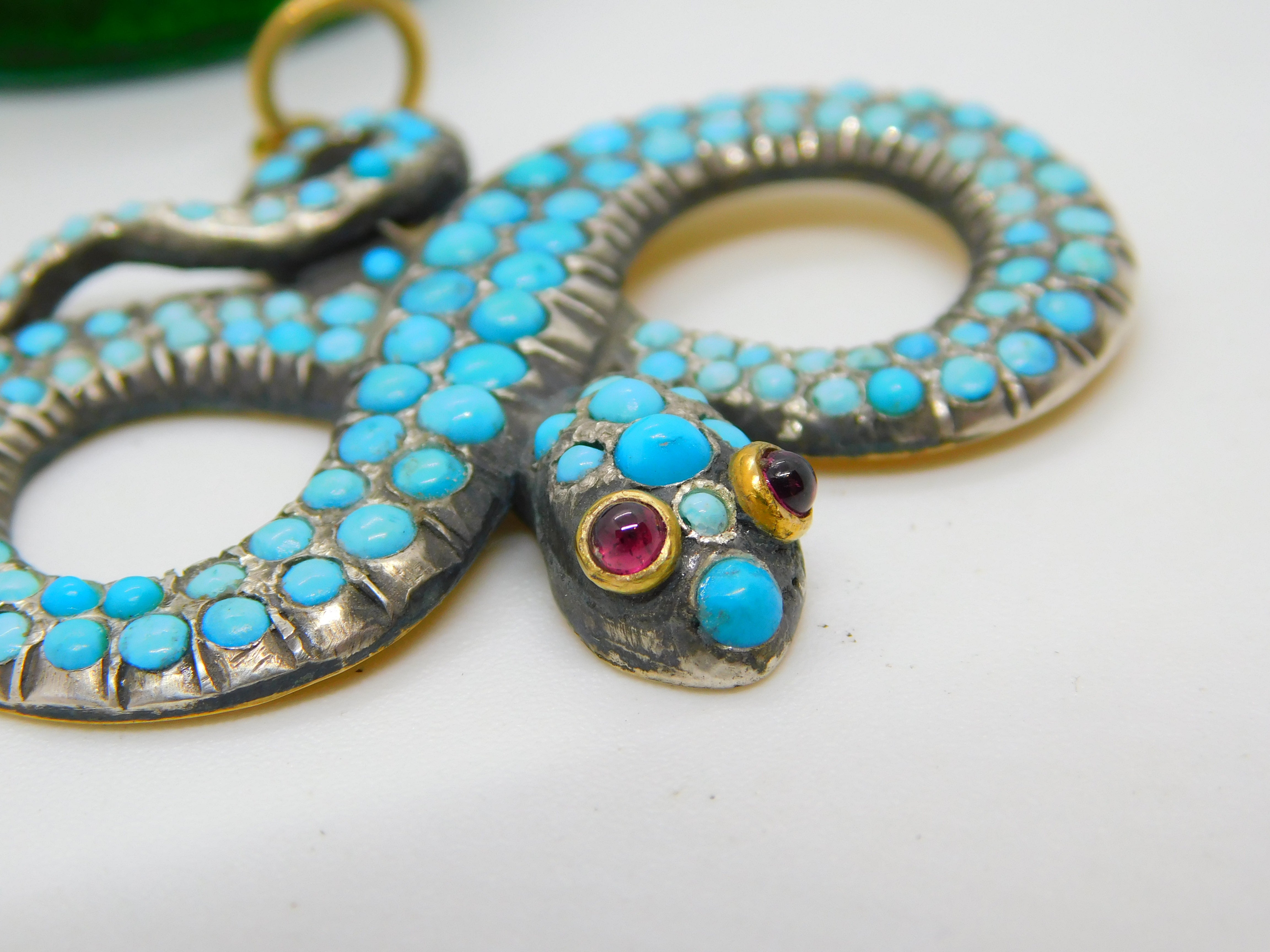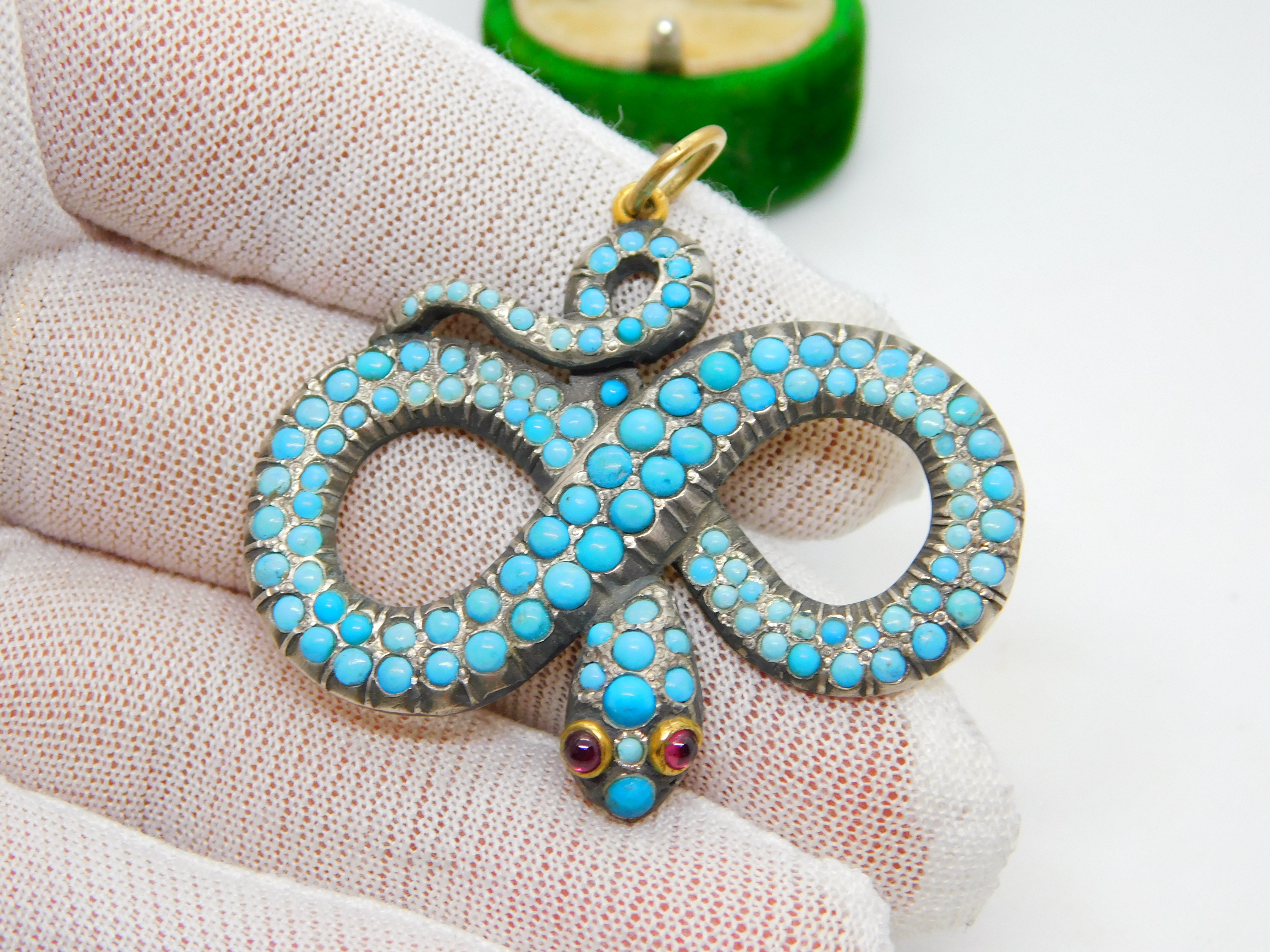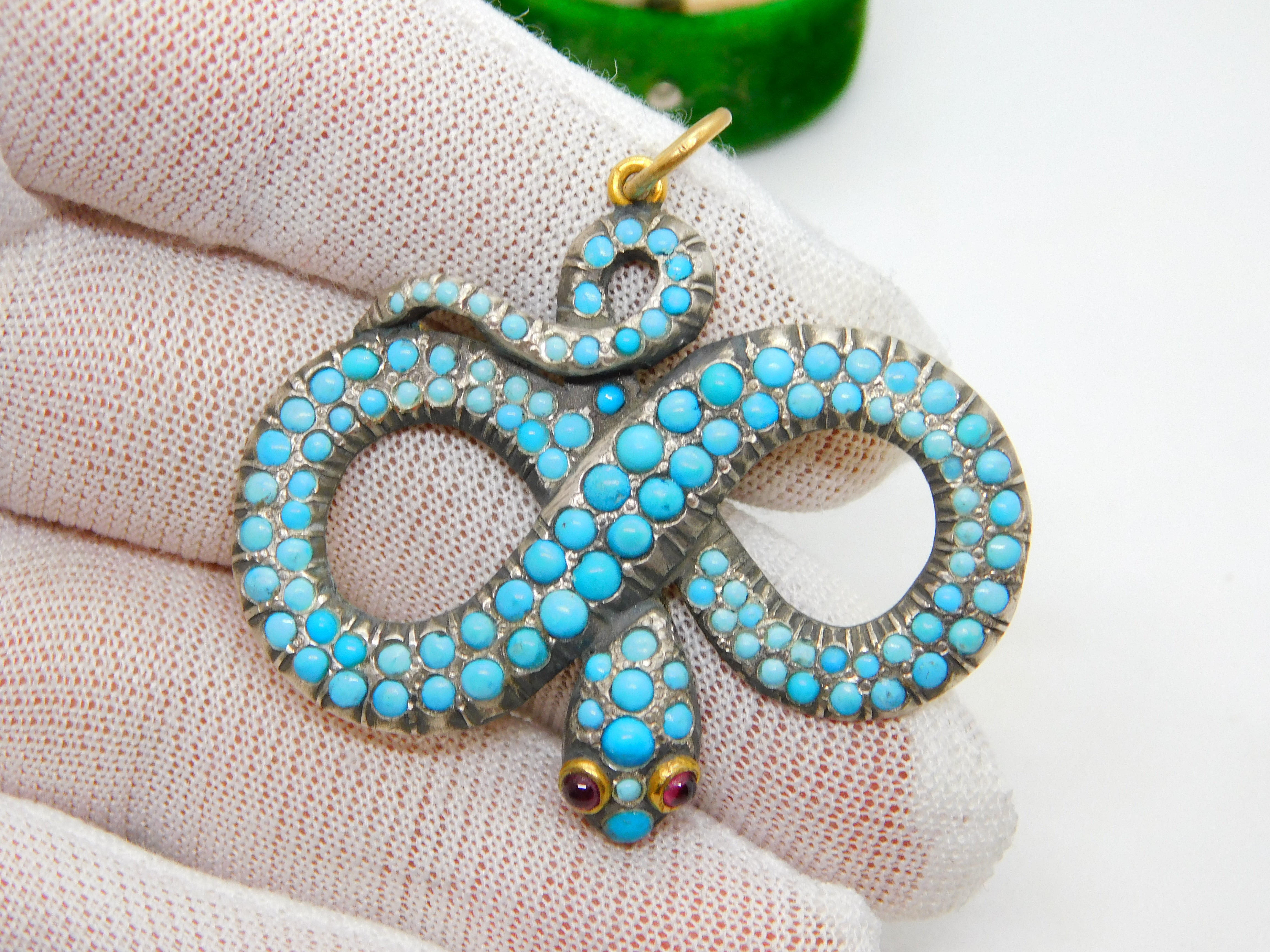 Details: A fantastic and wonderfully designed antique regency period Georgian 18ct yellow gold large snake serpent pendant adorned with turquoise stones pave set in sterling silver c1830. The gold has been XRF tested as it is unmarked. The eyes of the snake are set with natural ruby stones. A stunning example almost certainly austro-hungarian. This is a wonderful item that would make a perfect gift or addition to any collection. The BOX pictured is for PRESENTATION ONLY and is NOT included in the listings but used to frame the pictures unless specifically stated otherwise.