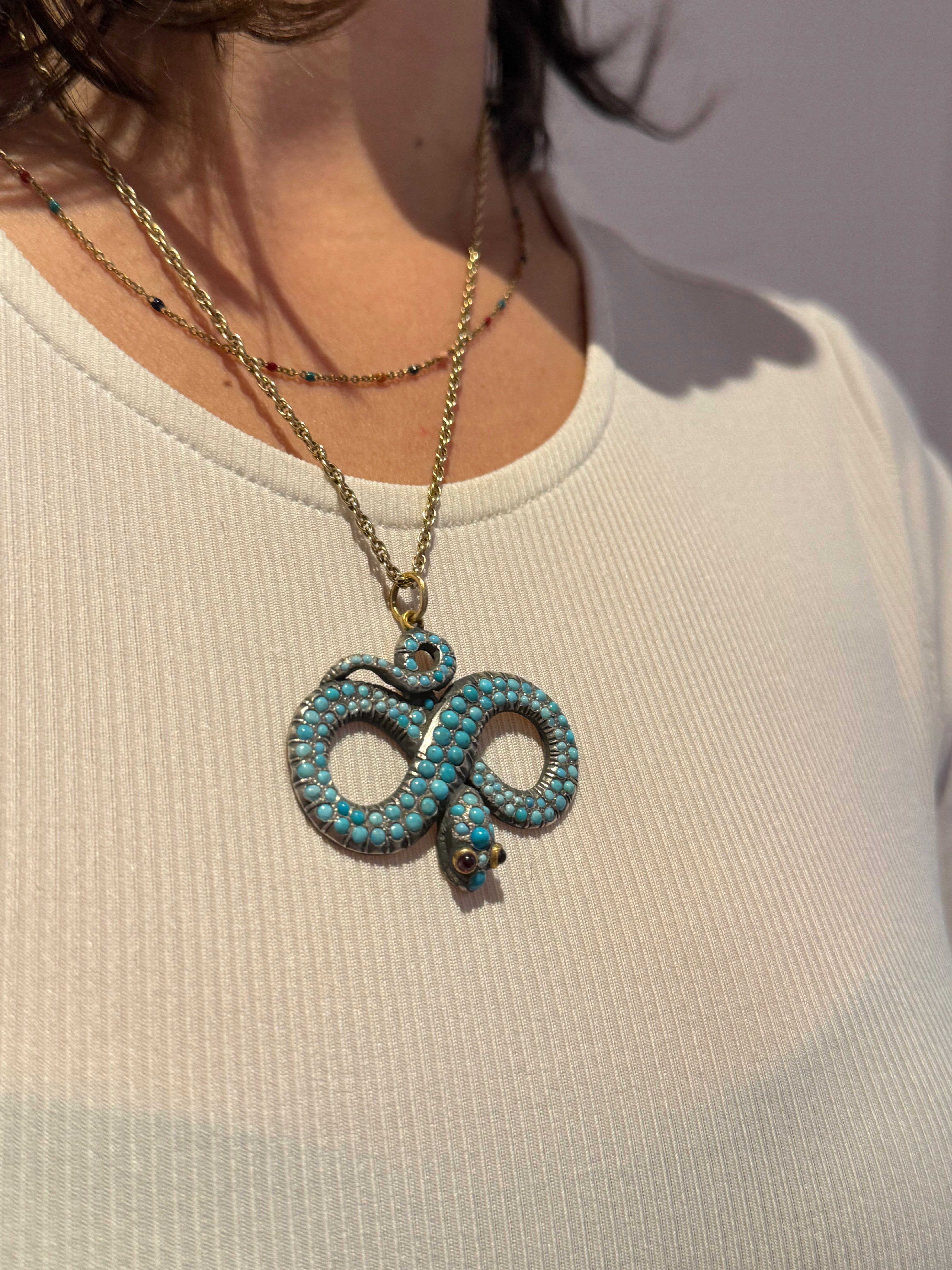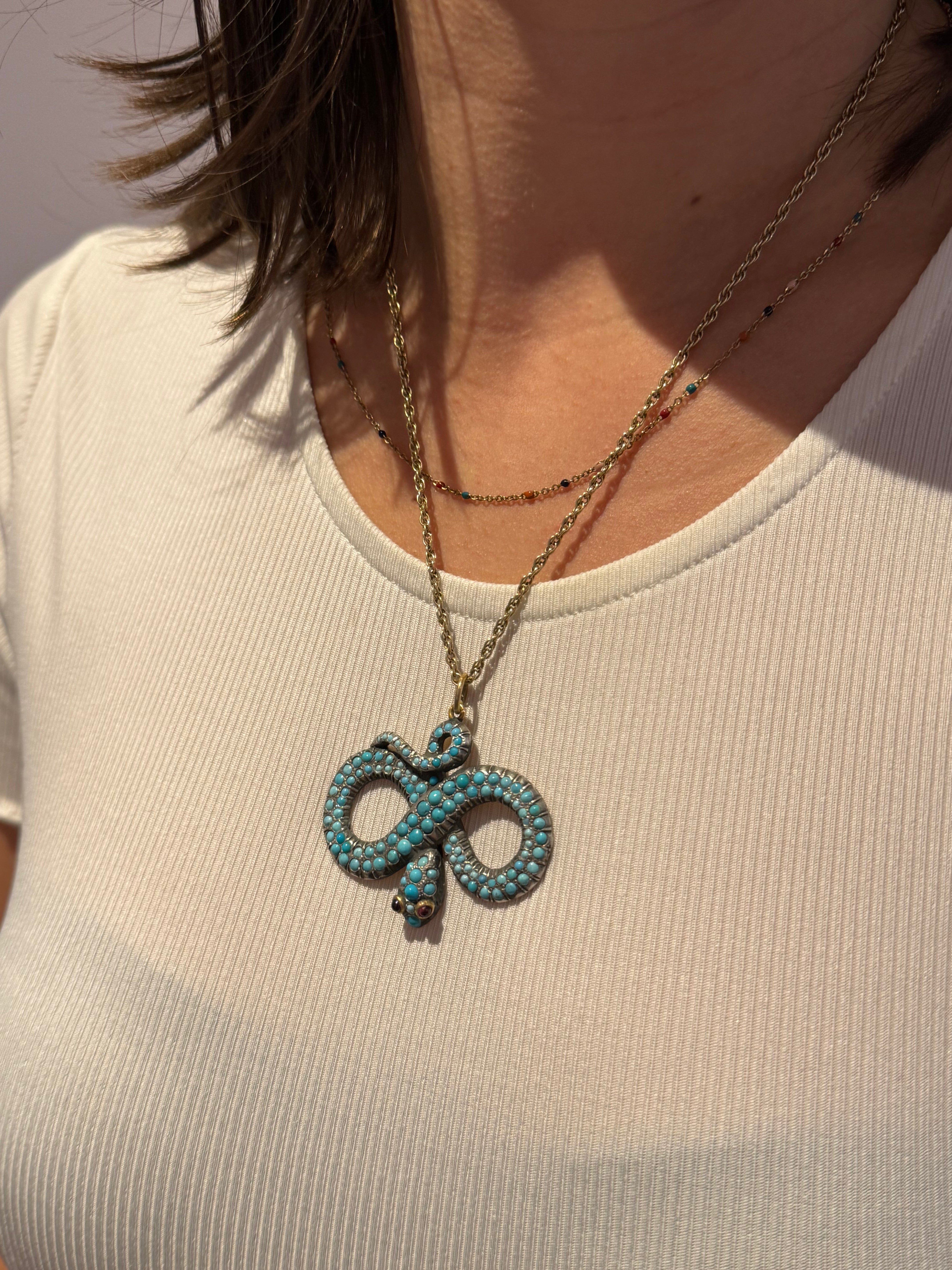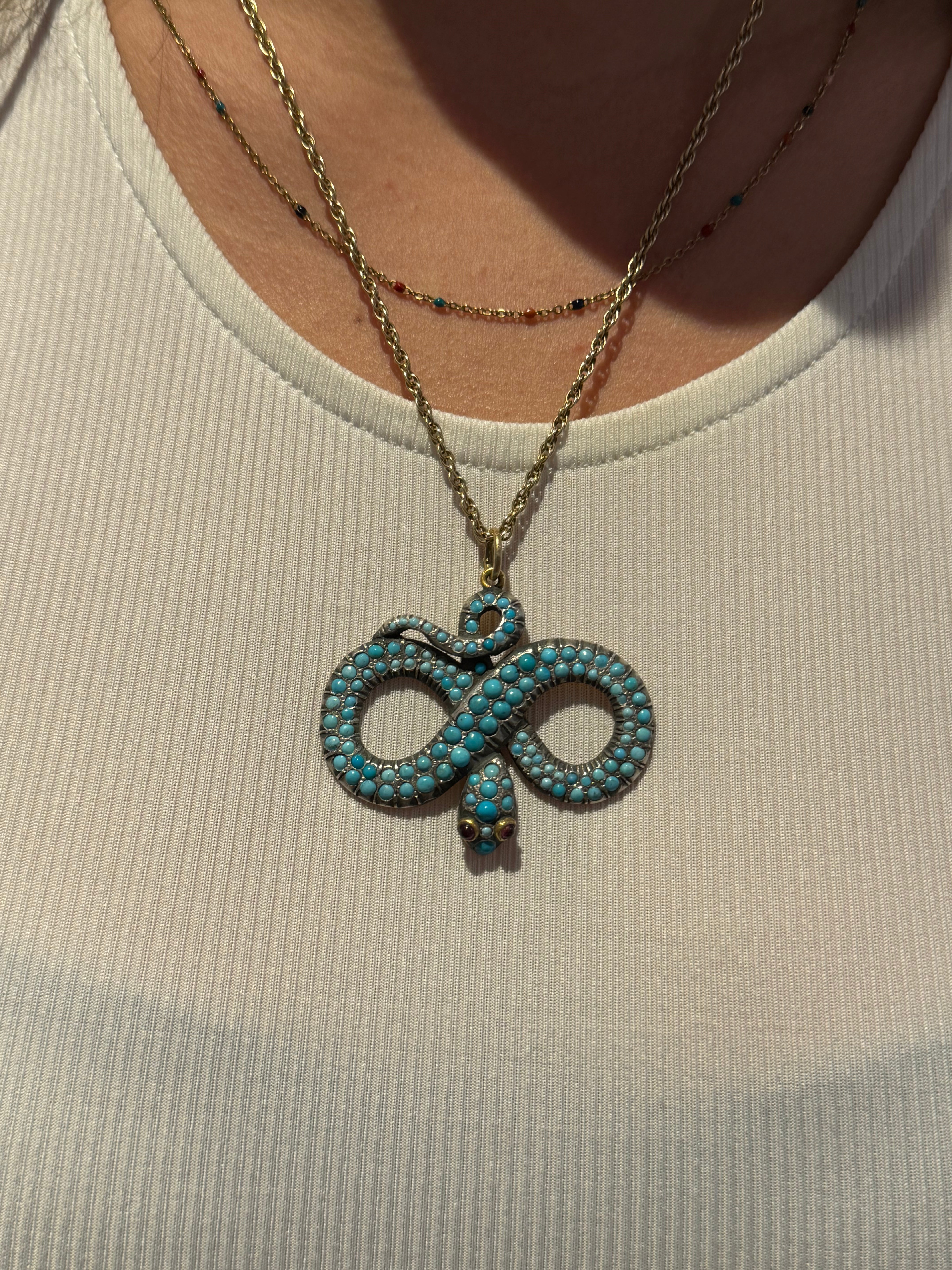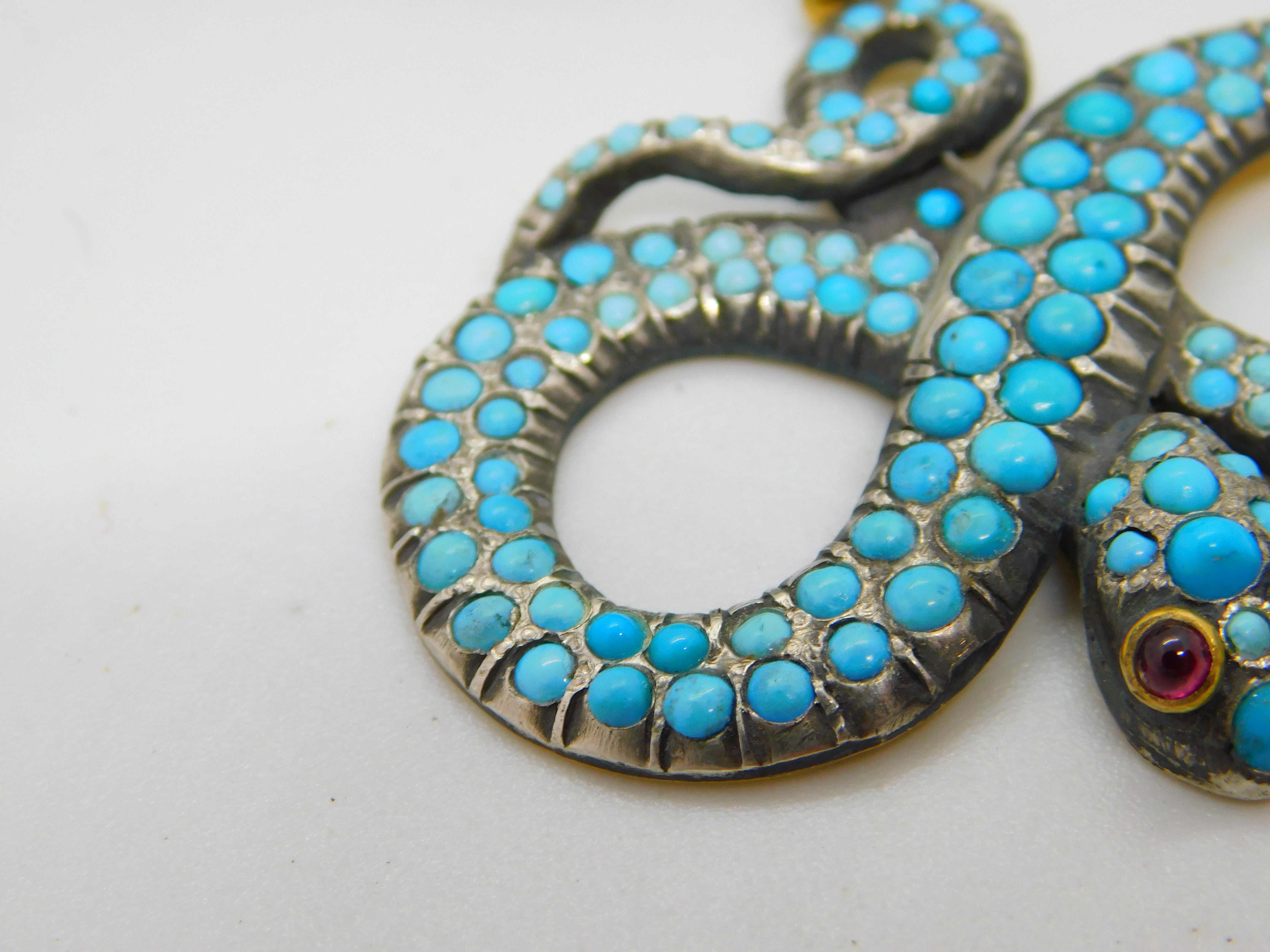 Details: A fantastic and wonderfully designed antique regency period Georgian 18ct yellow gold large snake serpent pendant adorned with turquoise stones pave set in sterling silver c1830. The gold has been XRF tested as it is unmarked. The eyes of the snake are set with natural ruby stones. A stunning example almost certainly austro-hungarian. This is a wonderful item that would make a perfect gift or addition to any collection. The BOX pictured is for PRESENTATION ONLY and is NOT included in the listings but used to frame the pictures unless specifically stated otherwise.