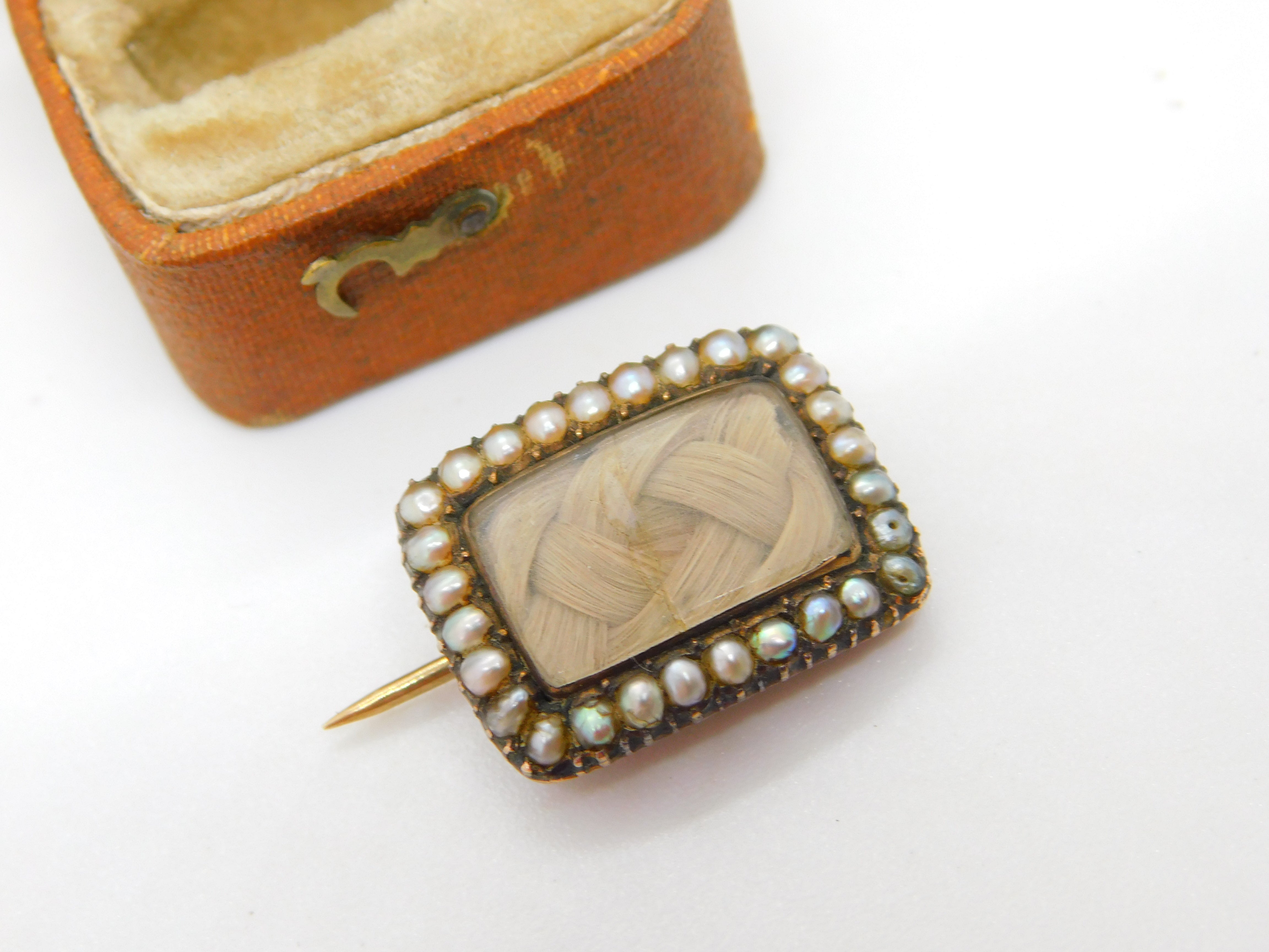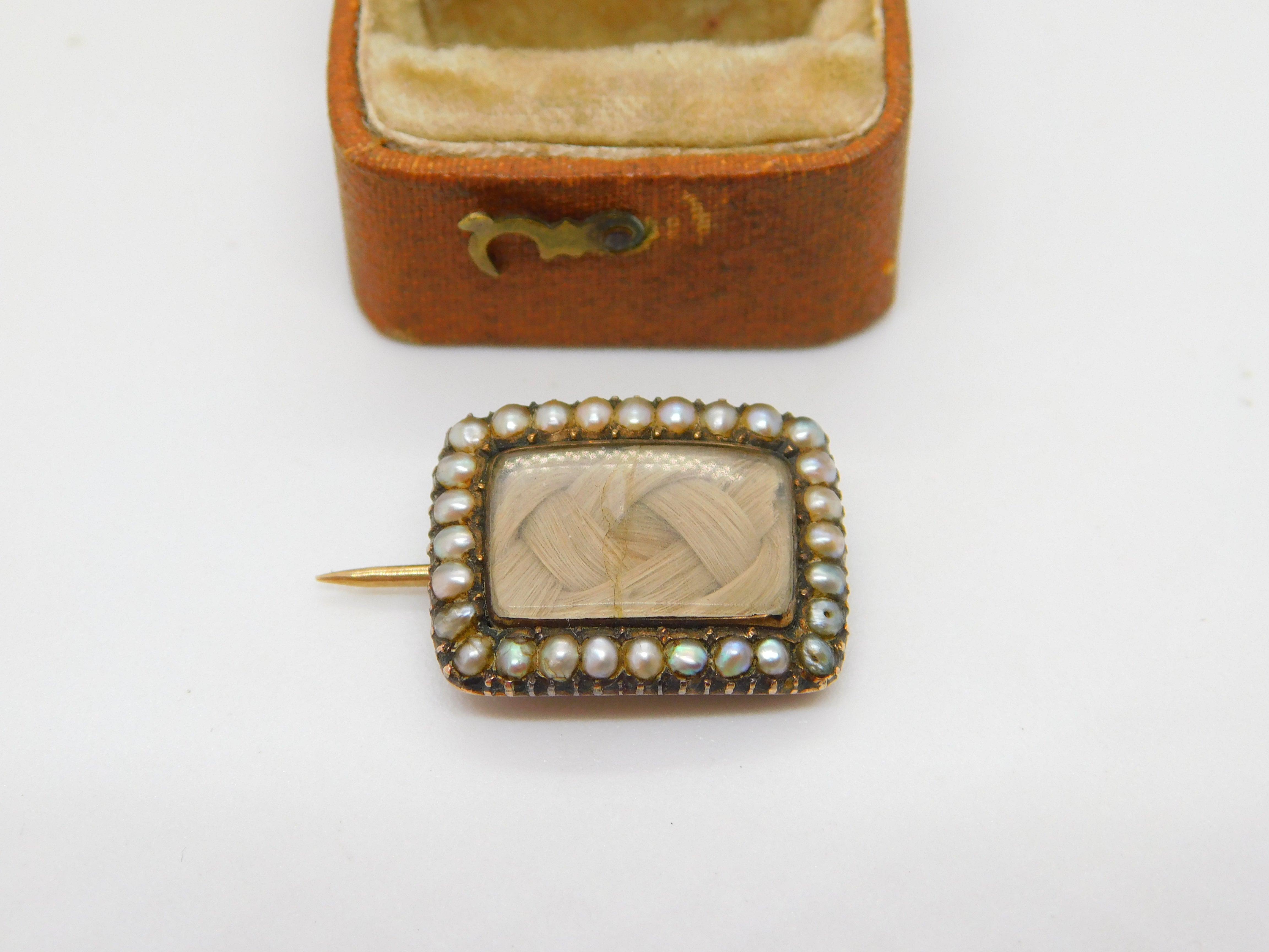 Regency Georgian 9ct Gold, Seed Pearl & Woven Hair Mourning Brooch c1830 Antique