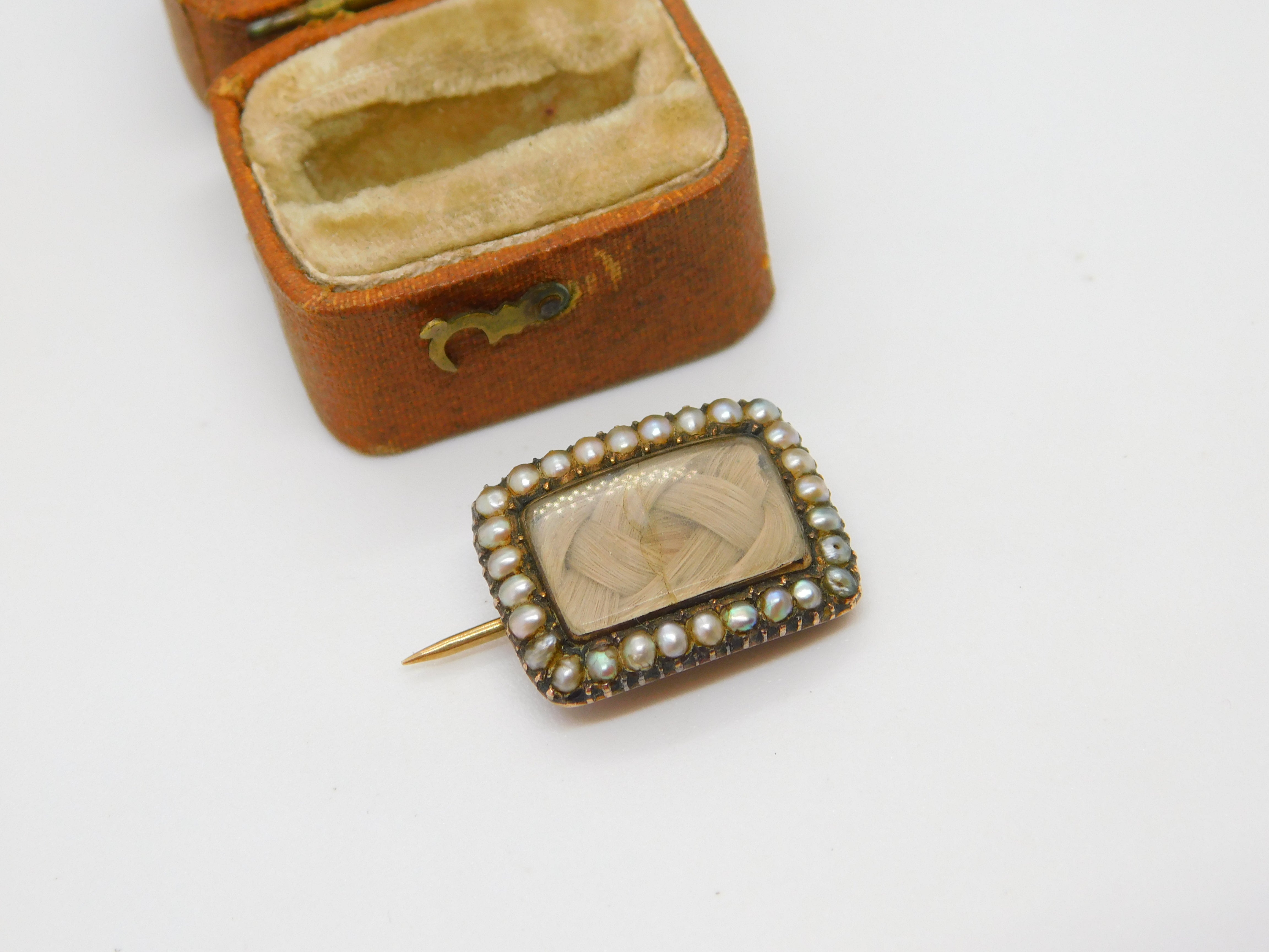Details: A fantastic and wonderfully designed antique Georgian regency 9ct gold, seed pearl and hair set mourning brooch with charming detail c1830, the gold has been XRF tested as it is unmarked. Minor hairline crack to the glass. This is a wonderful item that would make a perfect gift or addition to any collection. The BOX pictured is for PRESENTATION ONLY and is NOT included in the listings but used to frame the pictures unless specifically stated otherwise.