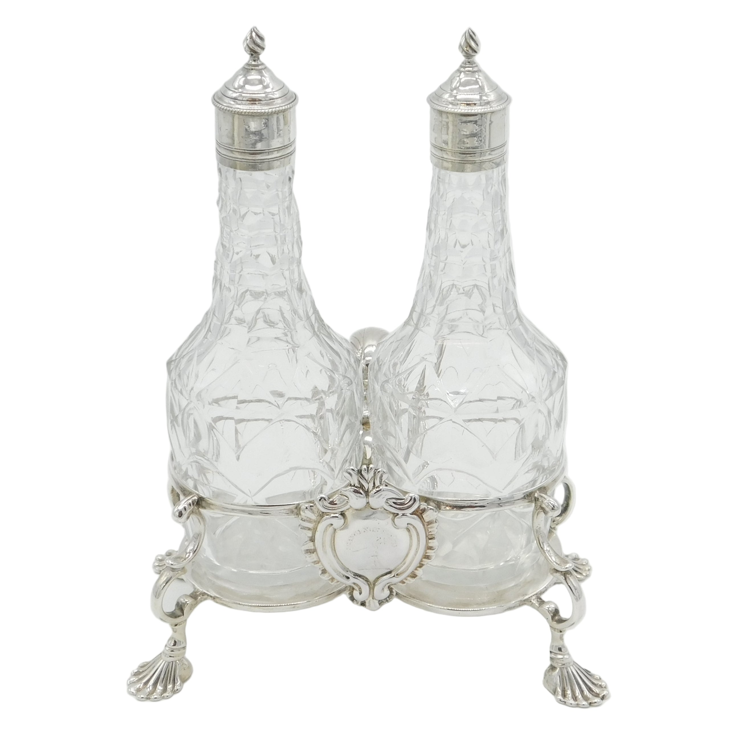 George II Sterling Silver & Cut Glass Sauce Decanters on Stand Antique 1759 London