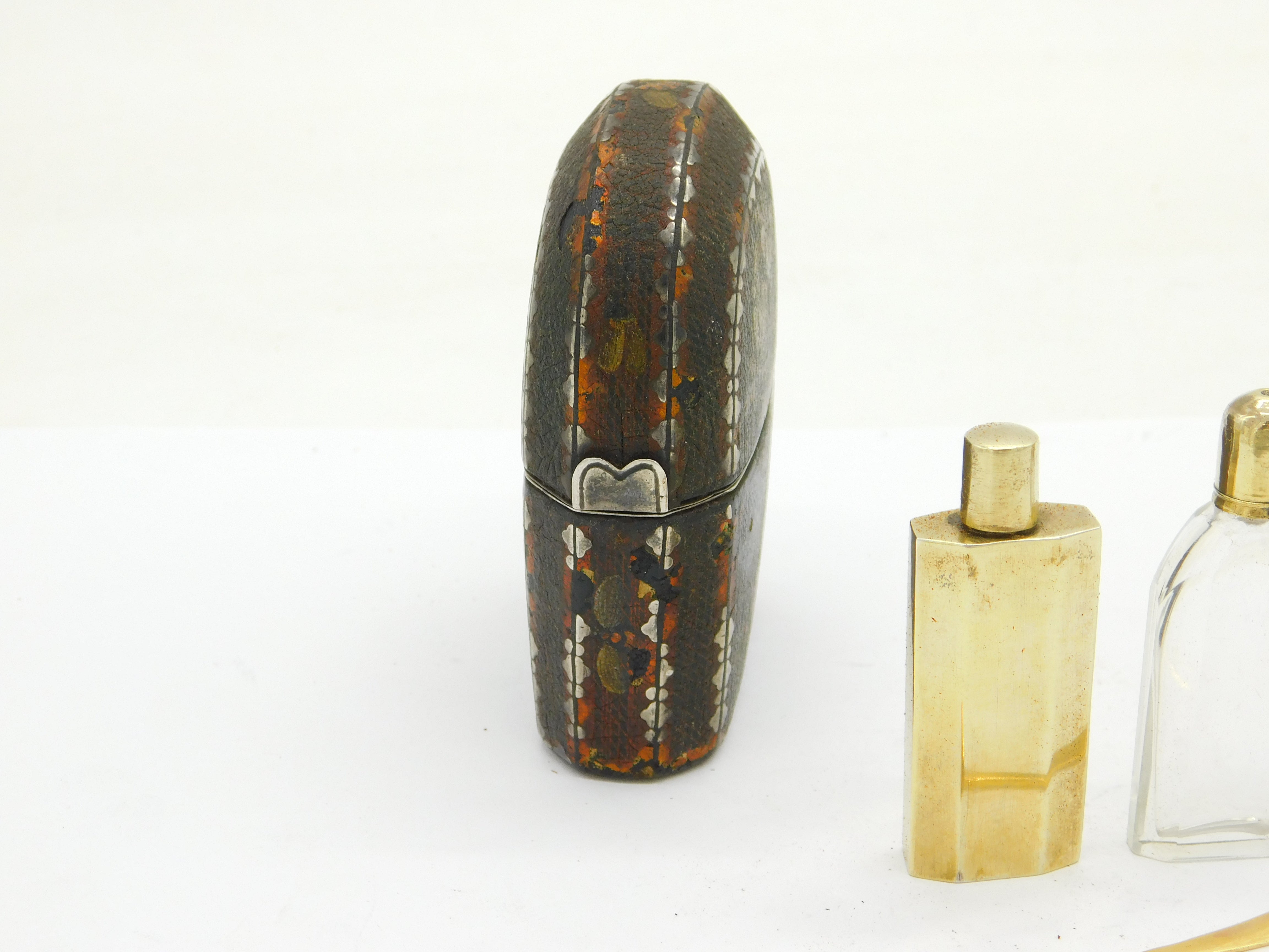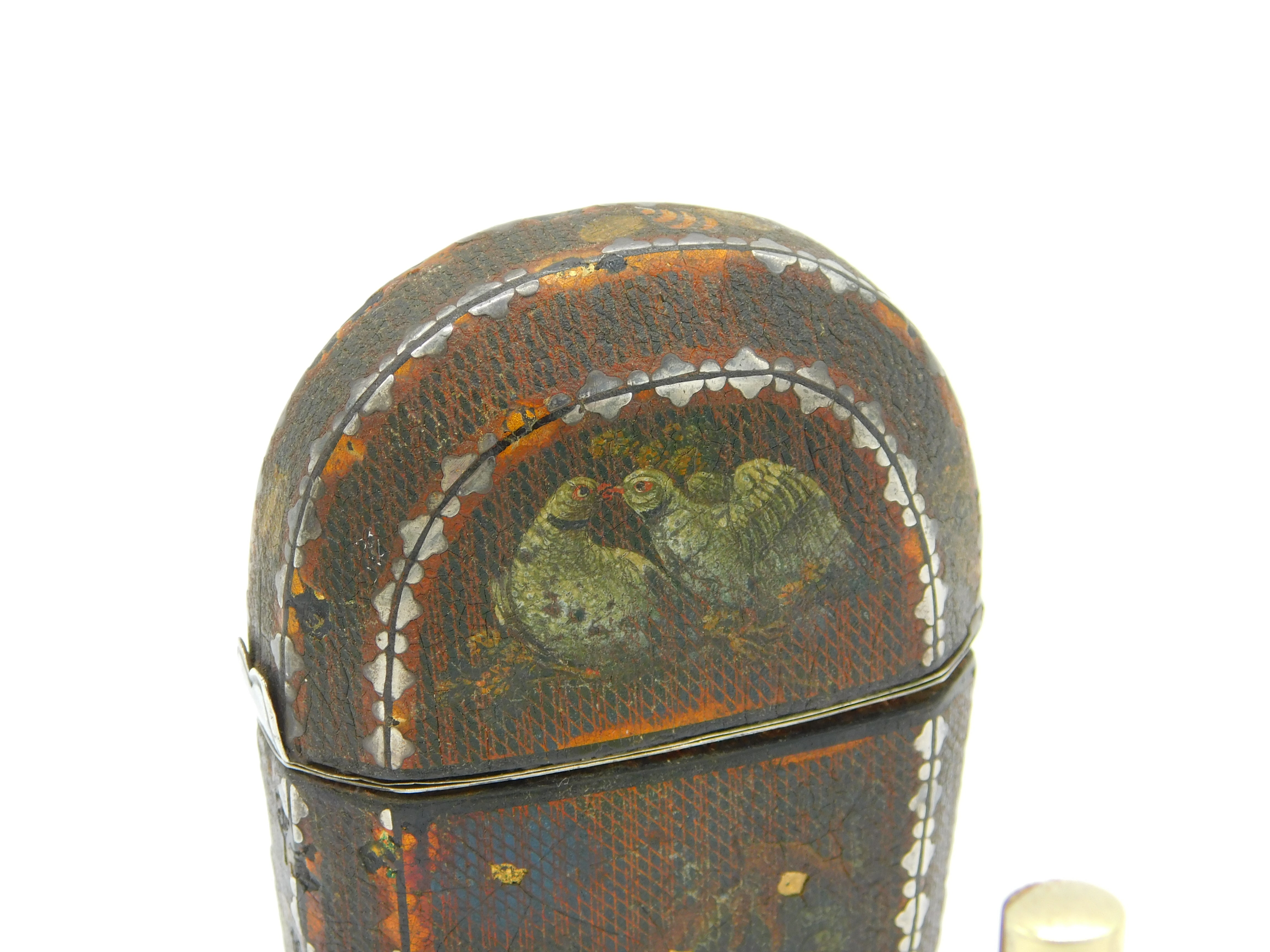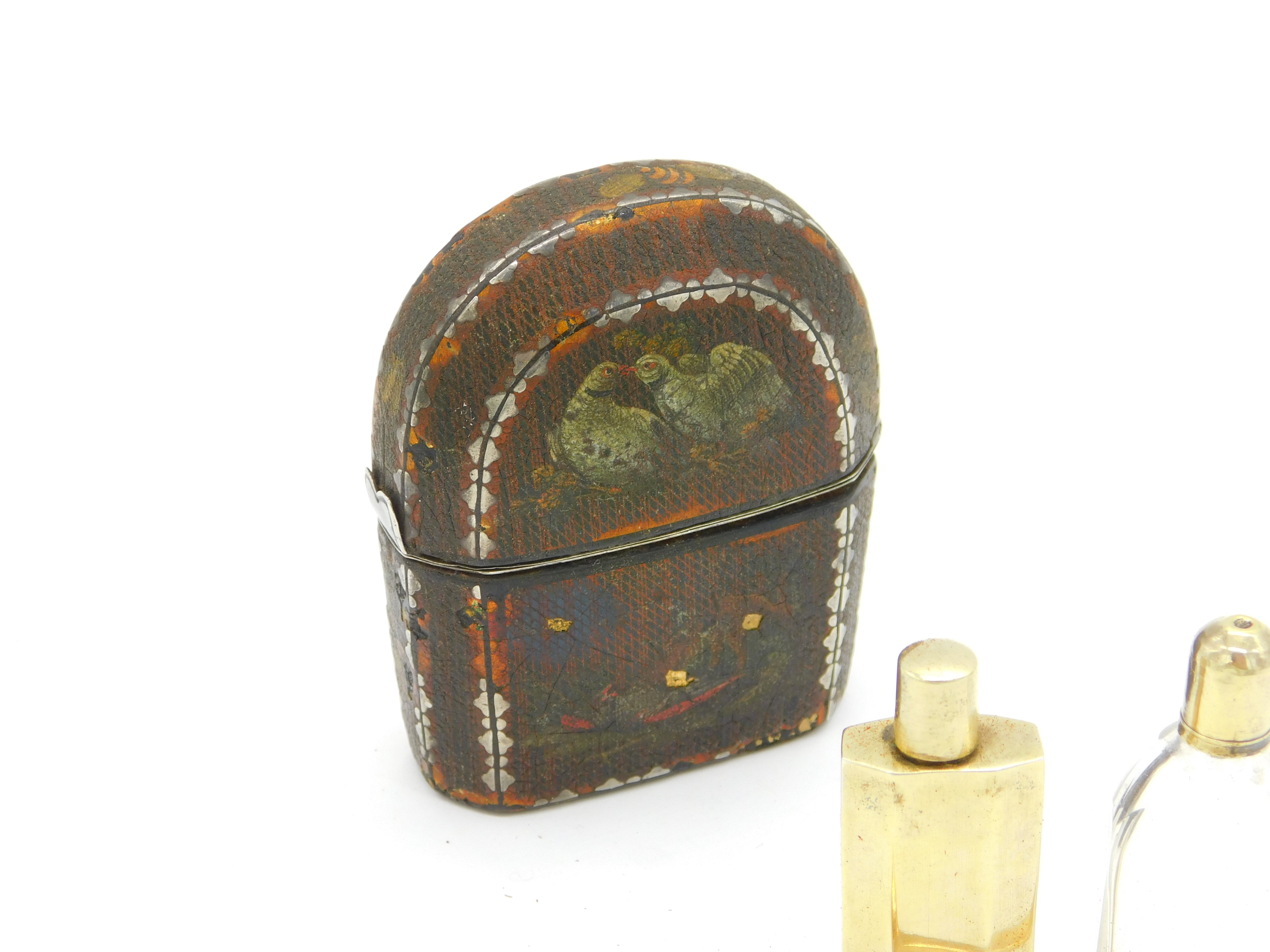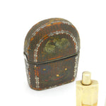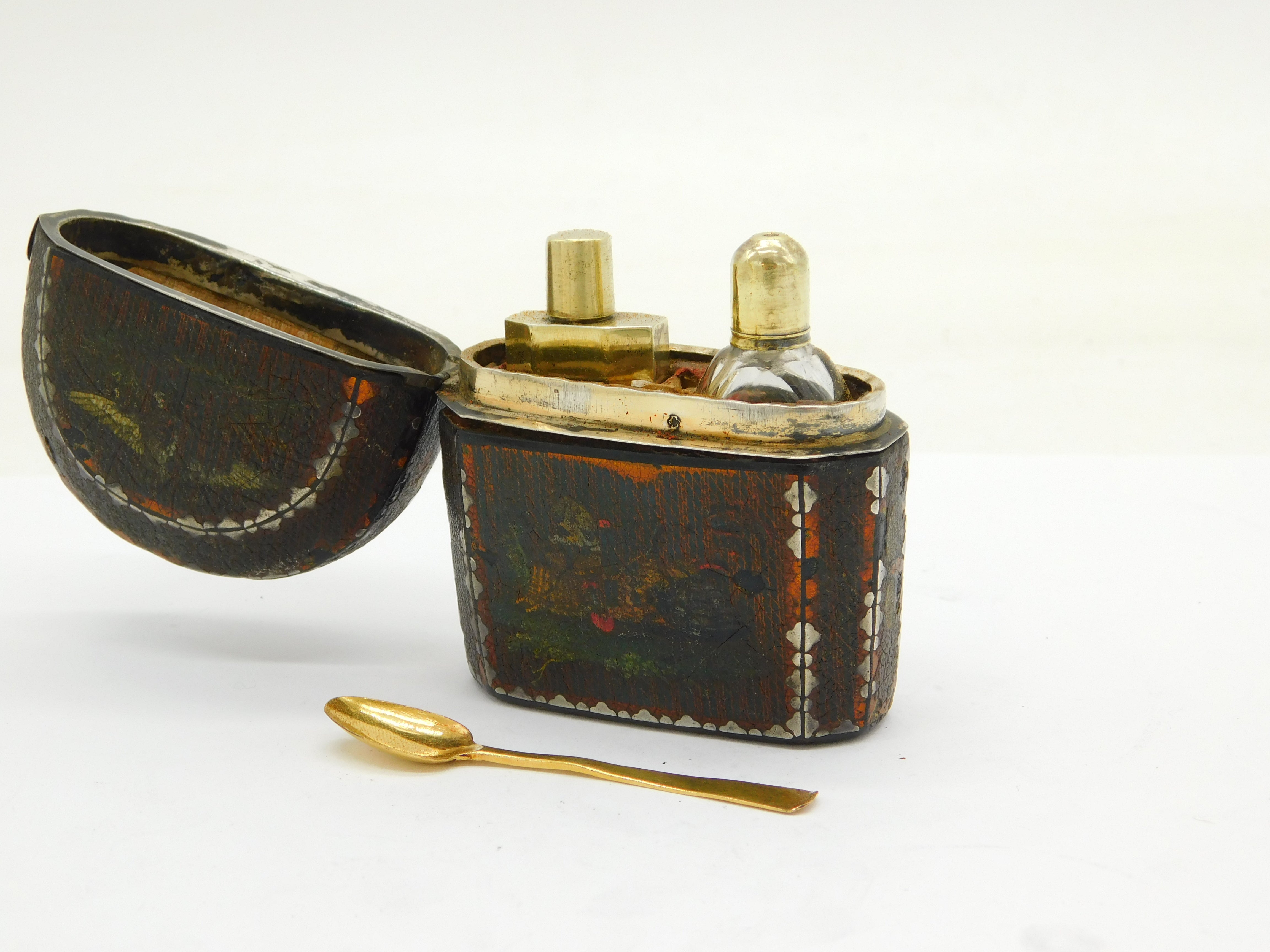 Details: A fantastic and wonderfully designed antique 18th century French sterling silver gilt & leatherbound hand painted travelling perfume vanity case depicting chickens & birds, included with two silver gilt small perfume bottles and a 9ct yellow gold spoon. Hallmarked in places and has been XRF tested, the spoon has been separately tested. This is a wonderful item that would make a perfect gift or addition to any collection. We are more than happy to provide XRF reports for items upon request.
