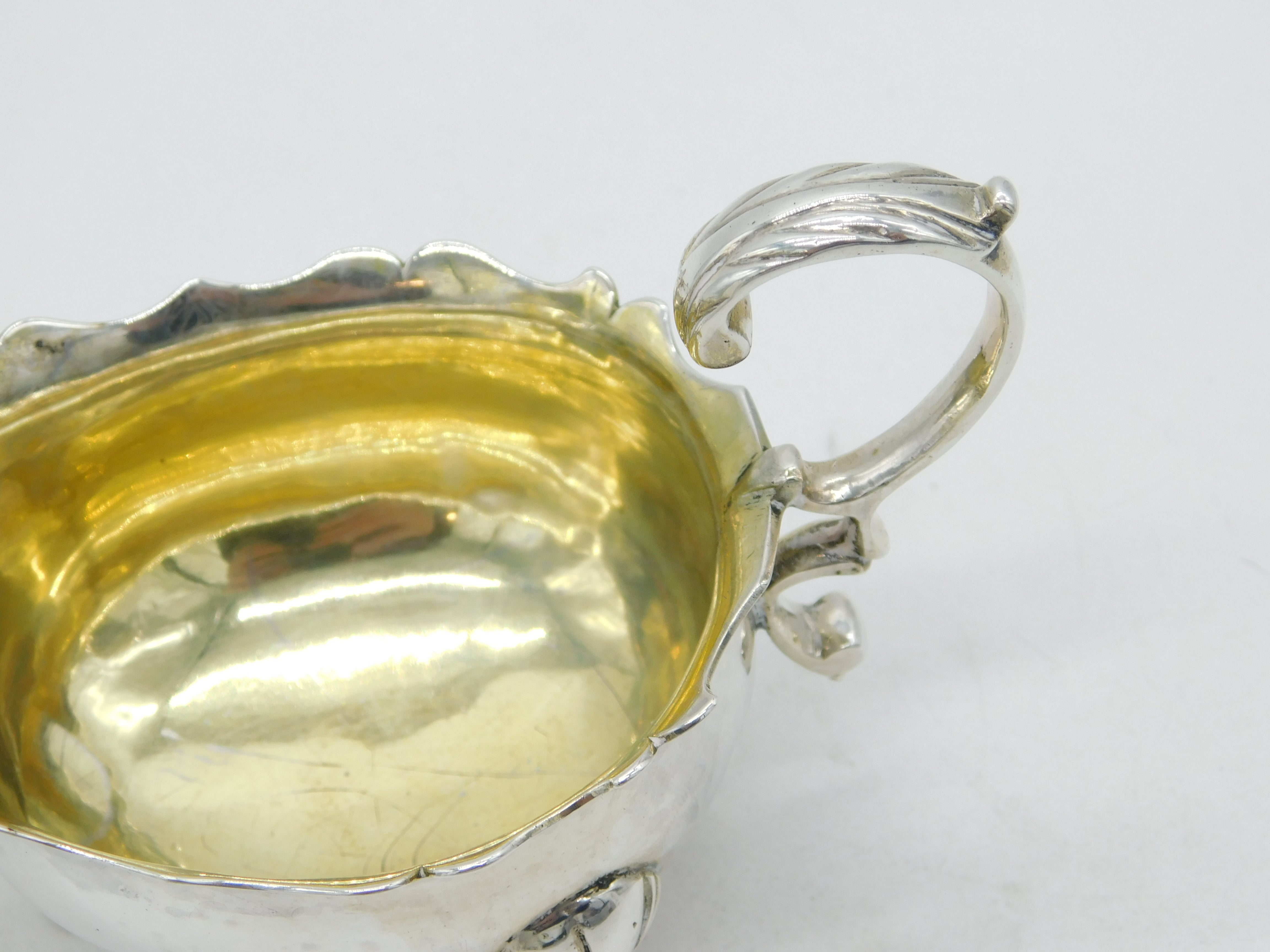 Details: A fantastic and wonderfully designed antique early-georgian sterling silver sauce boat with double heraldic crests to the edge, excellent gilded interior and cast scrolled handle. Hallmarked London 1748 to the base with unusual 'w' over lion passat hallmarks. This is a wonderful item that would make a perfect gift or addition to any collection. We are more than happy to provide XRF reports for items upon request.