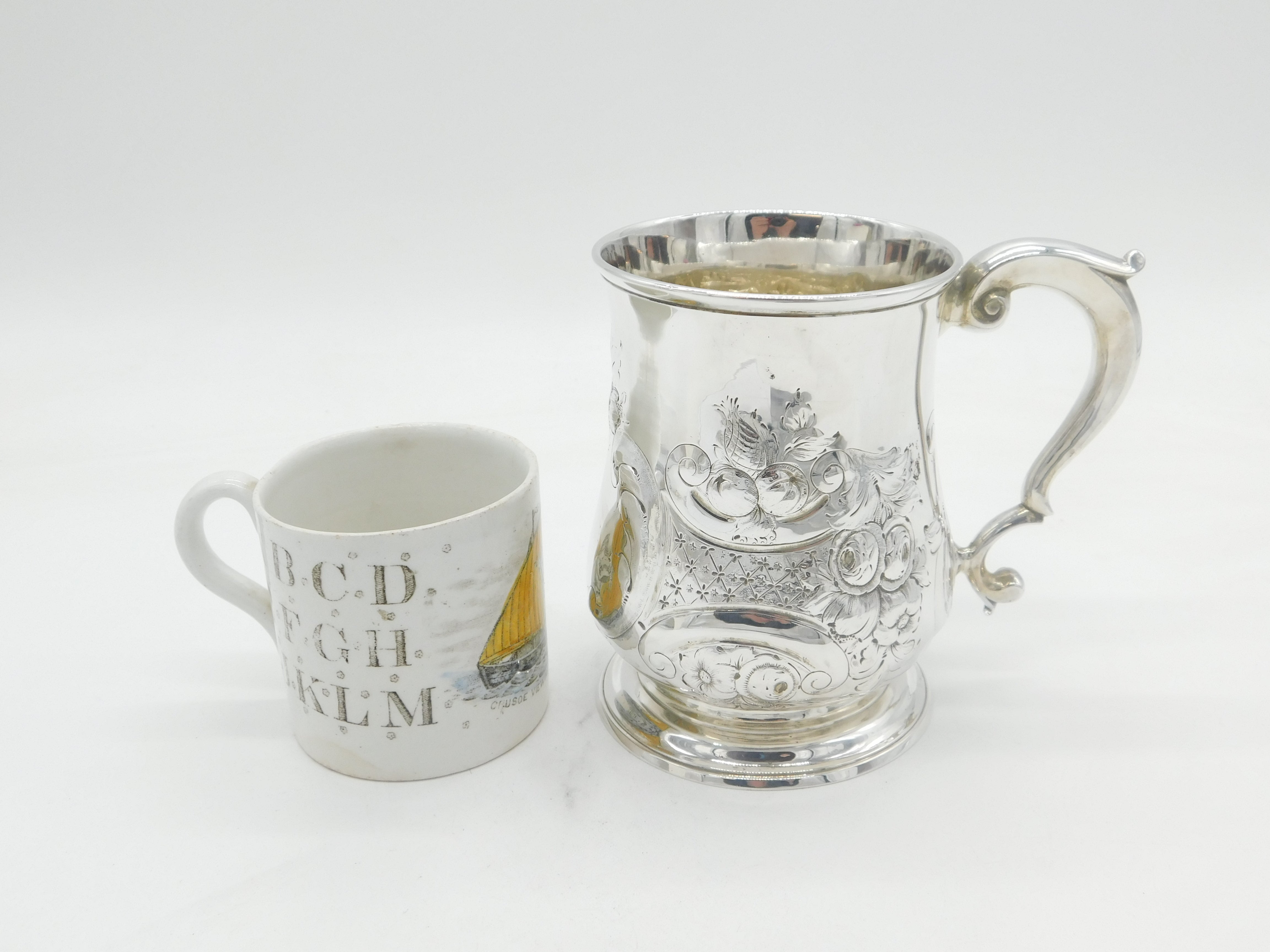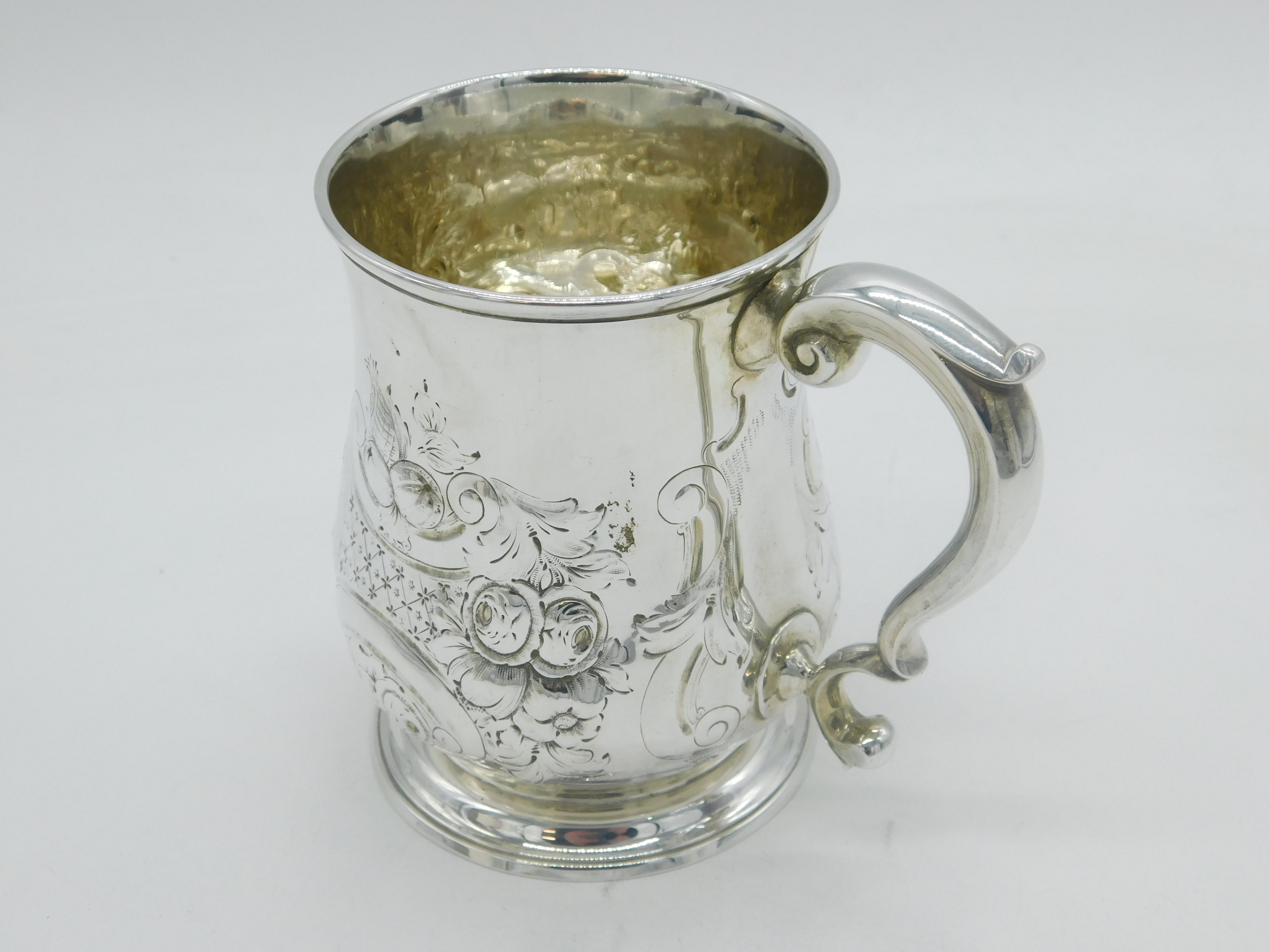 Details: A fantastic and wonderfully designed antique early-georgian sterling silver floral embossed pint tankard with scrolled handle, hallmarked to the base for London 1741 by Gabriel Sleath. Presented in good clean condition with no prior engraving. This is a wonderful item that would make a perfect gift or addition to any collection. We are more than happy to provide XRF reports for items upon request.