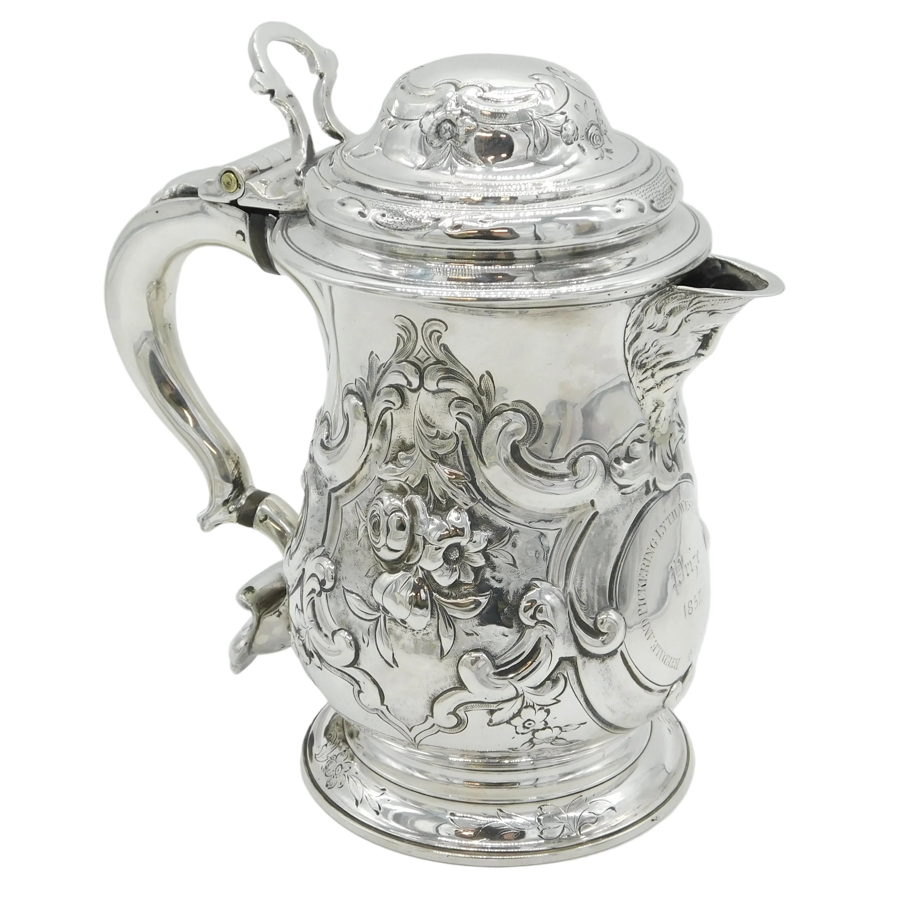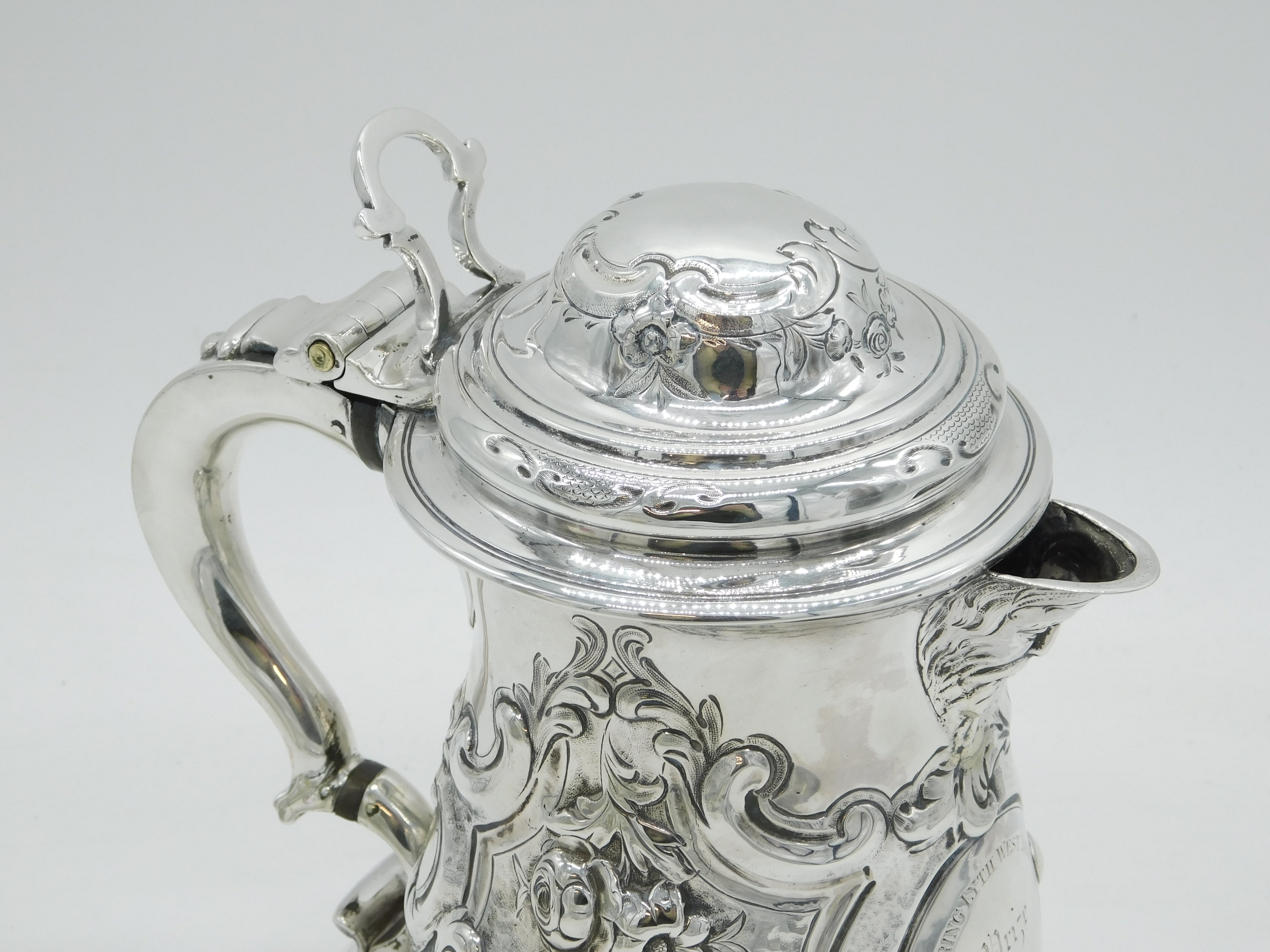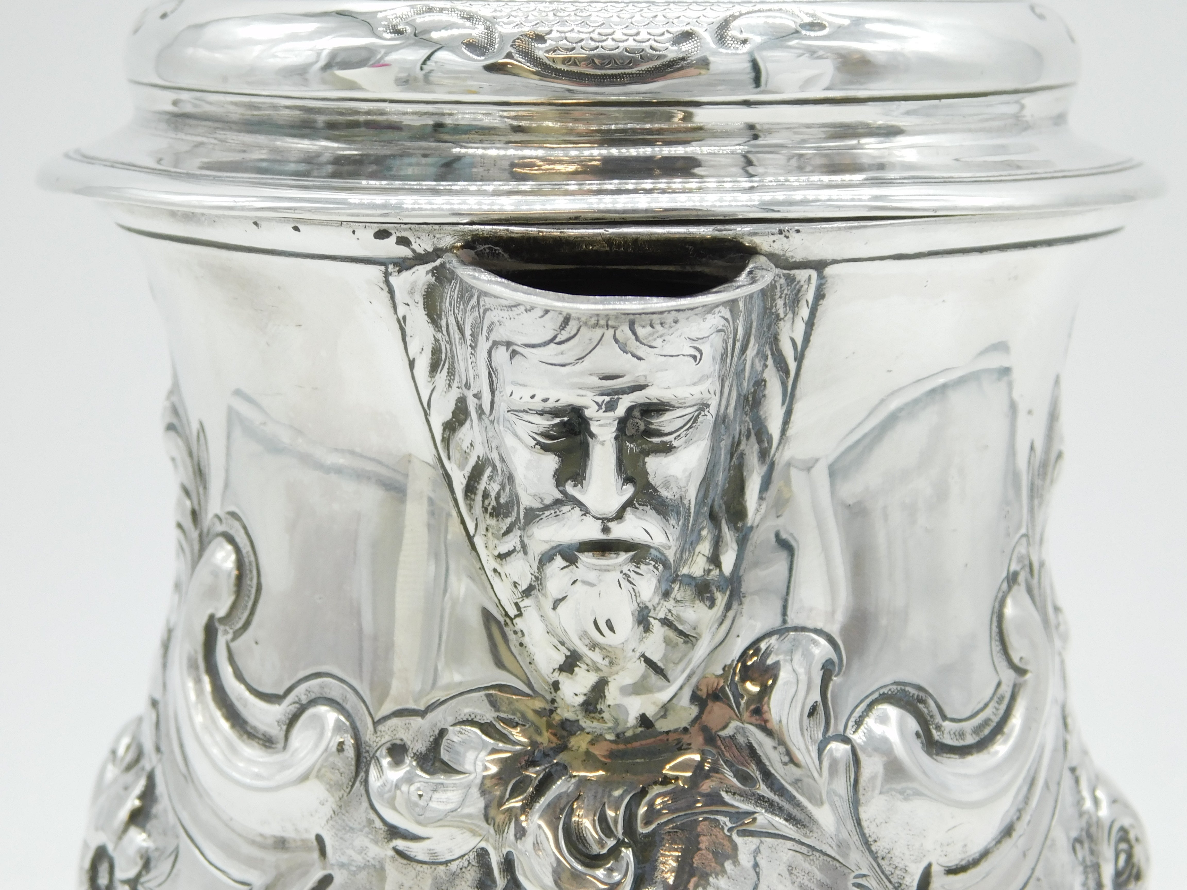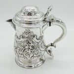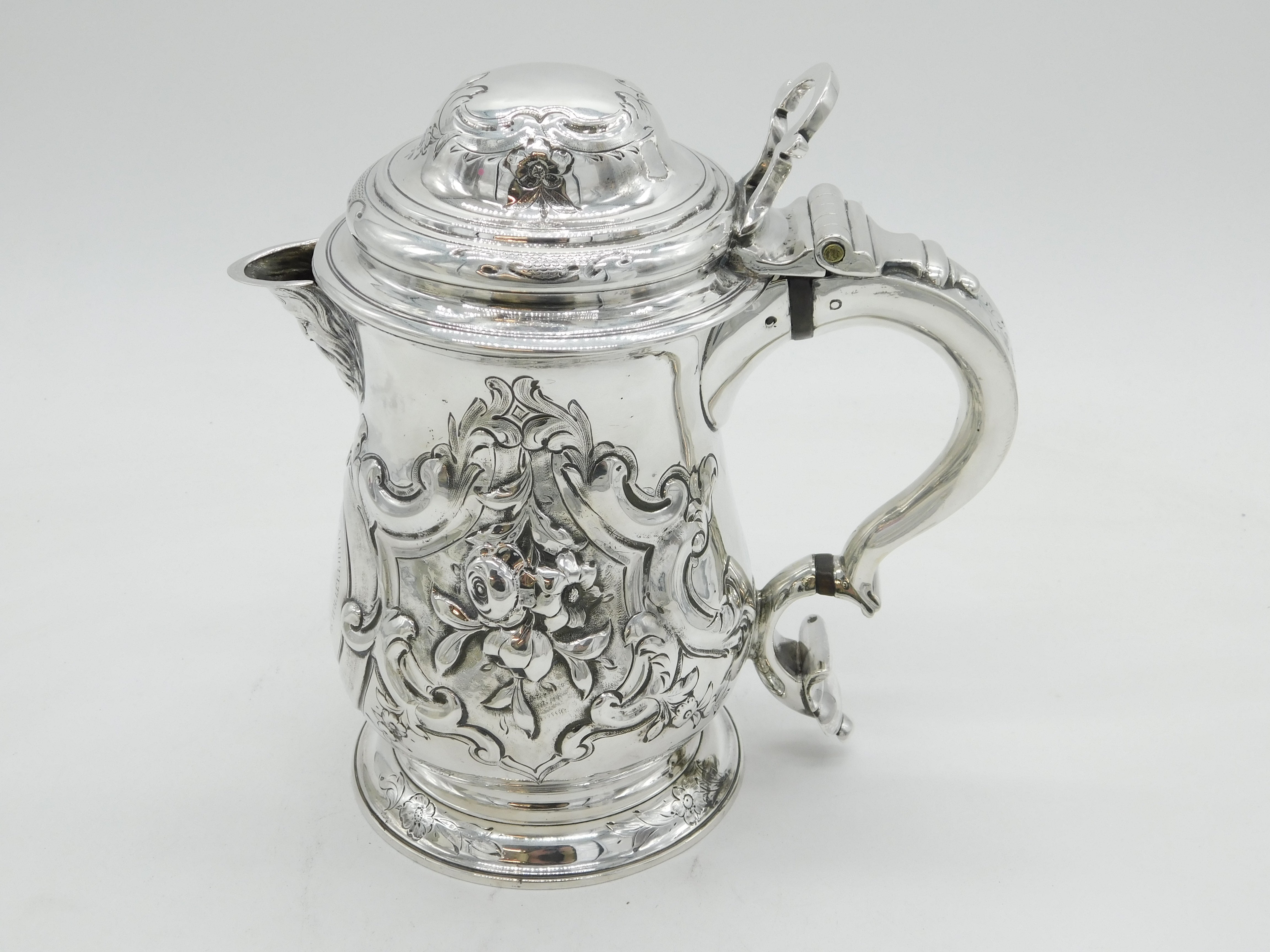 Details: A fantastic and wonderfully designed early-georgian large sterling silver baluster lidded tankard or stein with charming floral embossed decoration throughout, cast scrolled handle and bacchus figural spout. Beautifully gilded to the interior and hallmarked to both the base and the lid for London 1758 by John Harvey I. Later Victorian engraving to the cartouche related to an agricultural prize however this could be removed. Holds approximately 600-750 ml of liquid and presents in excellent condition - wooden spacers to the handle. This is a wonderful item that would make a perfect gift or addition to any collection. We are more than happy to provide XRF reports for items upon request.
