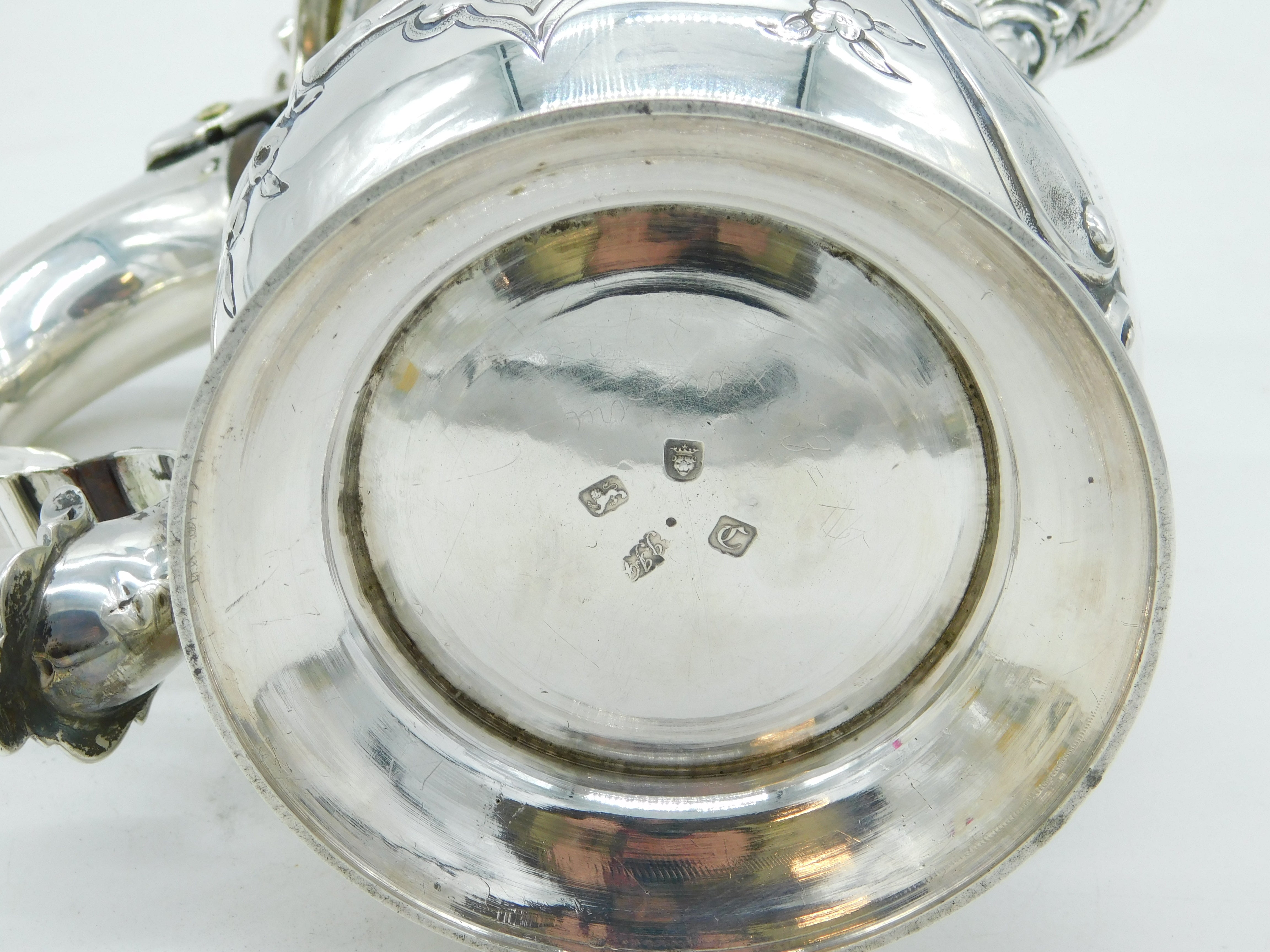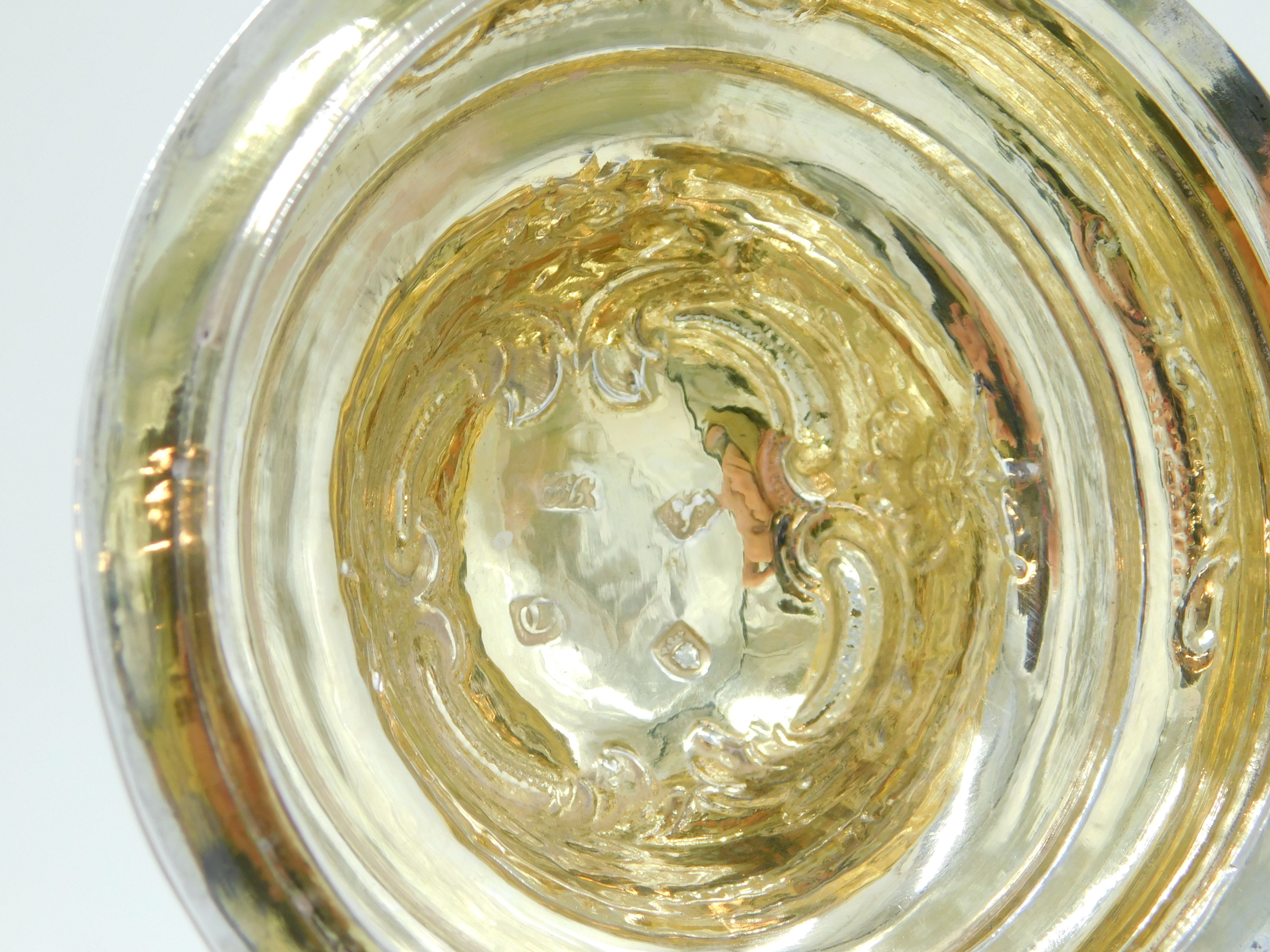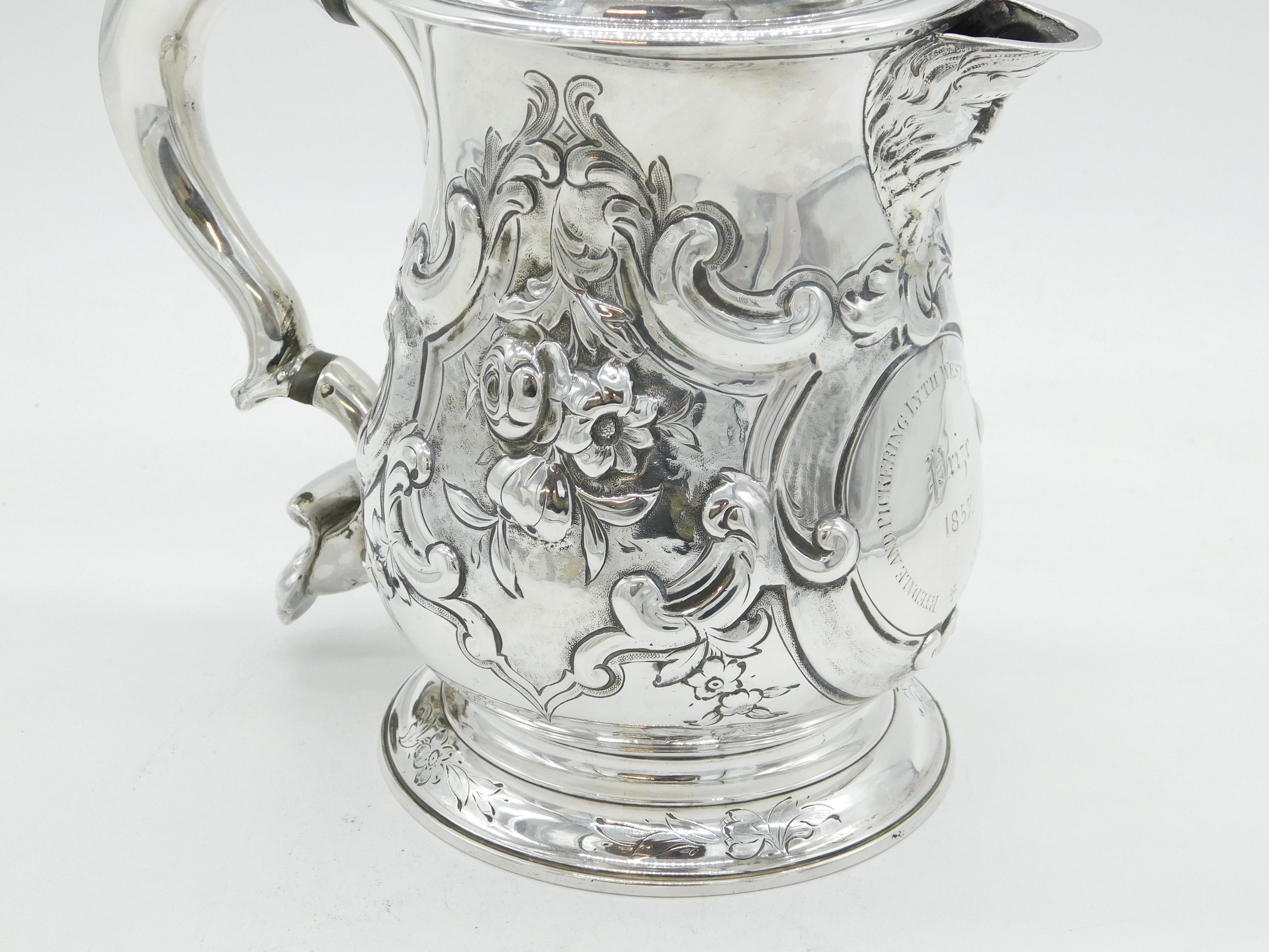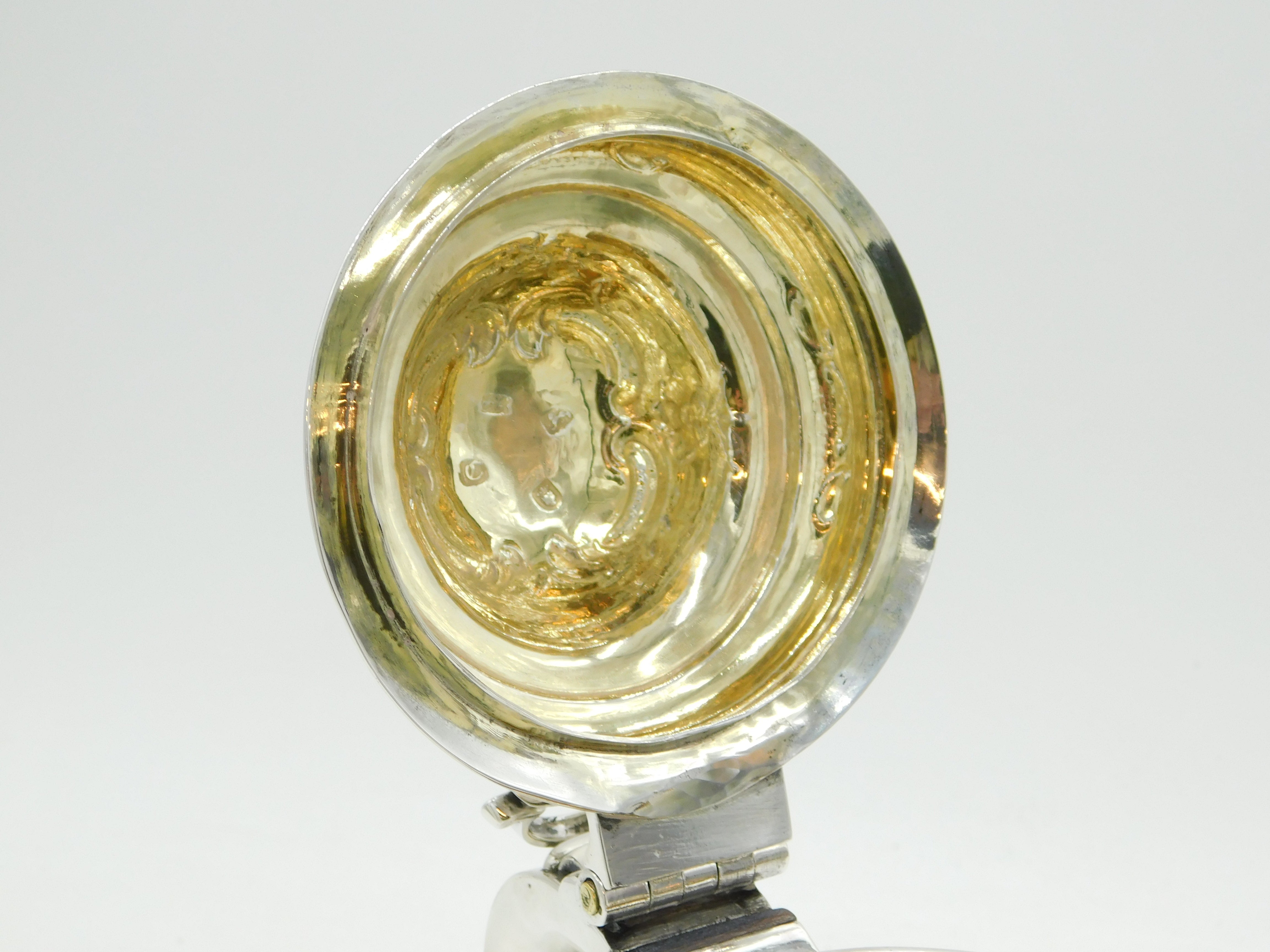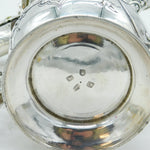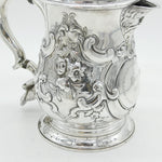Details: A fantastic and wonderfully designed early-georgian large sterling silver baluster lidded tankard or stein with charming floral embossed decoration throughout, cast scrolled handle and bacchus figural spout. Beautifully gilded to the interior and hallmarked to both the base and the lid for London 1758 by John Harvey I. Later Victorian engraving to the cartouche related to an agricultural prize however this could be removed. Holds approximately 600-750 ml of liquid and presents in excellent condition - wooden spacers to the handle. This is a wonderful item that would make a perfect gift or addition to any collection. We are more than happy to provide XRF reports for items upon request.
