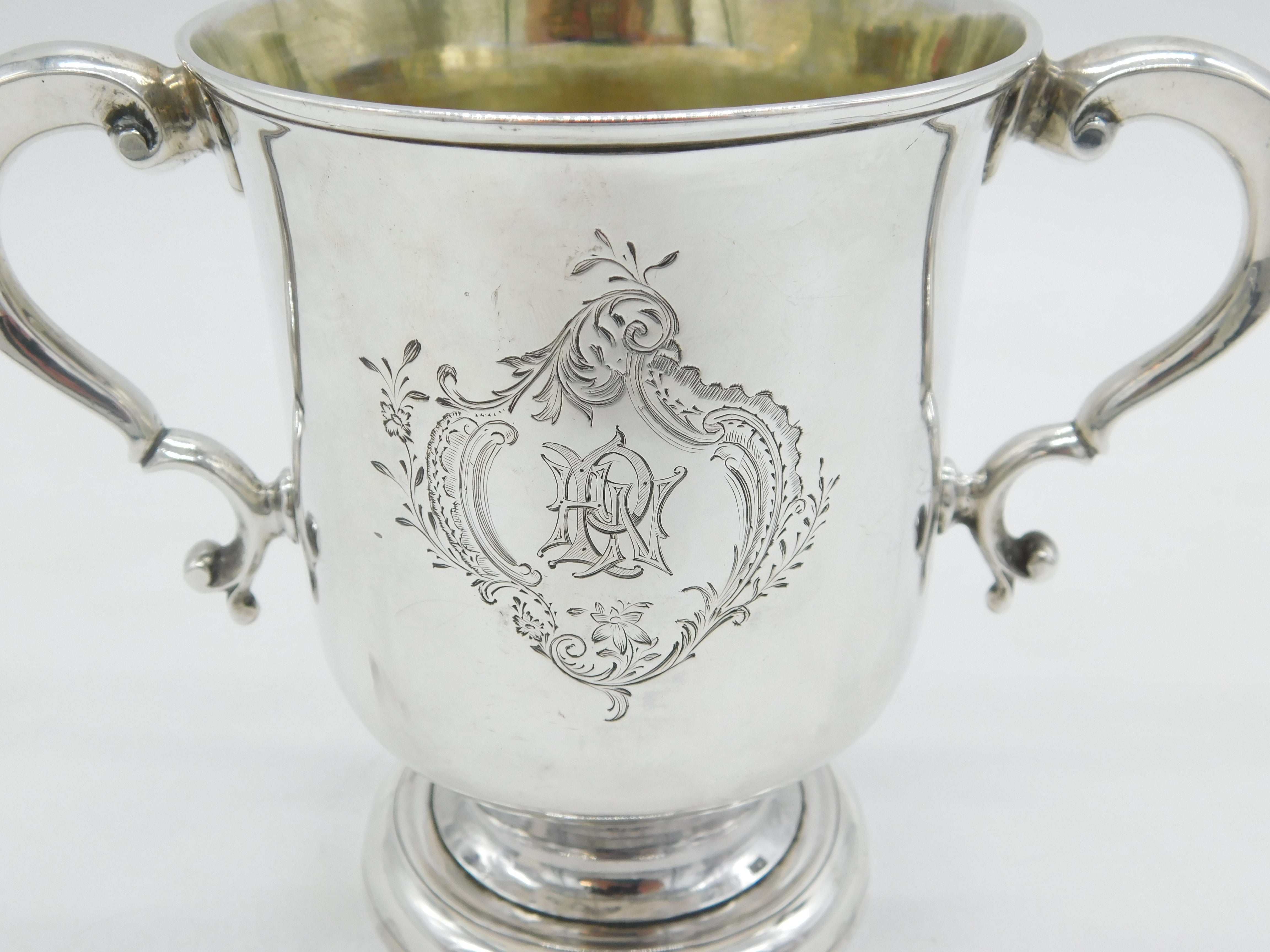 Details: A fantastic and wonderfully designed antique early-georgian sterling silver loving cup or trophy cup with charming detailing throughout, beautifully hallmarked to the base for London 1760 by John Moore. This is a wonderful item that would make a perfect gift or addition to any collection.