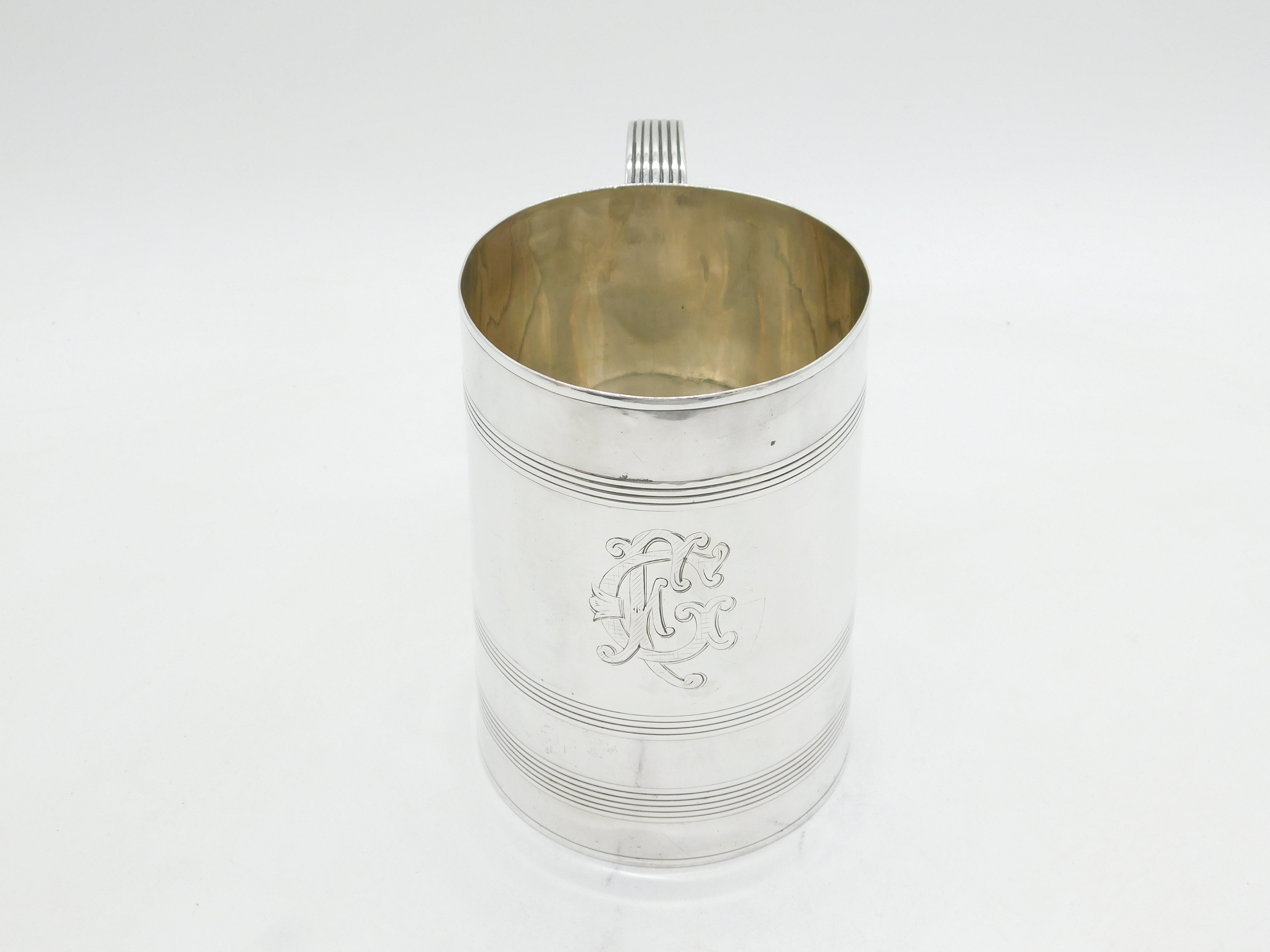 Details: A fantastic and wonderfully designed antique late-Georgian sterling silver large quart tankard mug with lined patterns and floral decoration to the handles faintly hallmarked to the top edge, London 1795 with rubbed makers marks. Lovely size and monogram to the front. This is a wonderful item that would make a perfect gift or addition to any collection.
