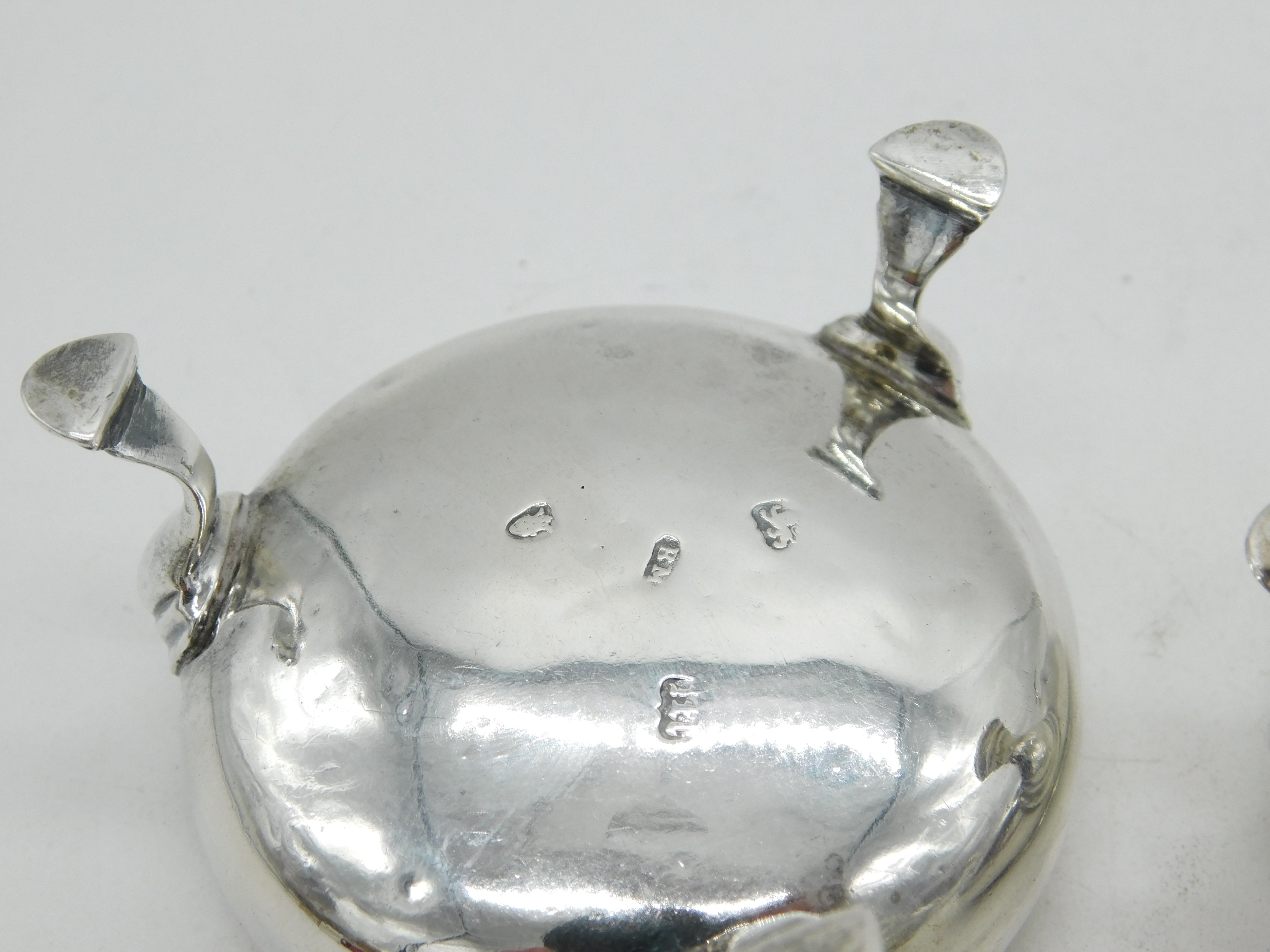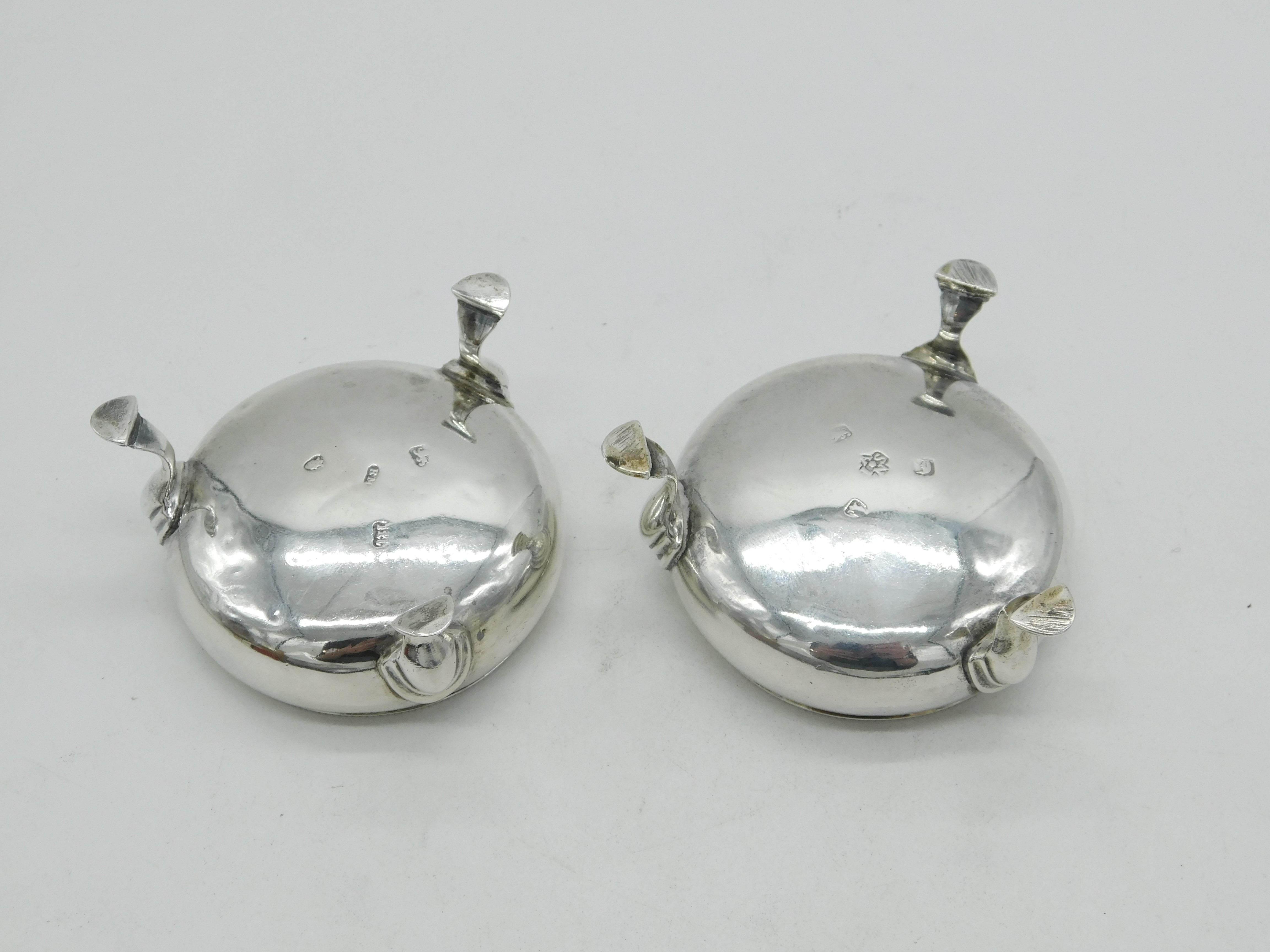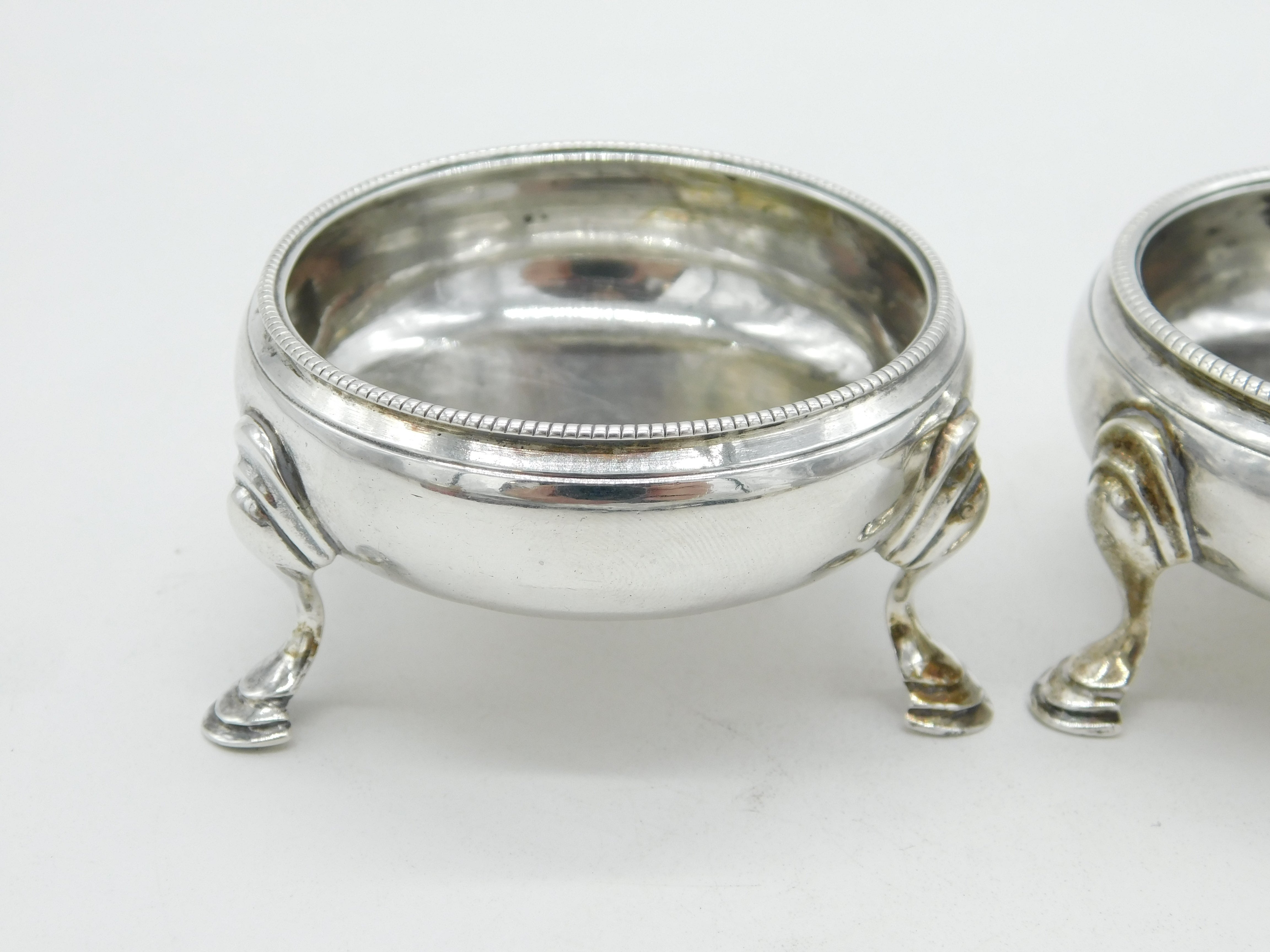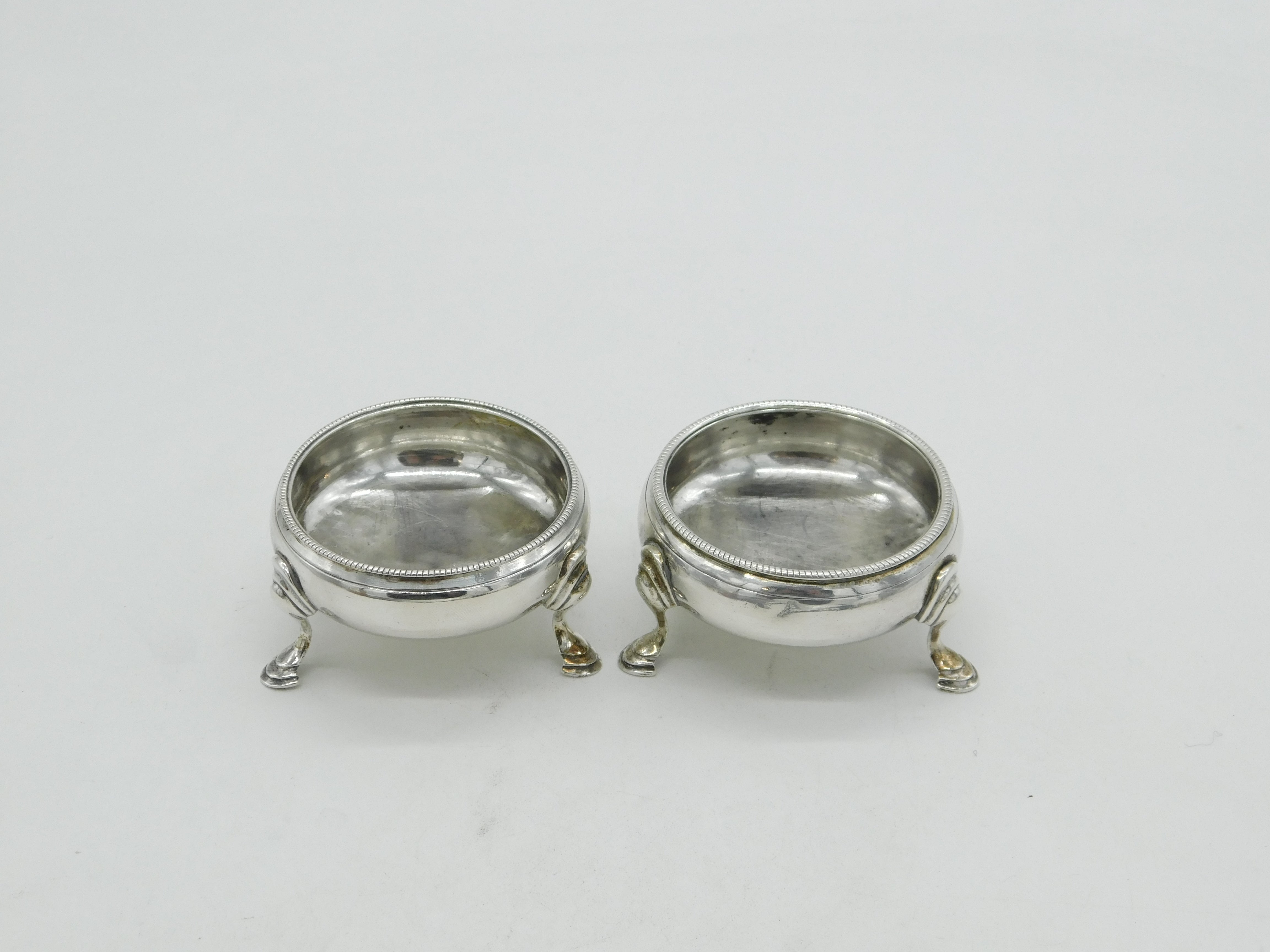 Details: A fantastic and wonderfully designed antique early georgian sterling silver matched pair of paw foot salt cellars hallmarked London 1764 and 1767 to the base with differing makers marks. This is a wonderful item that would make a perfect gift or addition to any collection. The BOX pictured is for PRESENTATION ONLY and is NOT included in the listings but used to frame the pictures unless specifically stated otherwise.