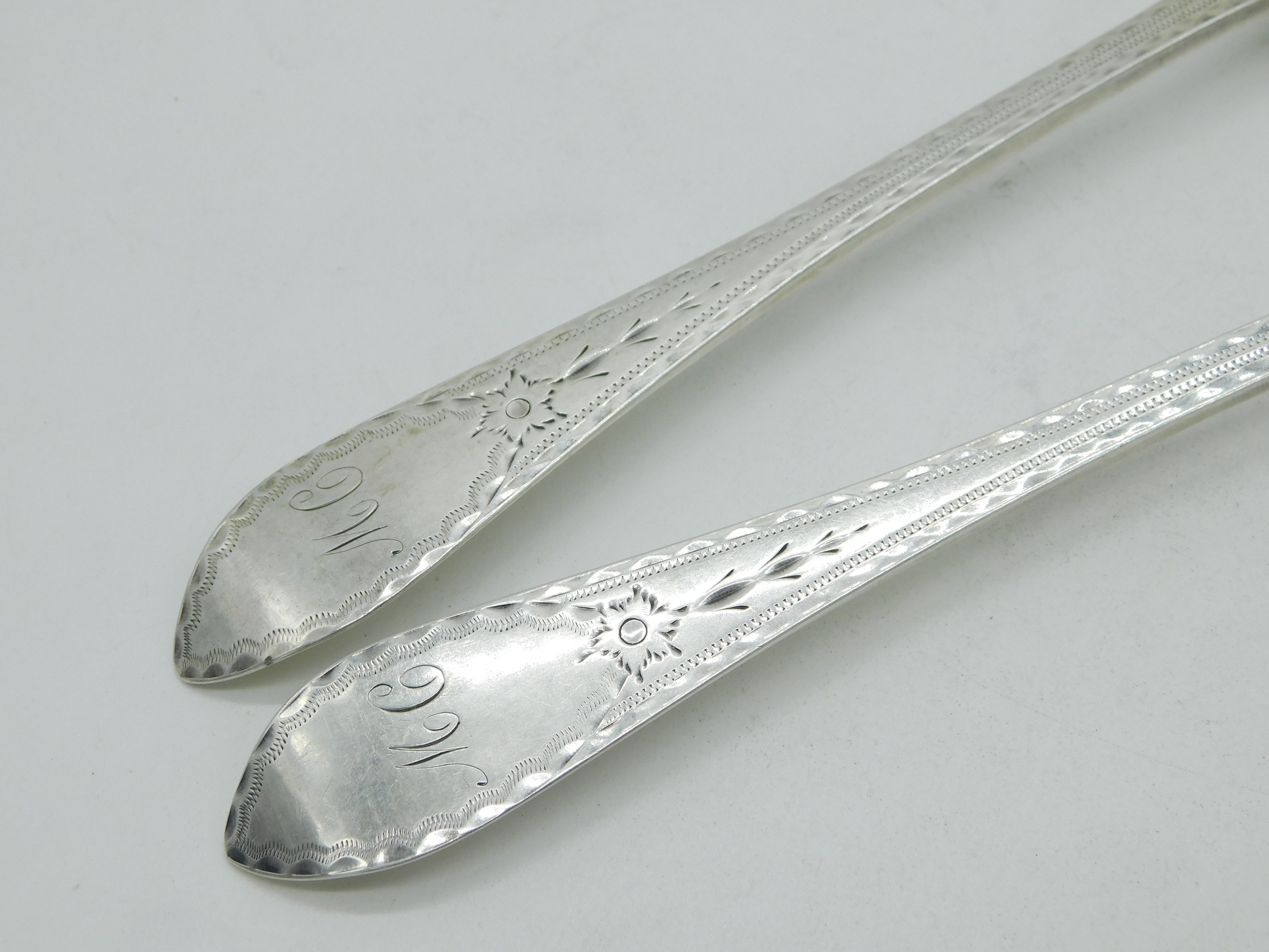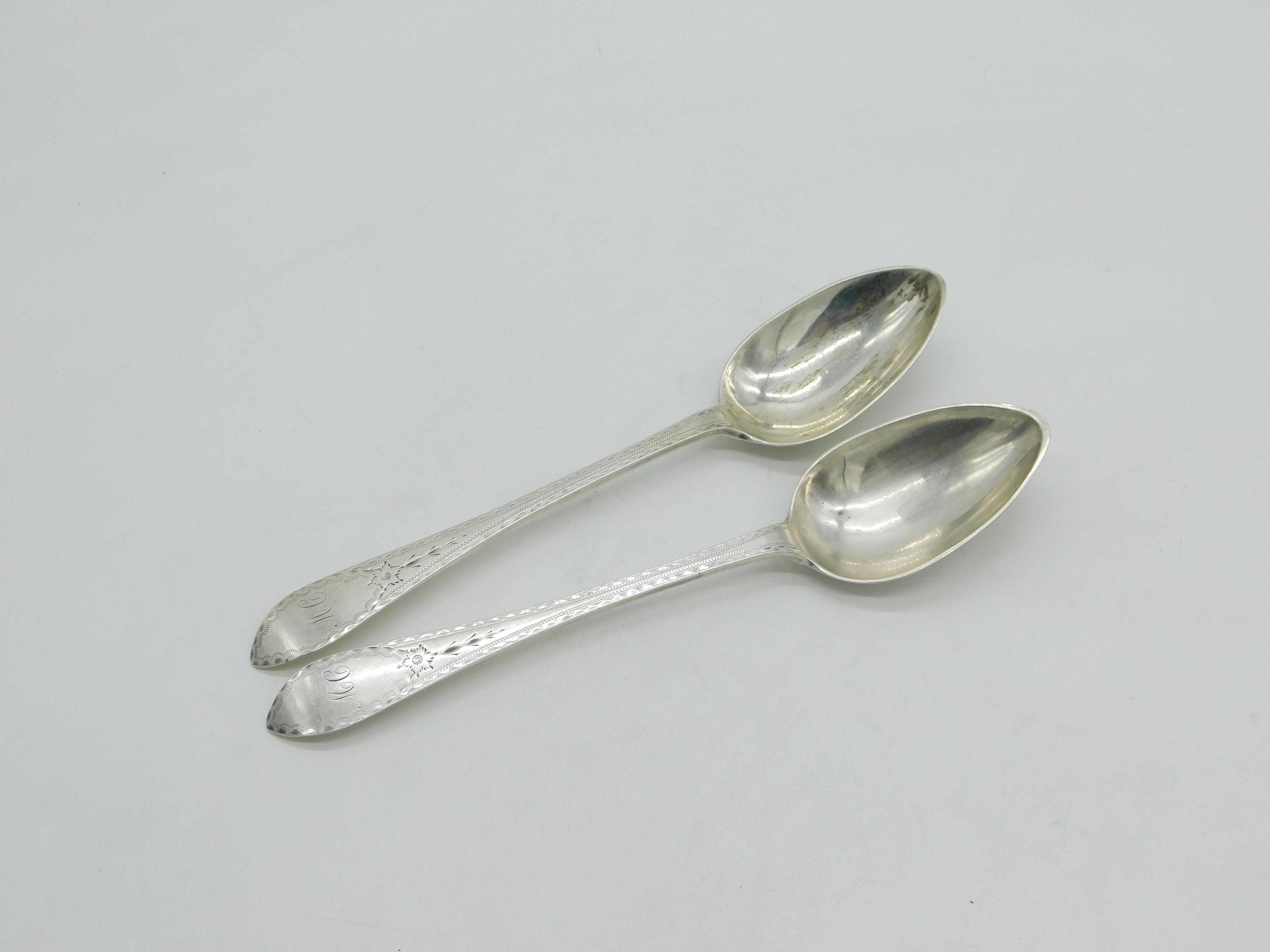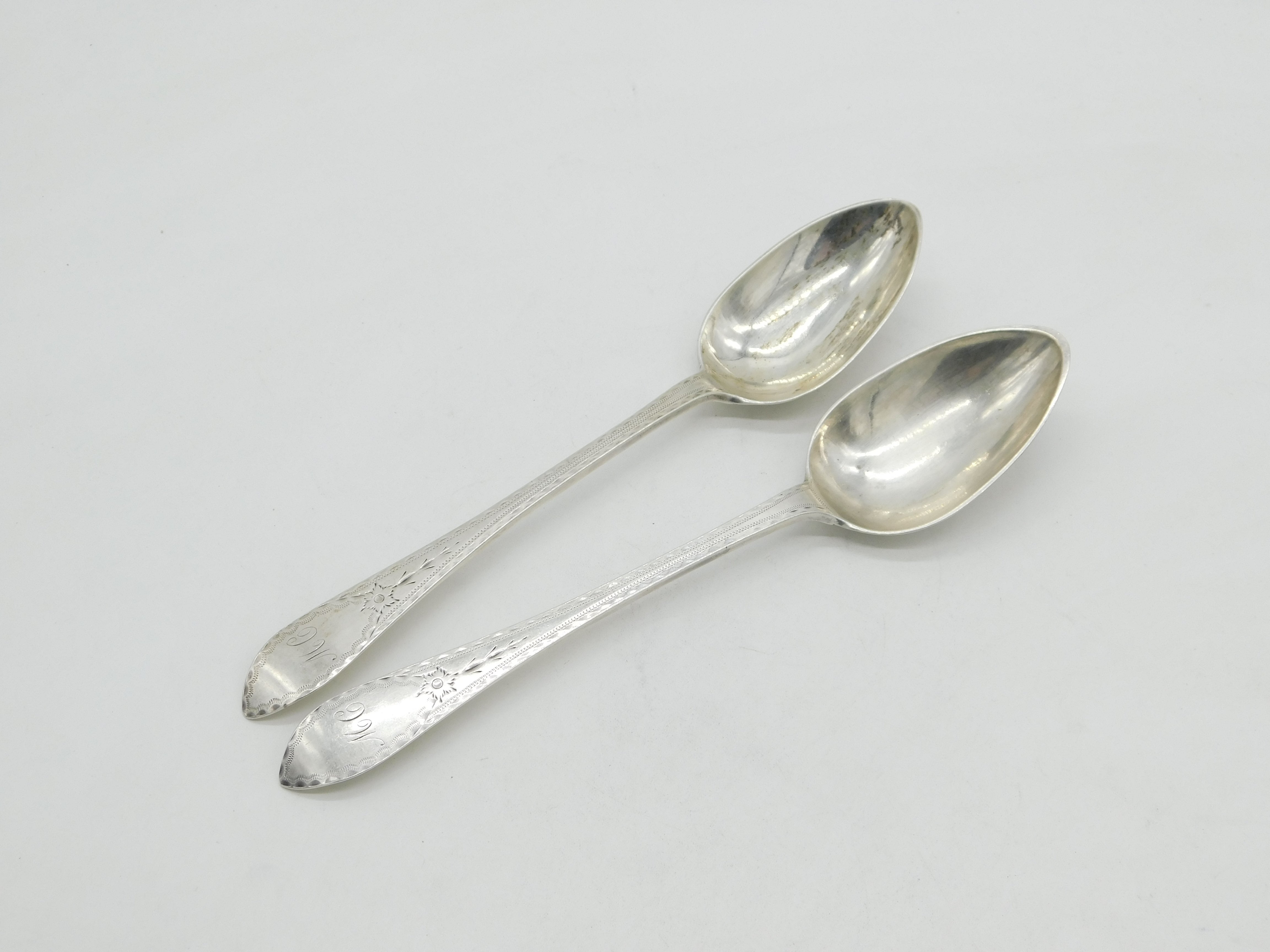 Details: A fantastic and wonderfully designed antique Scottish georgian sterling silver bright cut celtic point serving spoons hallmarked Edinburgh 1790 by Alexander Spence. This is a wonderful item that would make a perfect gift or addition to any collection. The BOX pictured is for PRESENTATION ONLY and is NOT included in the listings but used to frame the pictures unless specifically stated otherwise.
