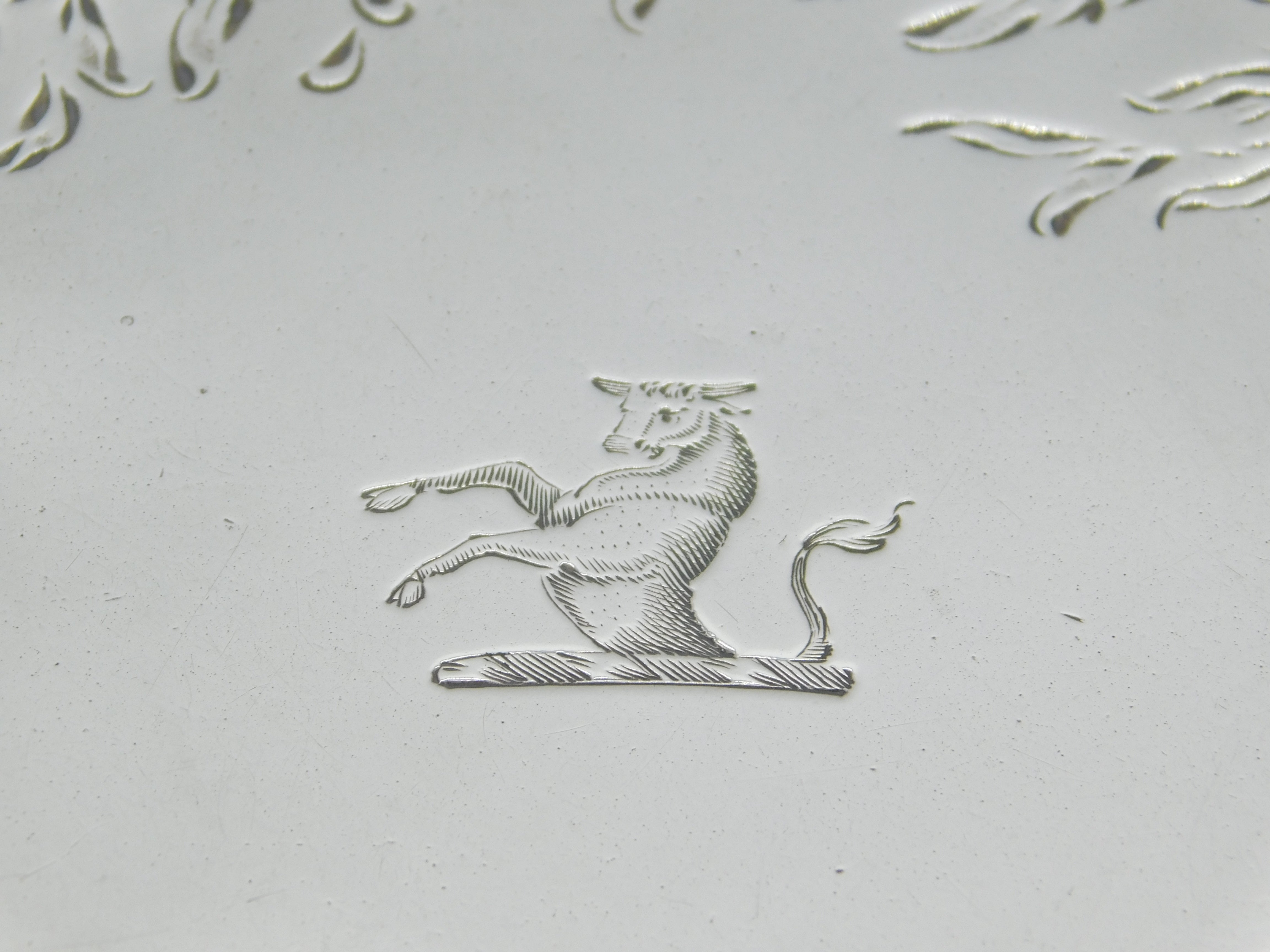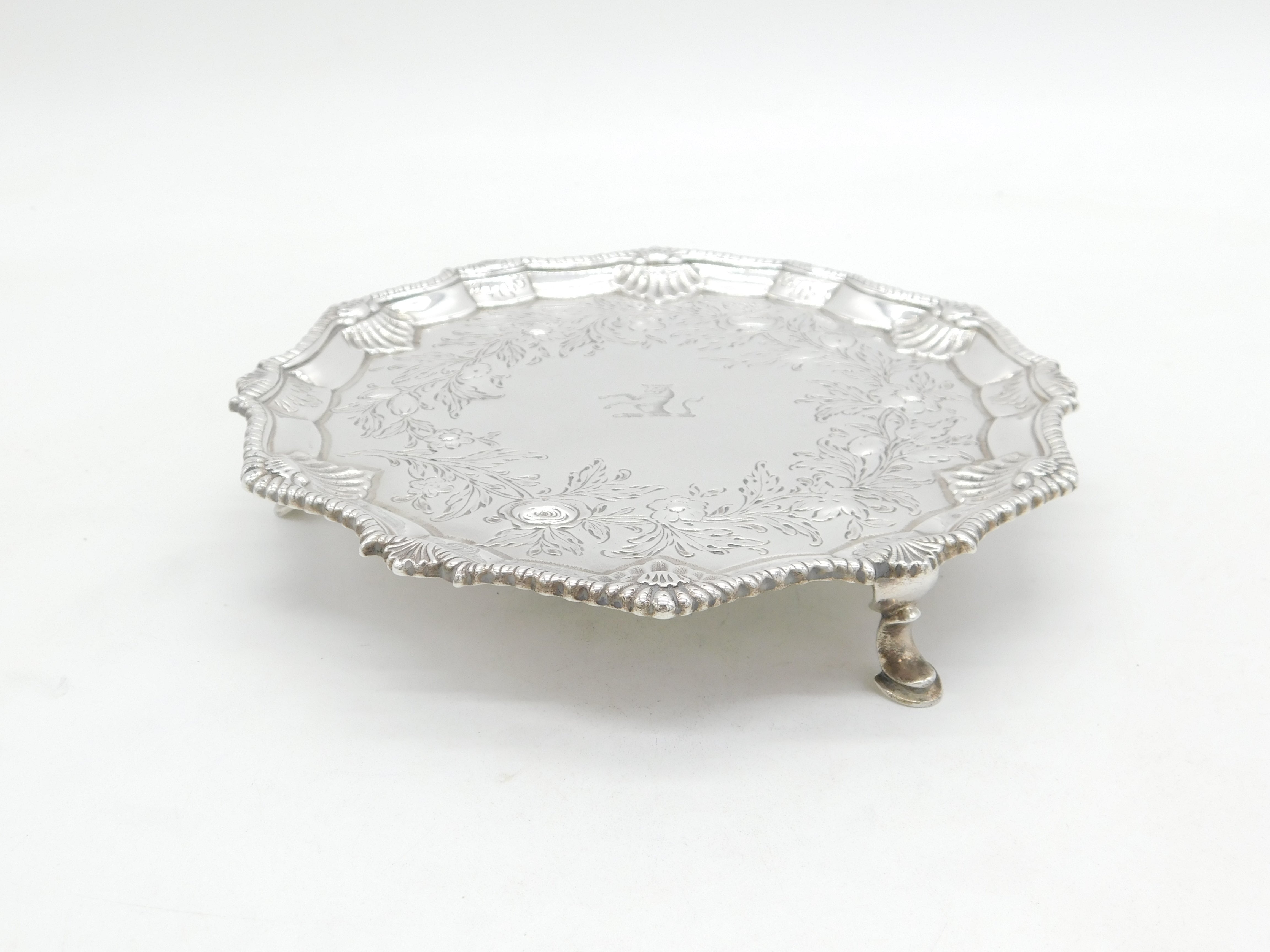 George III Sterling Silver Floral Pattern Cow Crest Salver Antique 1764 London