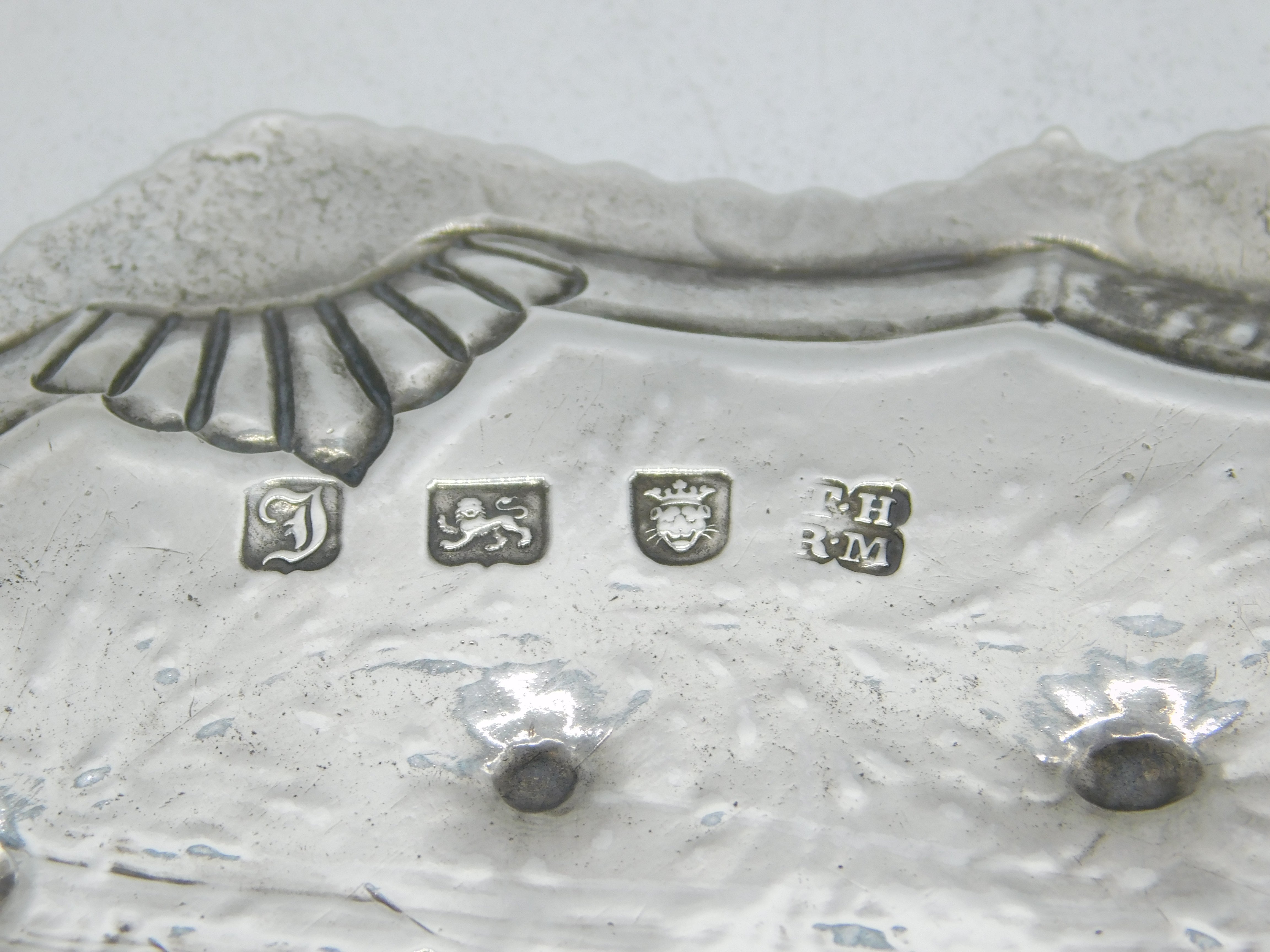 Details: A fantastic and wonderfully designed antique georgian sterling silver floral raised decoration salver dish on hoof feet with cow crest to the central area hallmarked London 1764 by Thomas Hannam & Richard Mills. This is a wonderful item that would make a perfect gift or addition to any collection.