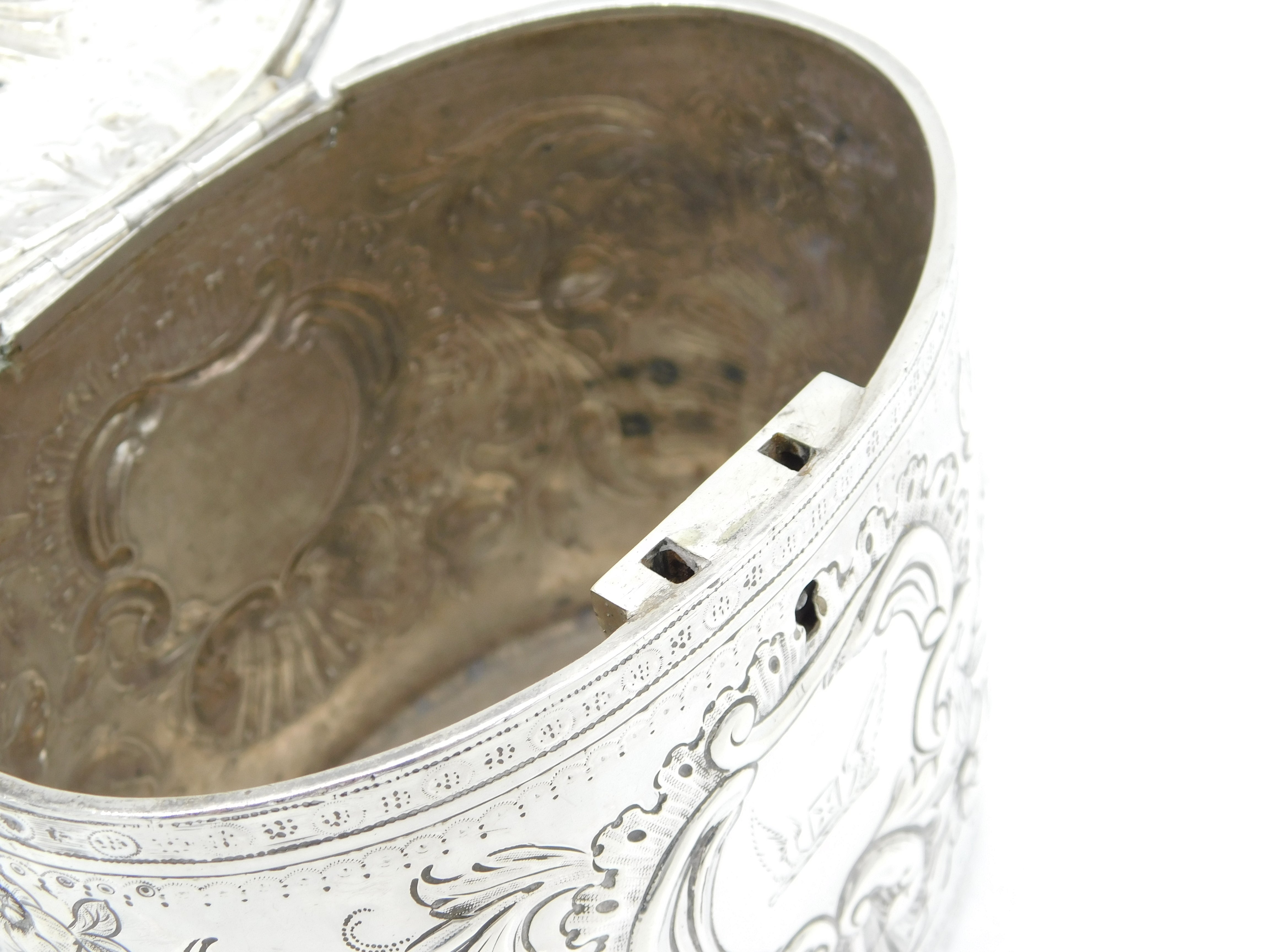 Details: A fantastic and wonderfully designed antique georgian sterling silver oval form tea caddy with wonderful floral decoration throughout, engraved with heraldic crest to the front and charming friendship inscription to the reverse, hallmarked London 1783 by Charles Aldridge & Henry Green. This is a wonderful item that would make a perfect gift or addition to any collection. We are more than happy to provide XRF reports for items upon request.