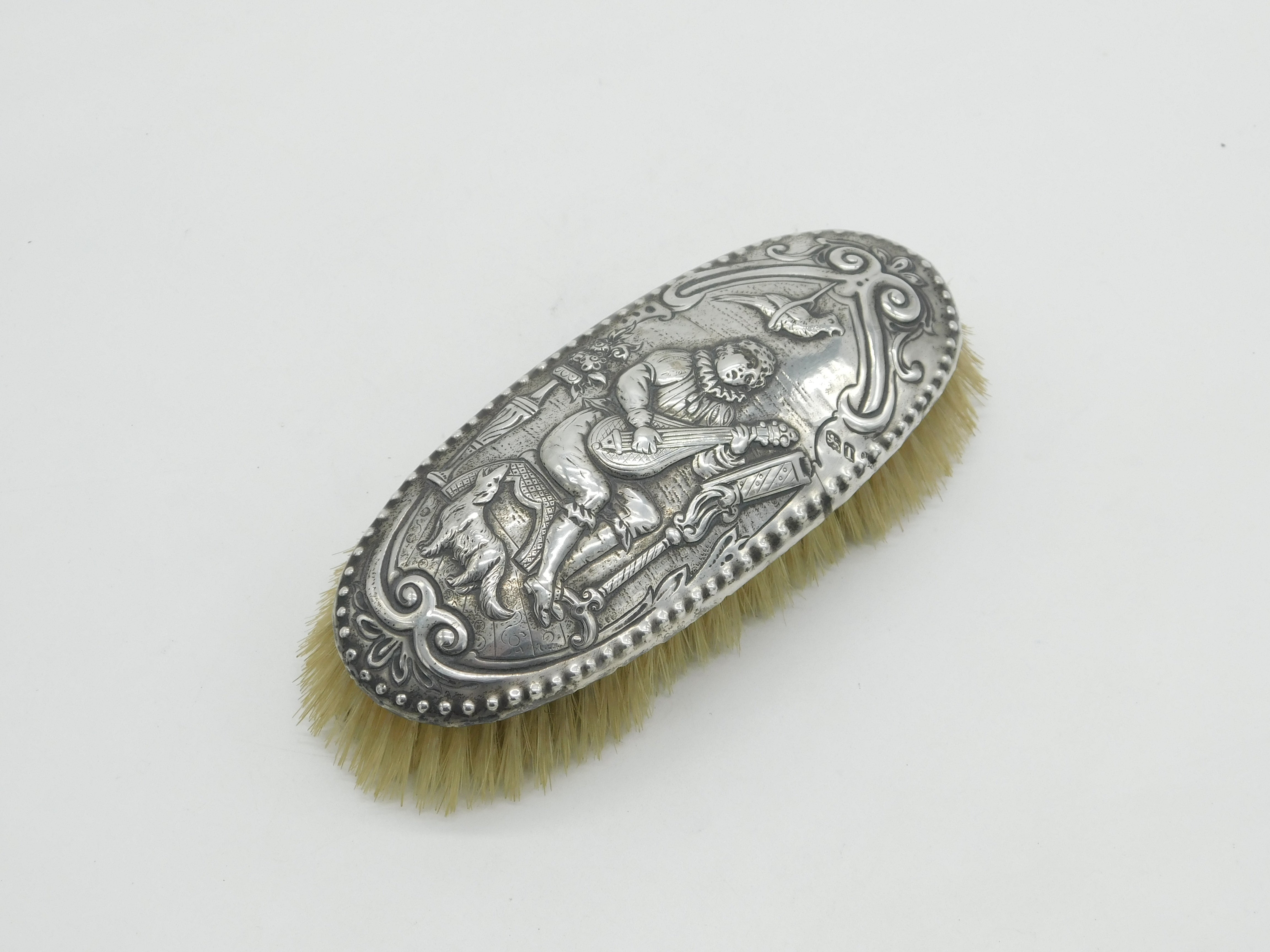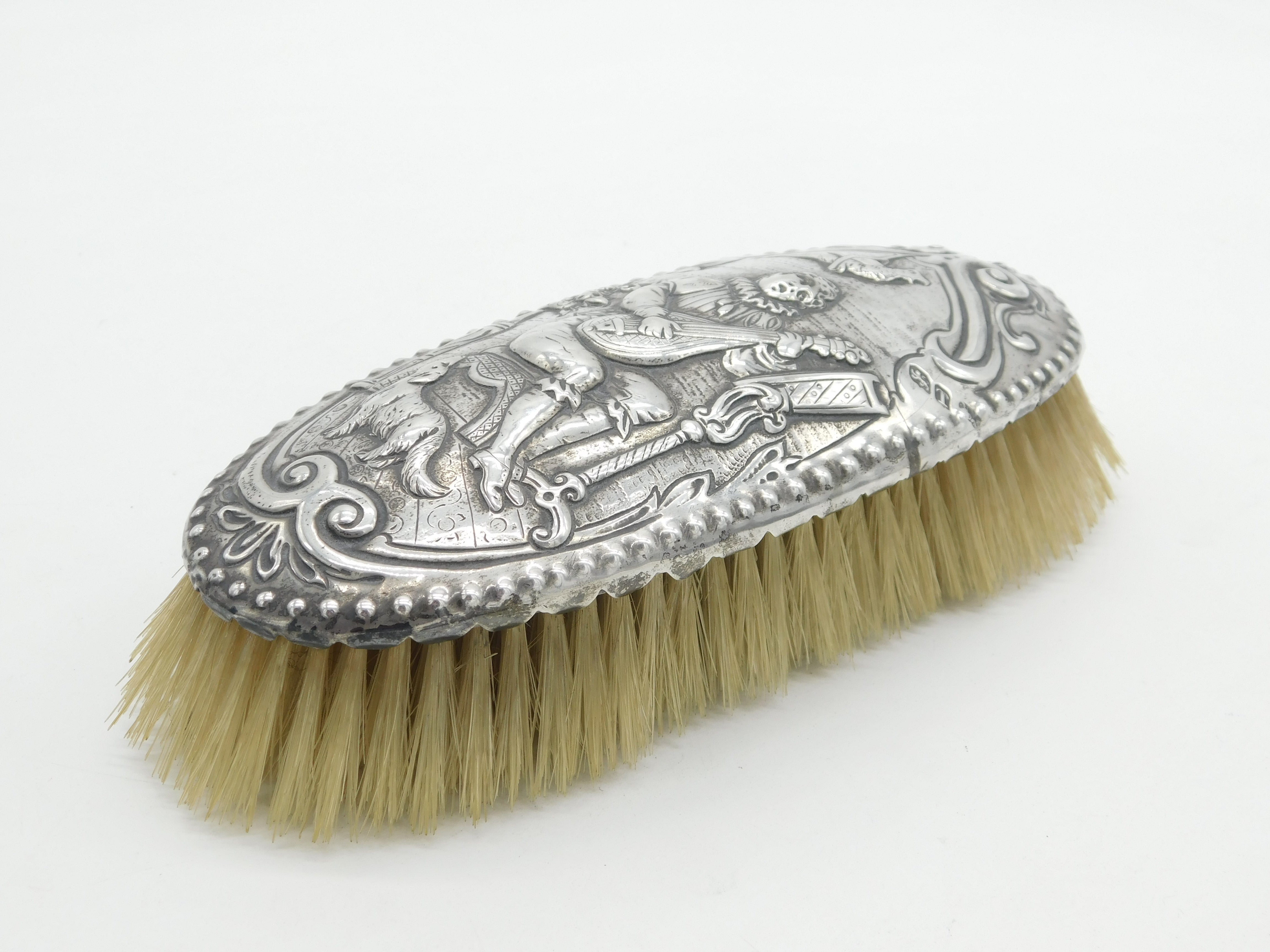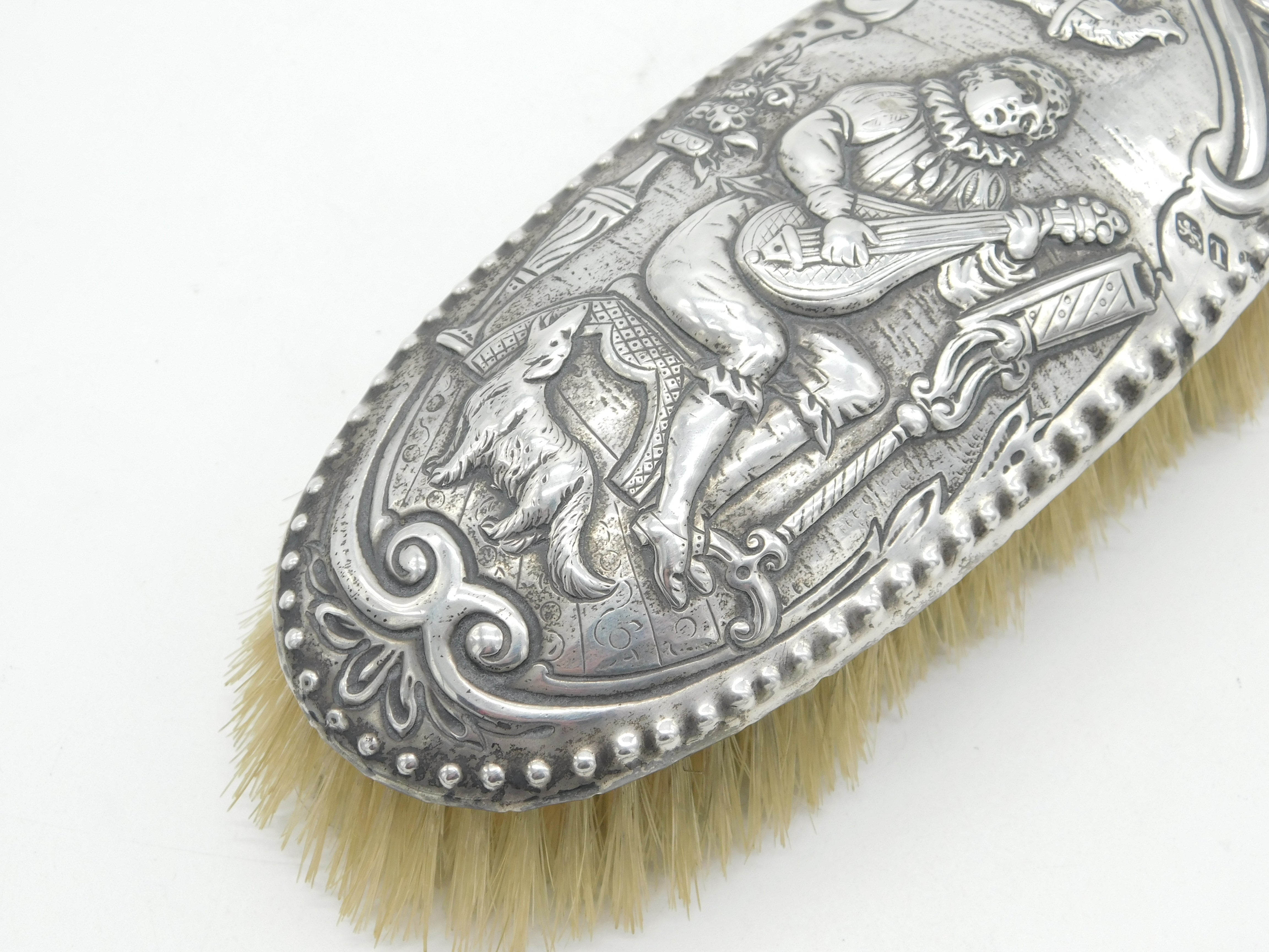 Details: A fantastic and wonderfully designed antique georgian sterling silver mounted hairbrush with lovely romantic lute player with little dog pattern to the top hallmarked London 1814 by Thomas Robins. This is a wonderful item that would make a perfect gift or addition to any collection. The BOX pictured is for PRESENTATION ONLY and is NOT included in the listings but used to frame the pictures unless specifically stated otherwise.