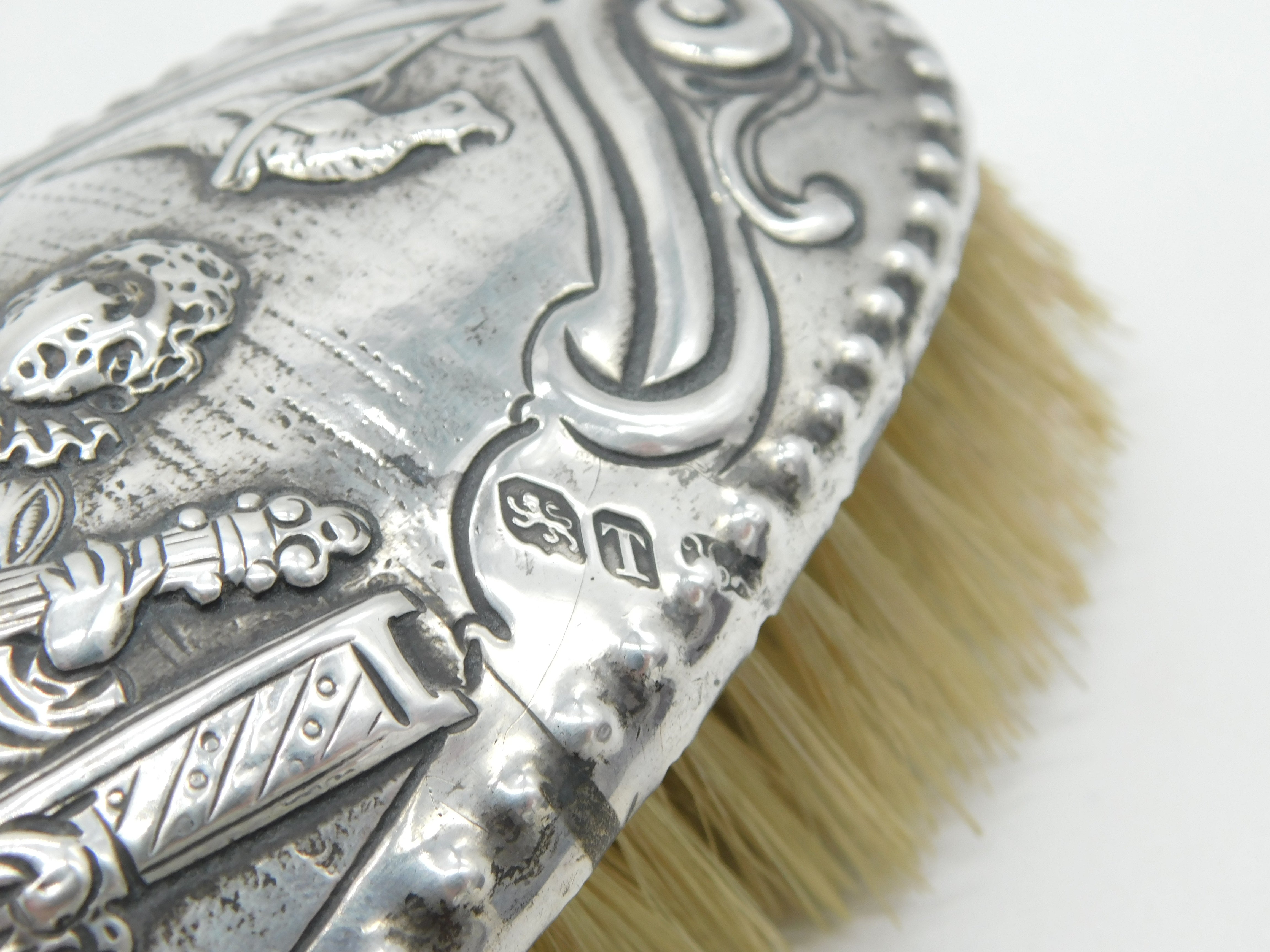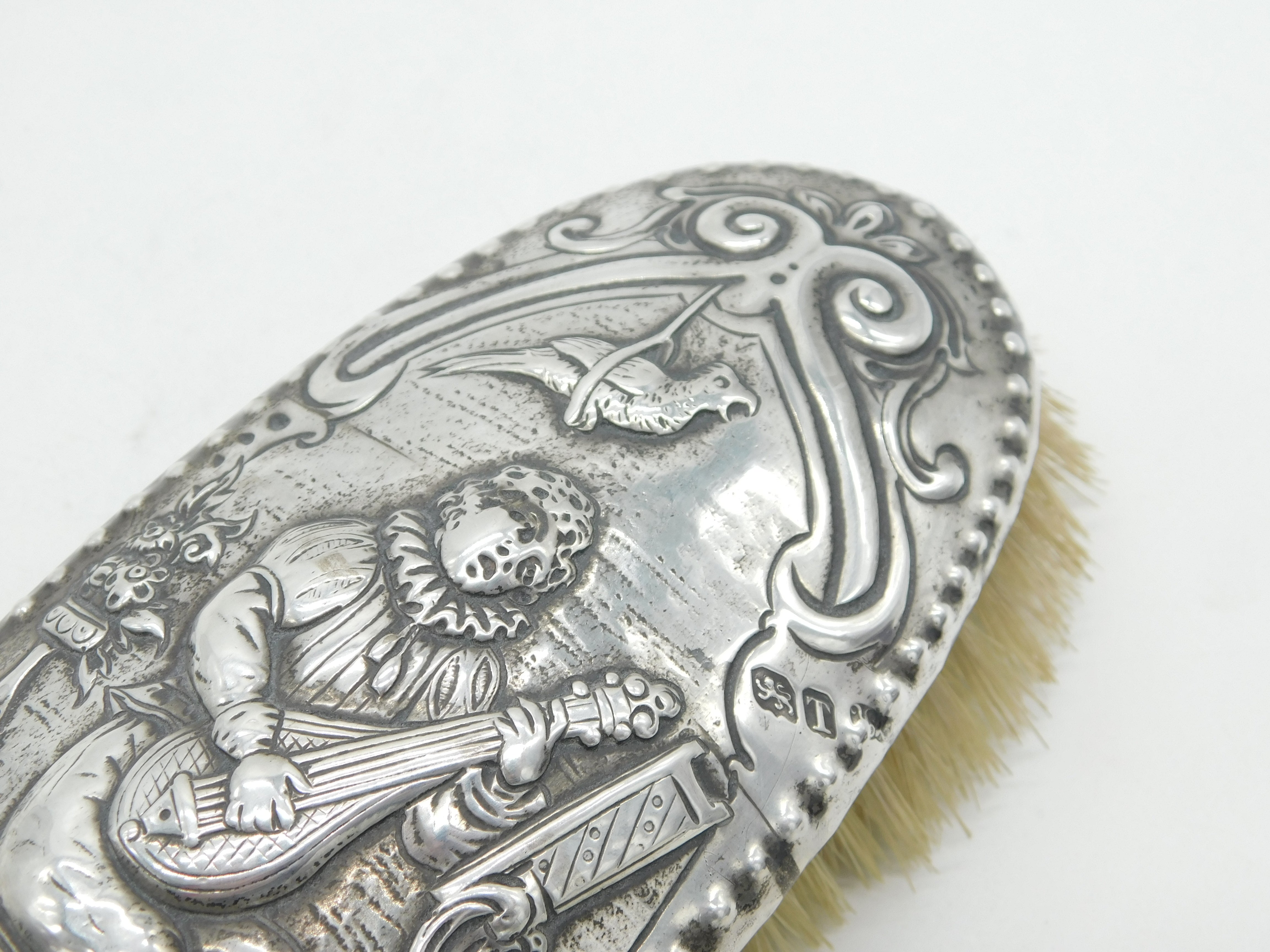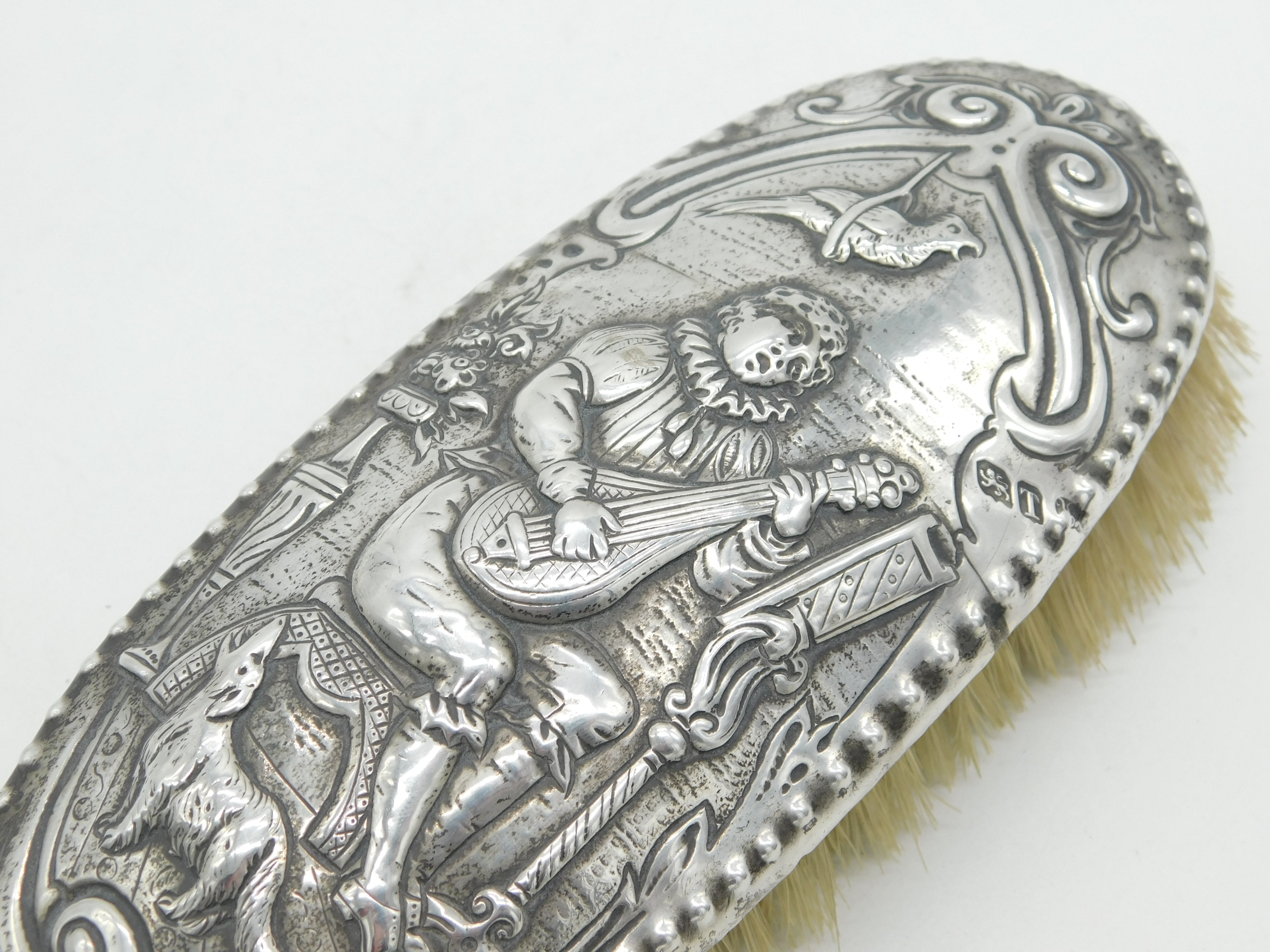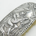 Details: A fantastic and wonderfully designed antique georgian sterling silver mounted hairbrush with lovely romantic lute player with little dog pattern to the top hallmarked London 1814 by Thomas Robins. This is a wonderful item that would make a perfect gift or addition to any collection. The BOX pictured is for PRESENTATION ONLY and is NOT included in the listings but used to frame the pictures unless specifically stated otherwise.
