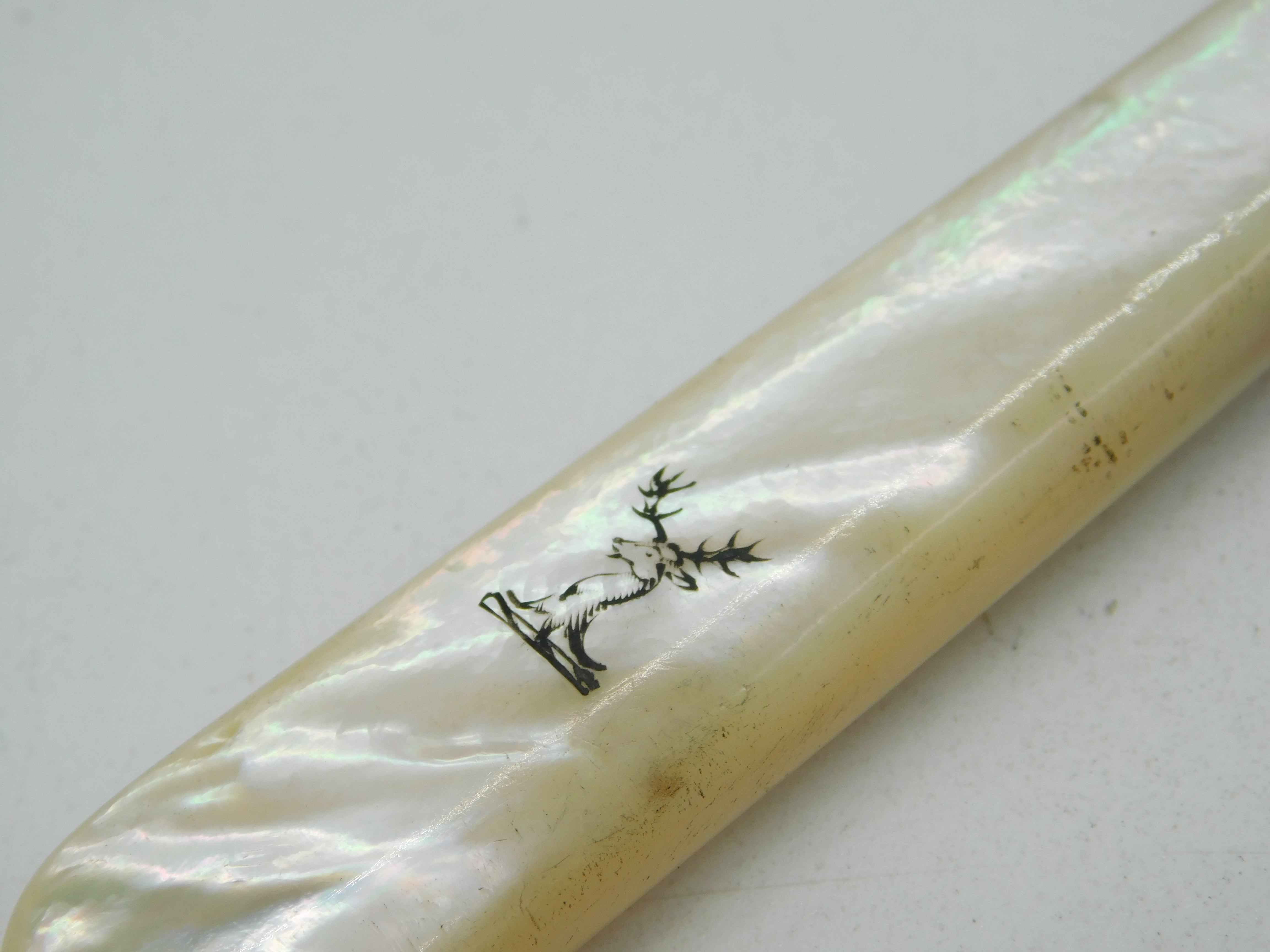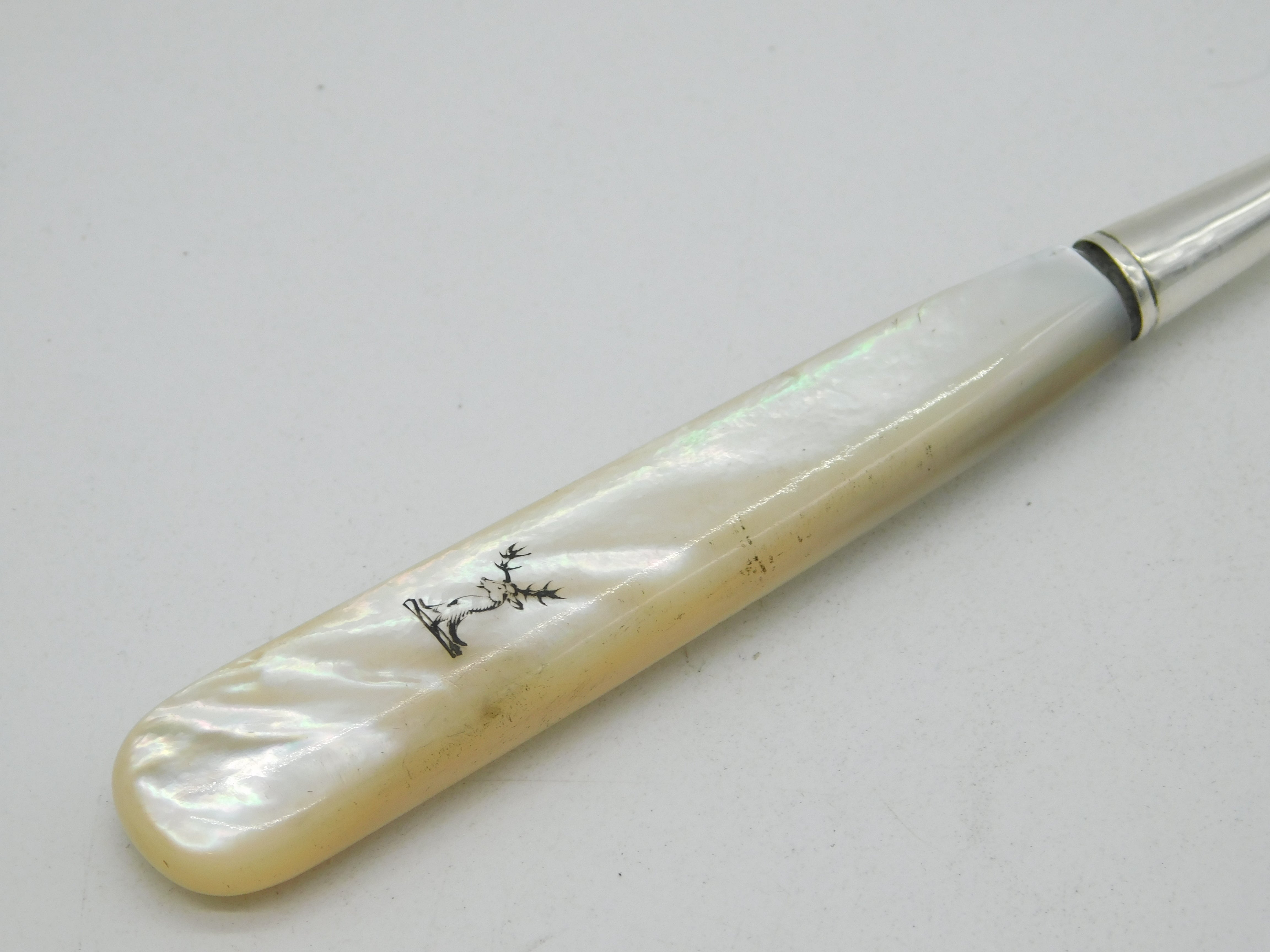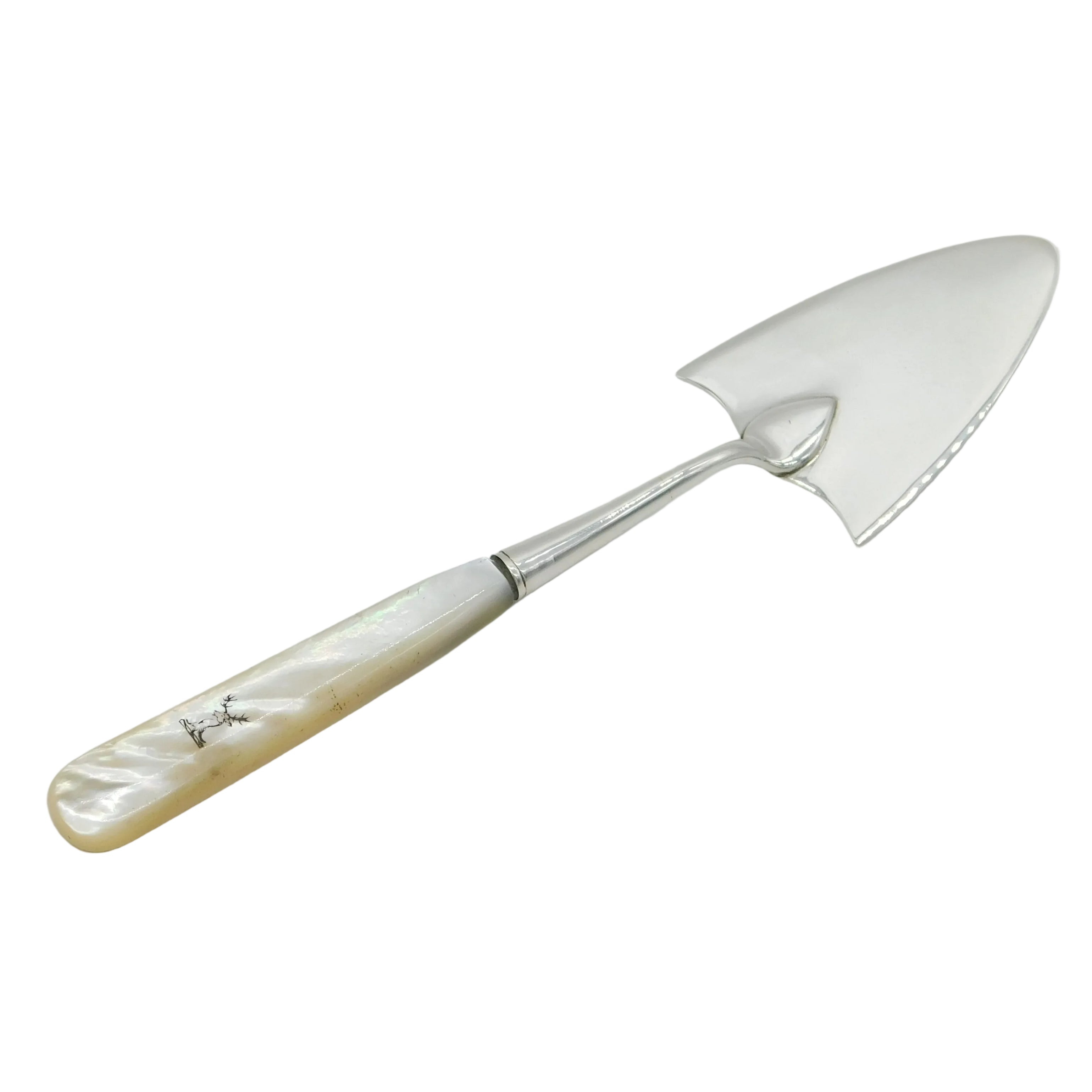 Details: A fantastic and wonderfully designed antique georgian sterling silver cake server with applied mother of pearl handle adorned with stag heraldic crest, hallmarked London 1788 by Richard Evans. This is a wonderful item that would make a perfect gift or addition to any collection. We are more than happy to provide XRF reports for items upon request.