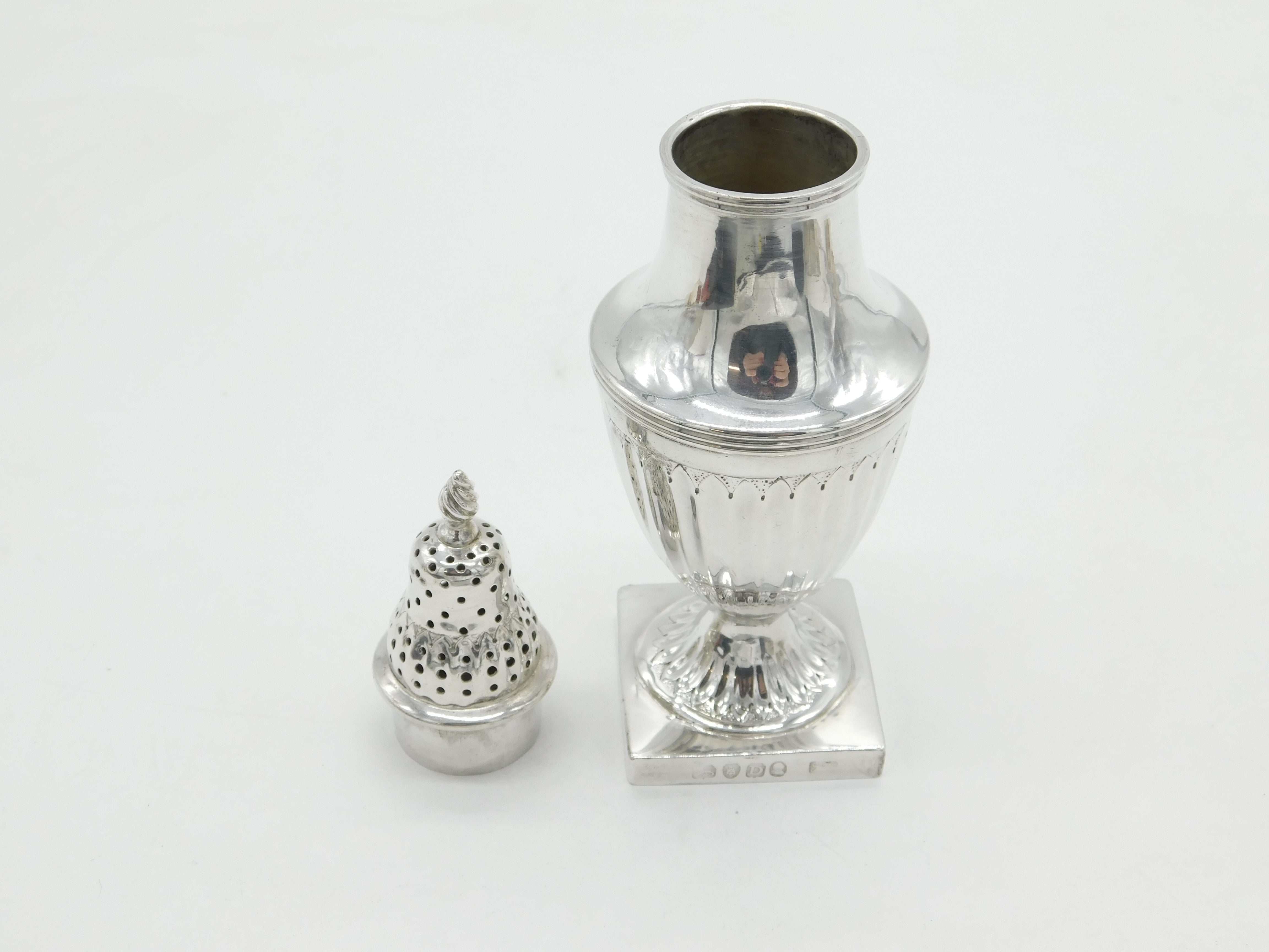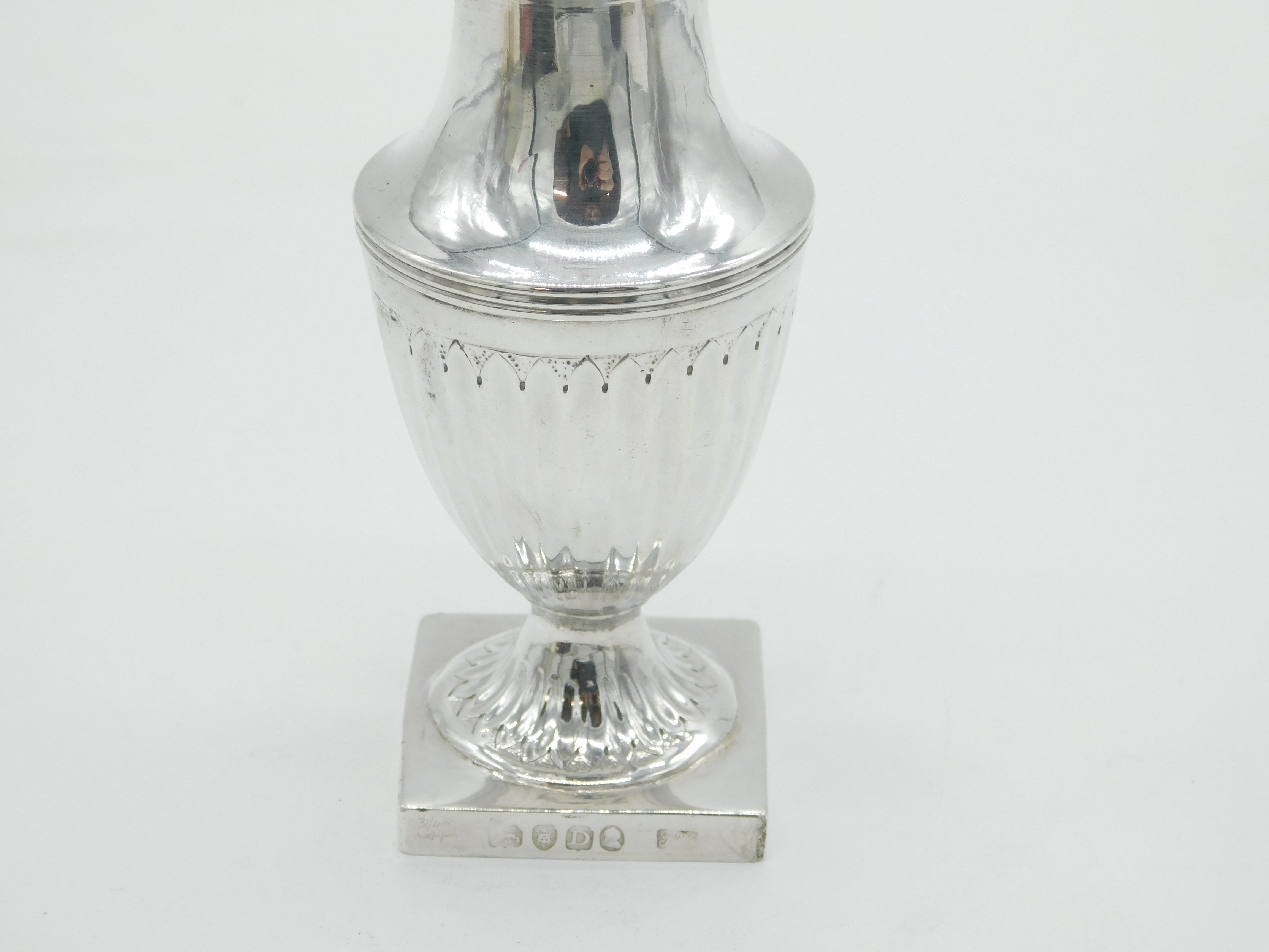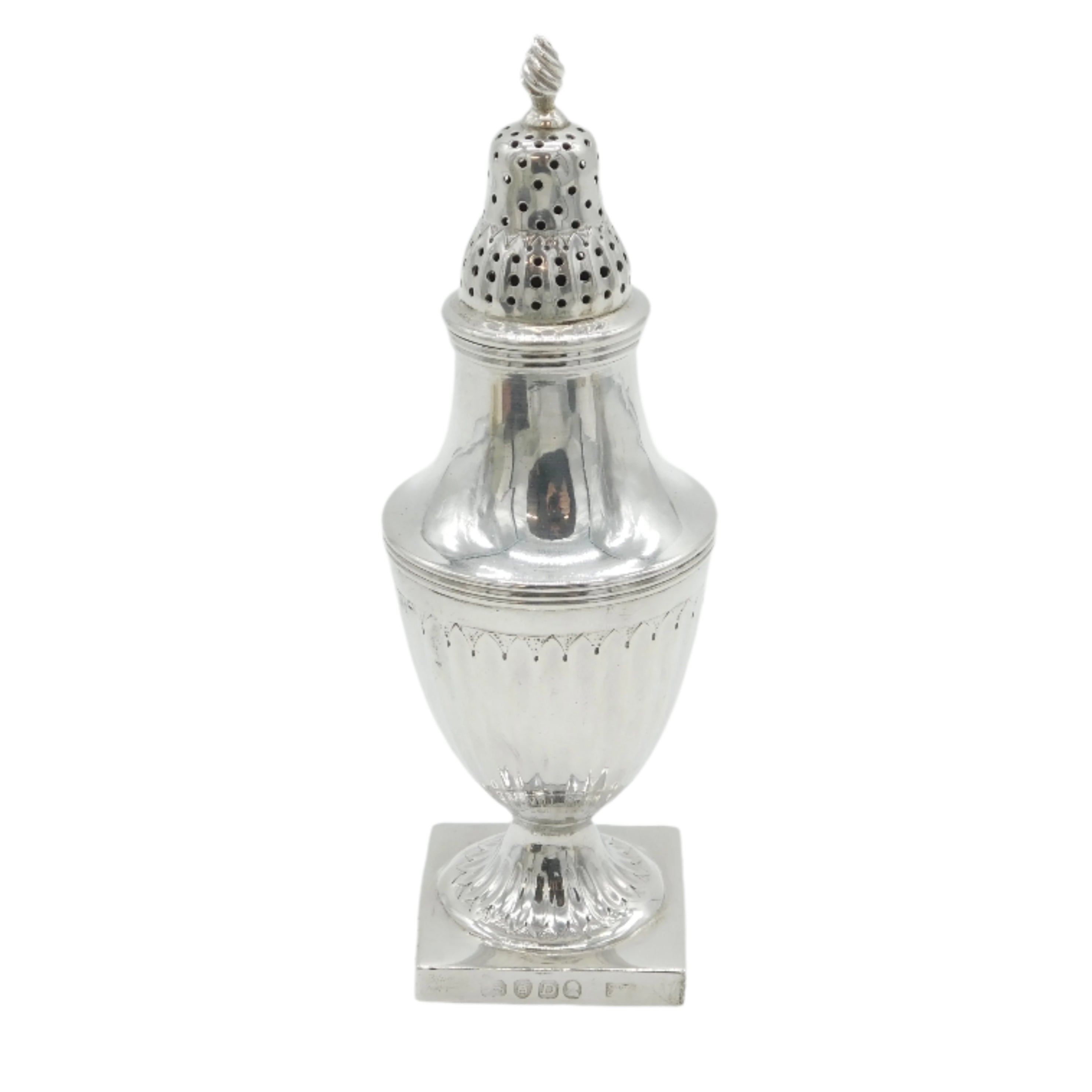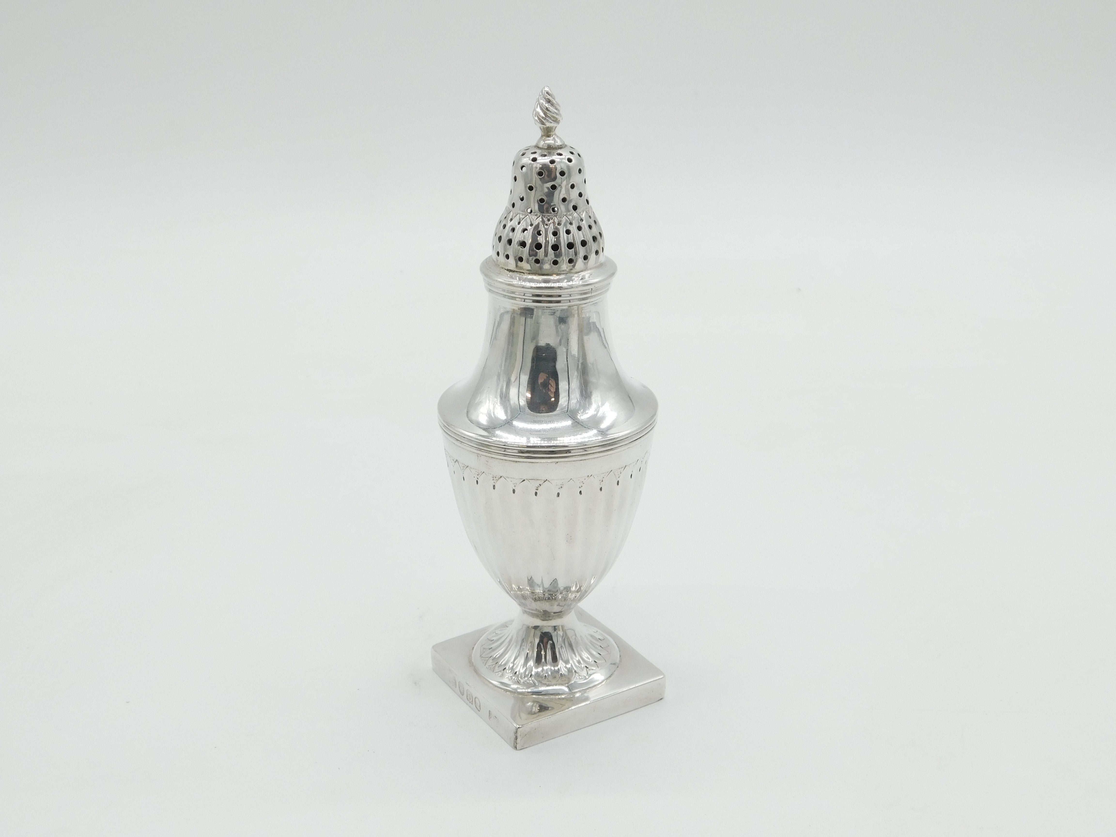 Details: A fantastic and wonderfully designed antique georgian sterling silver fluted pedestal sugar caster or muffineer with lovely detailing hallmarked London 1799 by Thomas Wallis II. This is a wonderful item that would make a perfect gift or addition to any collection.